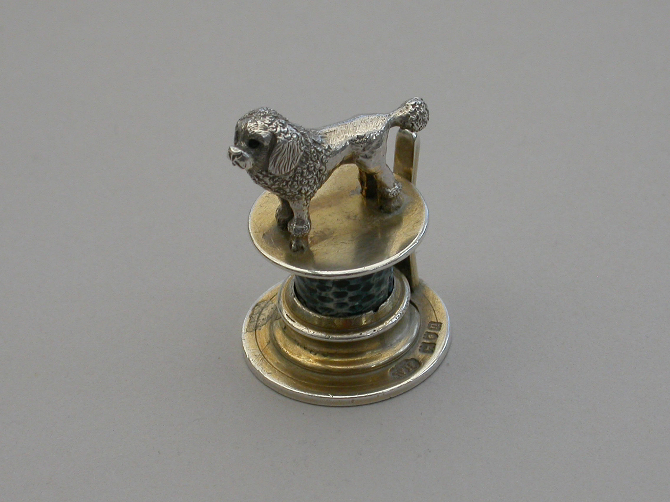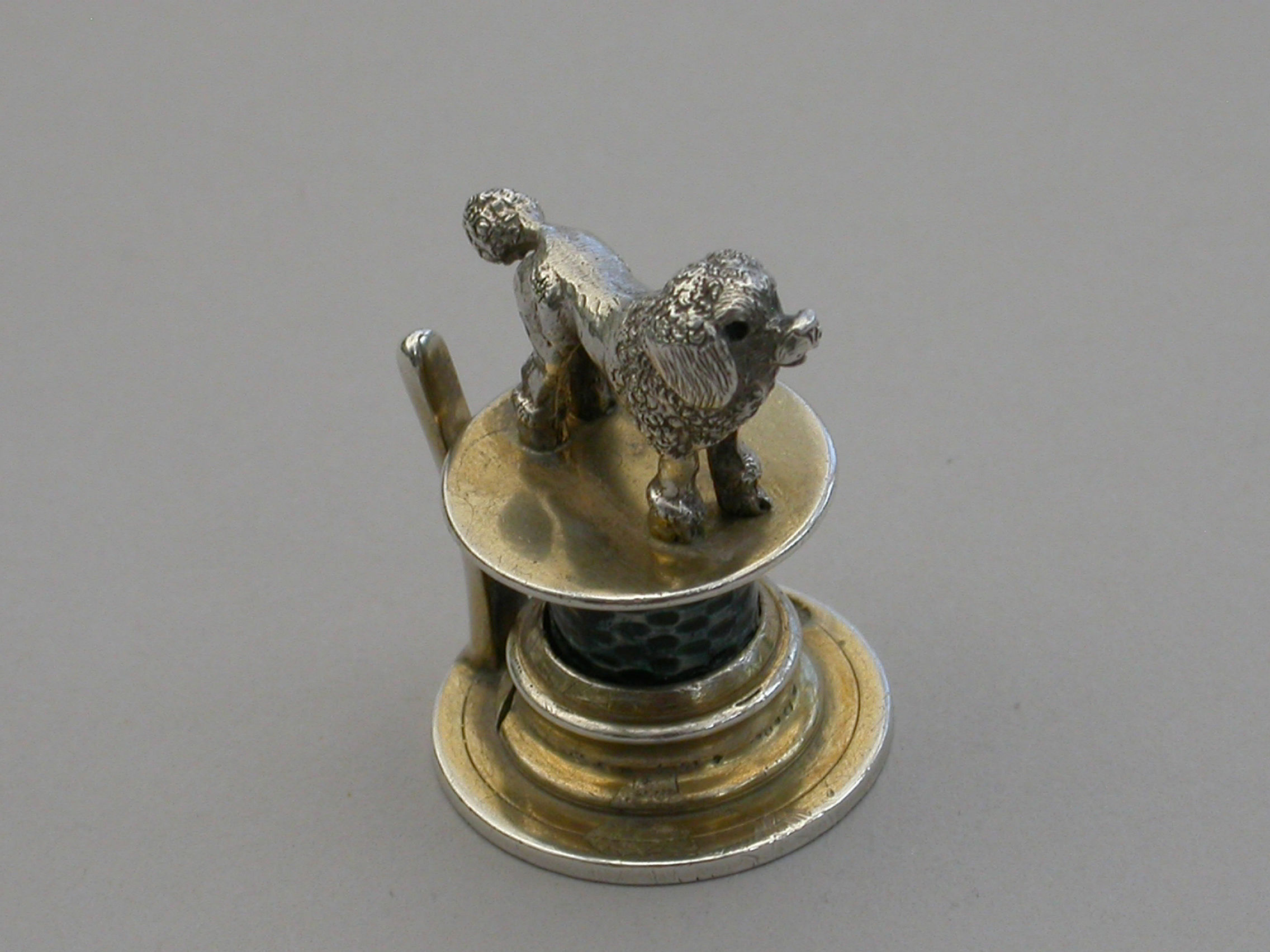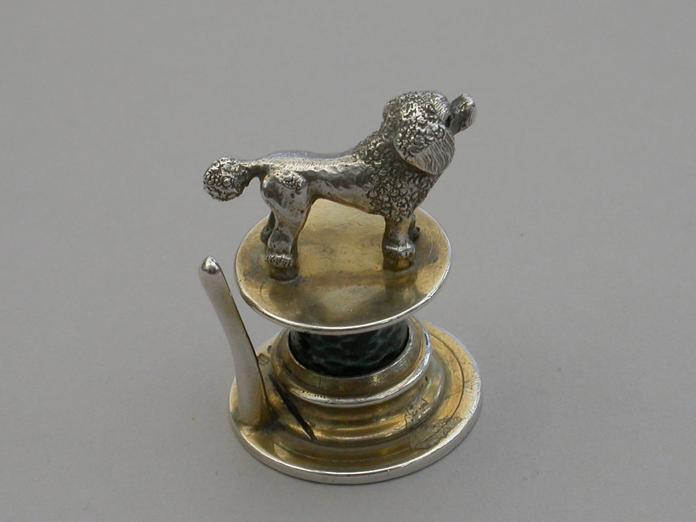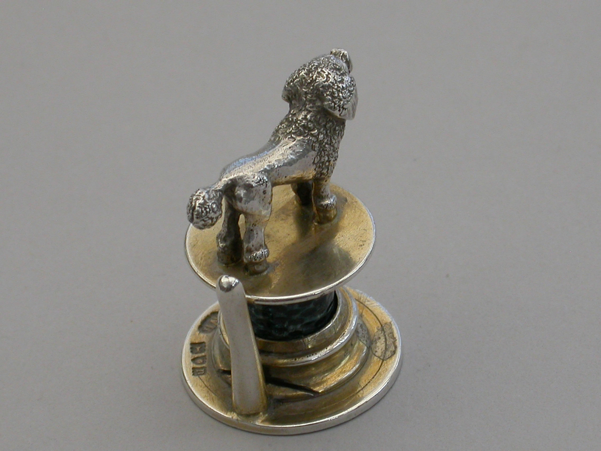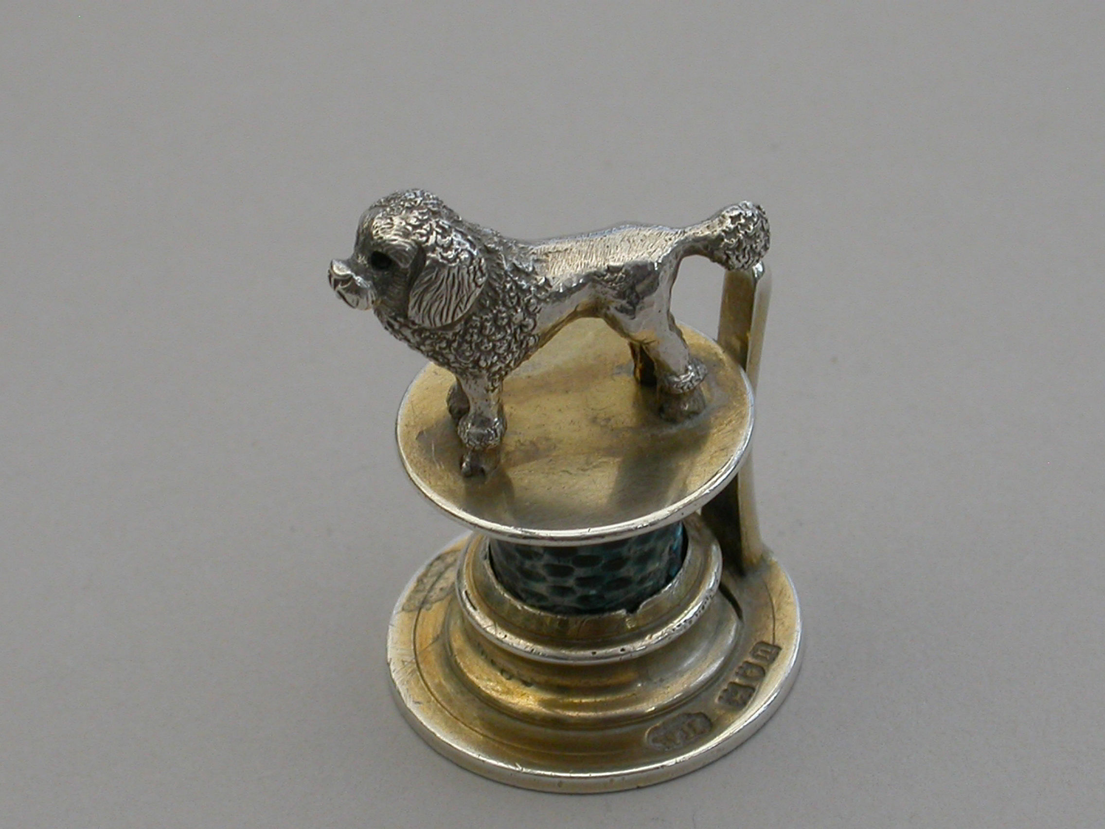 A good quality Edwardian silver gilt and enamel Menu Holder, with cast model of a poodle standing on top of a stepped circular pedestal base with green enameled band.