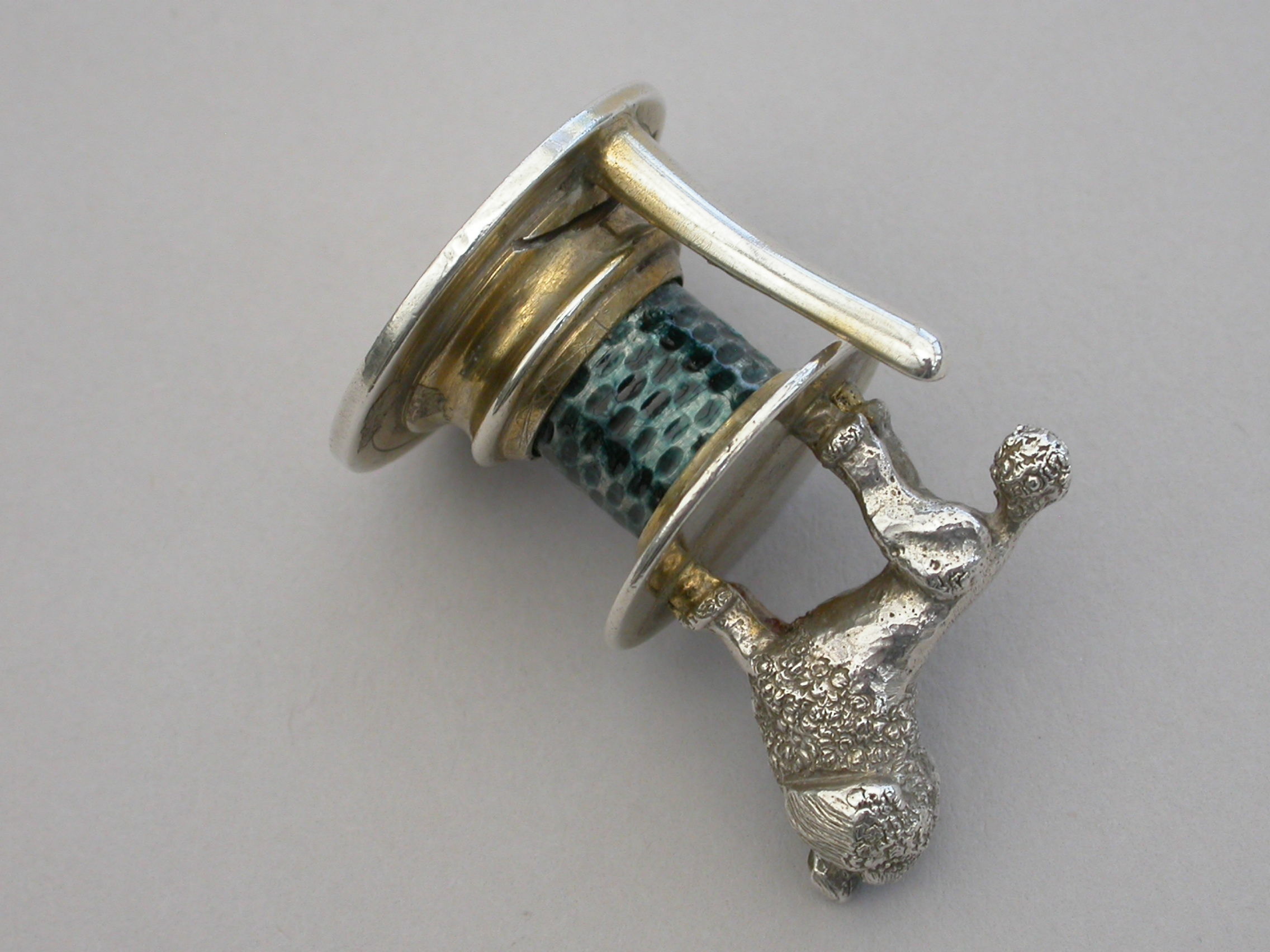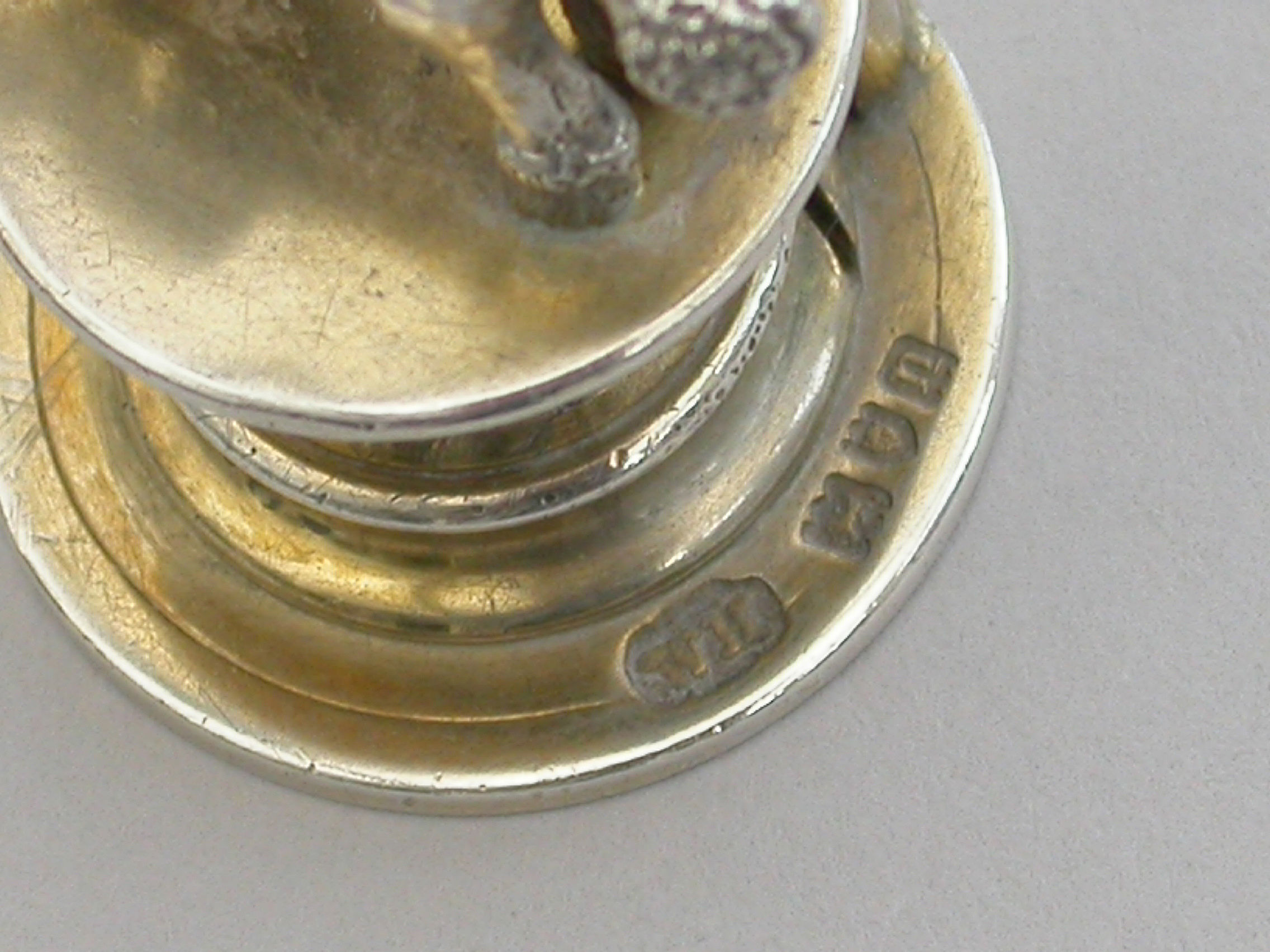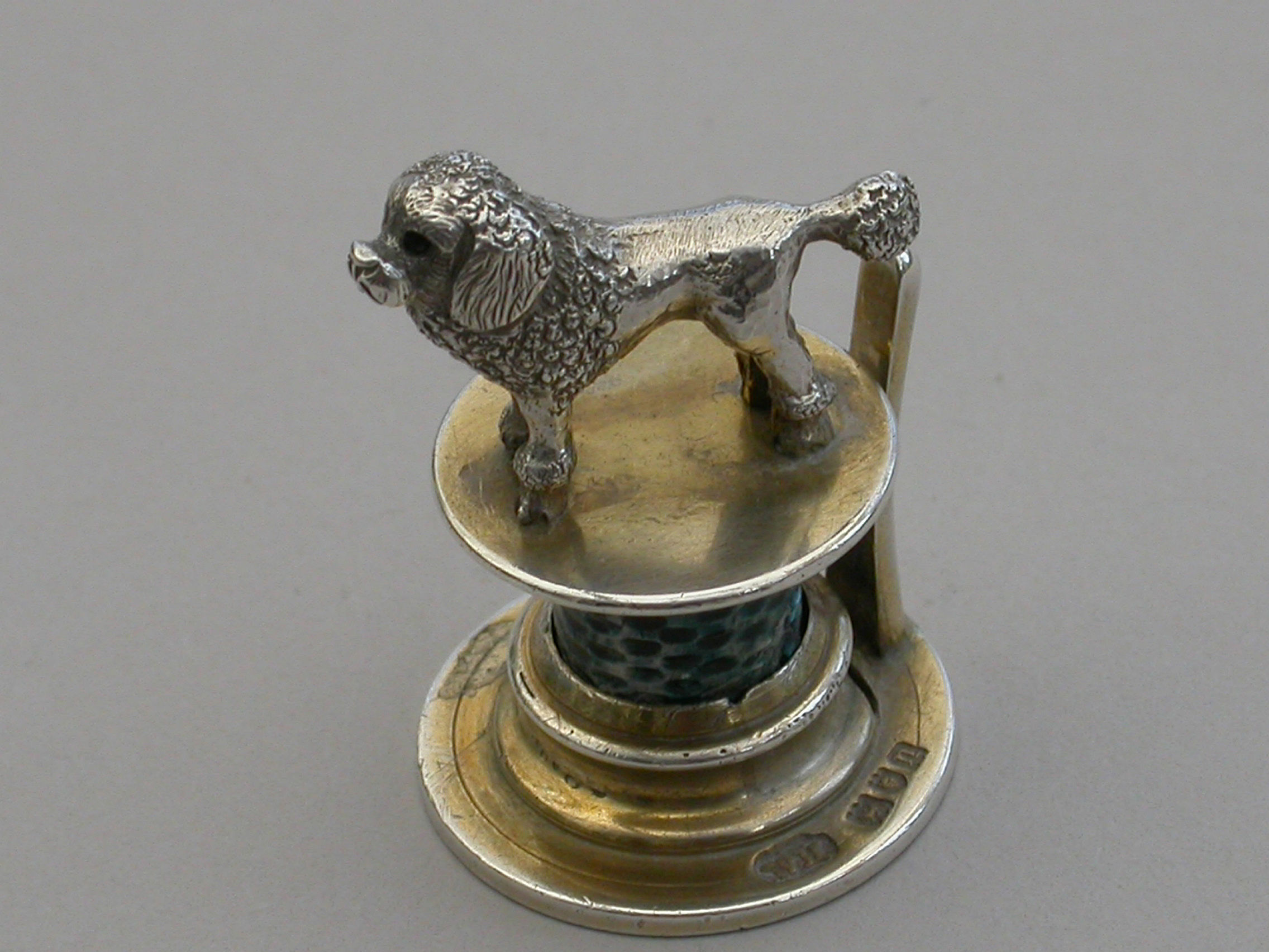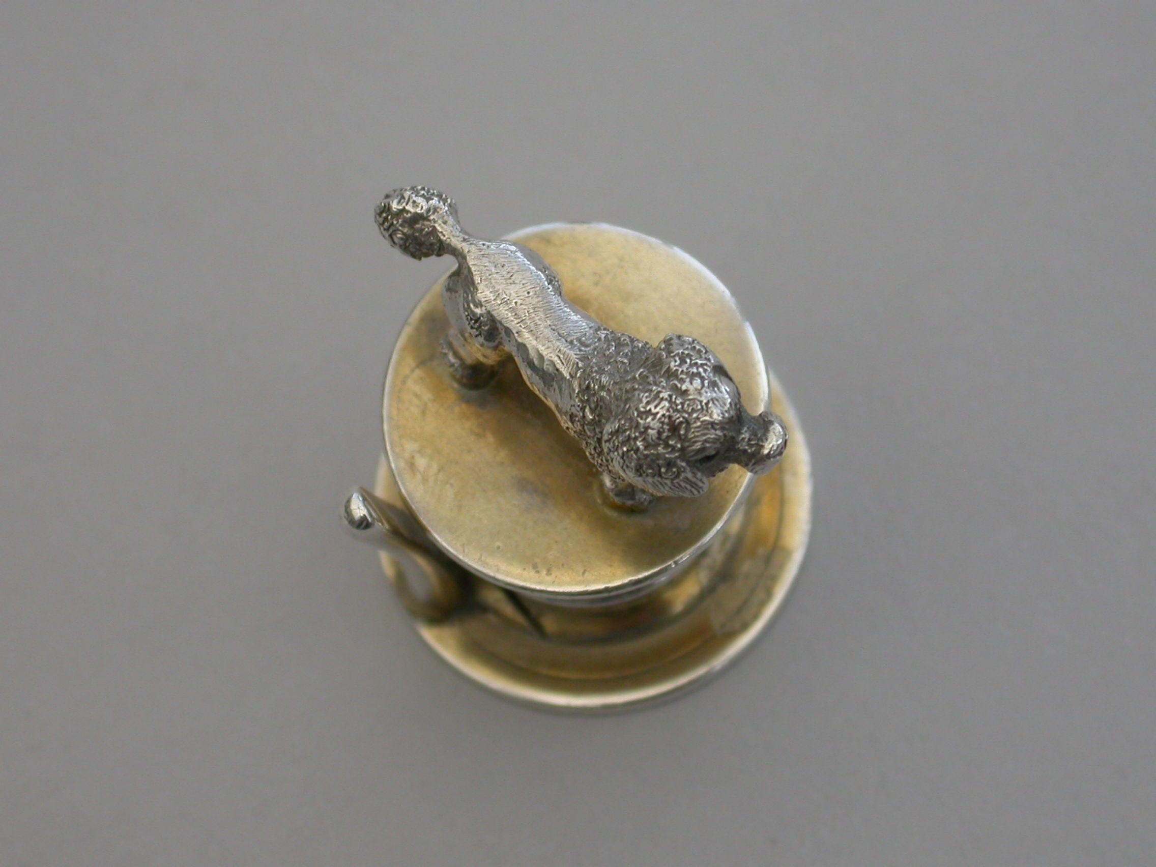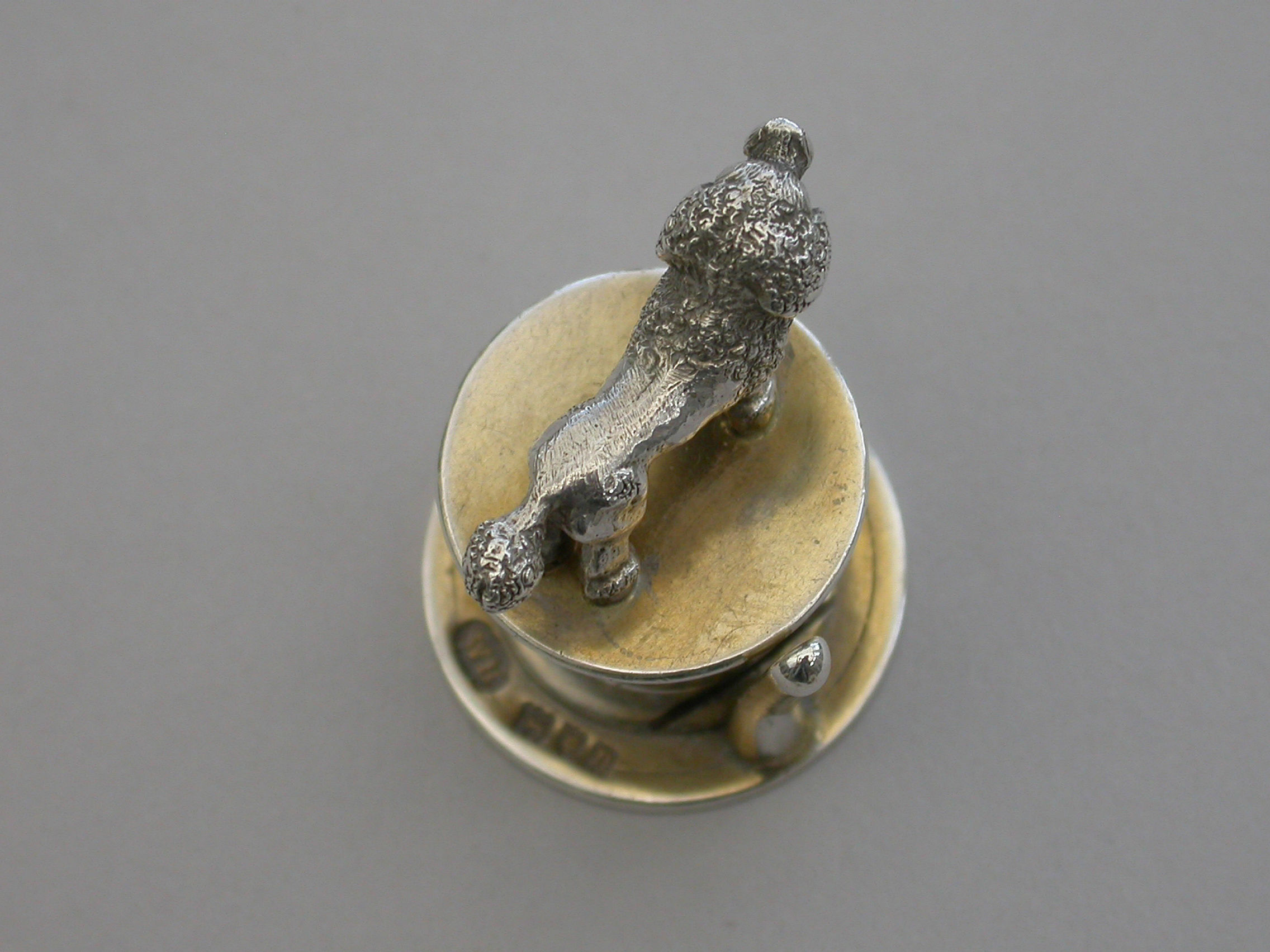 A good quality Edwardian silver gilt and enamel Menu Holder, with cast model of a poodle standing on top of a stepped circular pedestal base with green enameled band.
