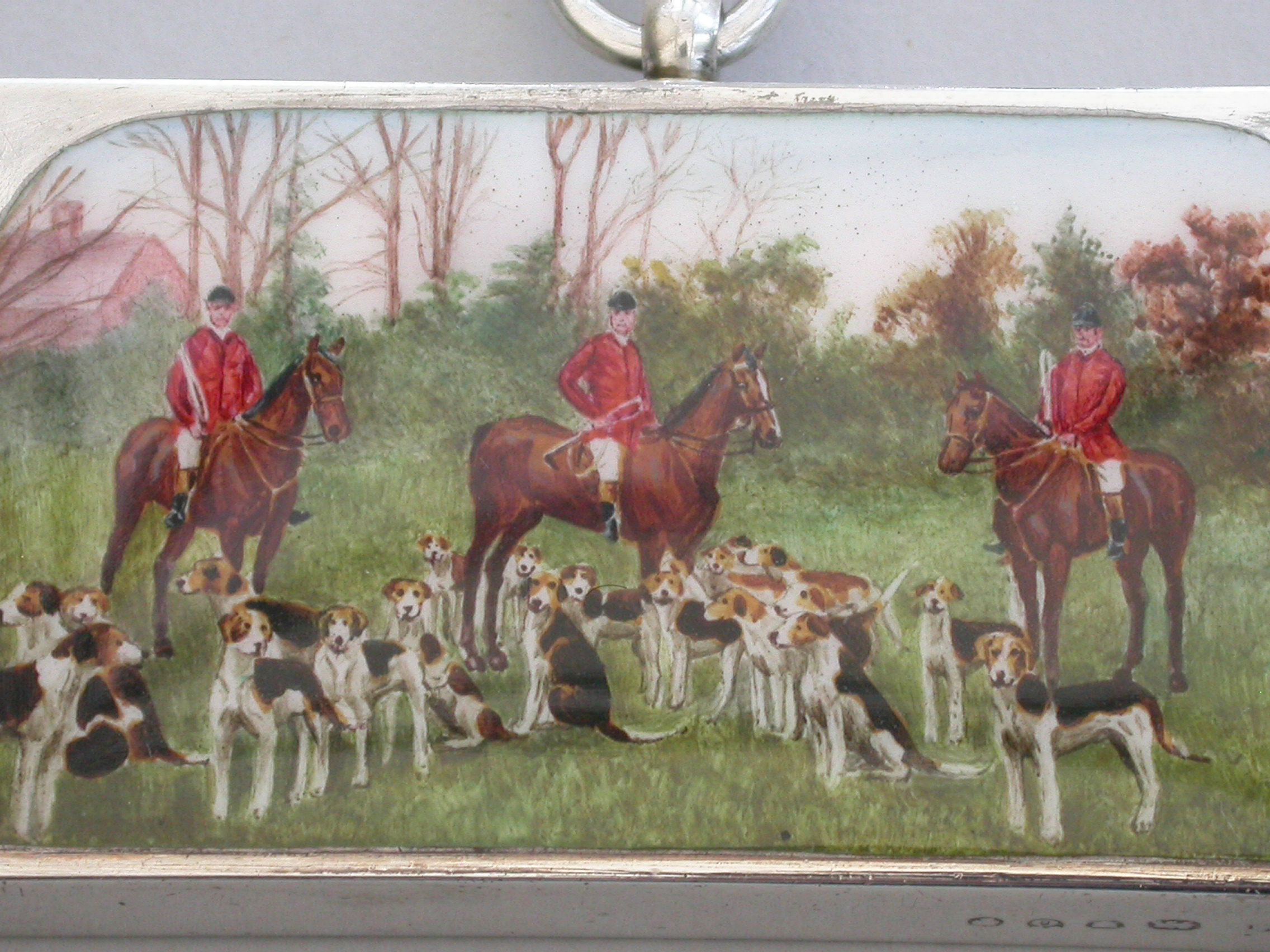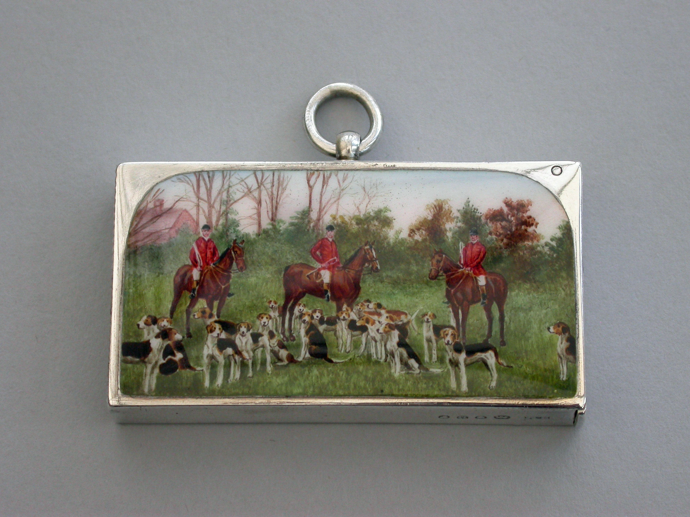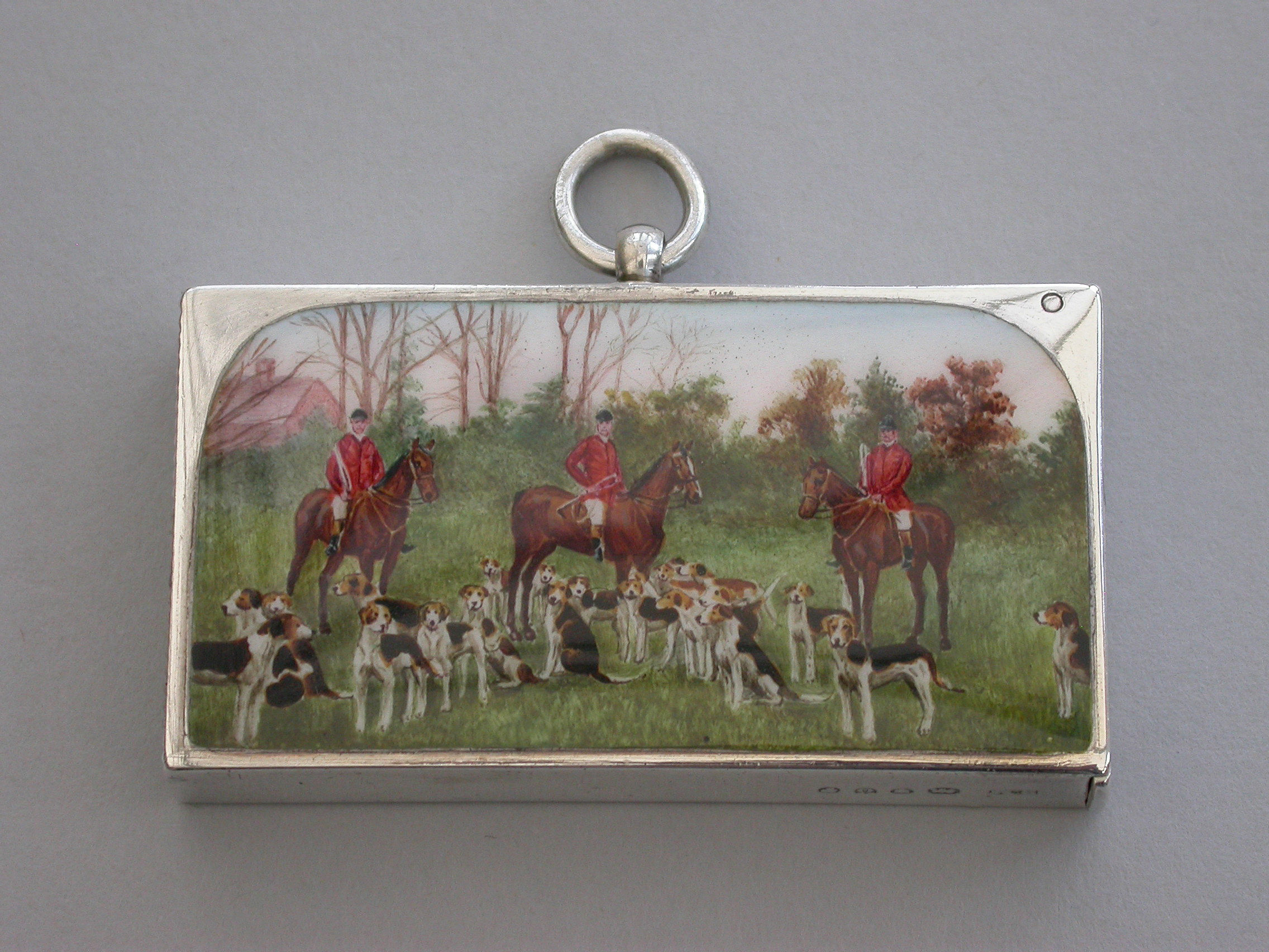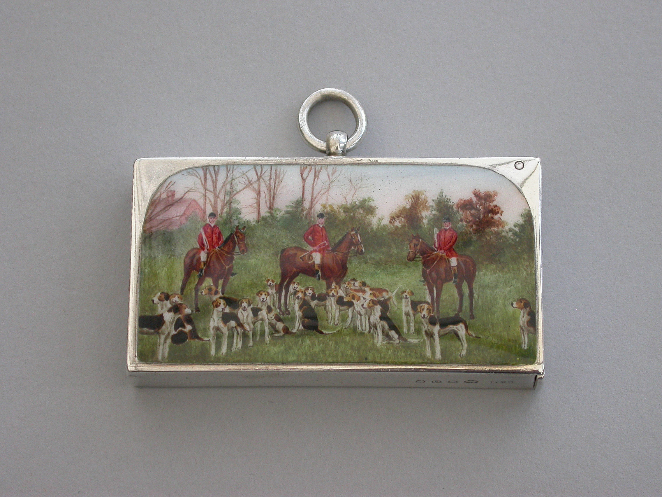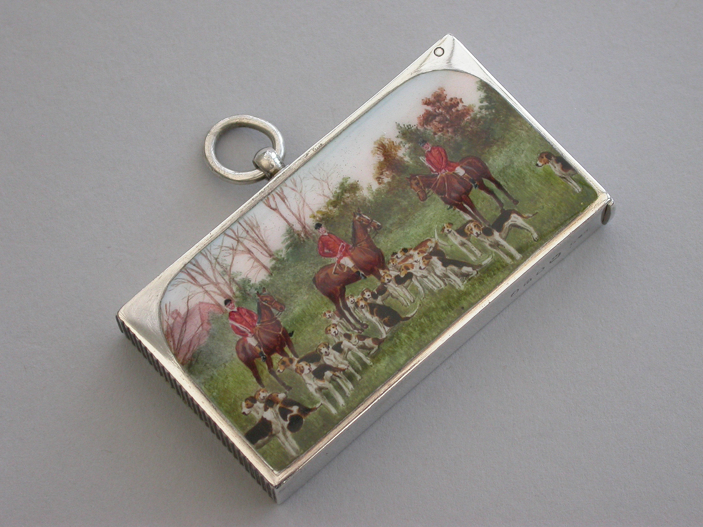 An extremely fine and rare Victorian silver and enamel Vesta Case of flat-top rectangular form with attached suspension ring, the face enamelled with a scene depicting three huntsmen with their pack of hounds. The reverse engraved with contemporary initials. The interior hinged silver gilt lid engraved ""Quorn Hunt"" and with the retailers name of A.Barrett & Sons, Piccadilly.