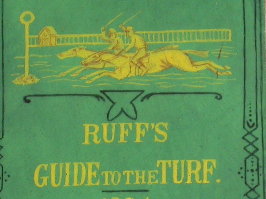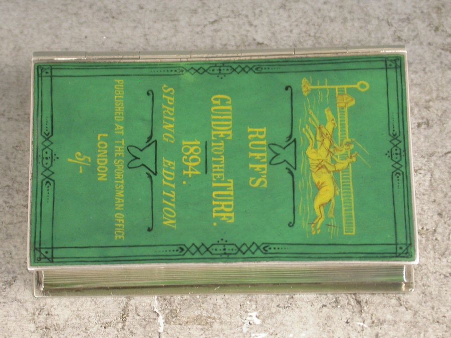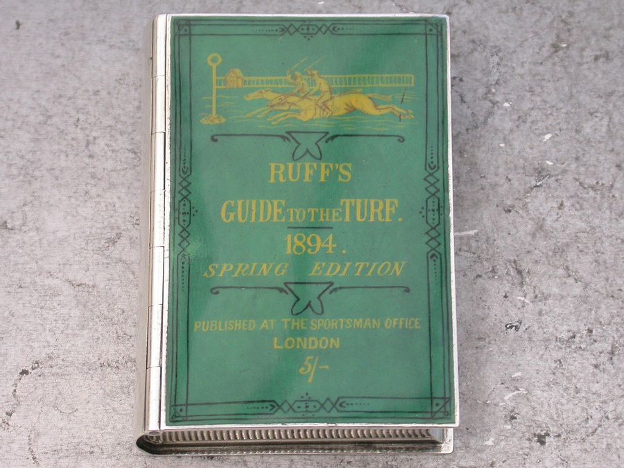 A fine and rare Victorian silver and enamel Vesta Case made in the form of a Book, the face enamelled in green and gold with a replica of the cover of 'Ruffs Guide to the Turf 1894'. Hinged spine and silver gilt interior.
