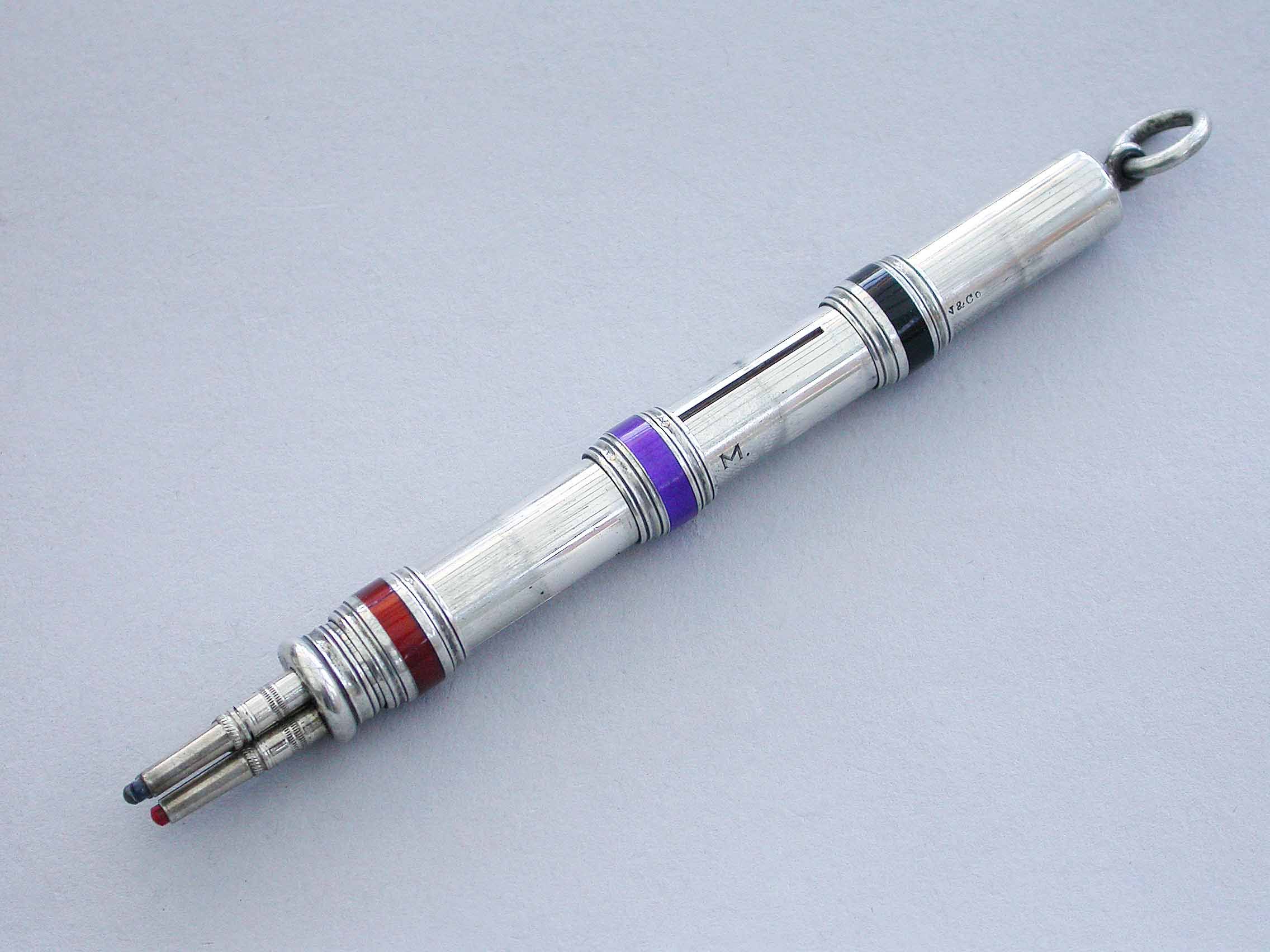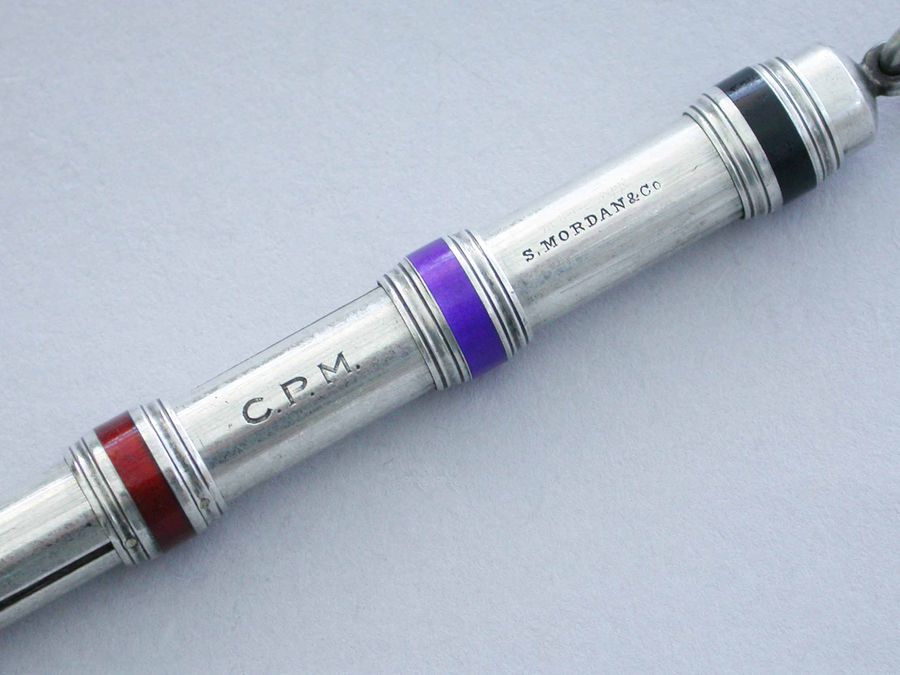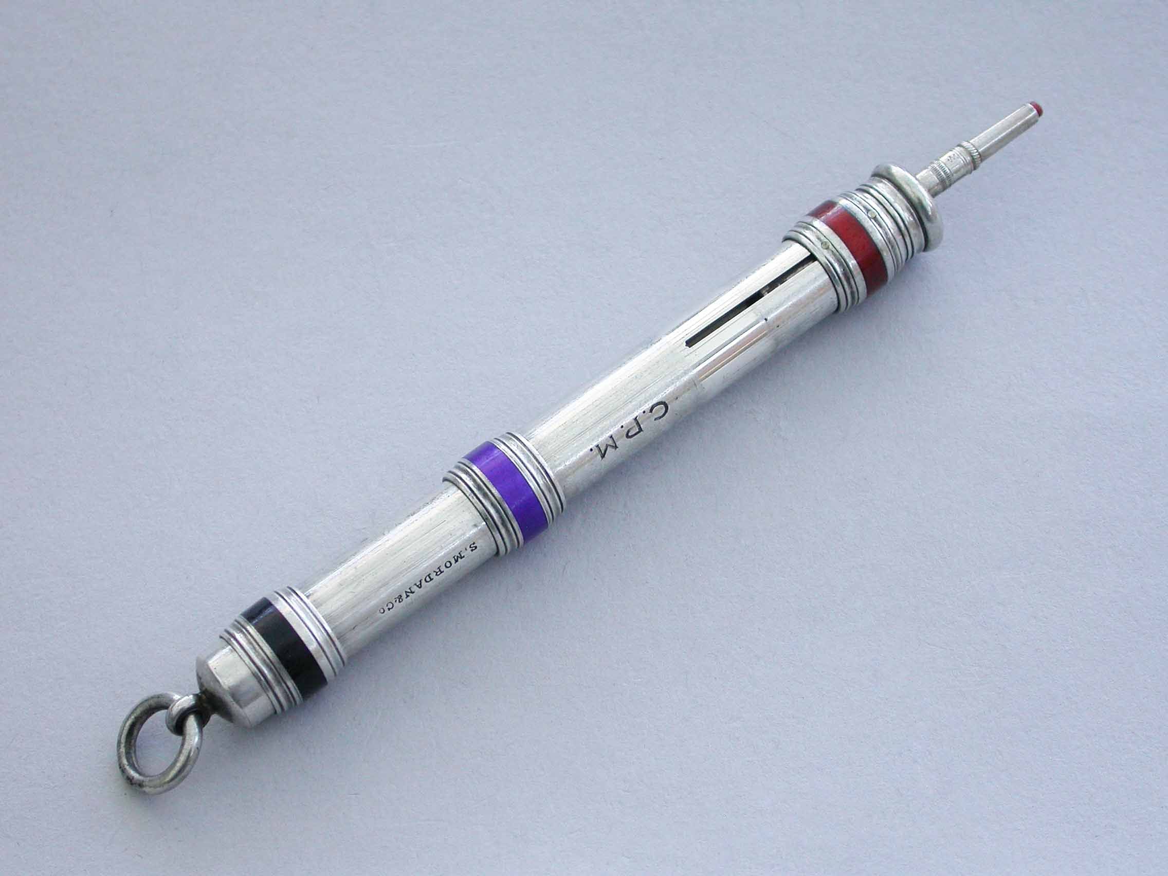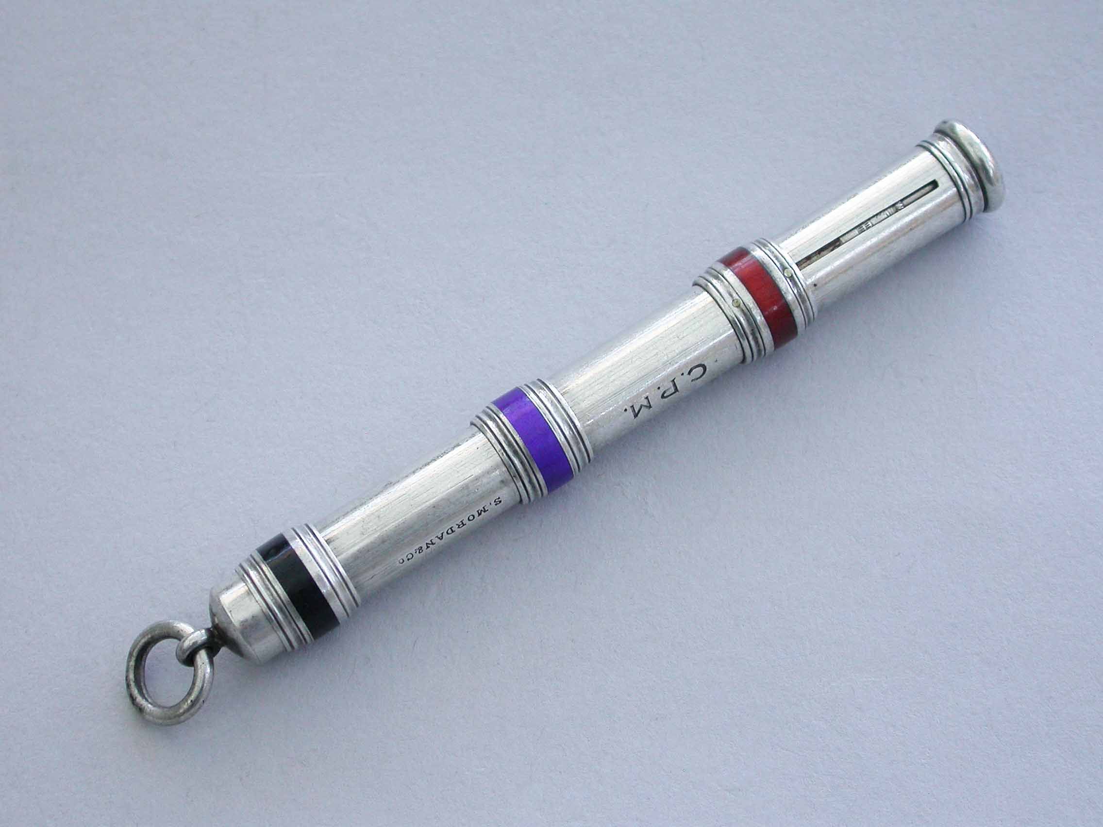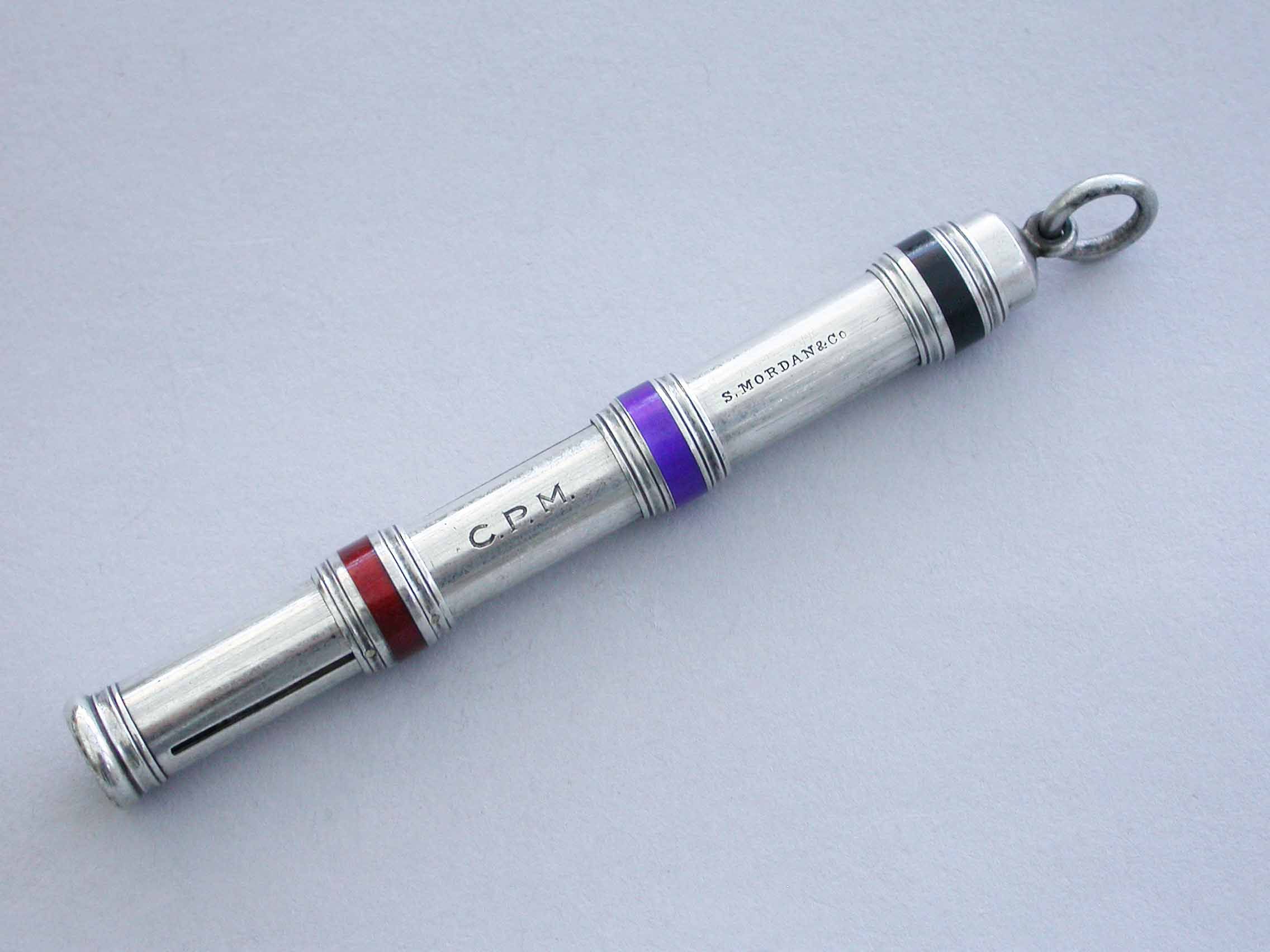 A good quality late Victorian silver and enamel three colour sliding Propelling Pencil with enamelled slider rings and attached suspension ring. The body engraved with owners initials 'C.P.M.'