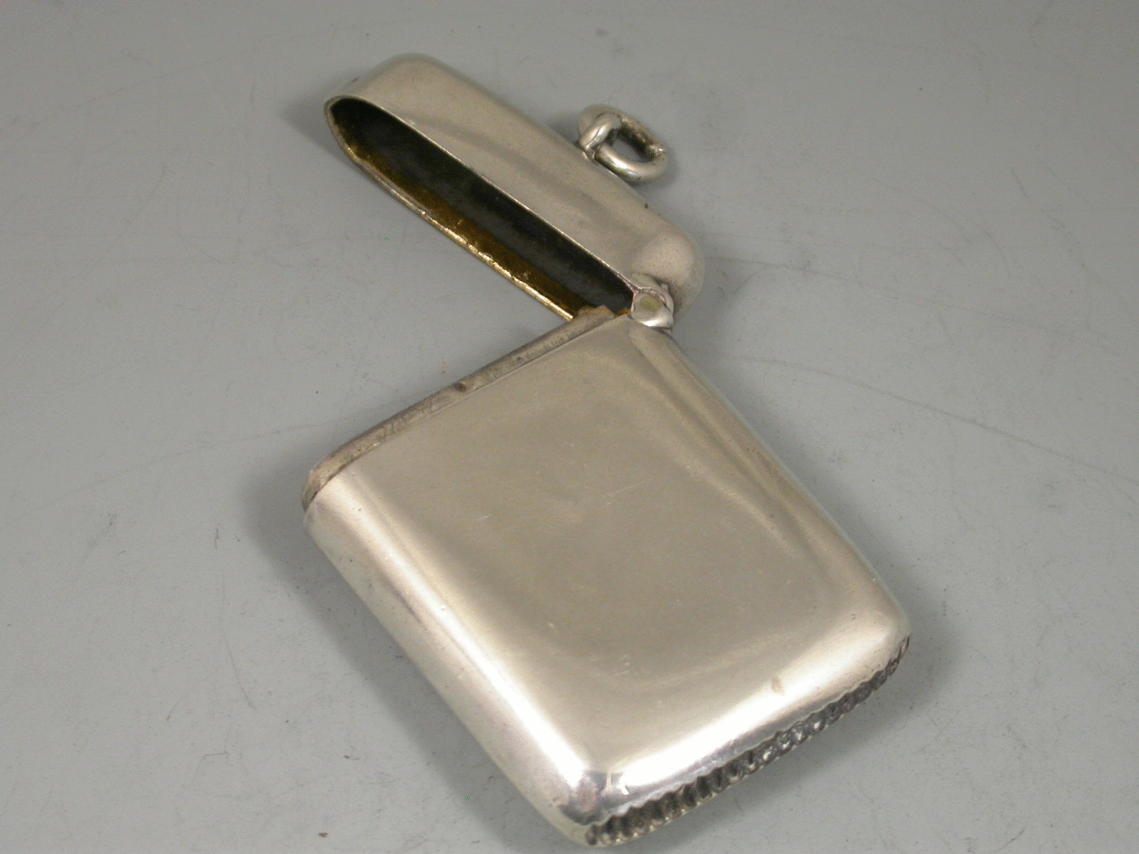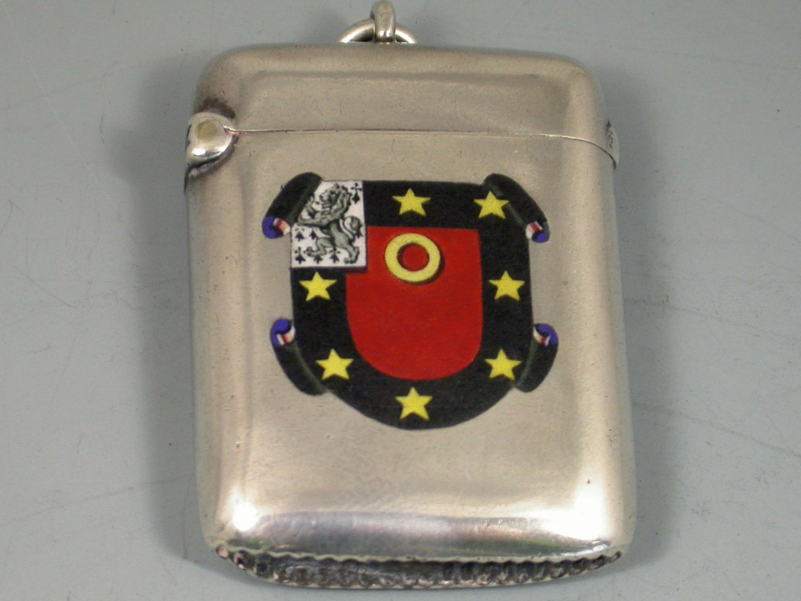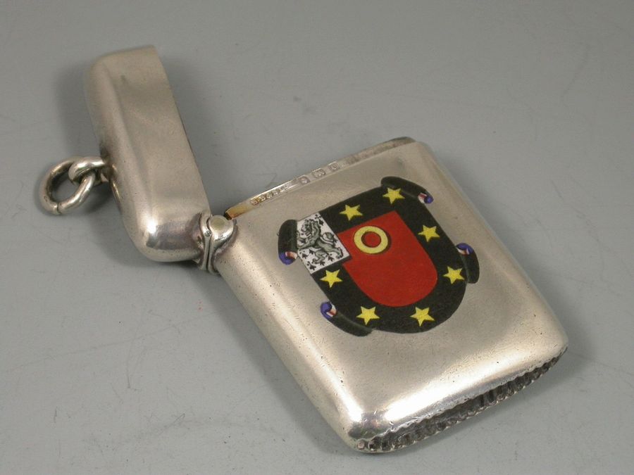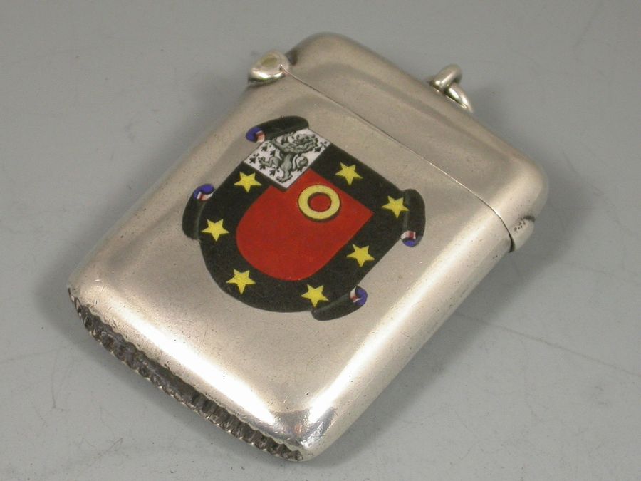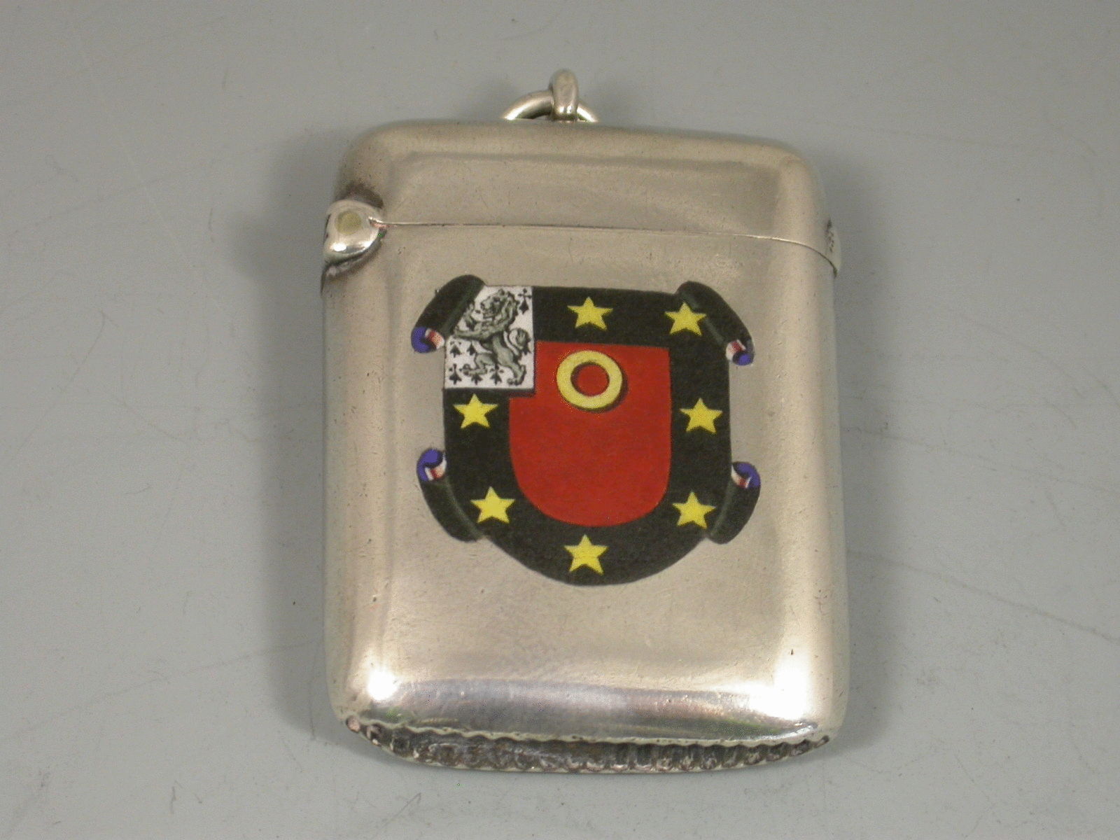A good Victorian silver Vesta Case of plain rounded rectangular form with sprung hinged lid, the face enamelled with the coat of arms of St Johns College, Oxford University.