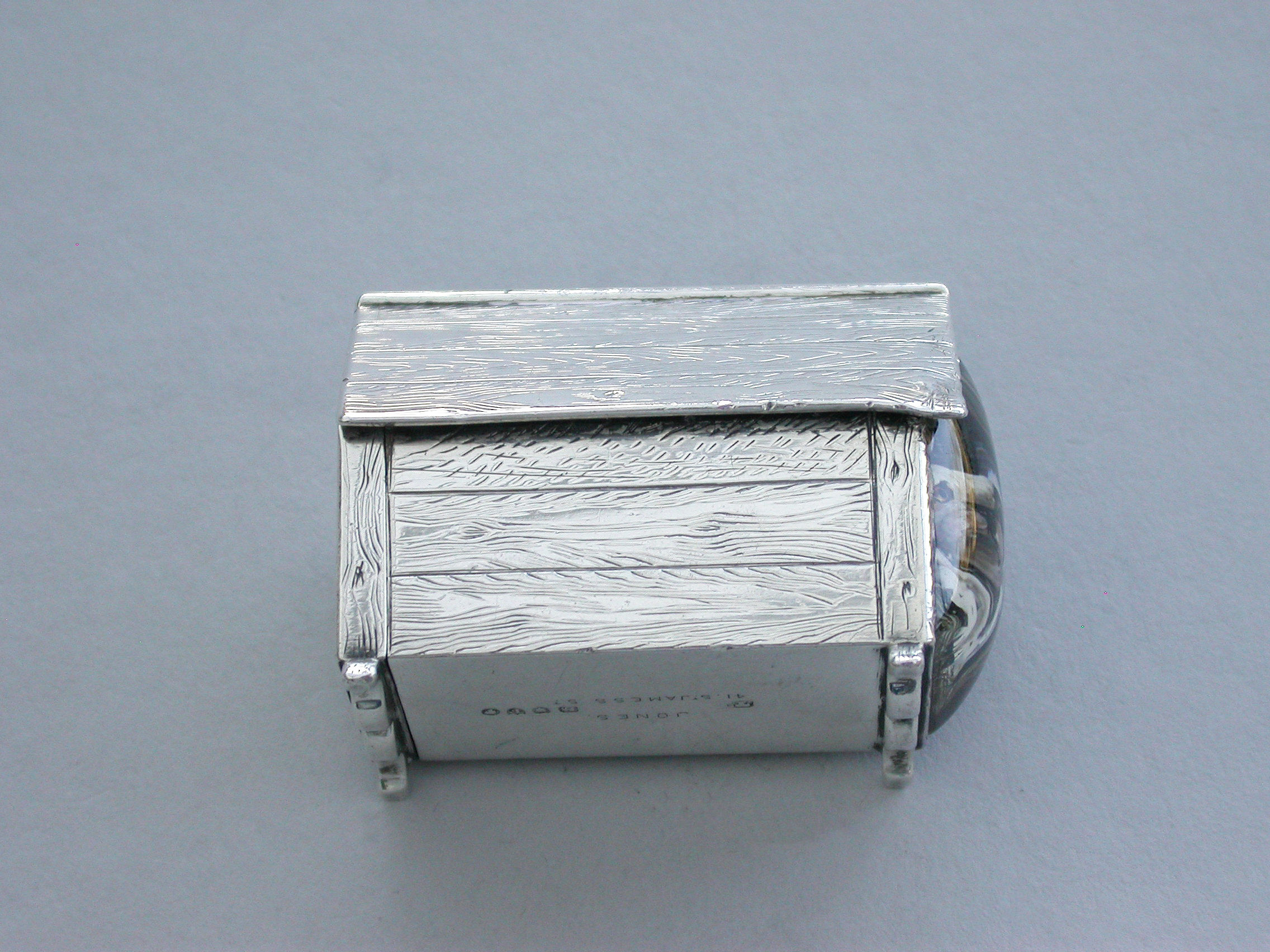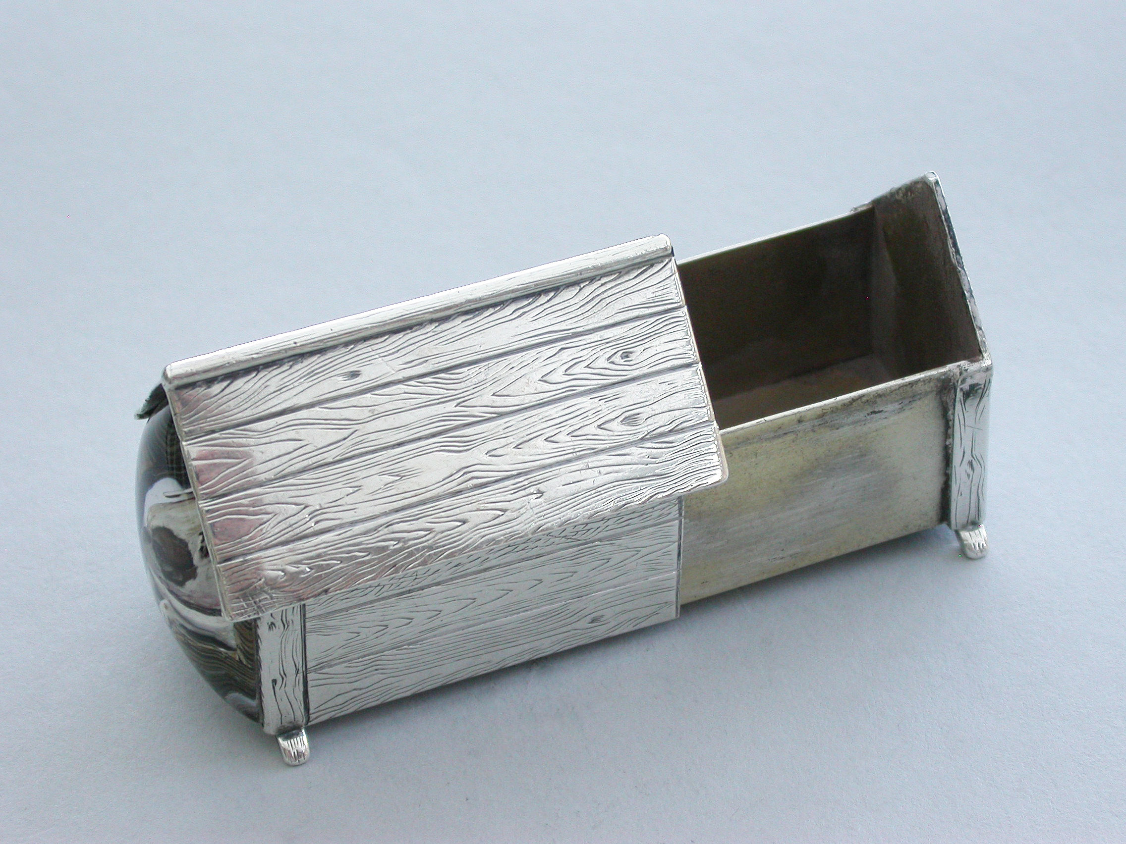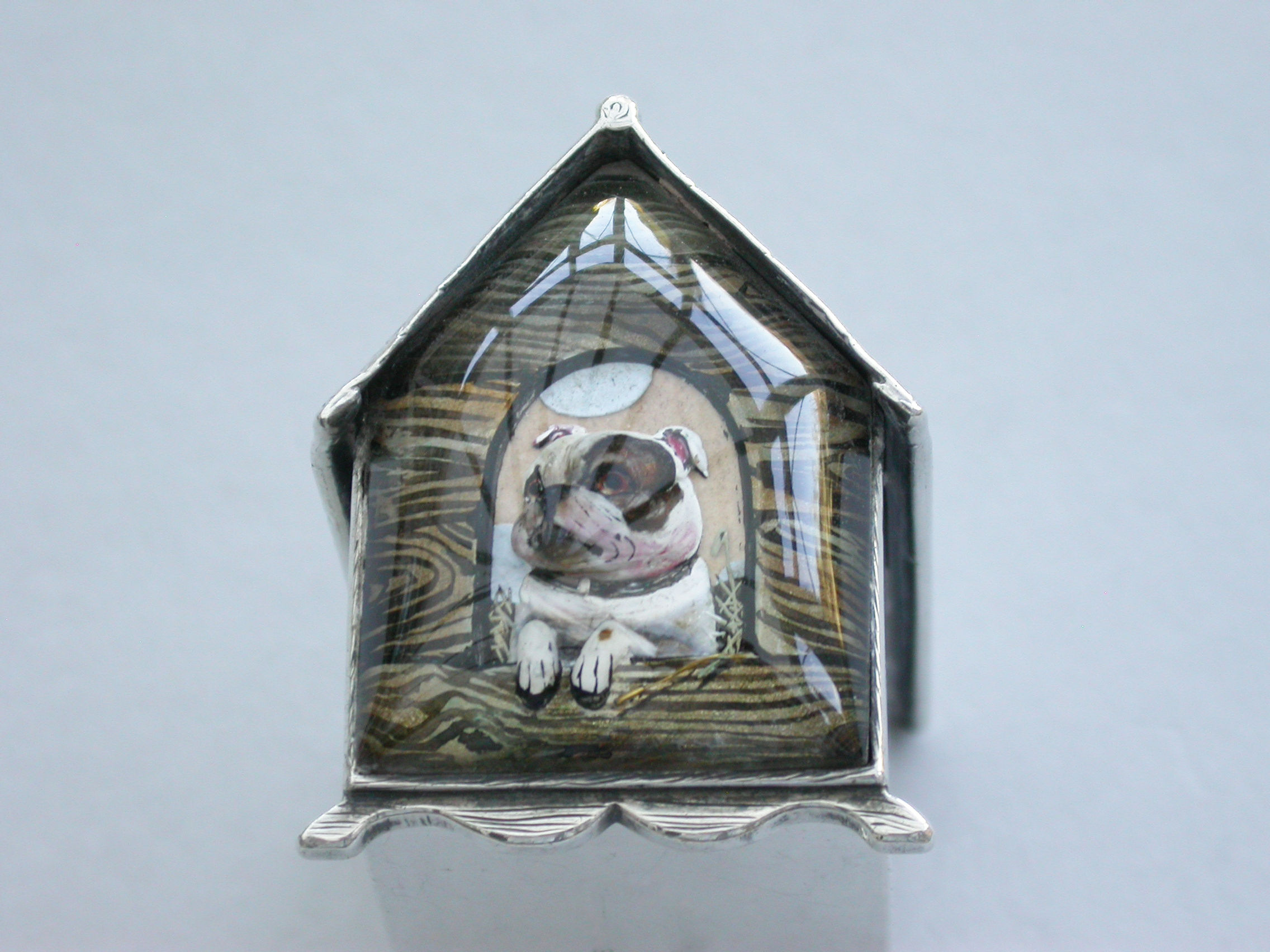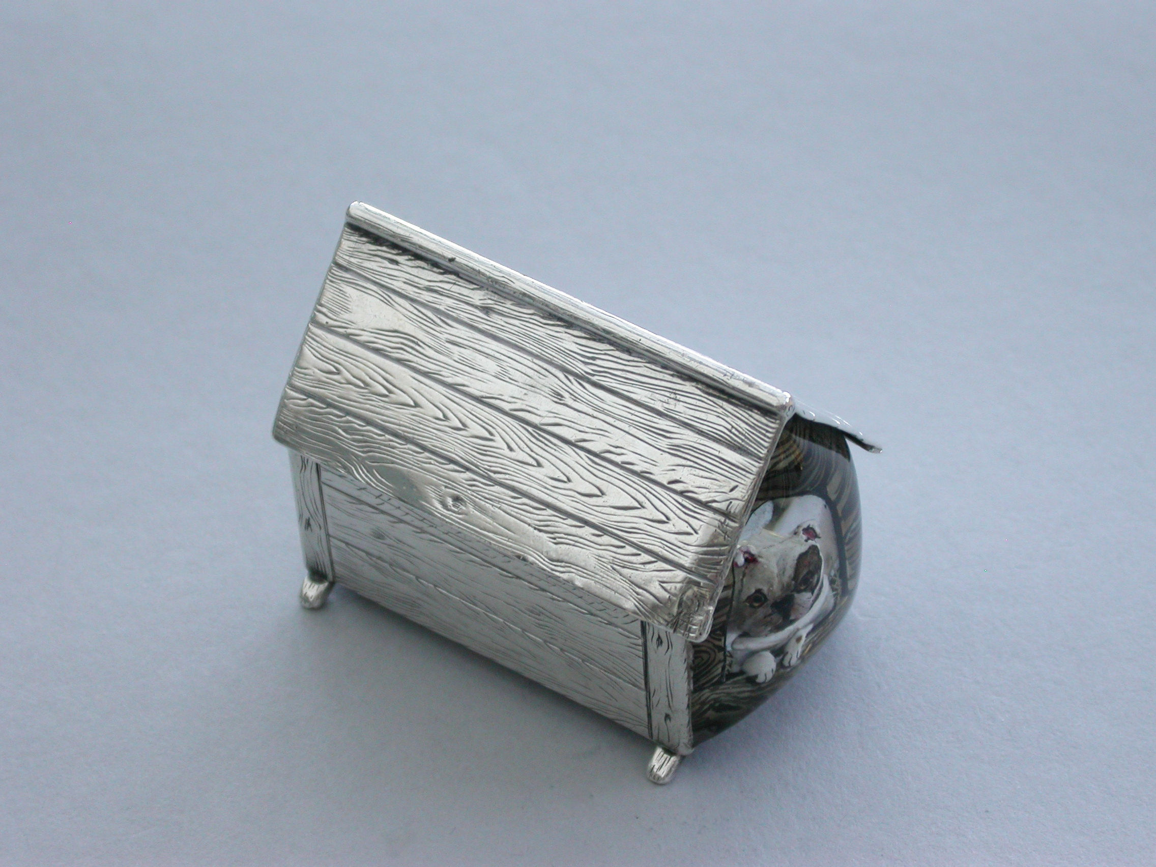 A very fine Victorian novelty silver and Essex rock crystal Vesta Case, modelled as a slatted wooden dog kennel, the front with an applied Essex rock crystal panel depicting a bull dog, the back pull-out drawer with silver gilt interior and striking panel to one side.