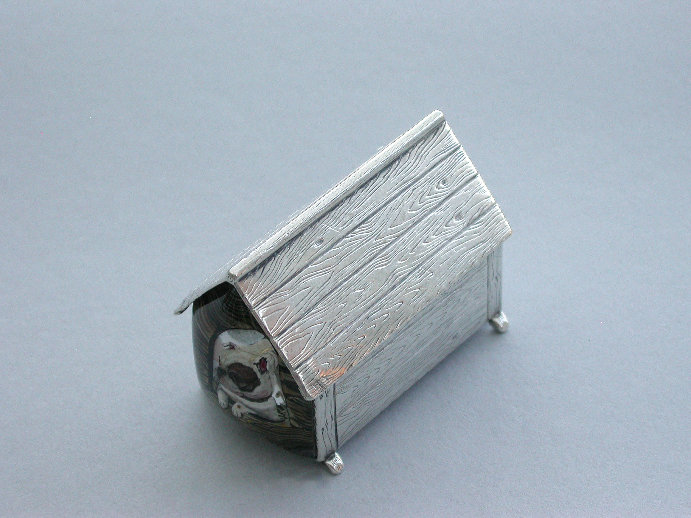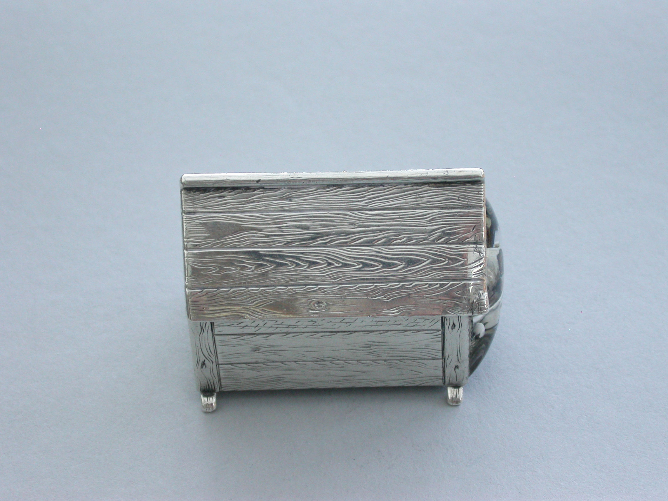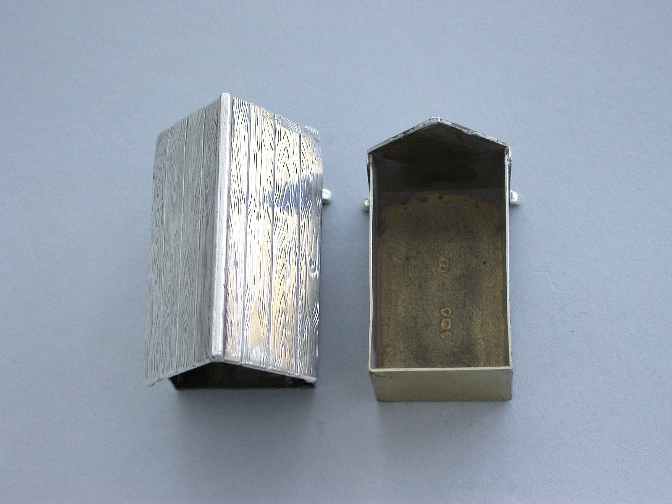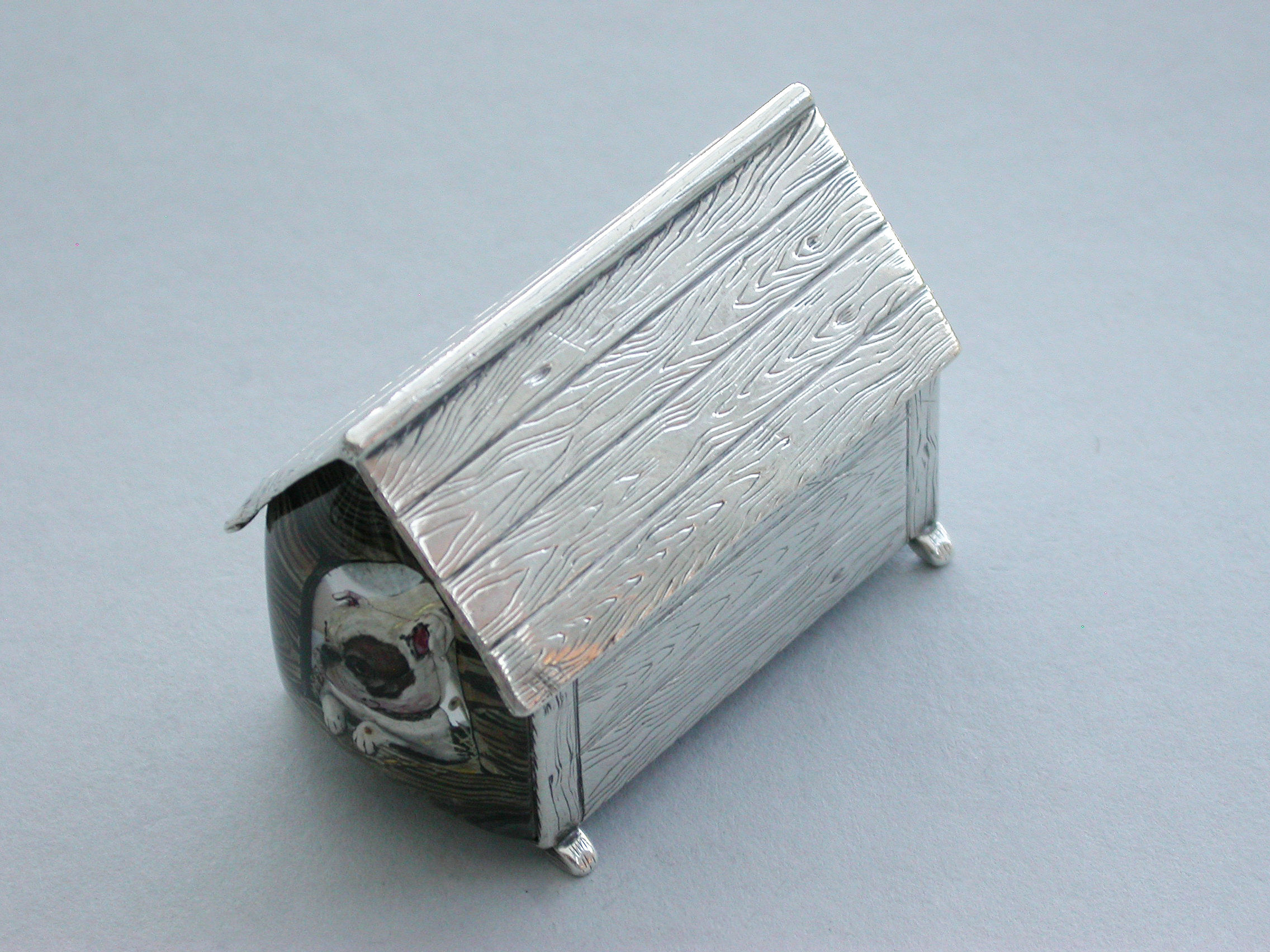 A very fine Victorian novelty silver and Essex rock crystal Vesta Case, modelled as a slatted wooden dog kennel, the front with an applied Essex rock crystal panel depicting a bull dog, the back pull-out drawer with silver gilt interior and striking panel to one side.