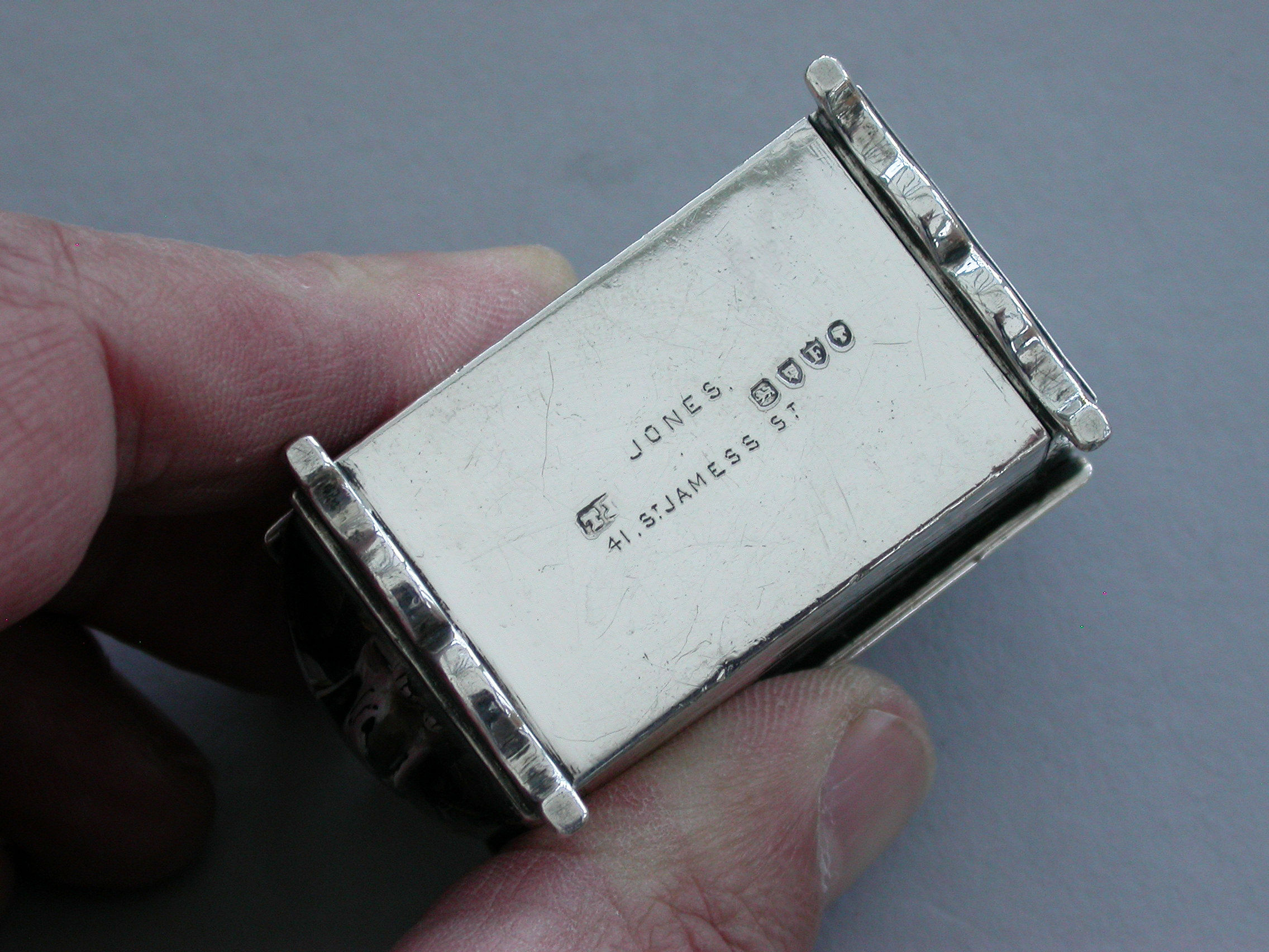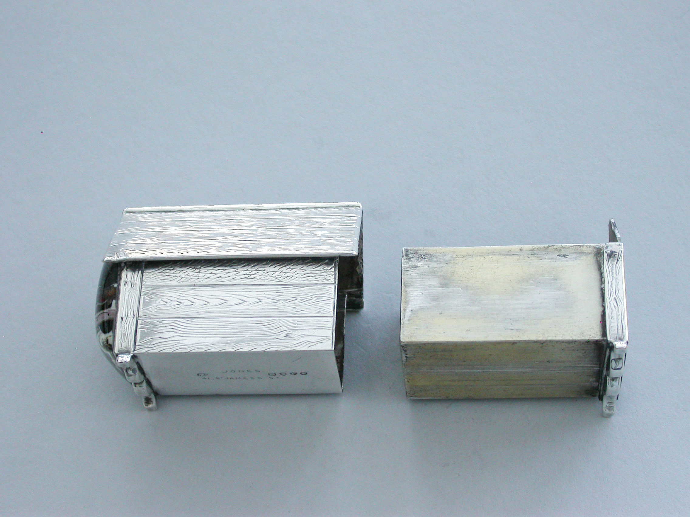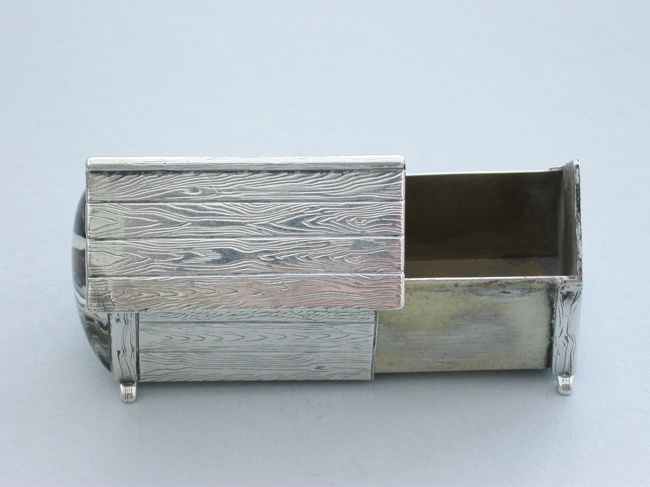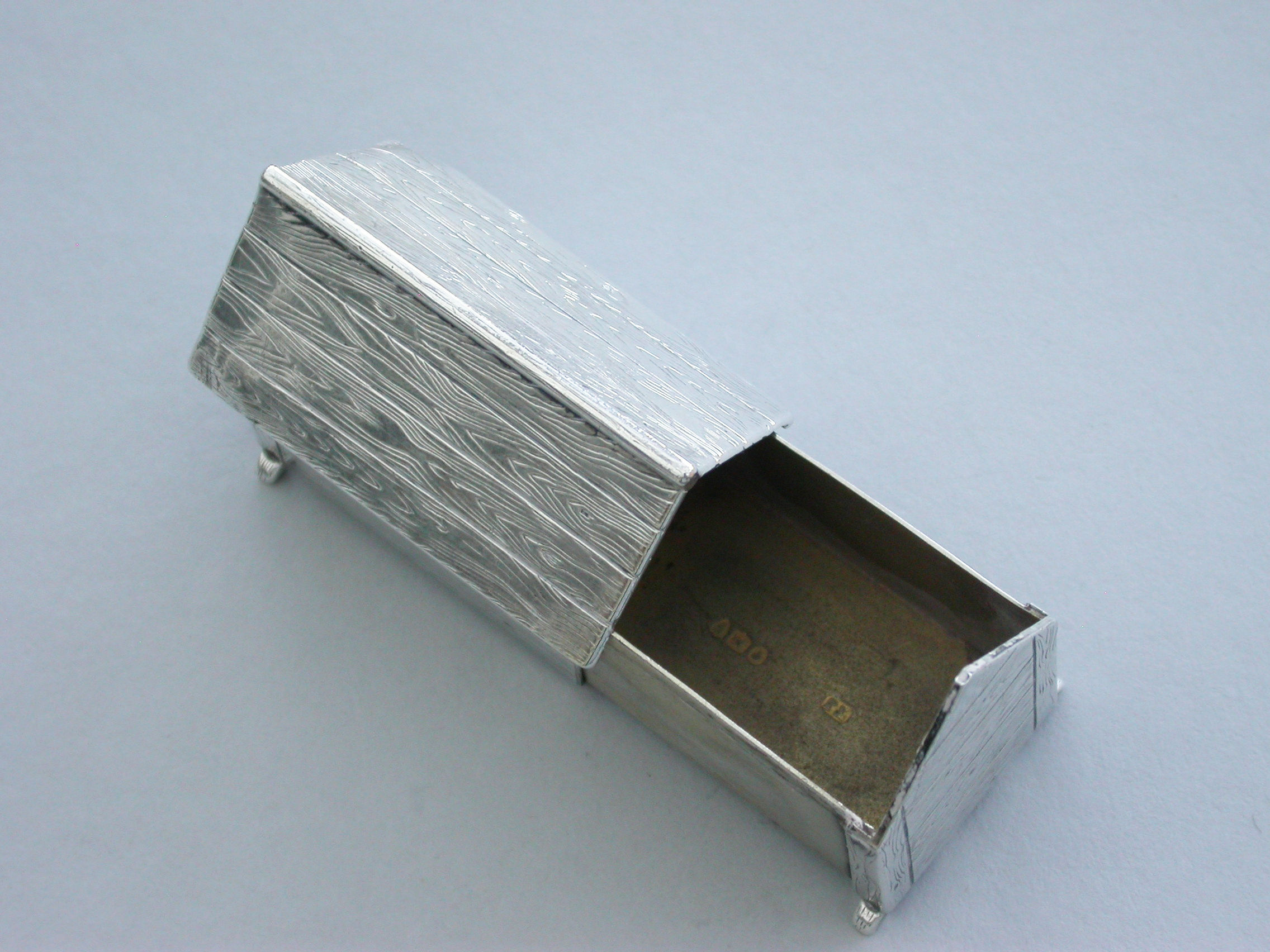 A very fine Victorian novelty silver and Essex rock crystal Vesta Case, modelled as a slatted wooden dog kennel, the front with an applied Essex rock crystal panel depicting a bull dog, the back pull-out drawer with silver gilt interior and striking panel to one side.