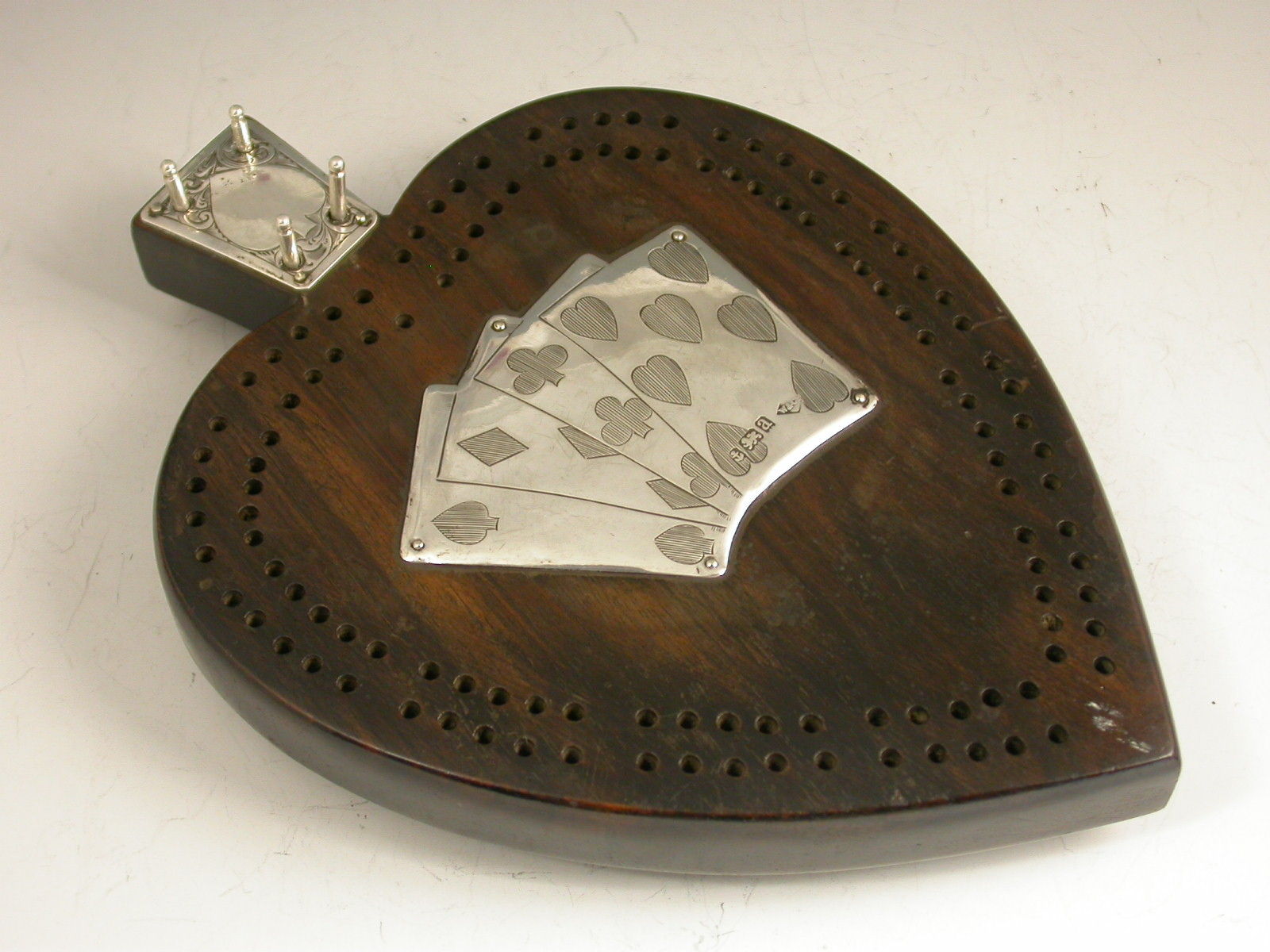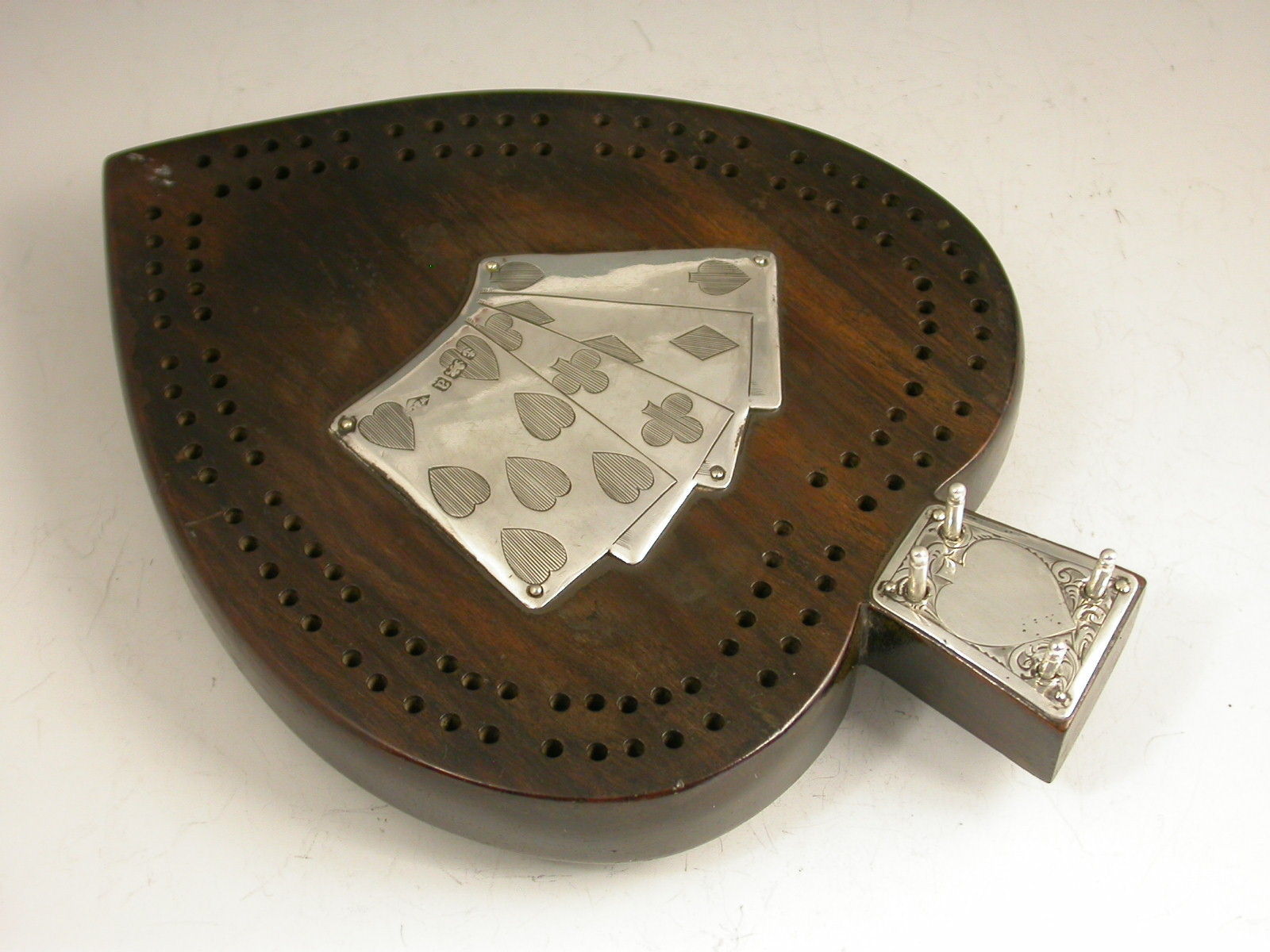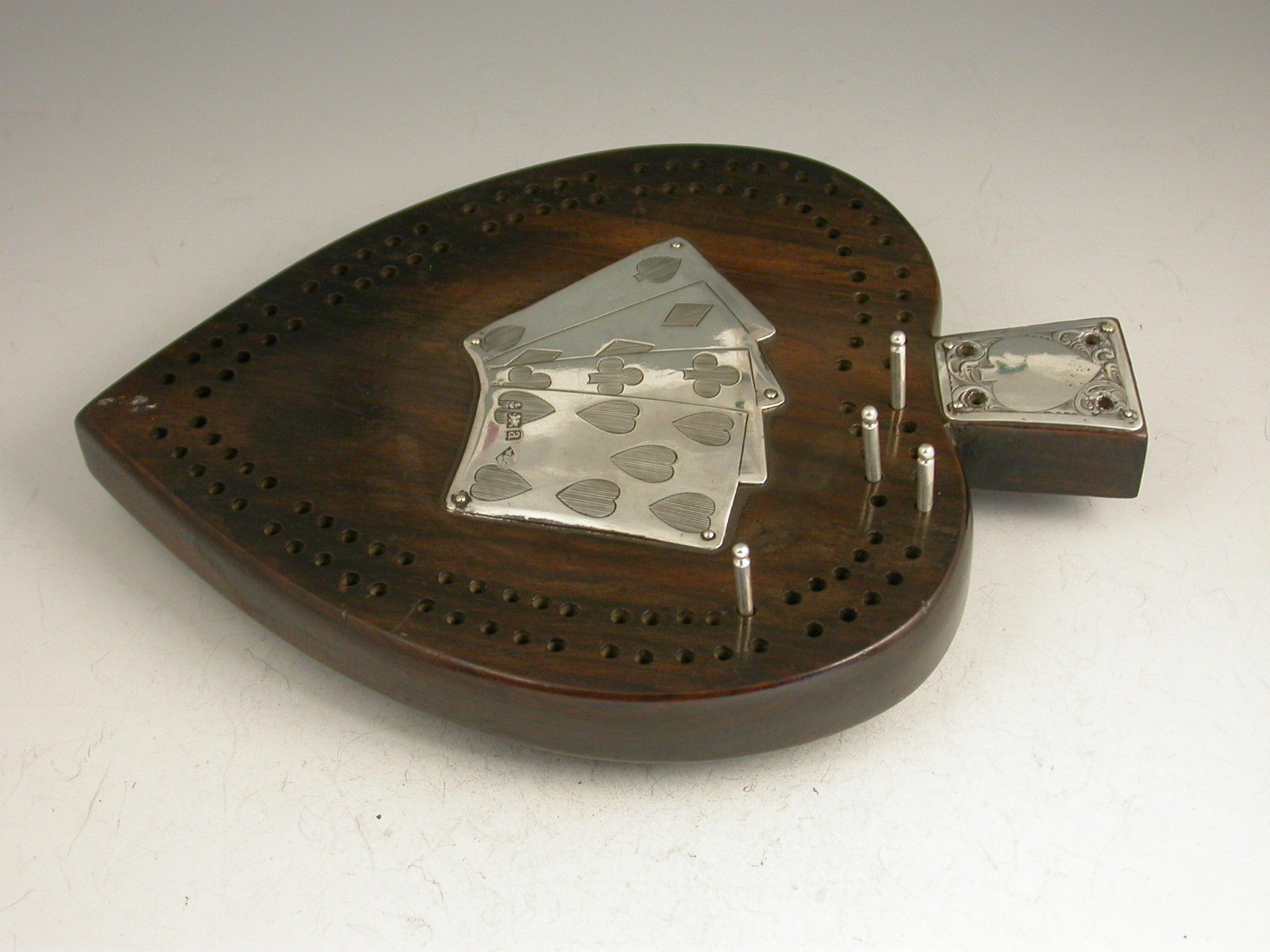 An unusual Victorian silver mounted hardwood novelty Cribbage Board made in the shape of a spade, applied with four silver playing cards and a silver plate to the handle also engraved with a spade suit.