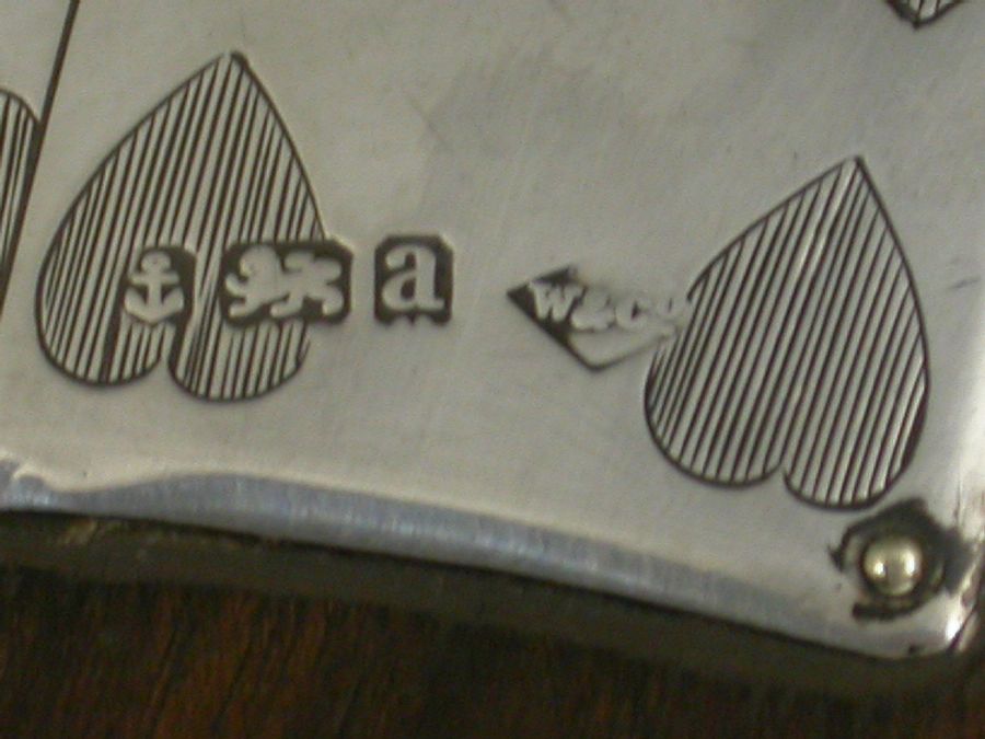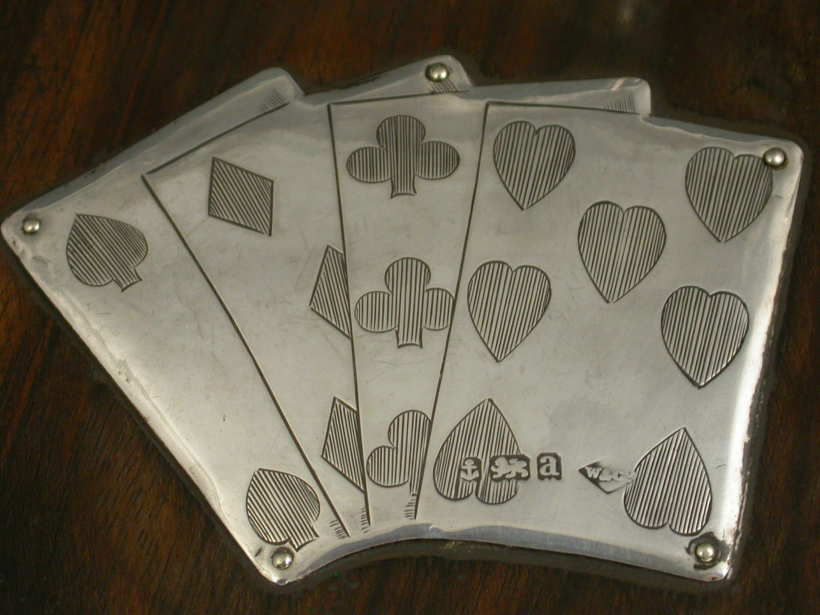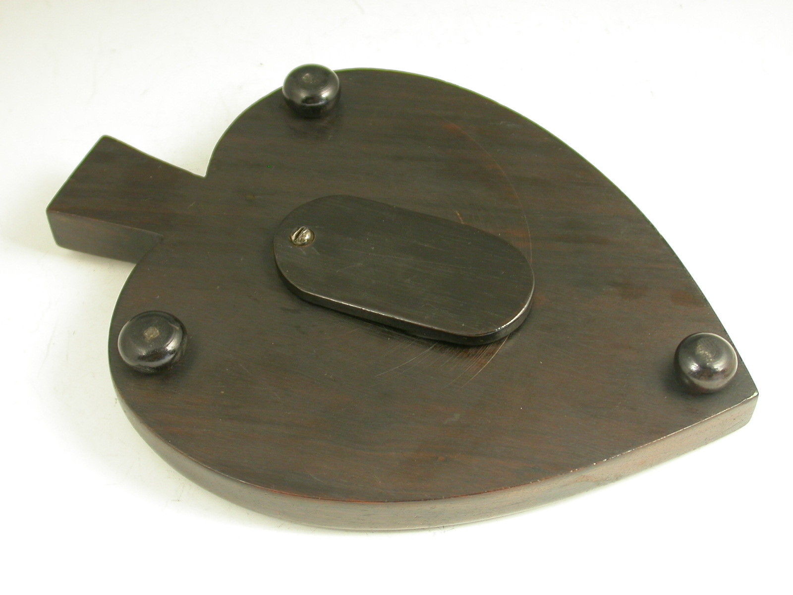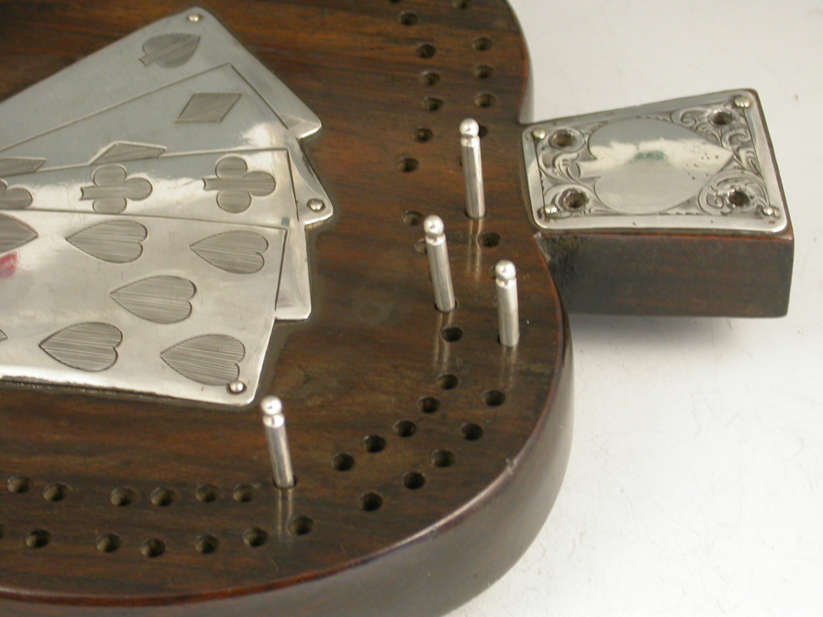 An unusual Victorian silver mounted hardwood novelty Cribbage Board made in the shape of a spade, applied with four silver playing cards and a silver plate to the handle also engraved with a spade suit.