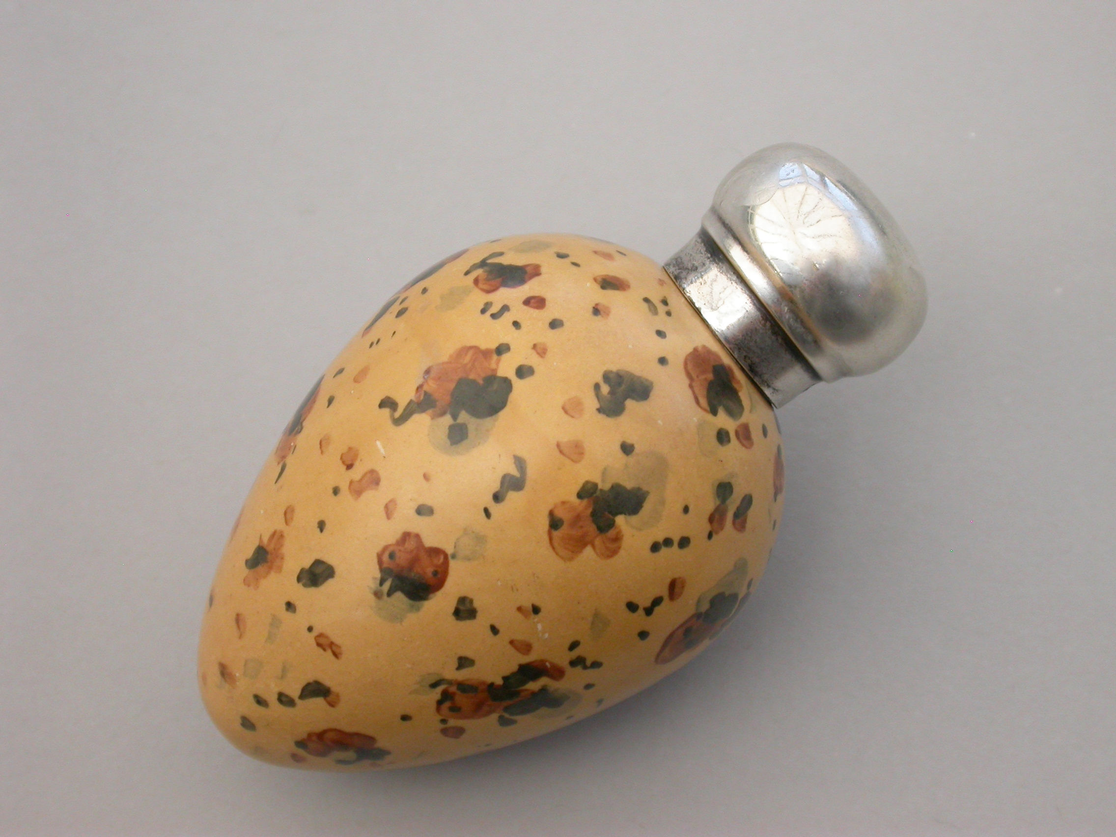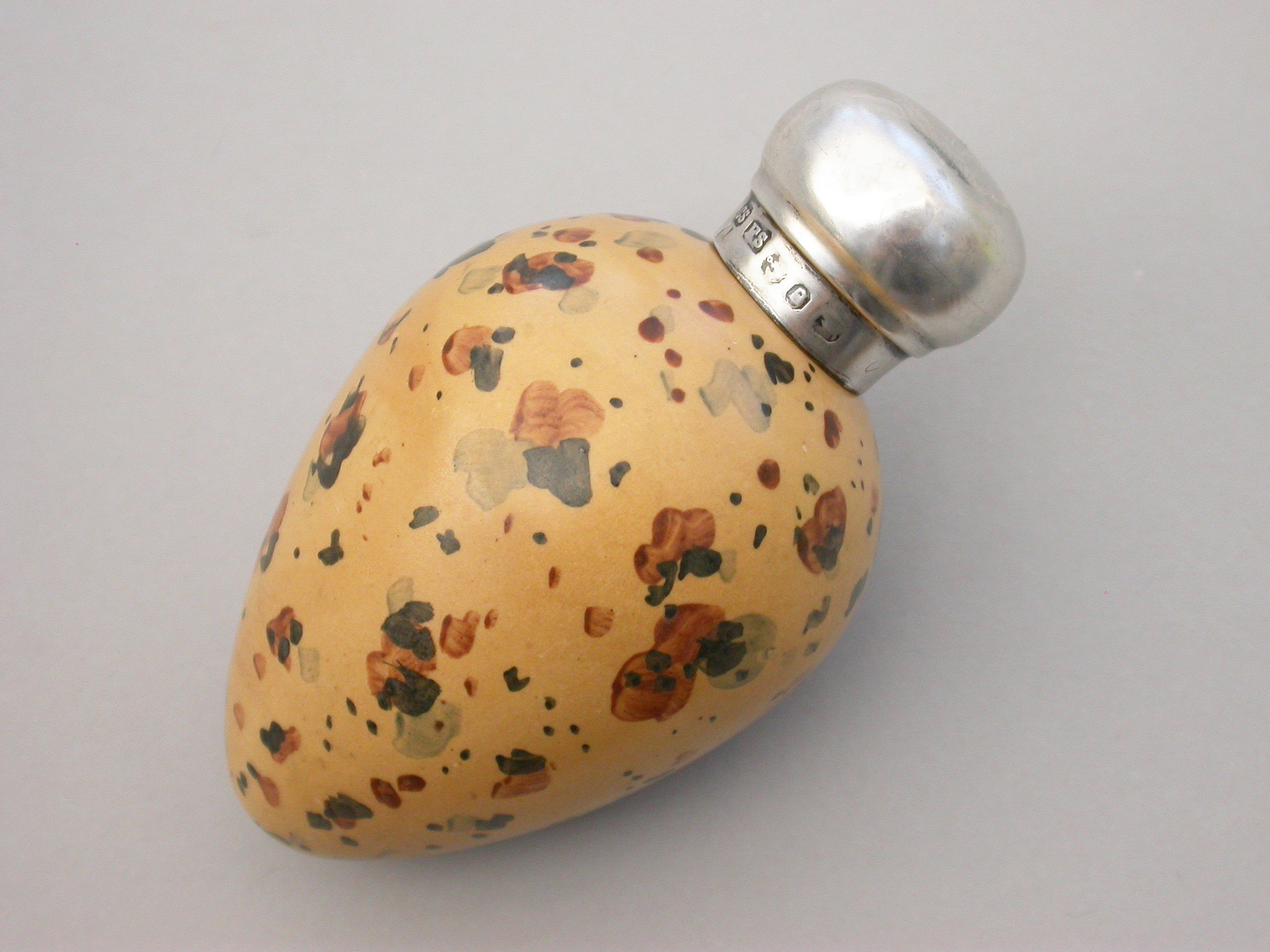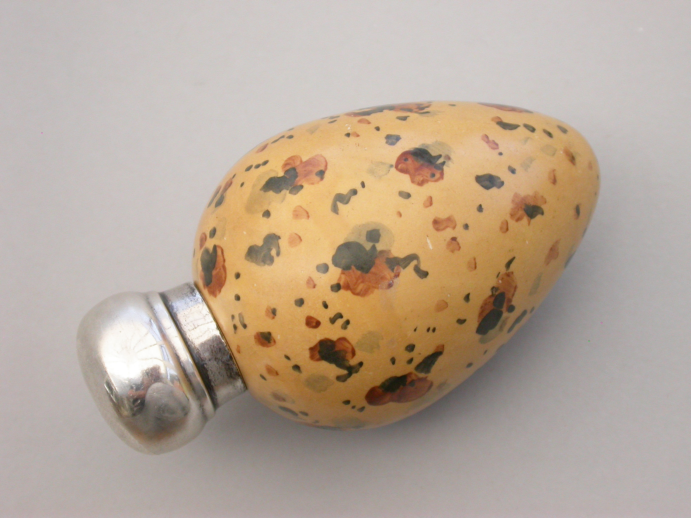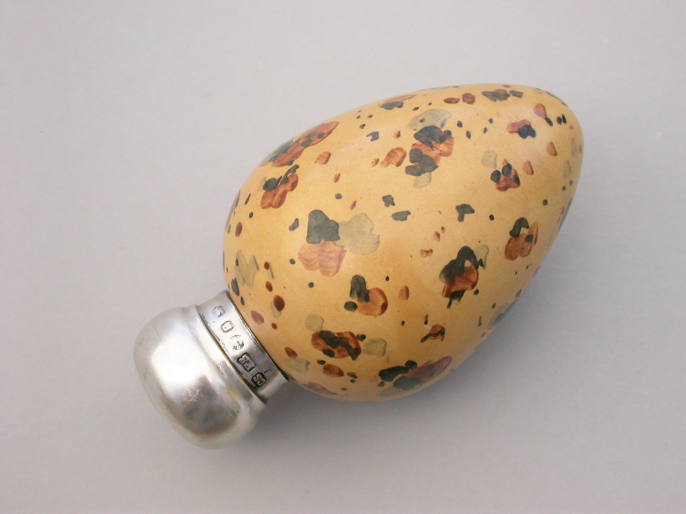 A good Victorian novelty silver and MacIntyre ceramic Scent Bottle made in the form of a Great Black Backed Gulls egg with screw-off top.