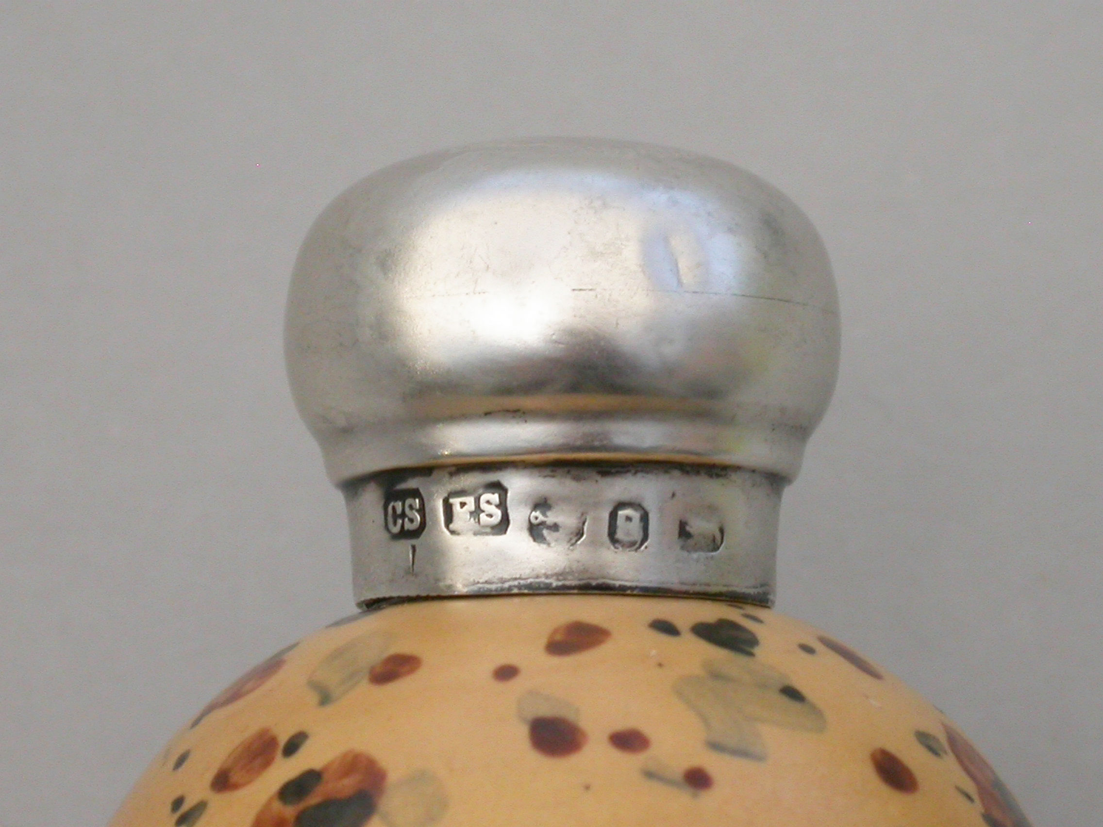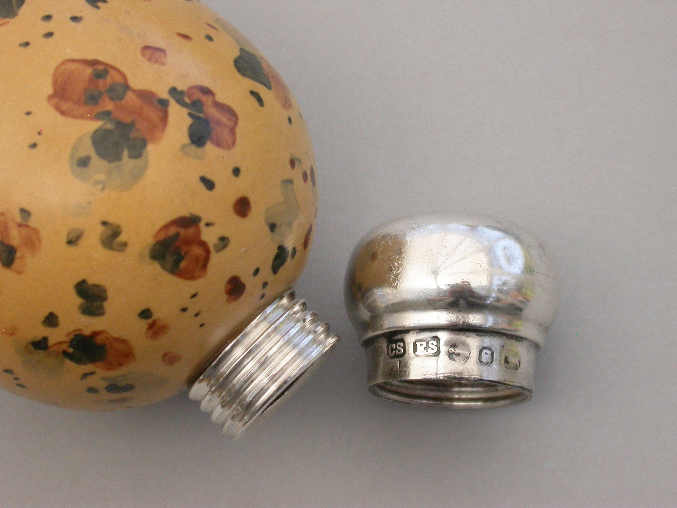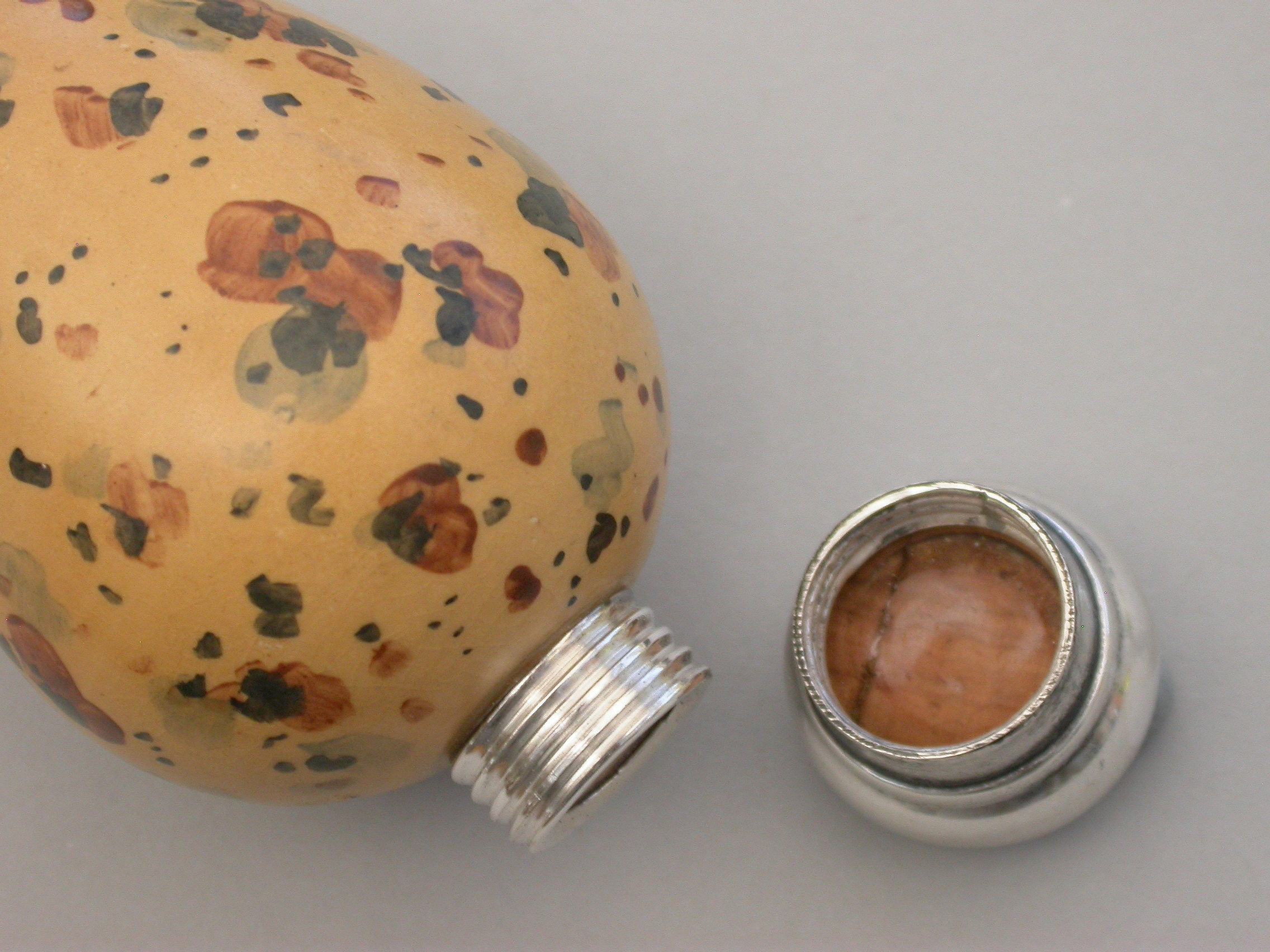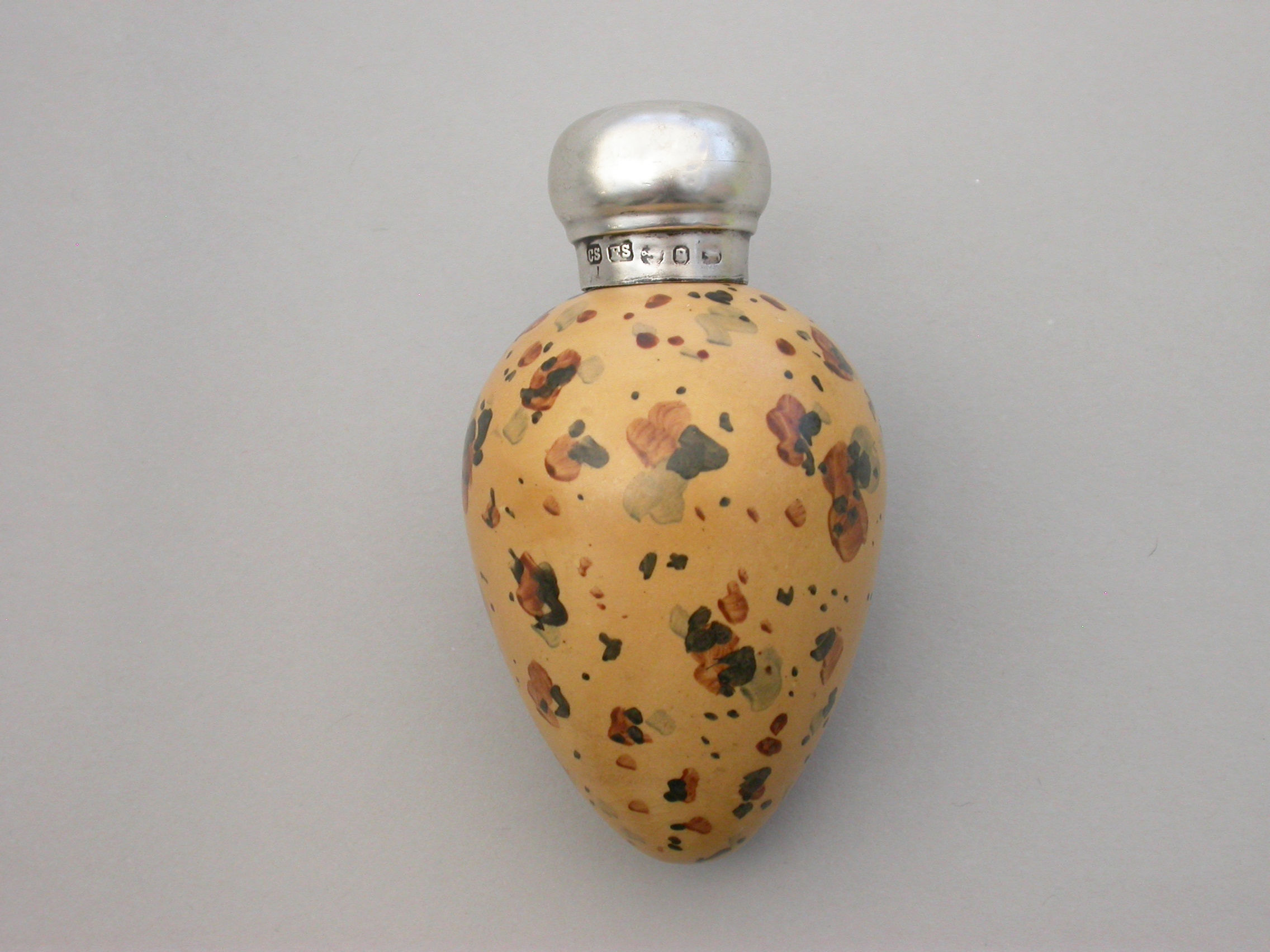 A good Victorian novelty silver and MacIntyre ceramic Scent Bottle made in the form of a Great Black Backed Gulls egg with screw-off top.