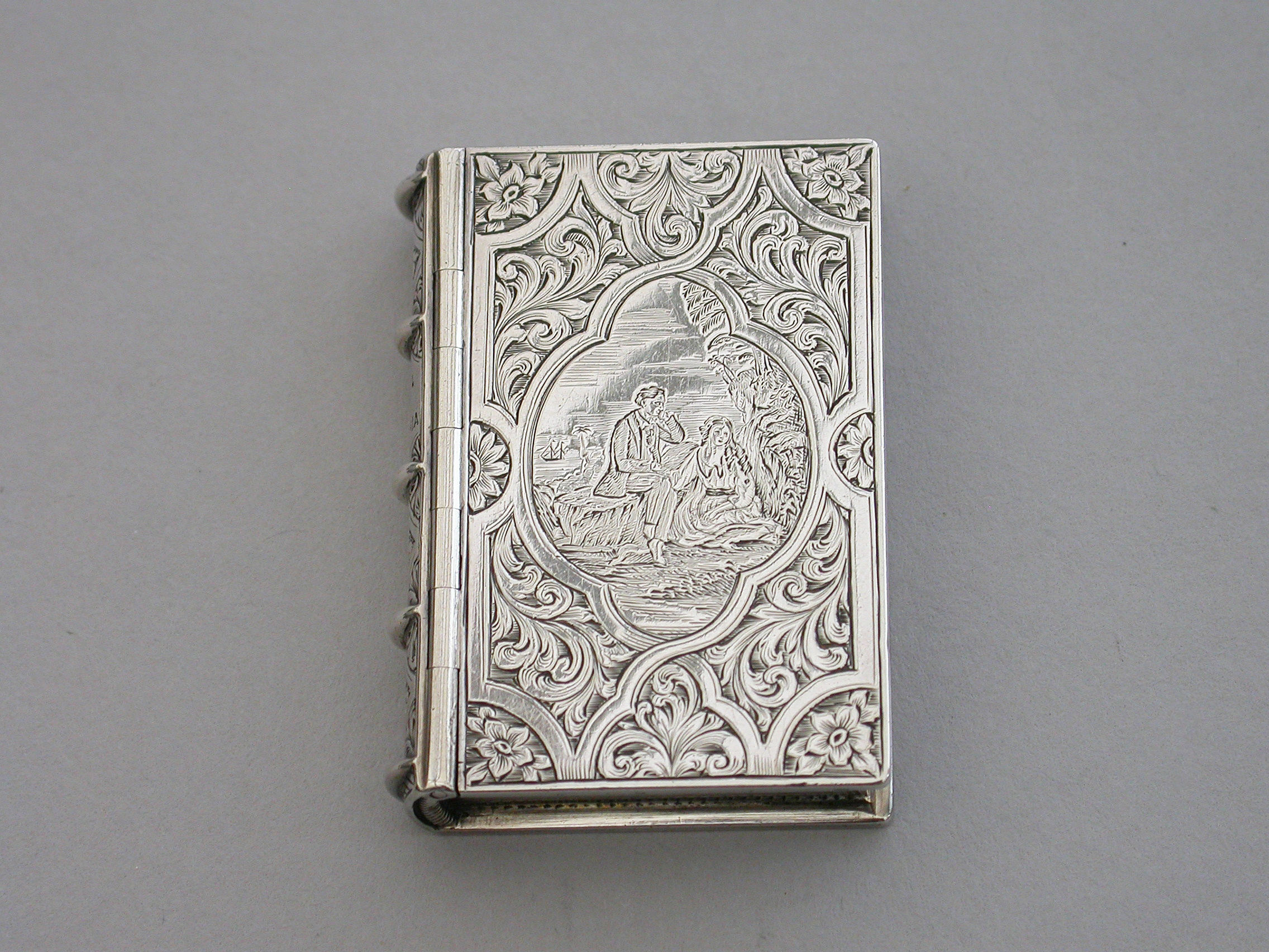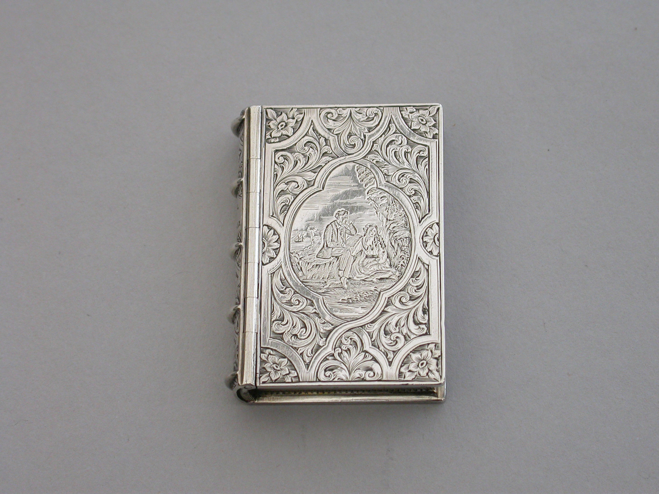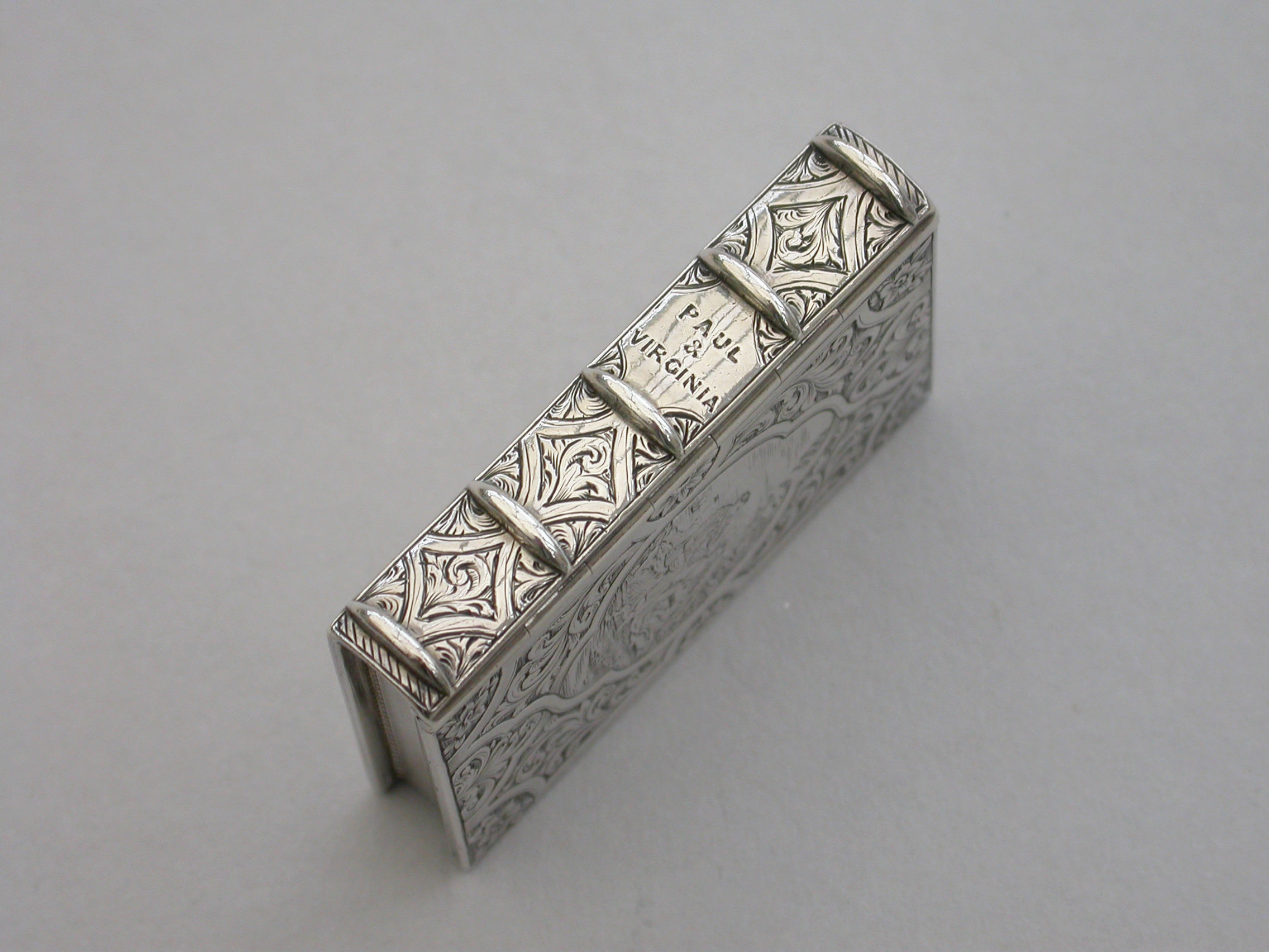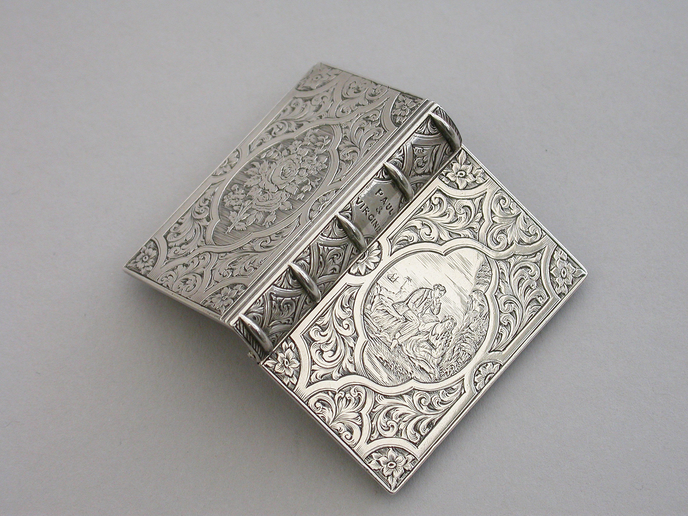 A fine quality Victorian silver Vinaigrette formed as a Book, based on the novel Paul & Virginie (Paul & Virginia) by Jacques-Henri Bernardin de Saint-Pierre, the covers divided into a pattern of shaped panels engraved with foliate motifs around a central panel with a scene of a couple in 18th century dress sitting together in the foreground with a ship in the distance. The back cover with a panel decorated with a rose spray. The spine of the book engraved with the title - Paul & Virginia. The silver gilt interior with scroll pierced grille.