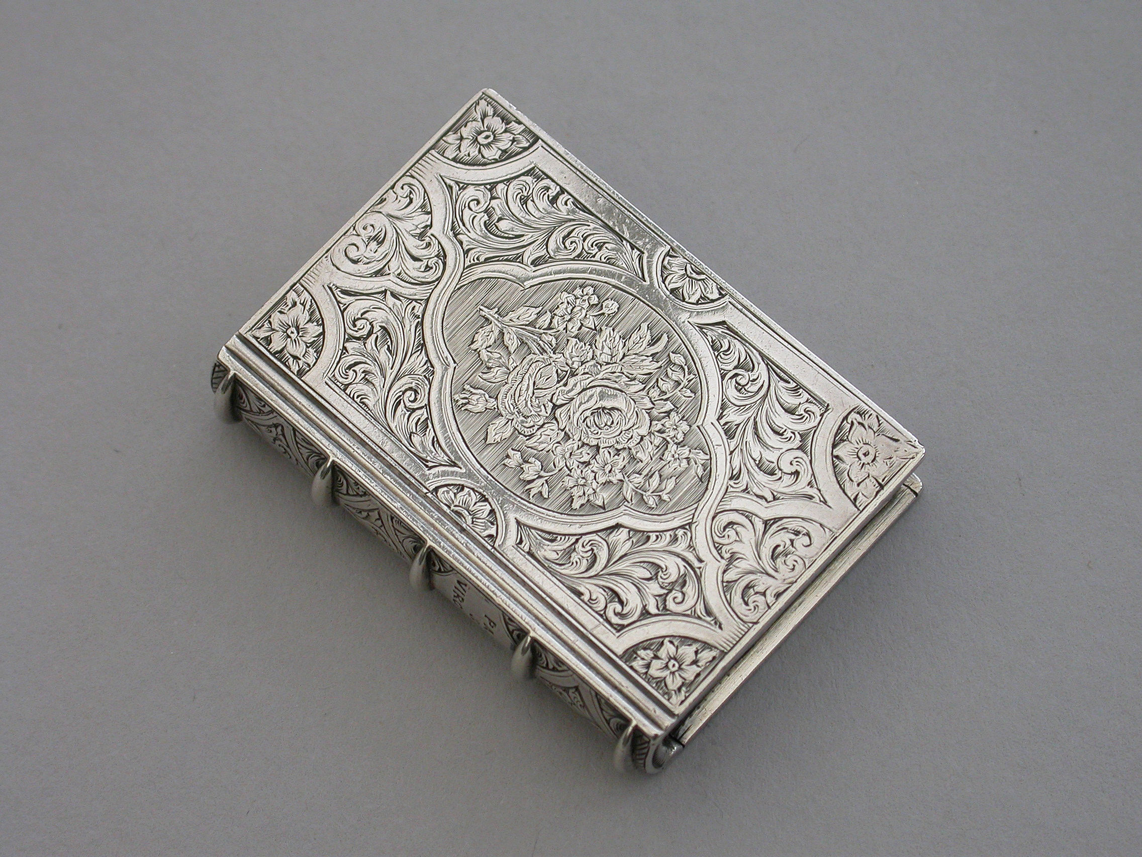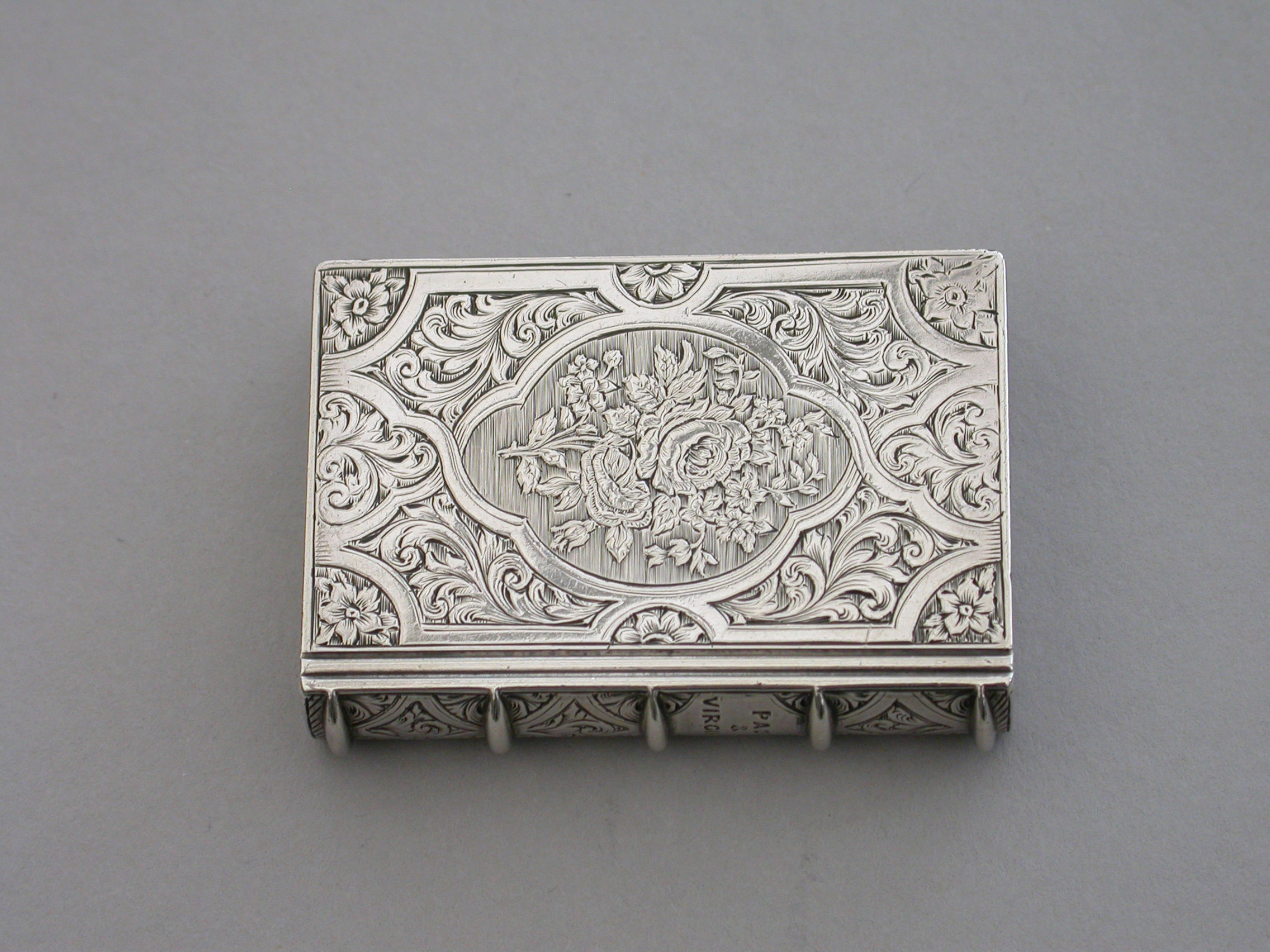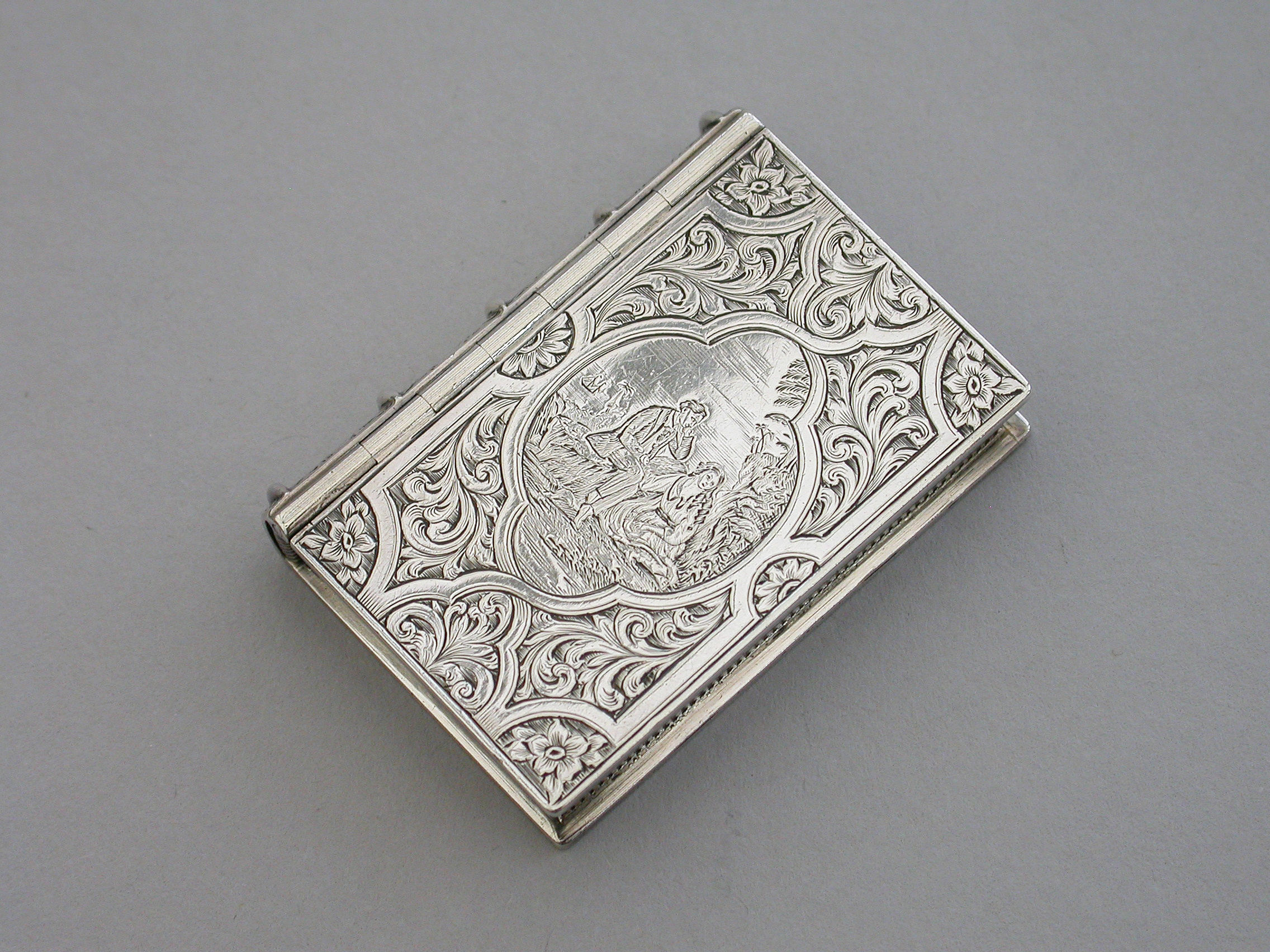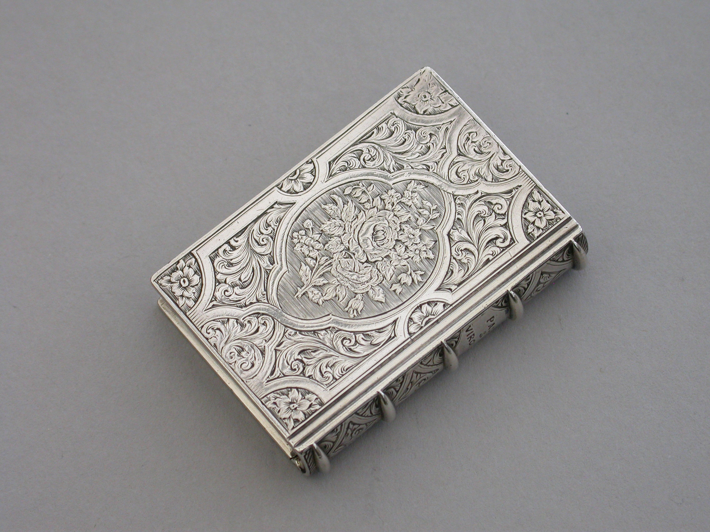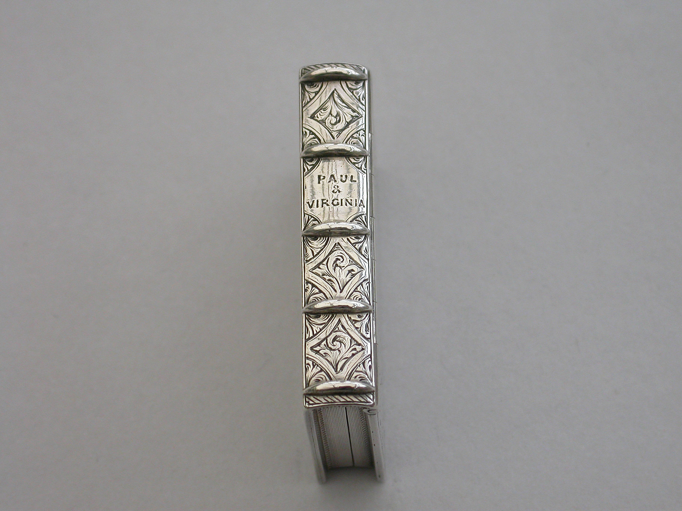 A fine quality Victorian silver Vinaigrette formed as a Book, based on the novel Paul & Virginie (Paul & Virginia) by Jacques-Henri Bernardin de Saint-Pierre, the covers divided into a pattern of shaped panels engraved with foliate motifs around a central panel with a scene of a couple in 18th century dress sitting together in the foreground with a ship in the distance. The back cover with a panel decorated with a rose spray. The spine of the book engraved with the title - Paul & Virginia. The silver gilt interior with scroll pierced grille.