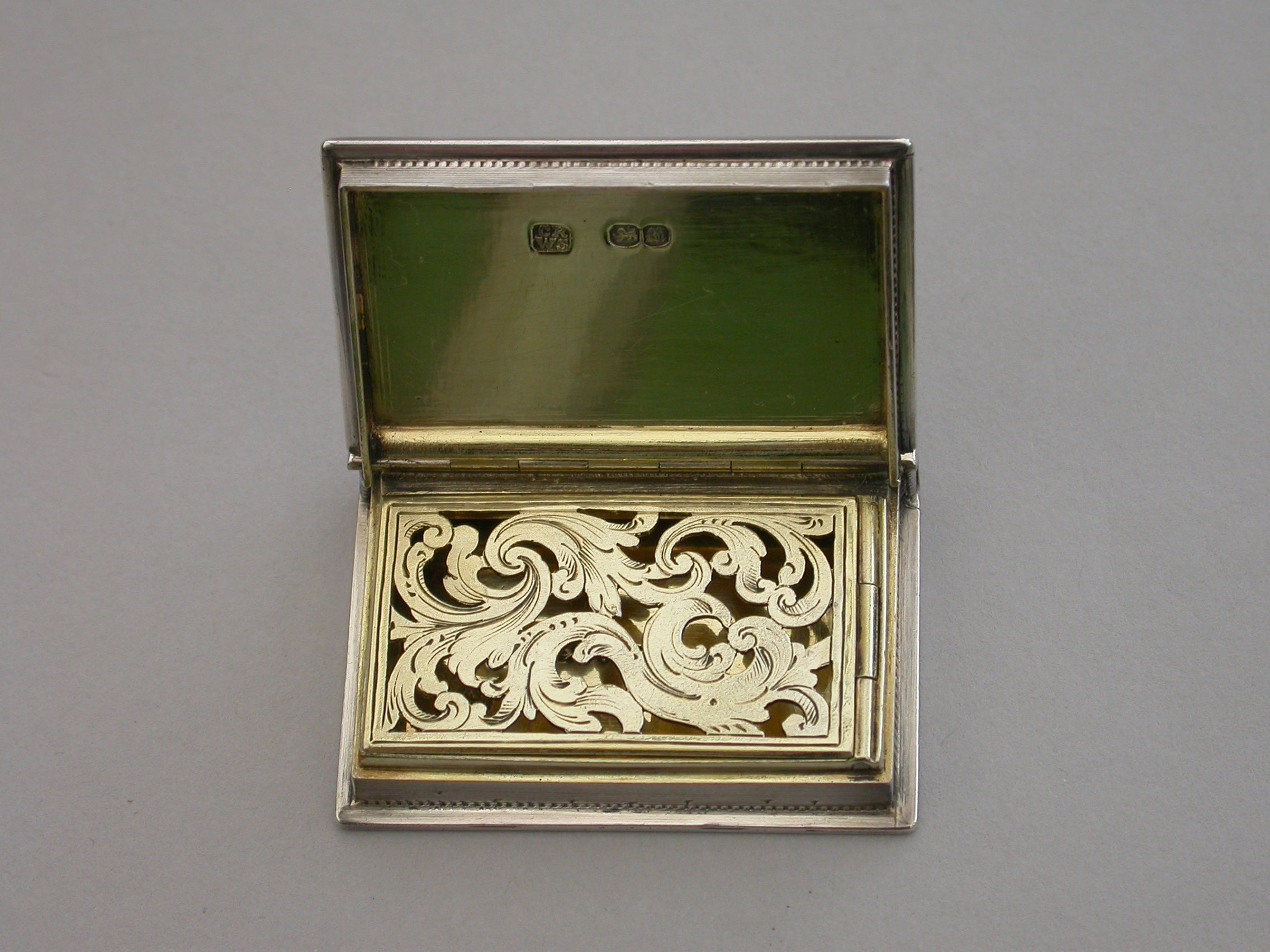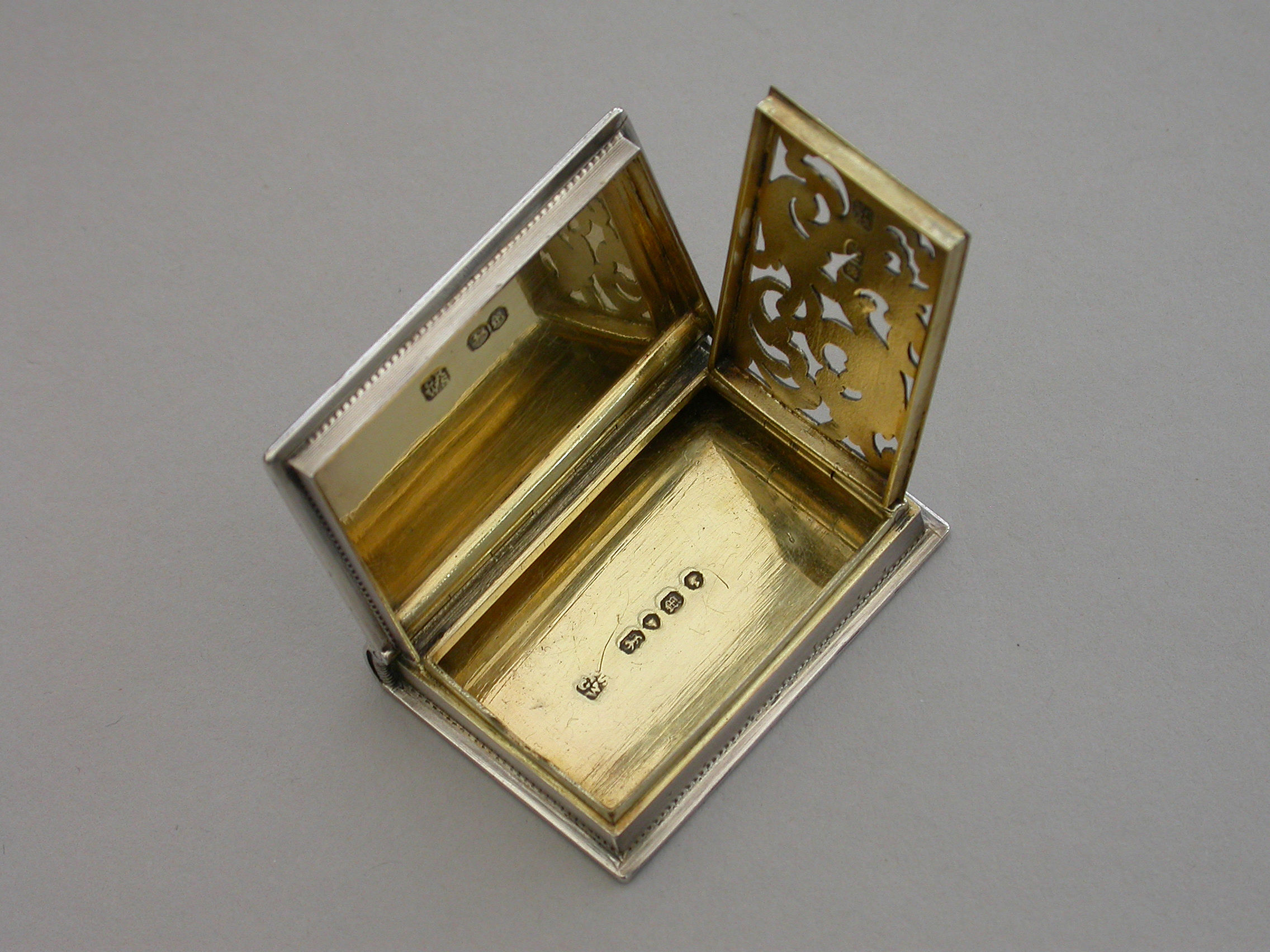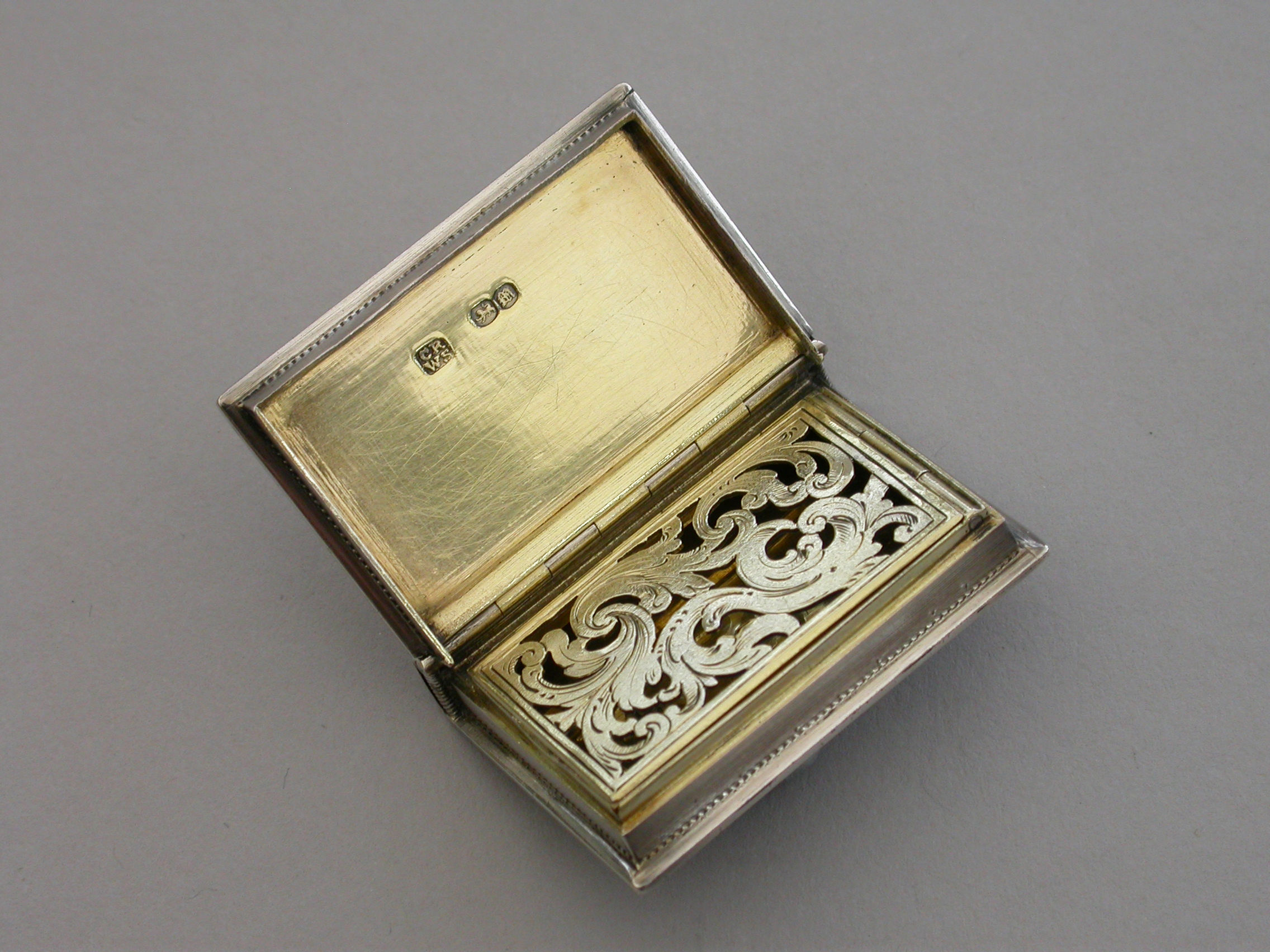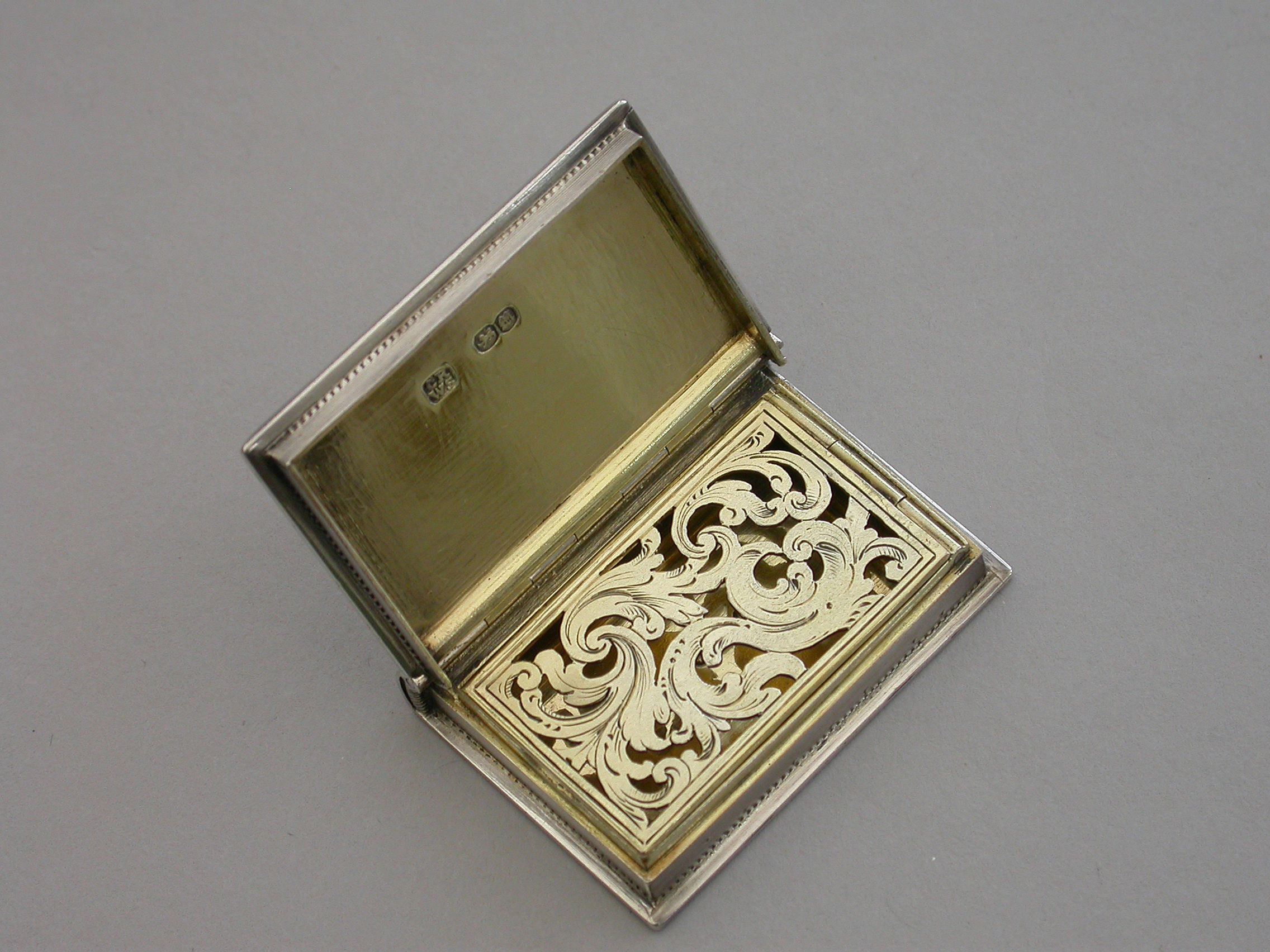 A fine quality Victorian silver Vinaigrette formed as a Book, based on the novel Paul & Virginie (Paul & Virginia) by Jacques-Henri Bernardin de Saint-Pierre, the covers divided into a pattern of shaped panels engraved with foliate motifs around a central panel with a scene of a couple in 18th century dress sitting together in the foreground with a ship in the distance. The back cover with a panel decorated with a rose spray. The spine of the book engraved with the title - Paul & Virginia. The silver gilt interior with scroll pierced grille.