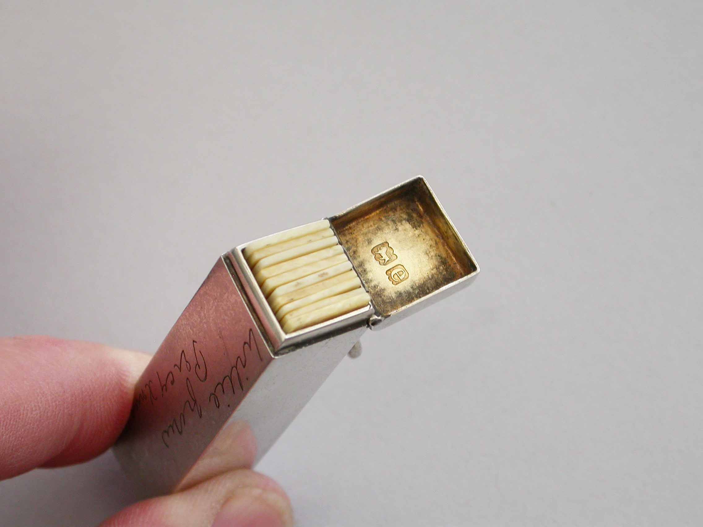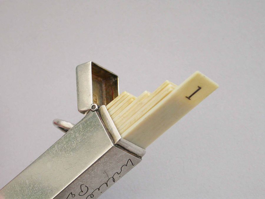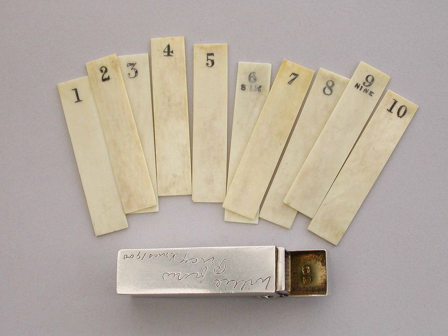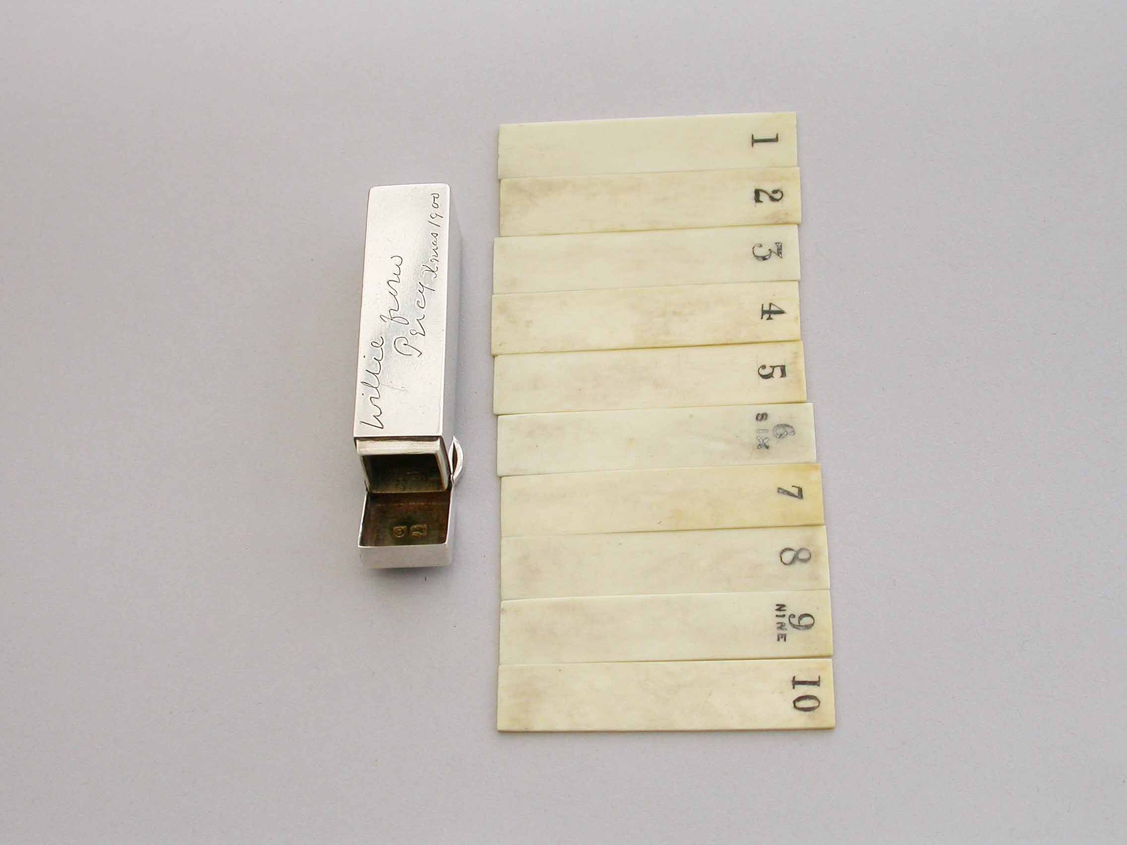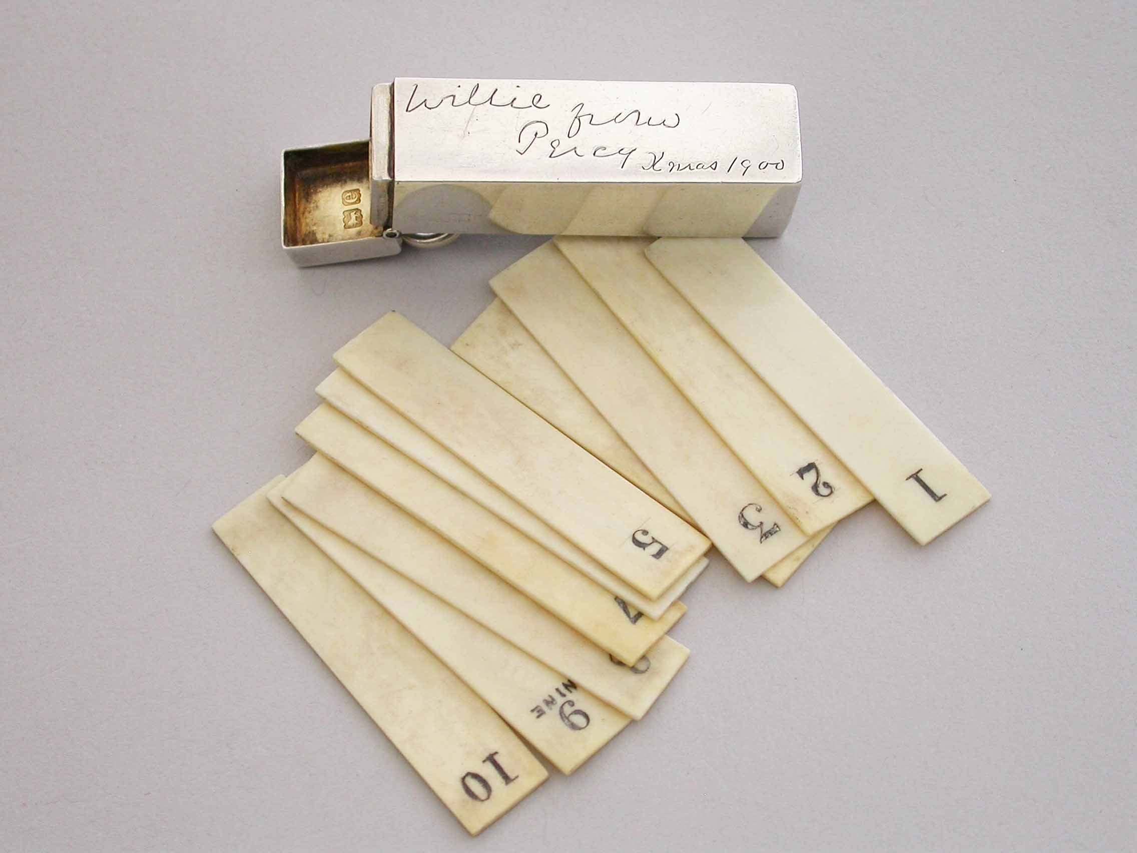 A good quality late Victorian silver Butt Marker of plain rectangular form with hinged lid and attached suspension ring, the silver gilt interior containing ten numbered bone pegs. The case engraved - "Willie from Percy Xmas 1900".