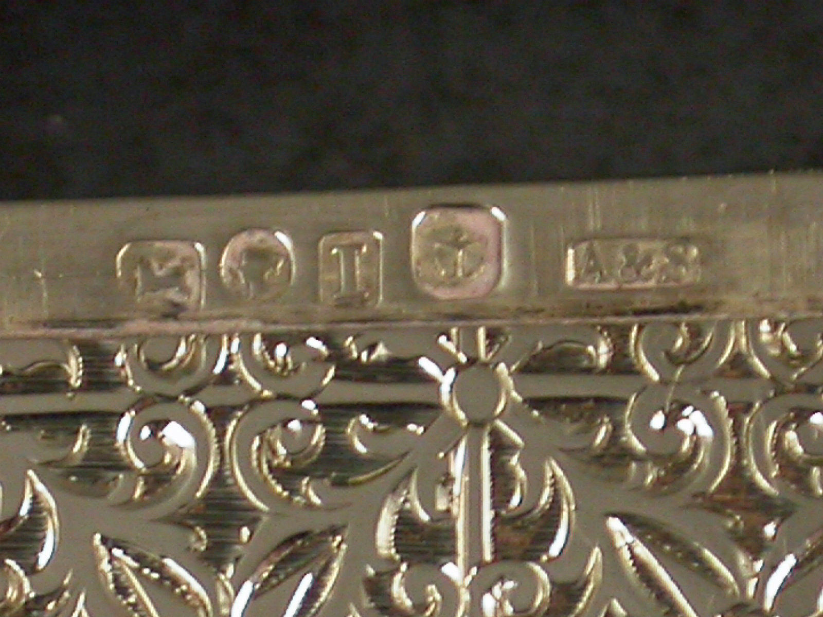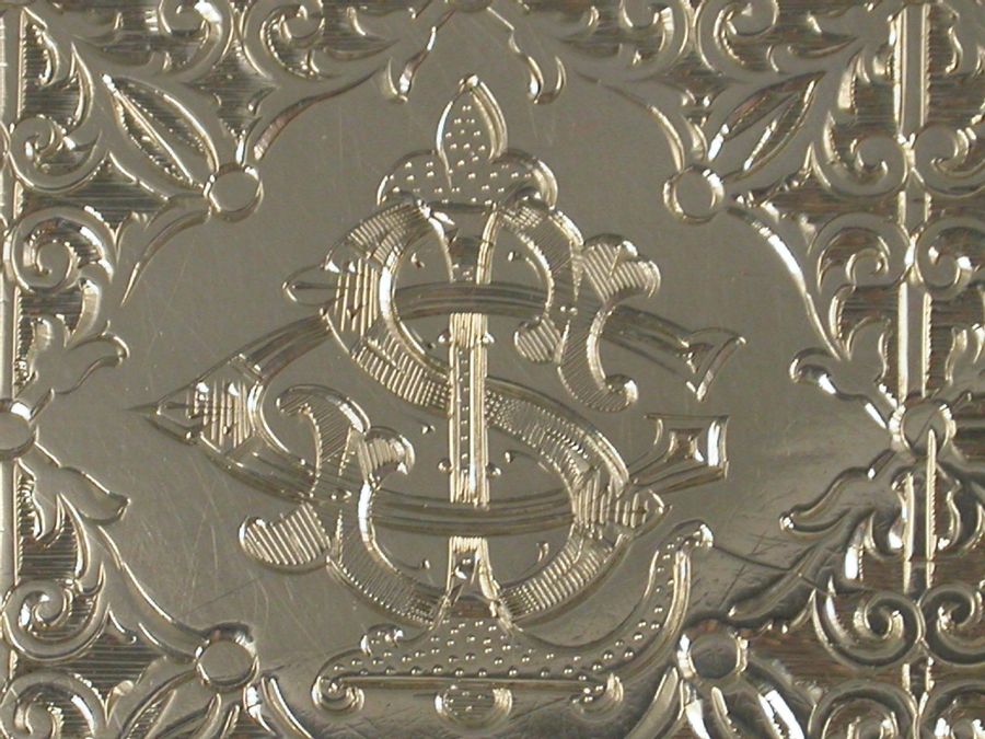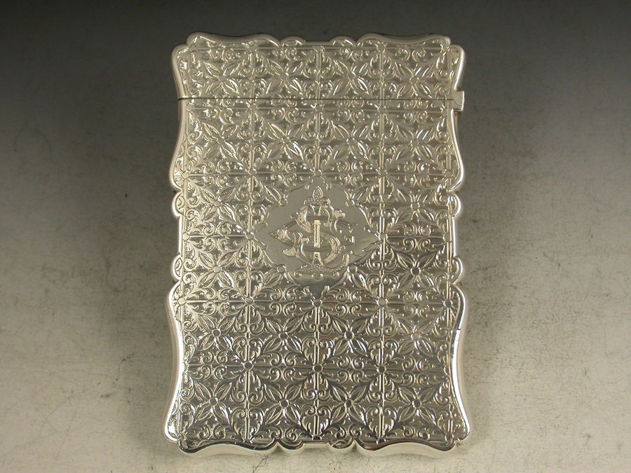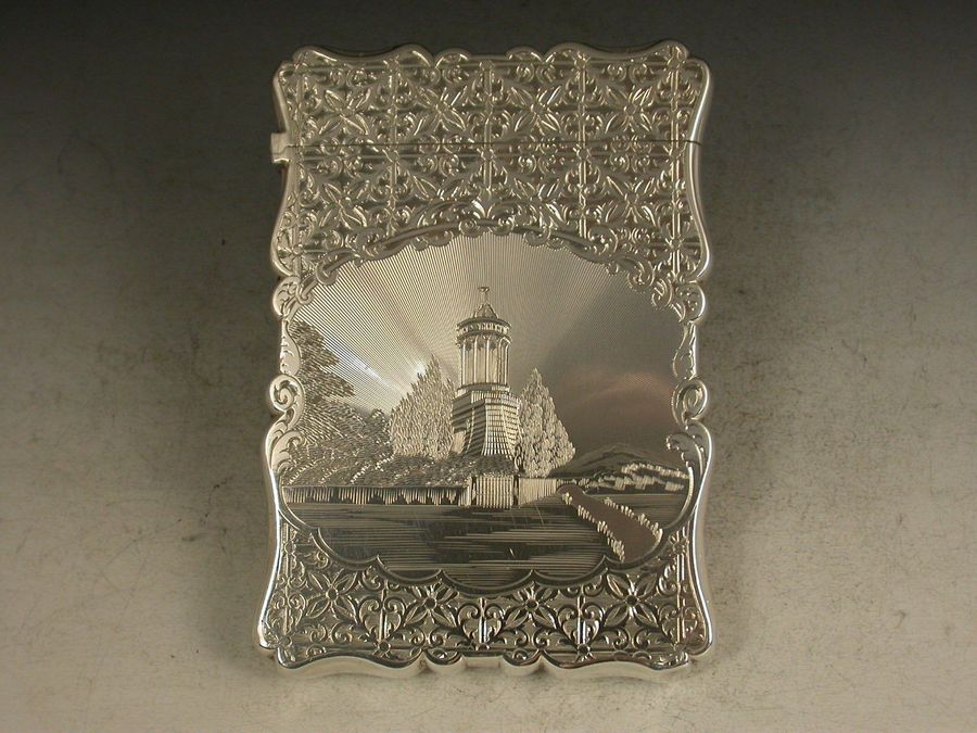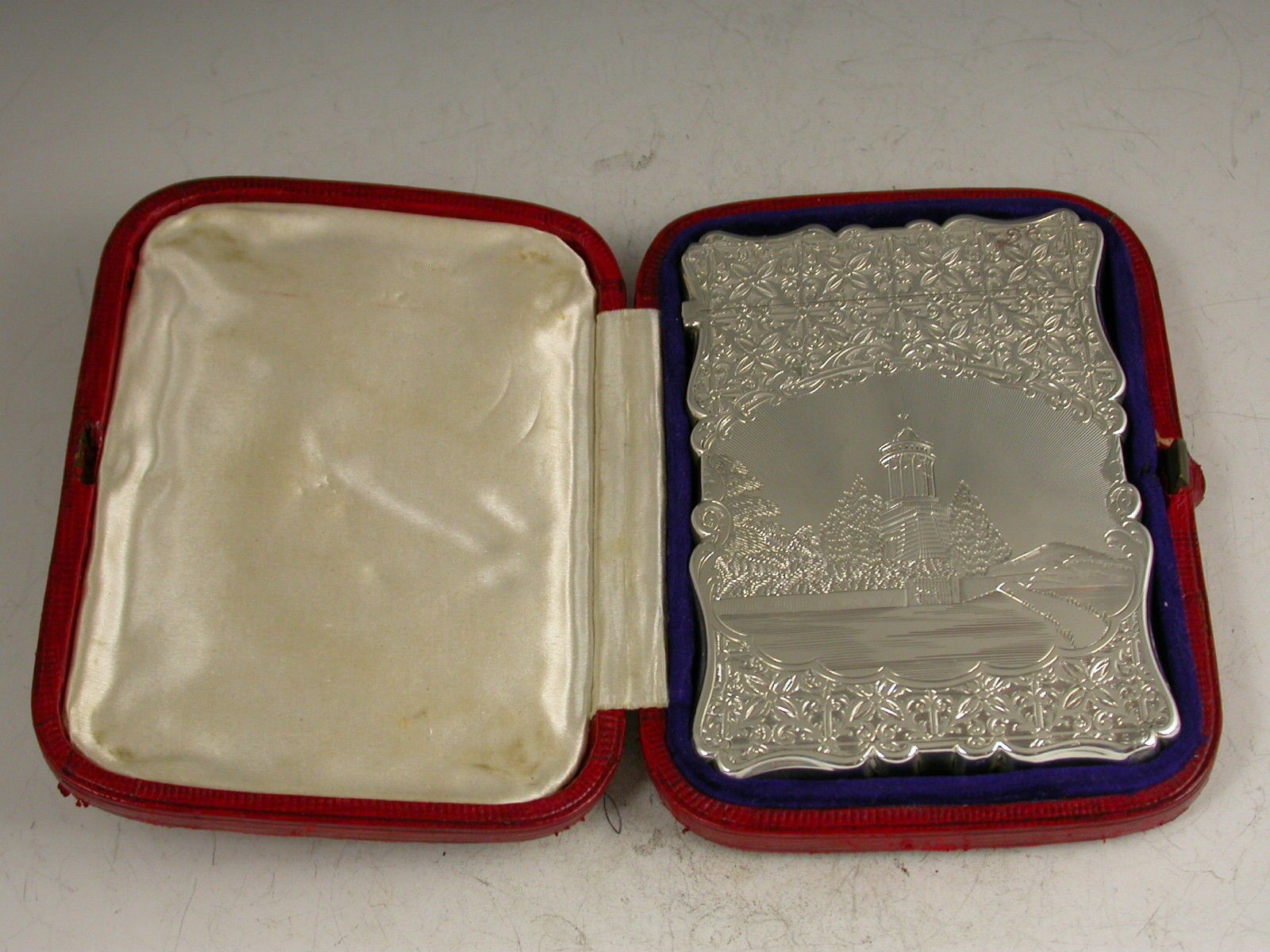 A very fine Victorian silver Card Case of shaped rectangular form with hinged lid, the reverse engraved with a geometric pattern and diamond shaped cartouche engraved with contemporary initials. The face with a similar pattern and a shaped panel depicting the Burns Monument in Scotland. Complete with original silk and velvet lined Morocco leather case.