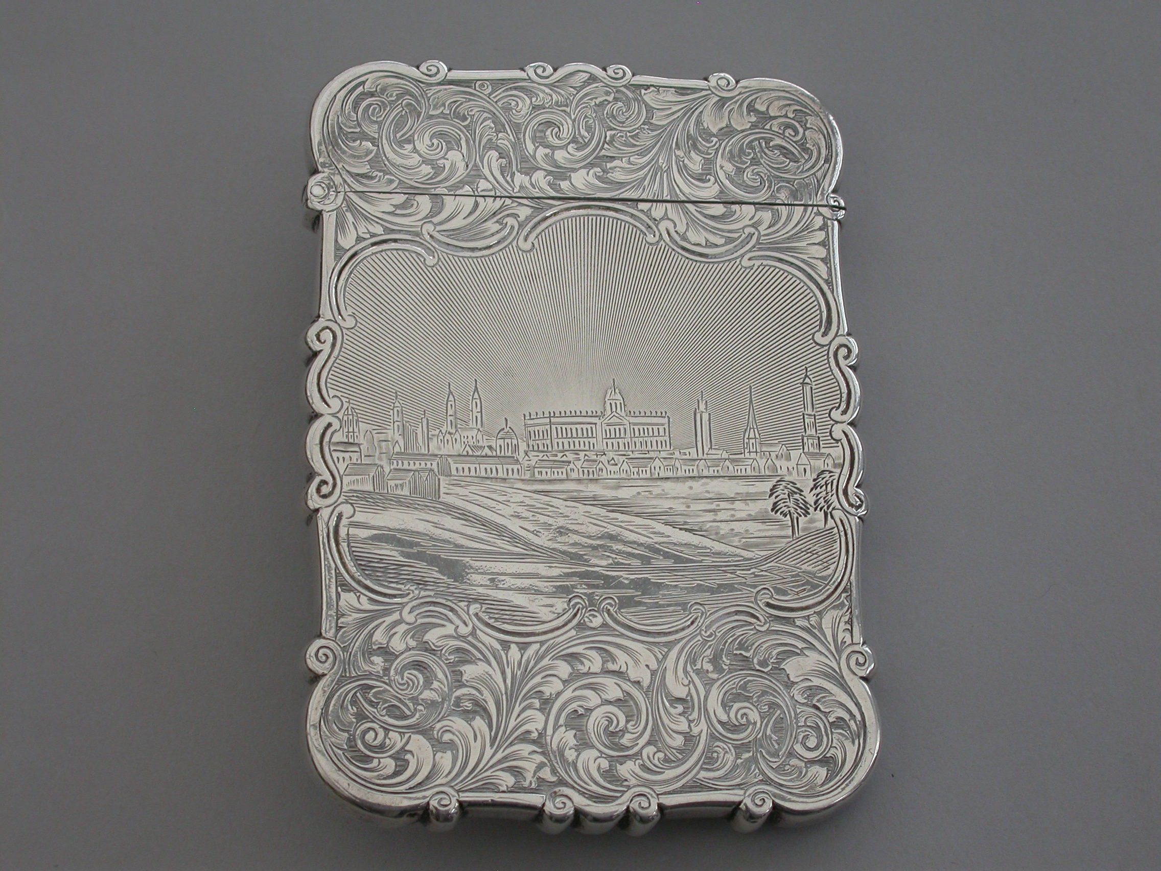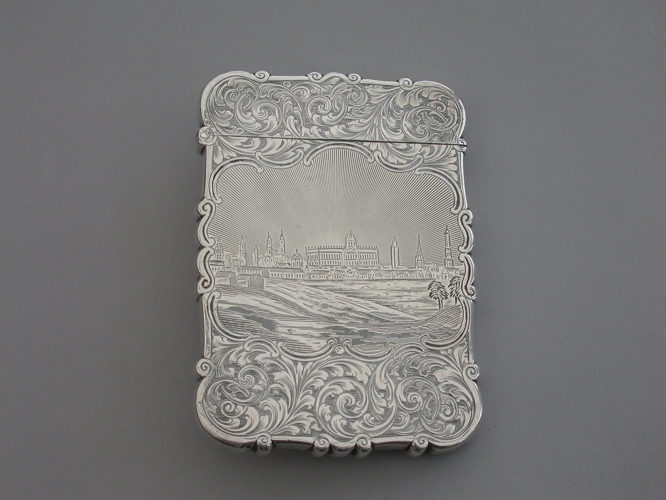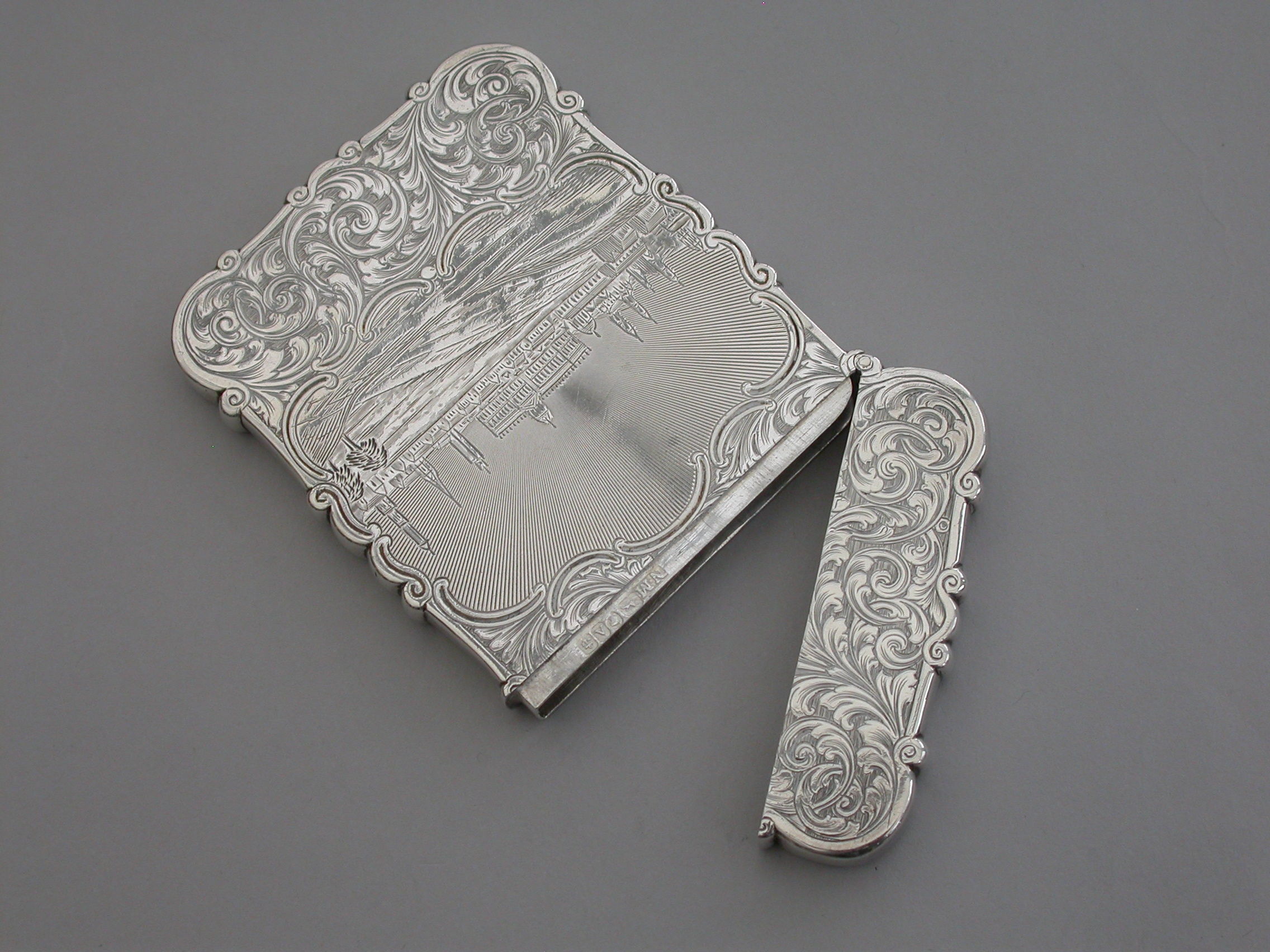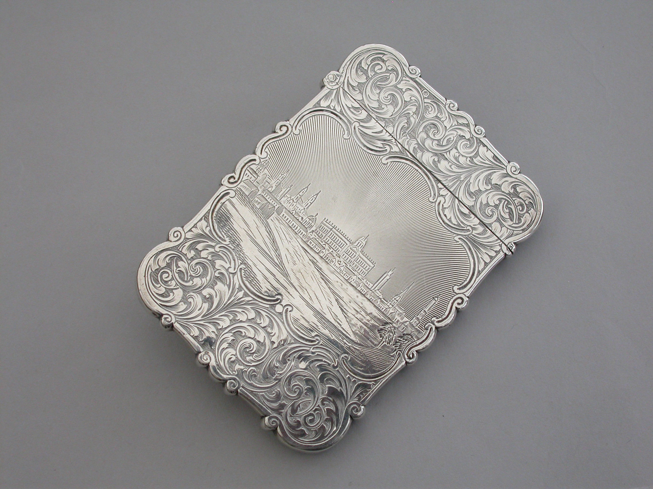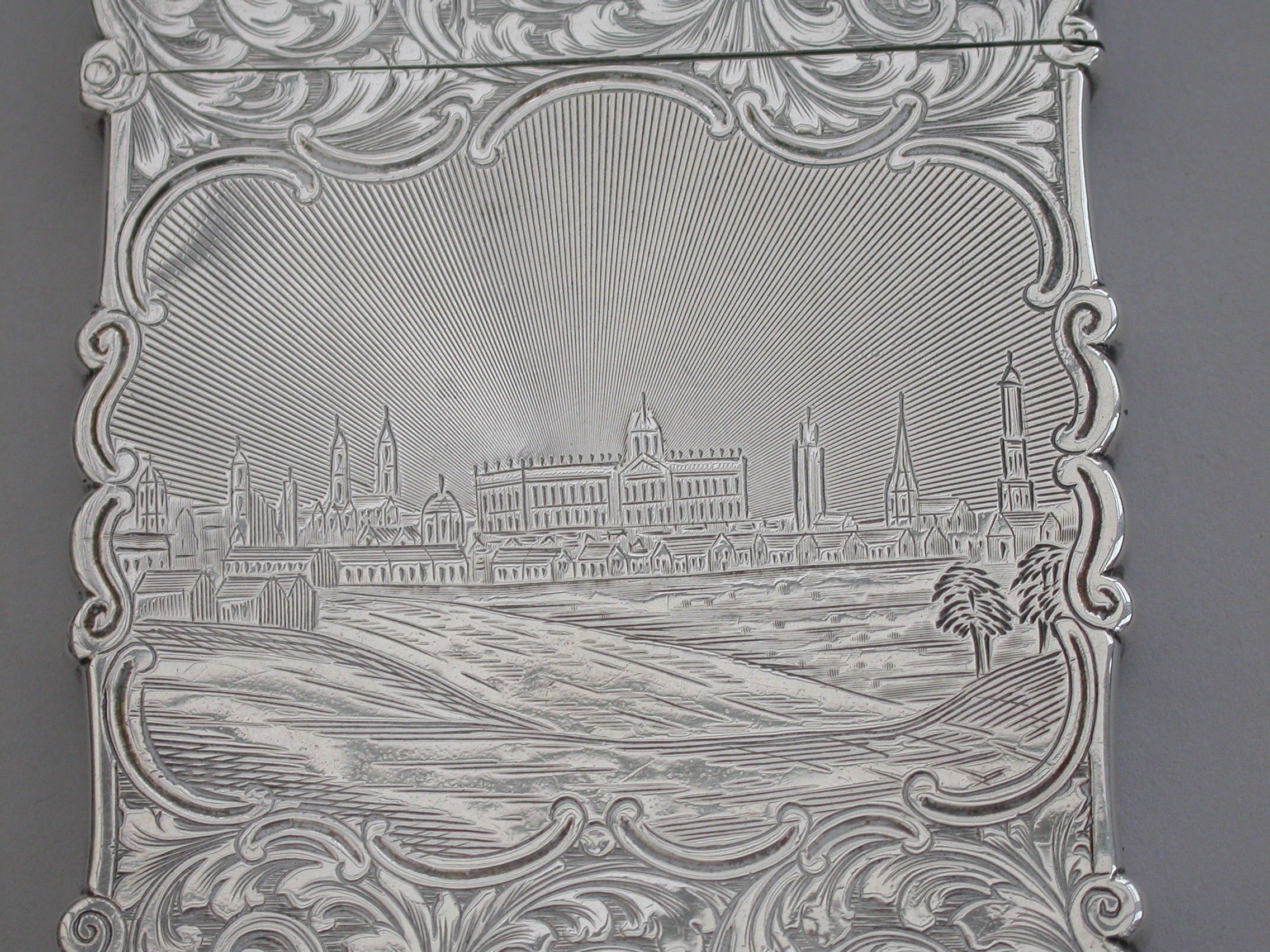An extremely rare Victorian silver castle-top Card Case of shaped rectangular form with engraved foliate scroll decoration, the reverse with a shaped cartouche engraved with a contemporary crest, motto and initials. The front with a shaped panel engraved with a view of the City of Berlin in Germany.