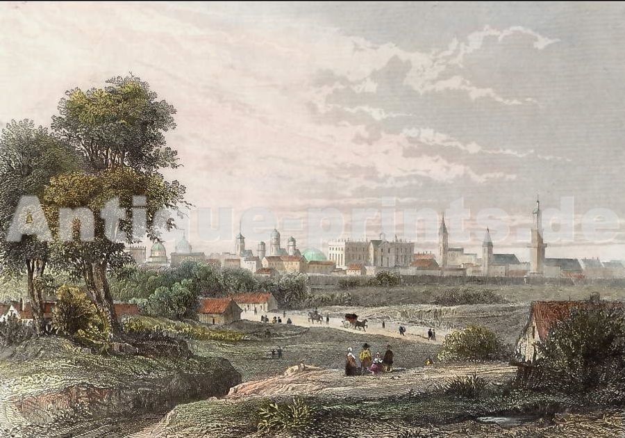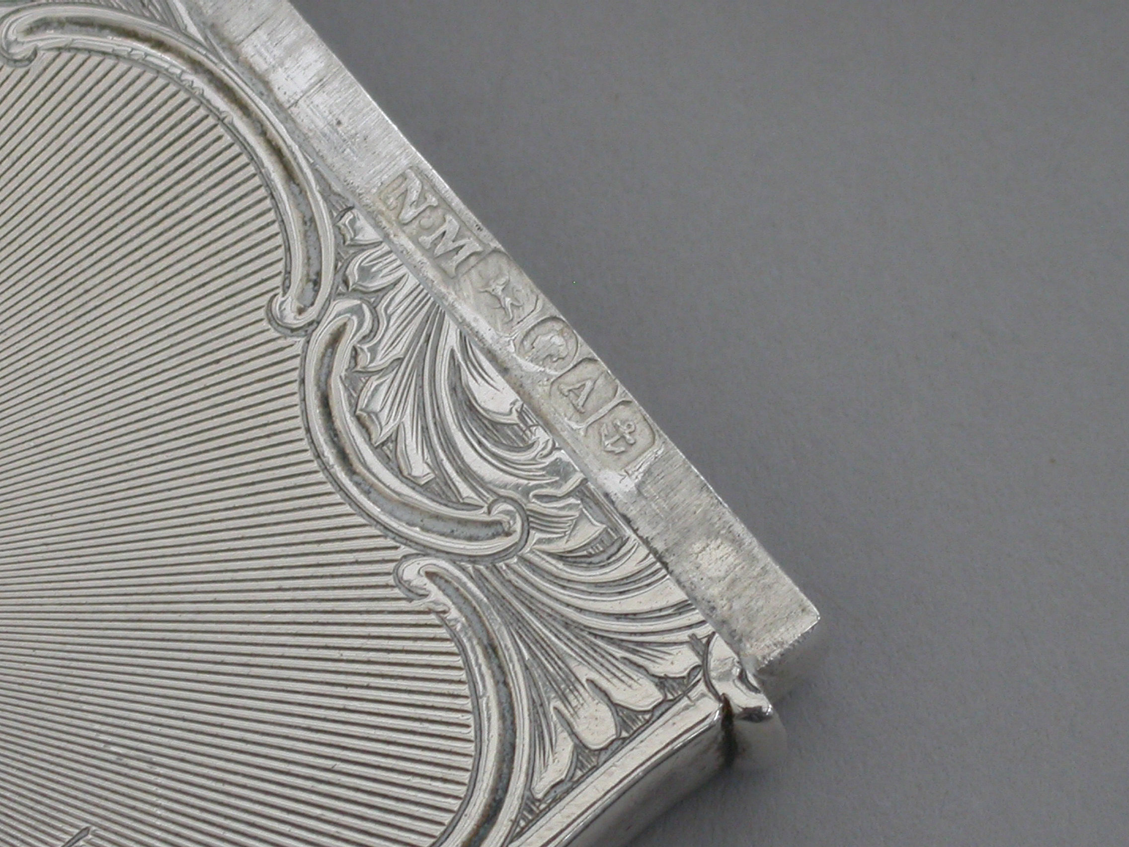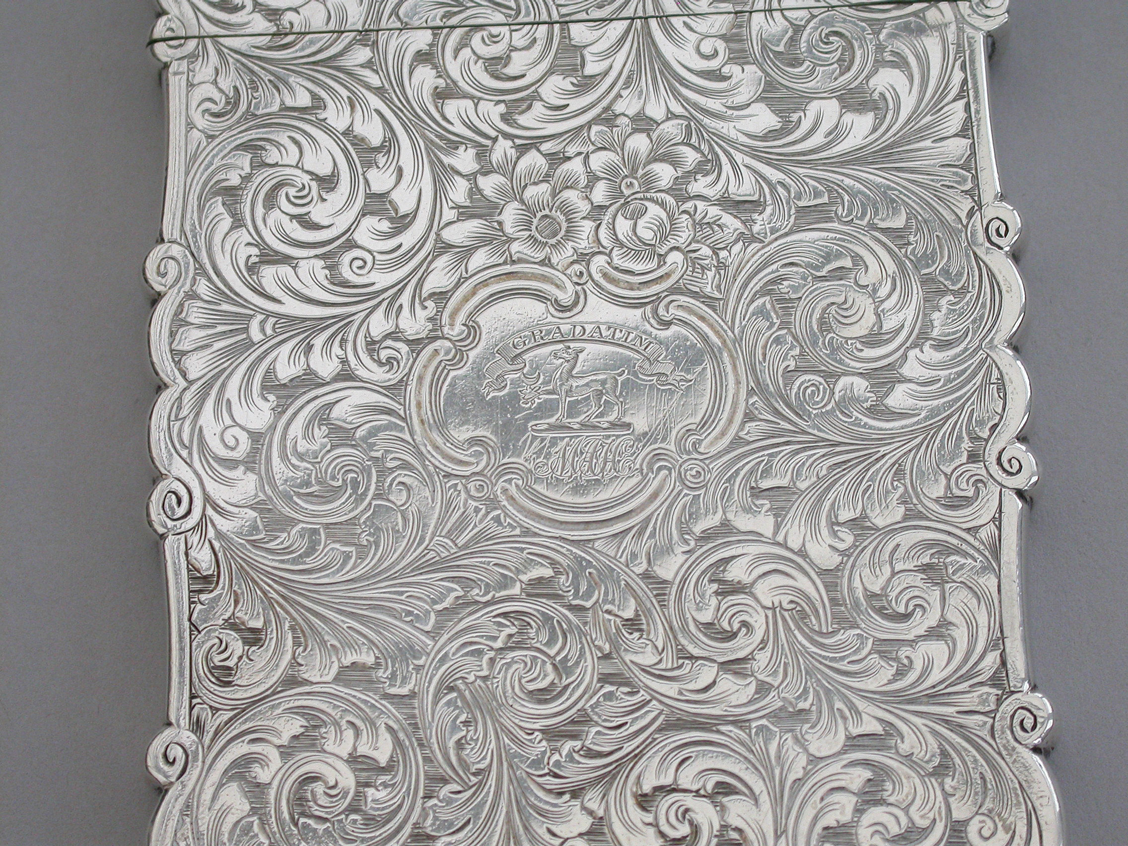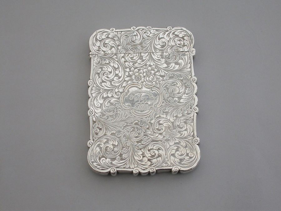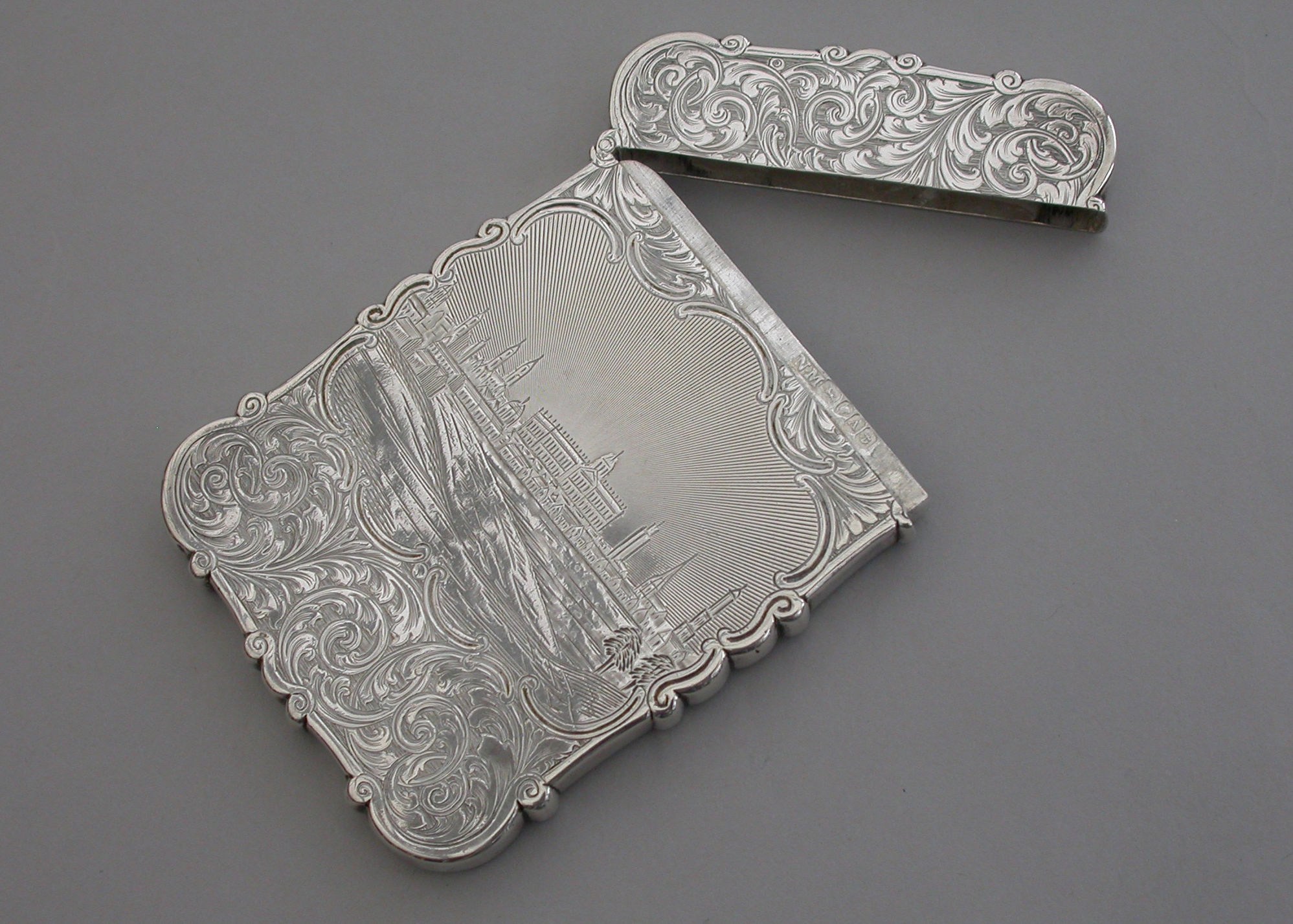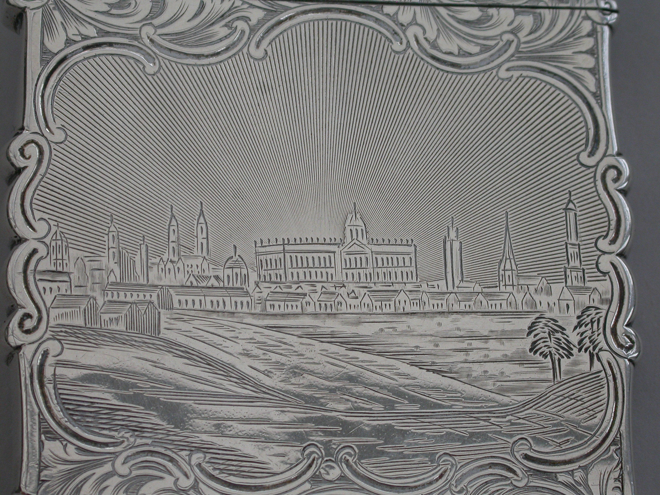 An extremely rare Victorian silver castle-top Card Case of shaped rectangular form with engraved foliate scroll decoration, the reverse with a shaped cartouche engraved with a contemporary crest, motto and initials. The front with a shaped panel engraved with a view of the City of Berlin in Germany.
