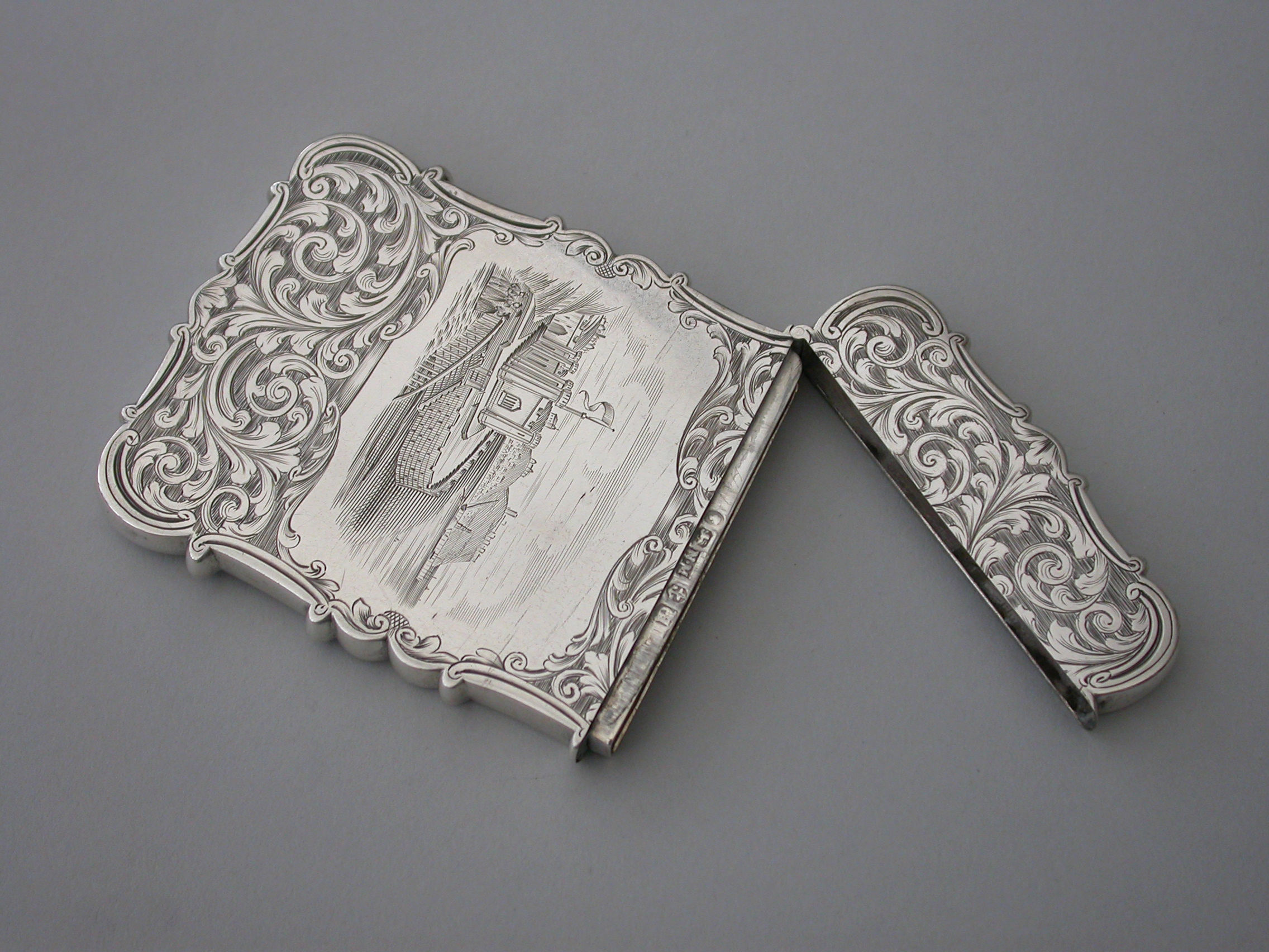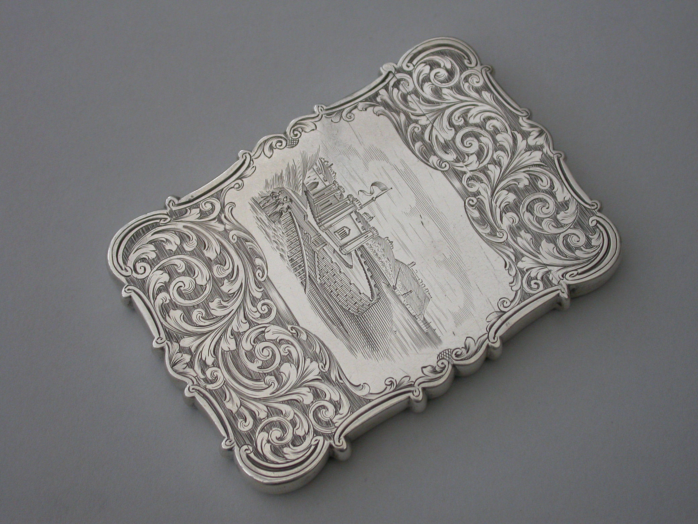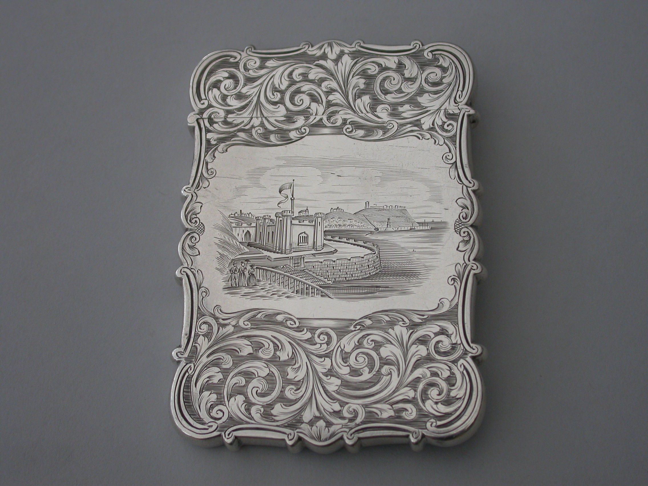 An extremely rare early Victorian silver "castle-top" Card Case of shaped rectangular form with foliate scroll engraved decoration on a matt background, the reverse with a vacant shield shaped cartouche, the front with a shaped panel engraved with a view of the Gothic Spa or Salon at Scarborough designed by Henry Wyatt and opened in 1839.
