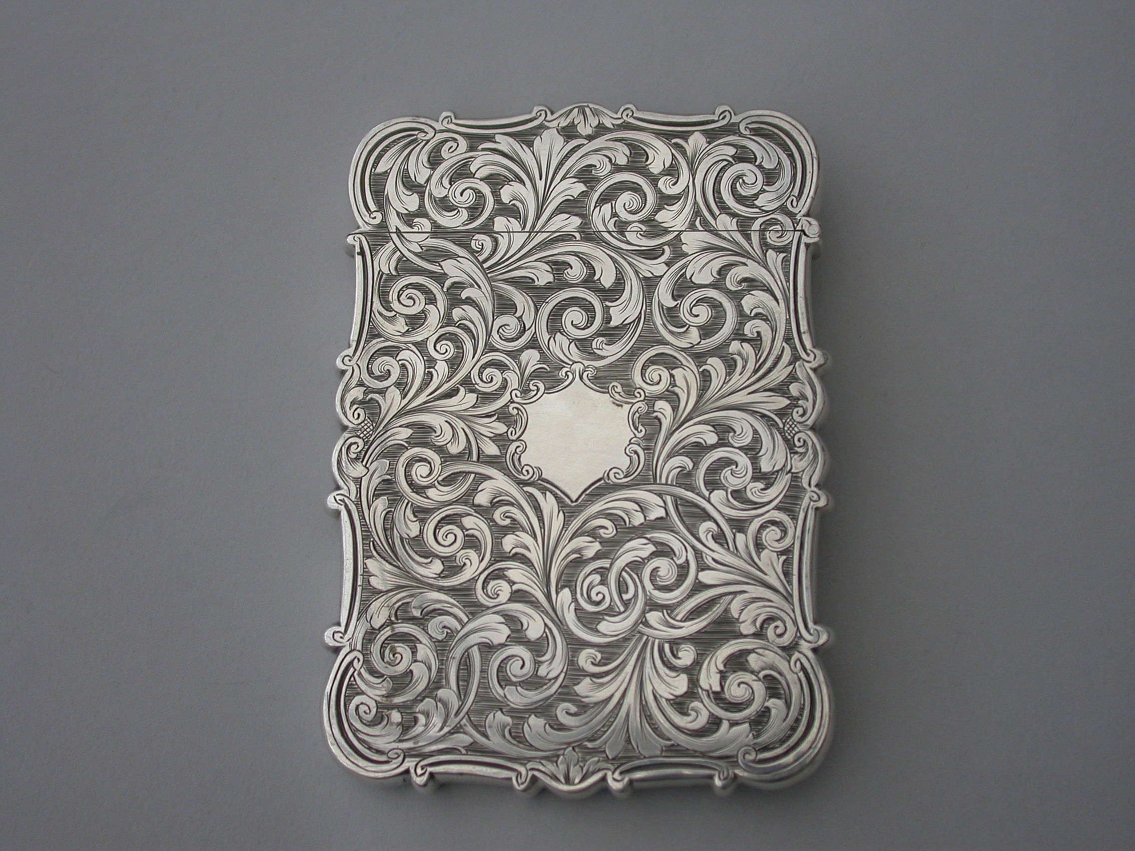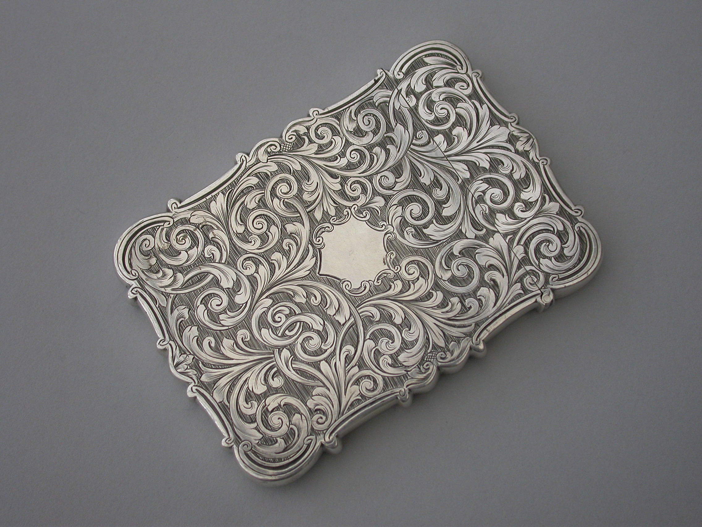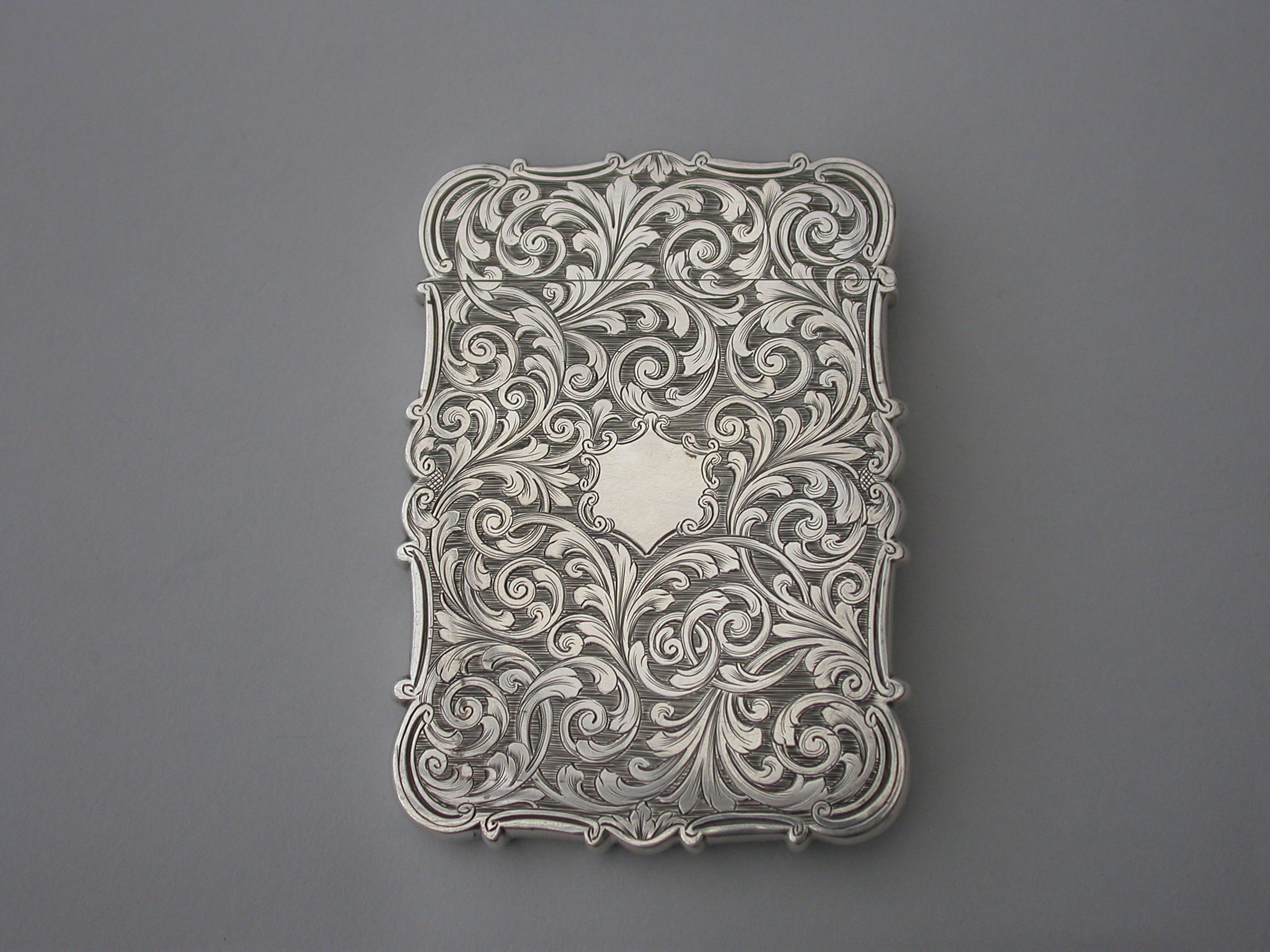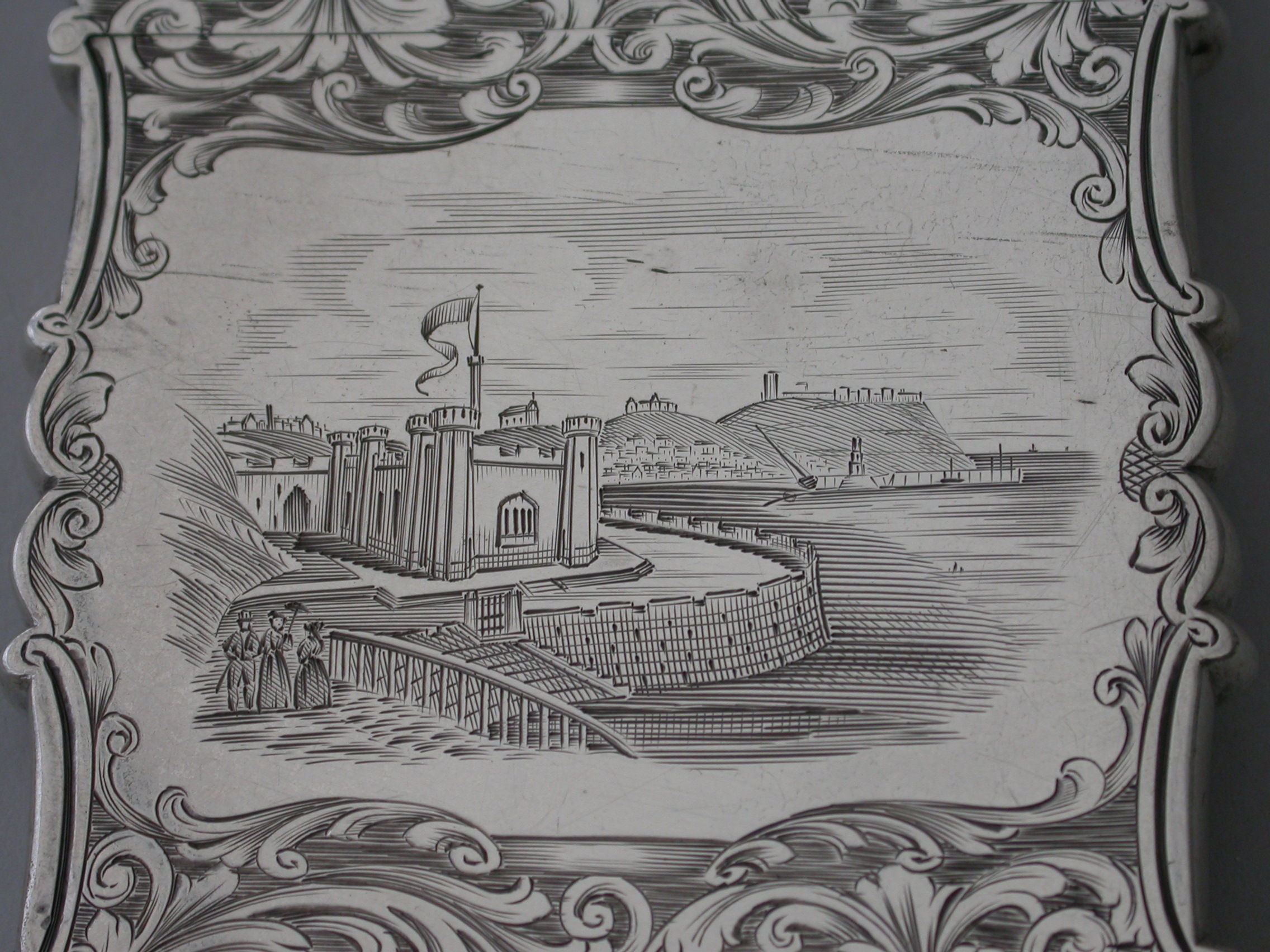 An extremely rare early Victorian silver "castle-top" Card Case of shaped rectangular form with foliate scroll engraved decoration on a matt background, the reverse with a vacant shield shaped cartouche, the front with a shaped panel engraved with a view of the Gothic Spa or Salon at Scarborough designed by Henry Wyatt and opened in 1839.
