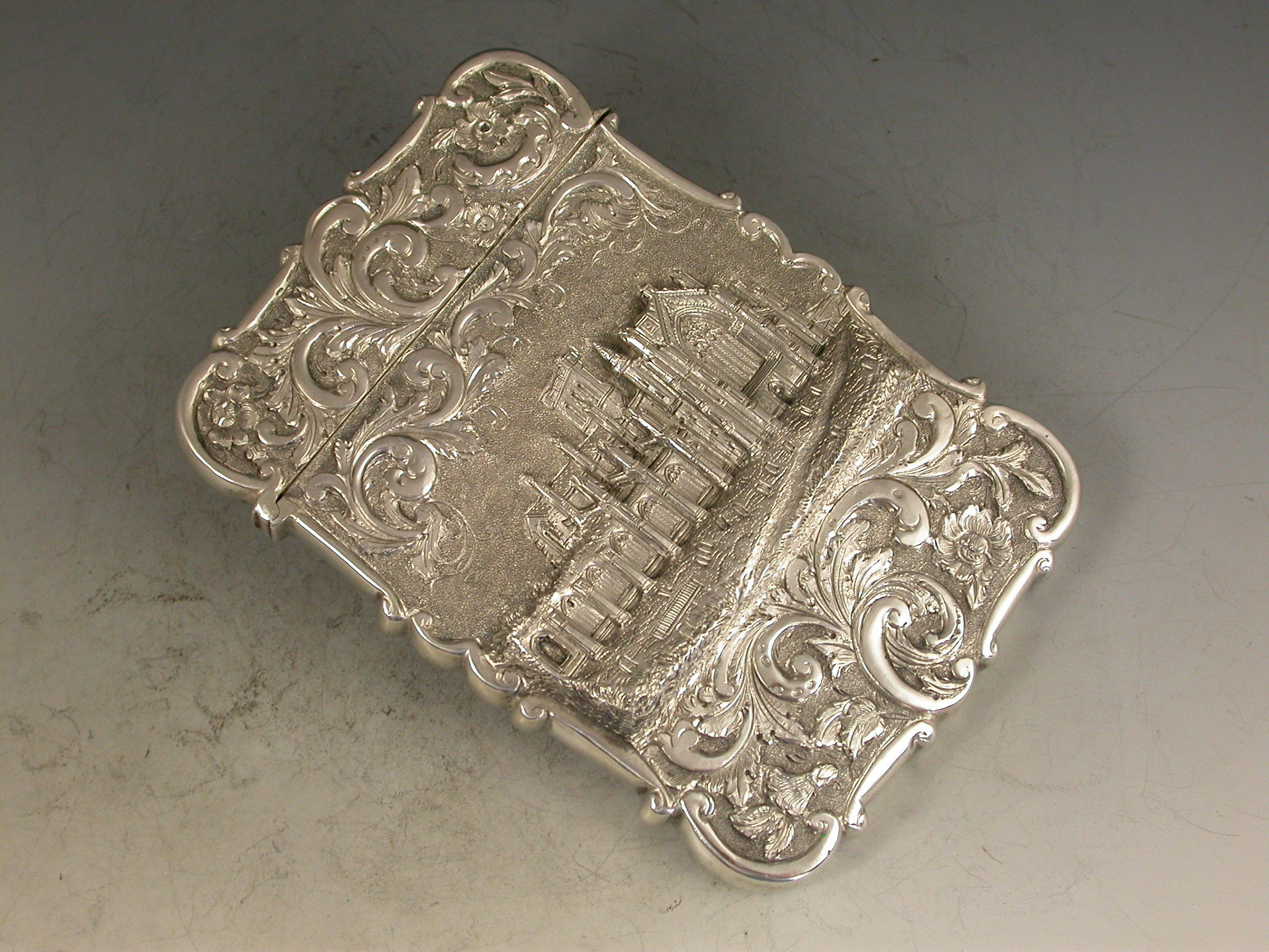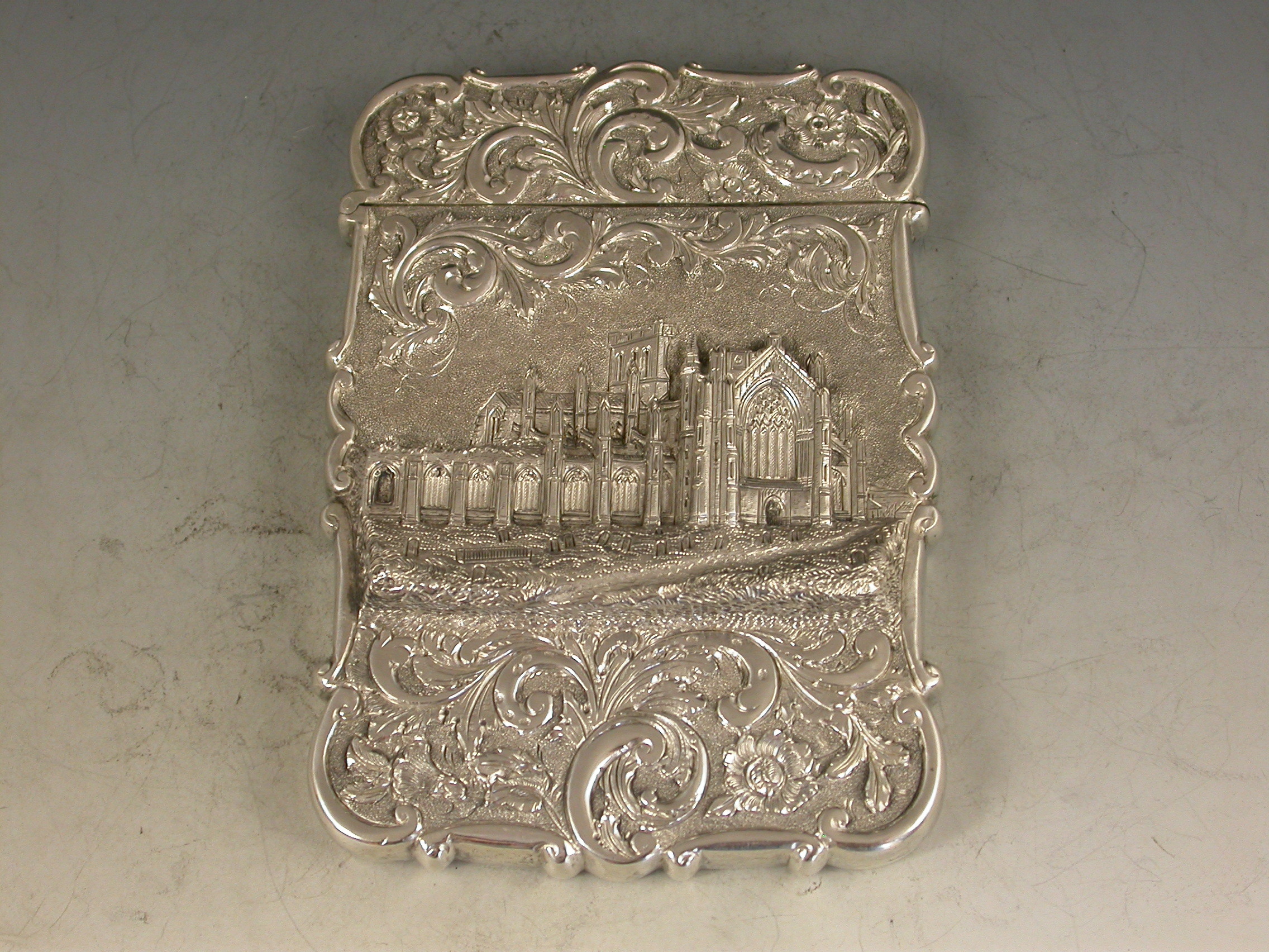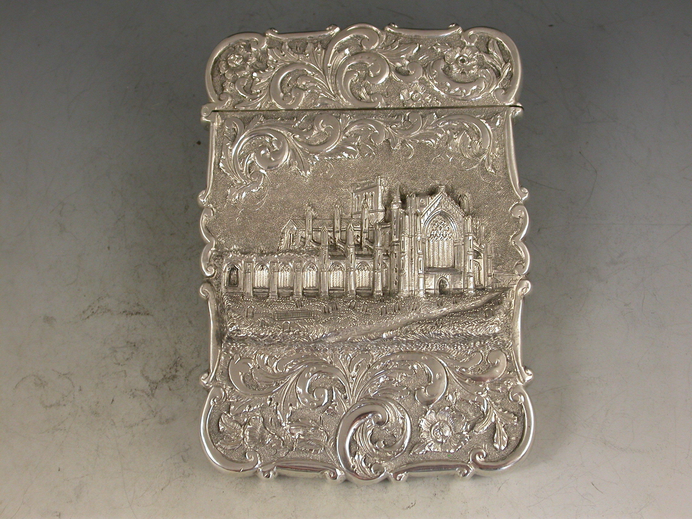 An extremely fine and rare Victorian silver 'Castle Top' Card Case, chased with a view of Melrose Abbey in Roxburghshire, Scotland, in high relief, surrounded by foliate scroll decoration on a matt background to the back and the front. A cartouche to the reverse engraved with a contemporary inscription ""Kate"".