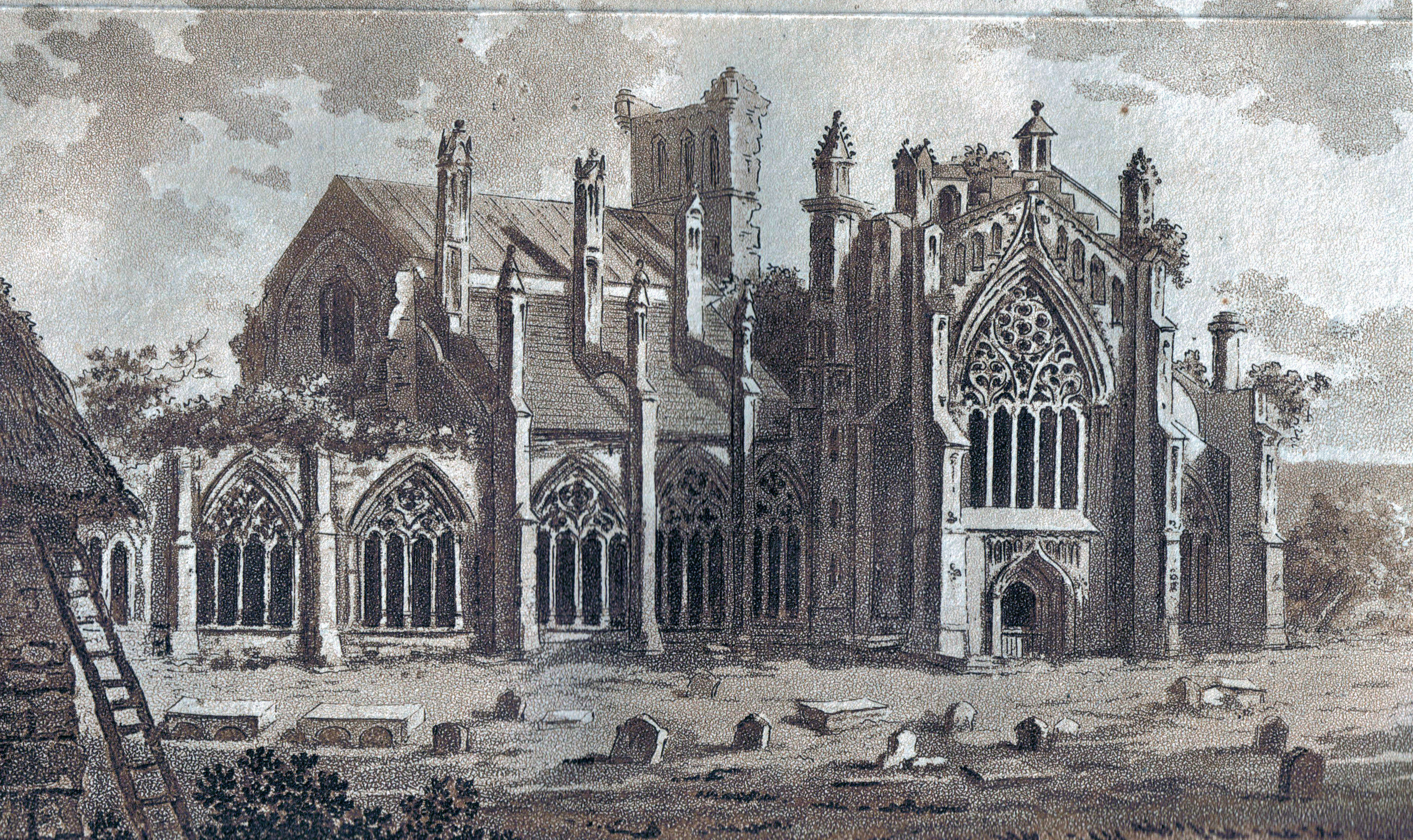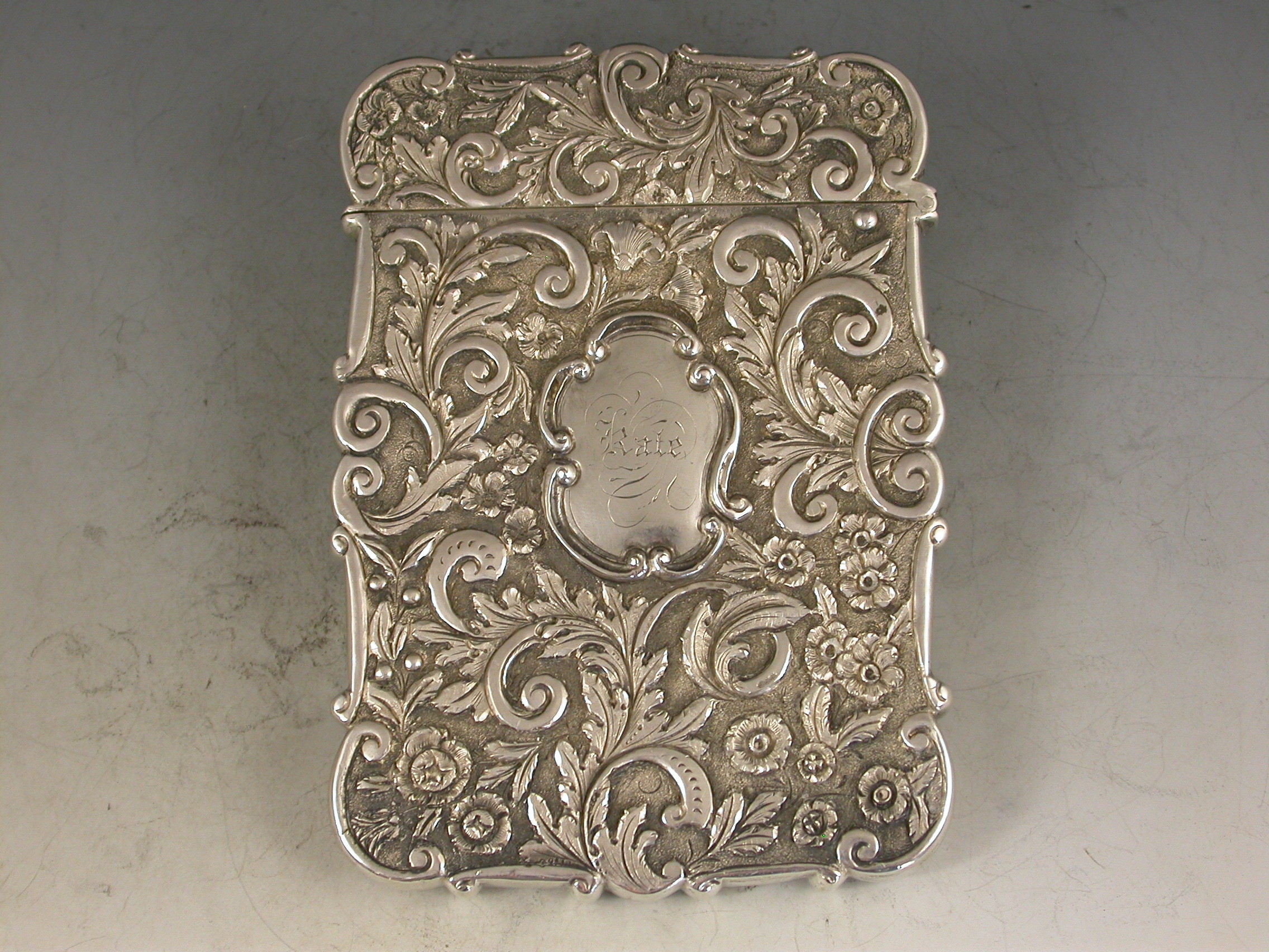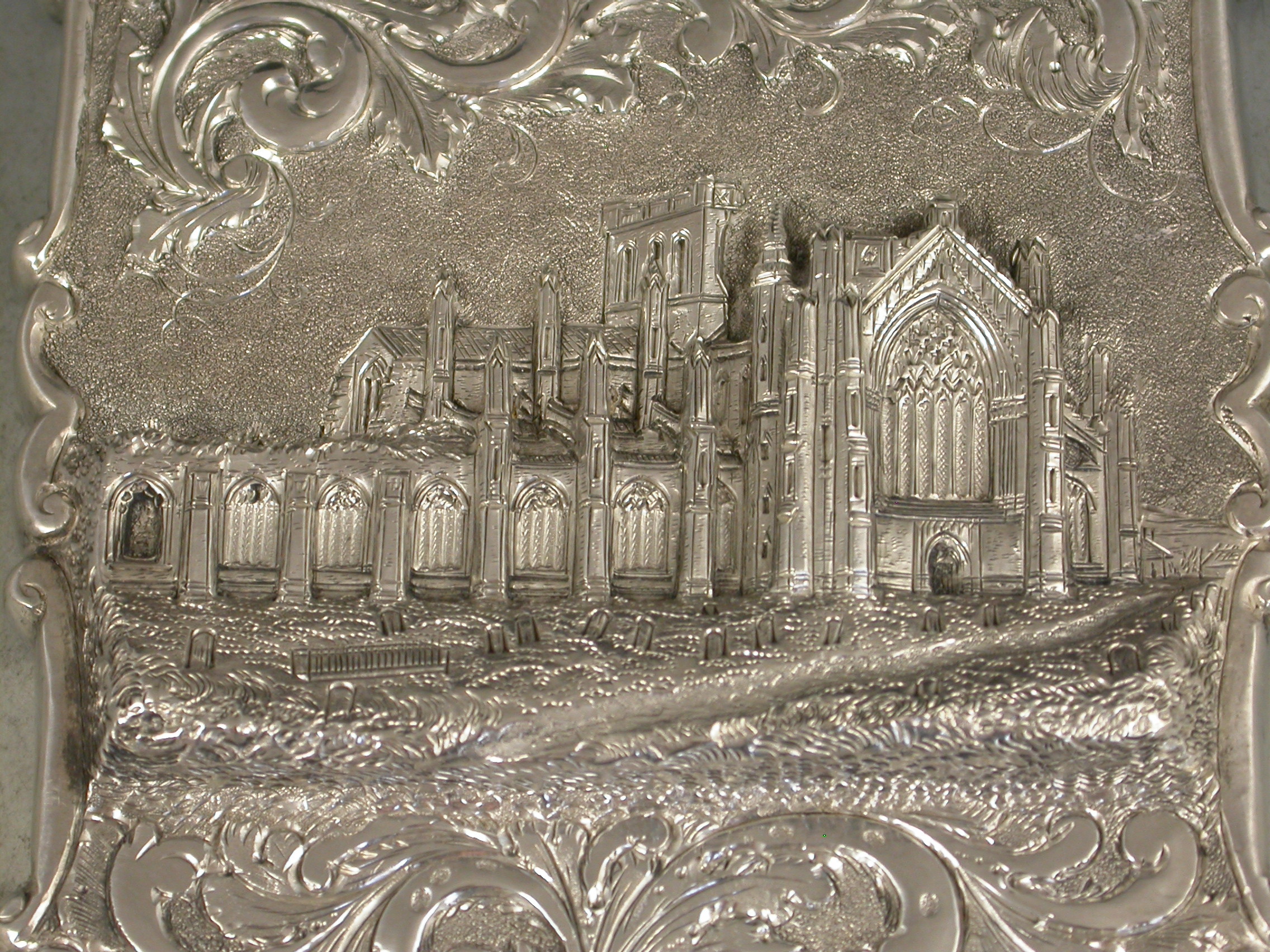 An extremely fine and rare Victorian silver 'Castle Top' Card Case, chased with a view of Melrose Abbey in Roxburghshire, Scotland, in high relief, surrounded by foliate scroll decoration on a matt background to the back and the front. A cartouche to the reverse engraved with a contemporary inscription ""Kate"".