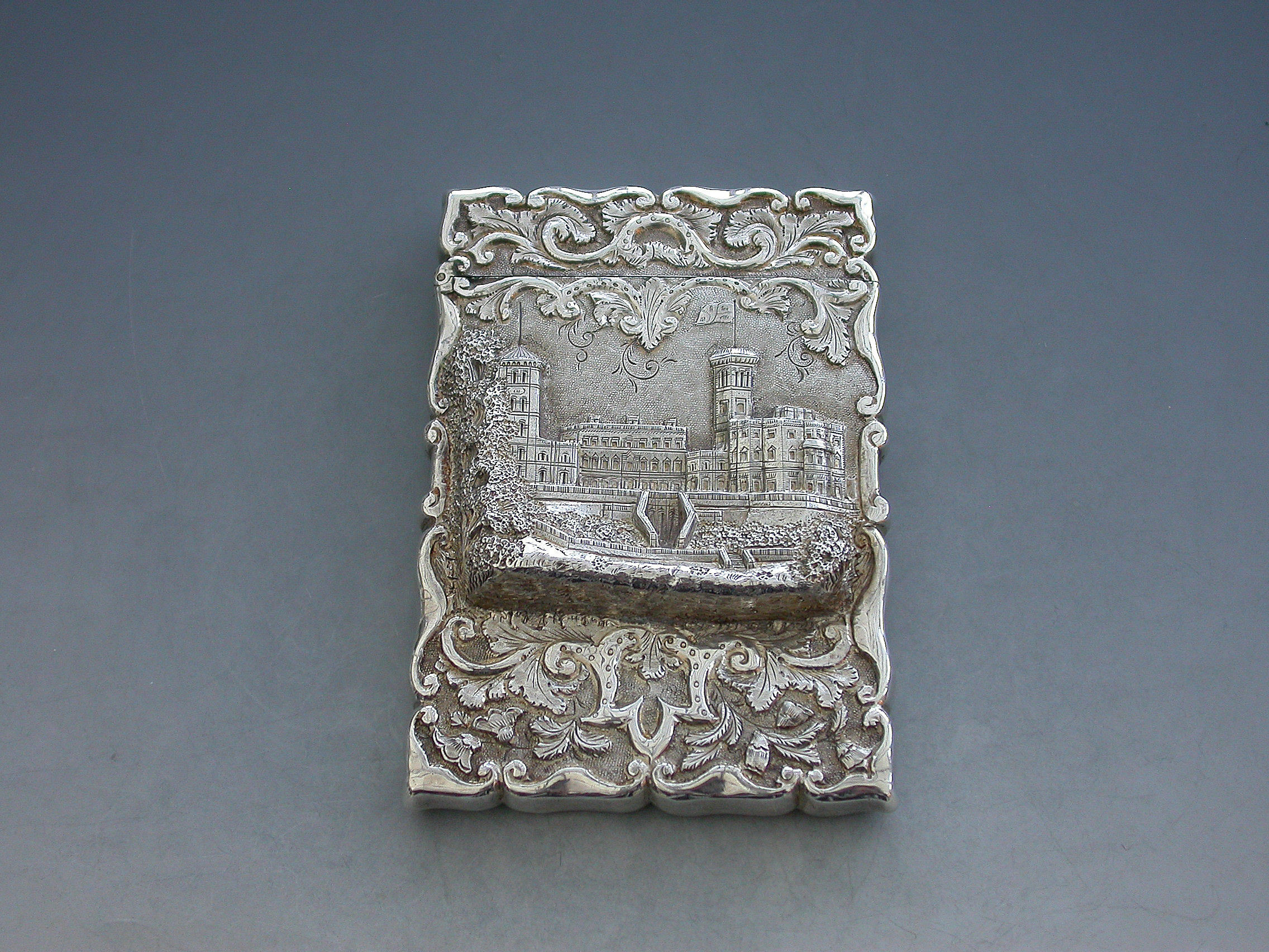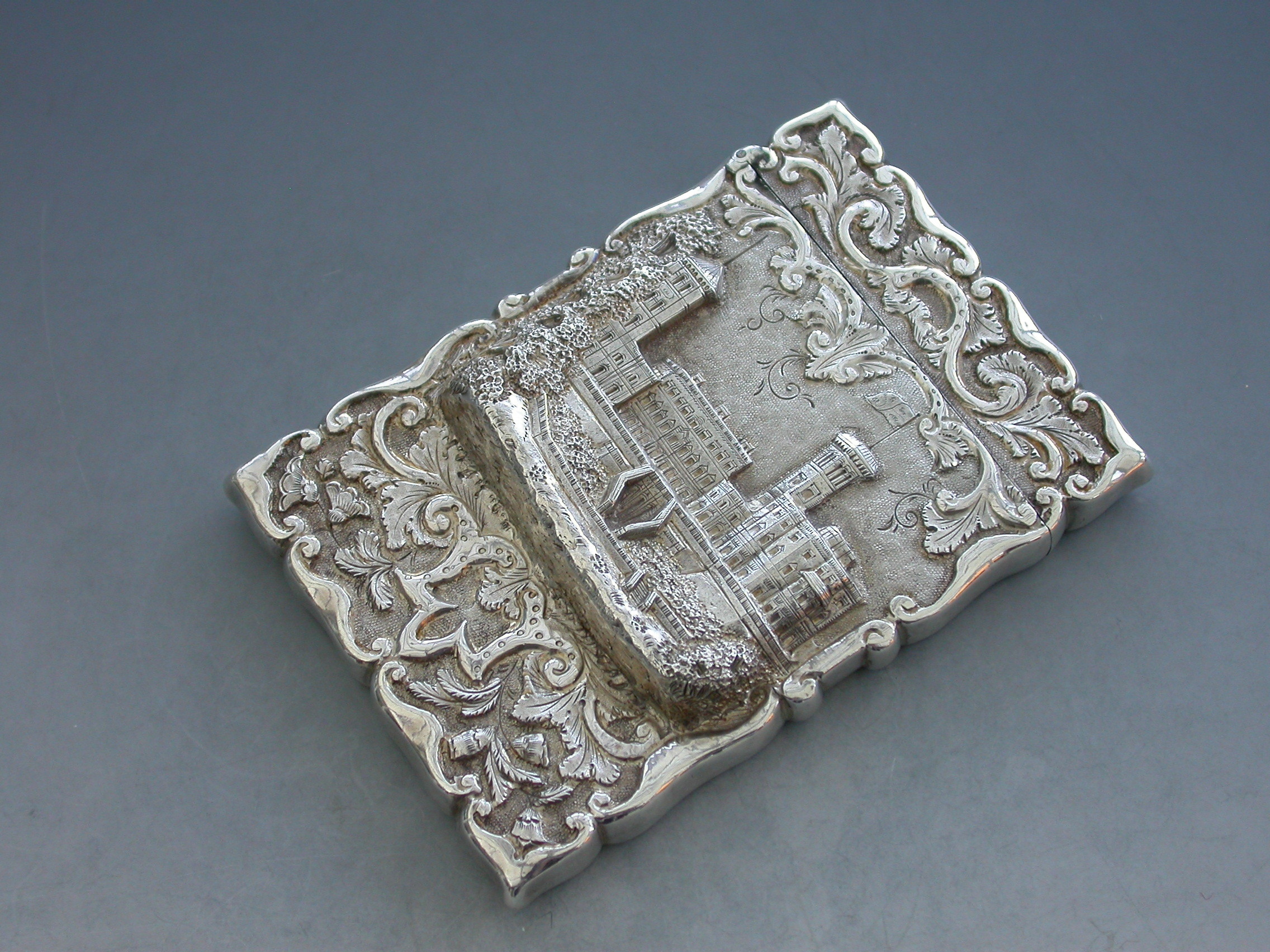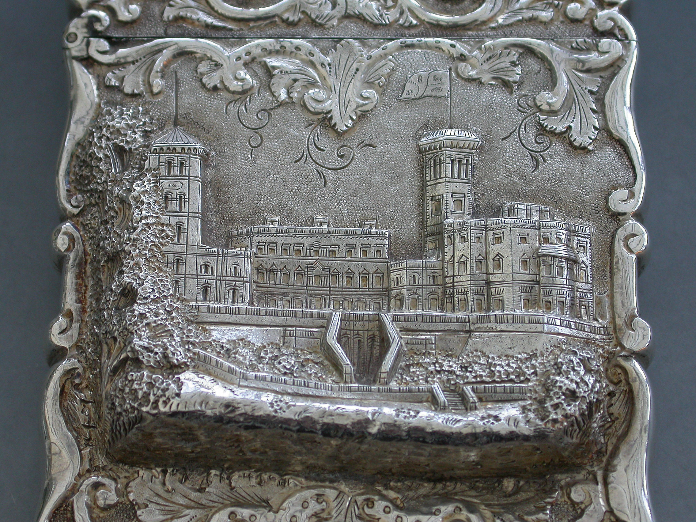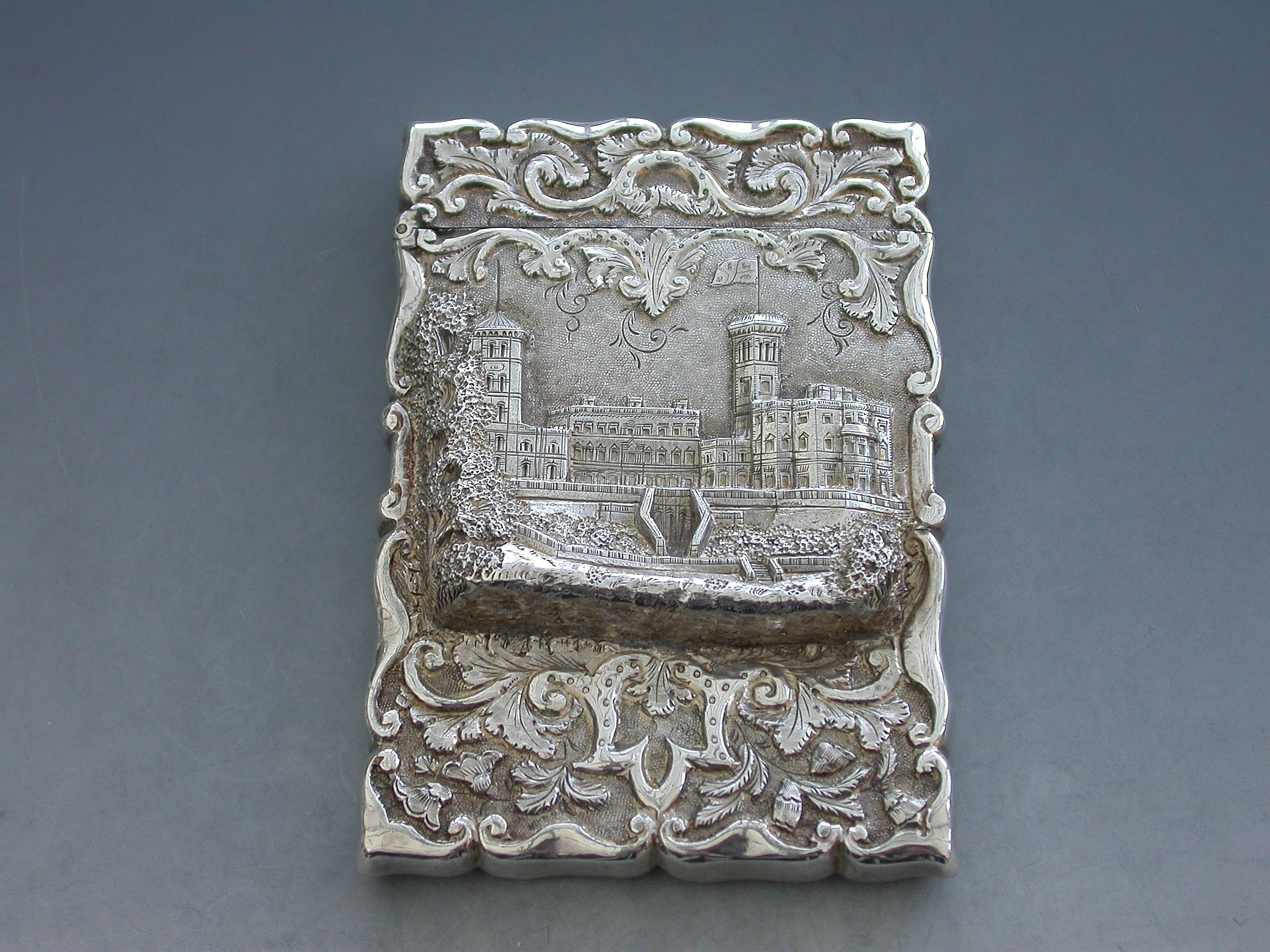 A rare Victorian silver Castle-Top Card Case of shaped rectangular form with chased and embossed foliate scroll decoration, the front with a scene depicting Osborne House in high relief. The reverse with a vacant shield shaped cartouche.