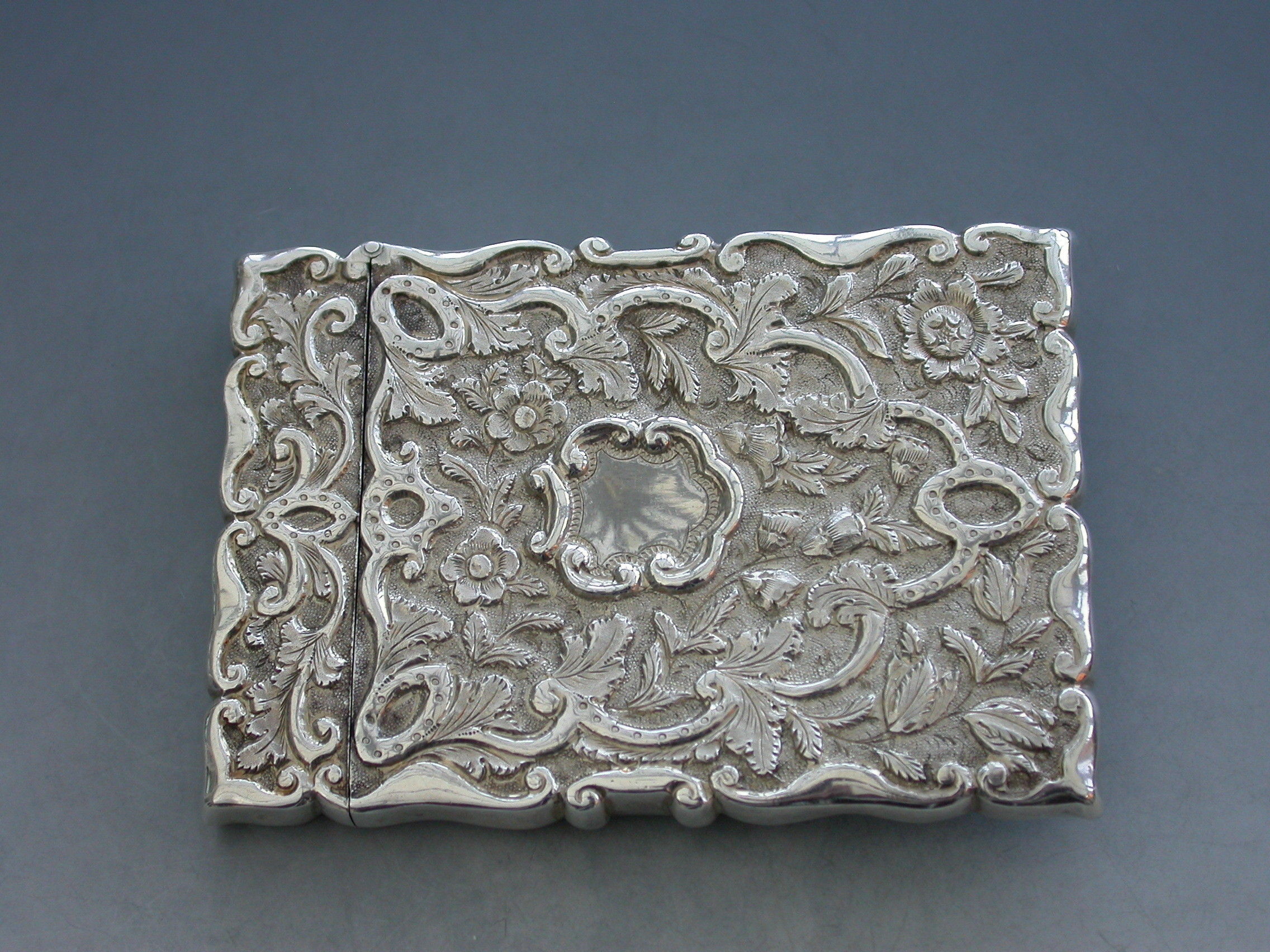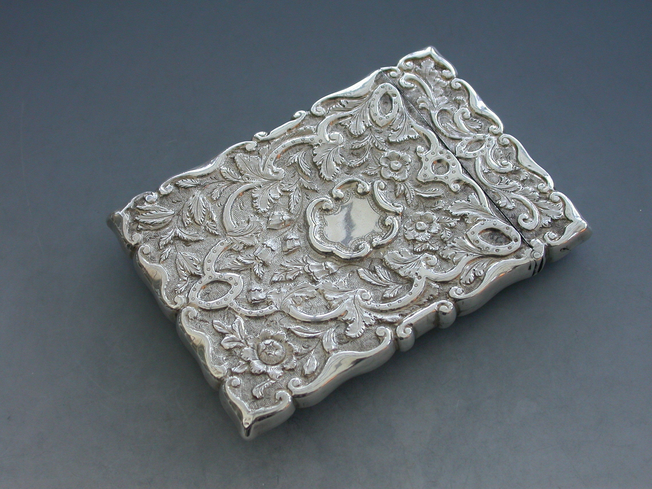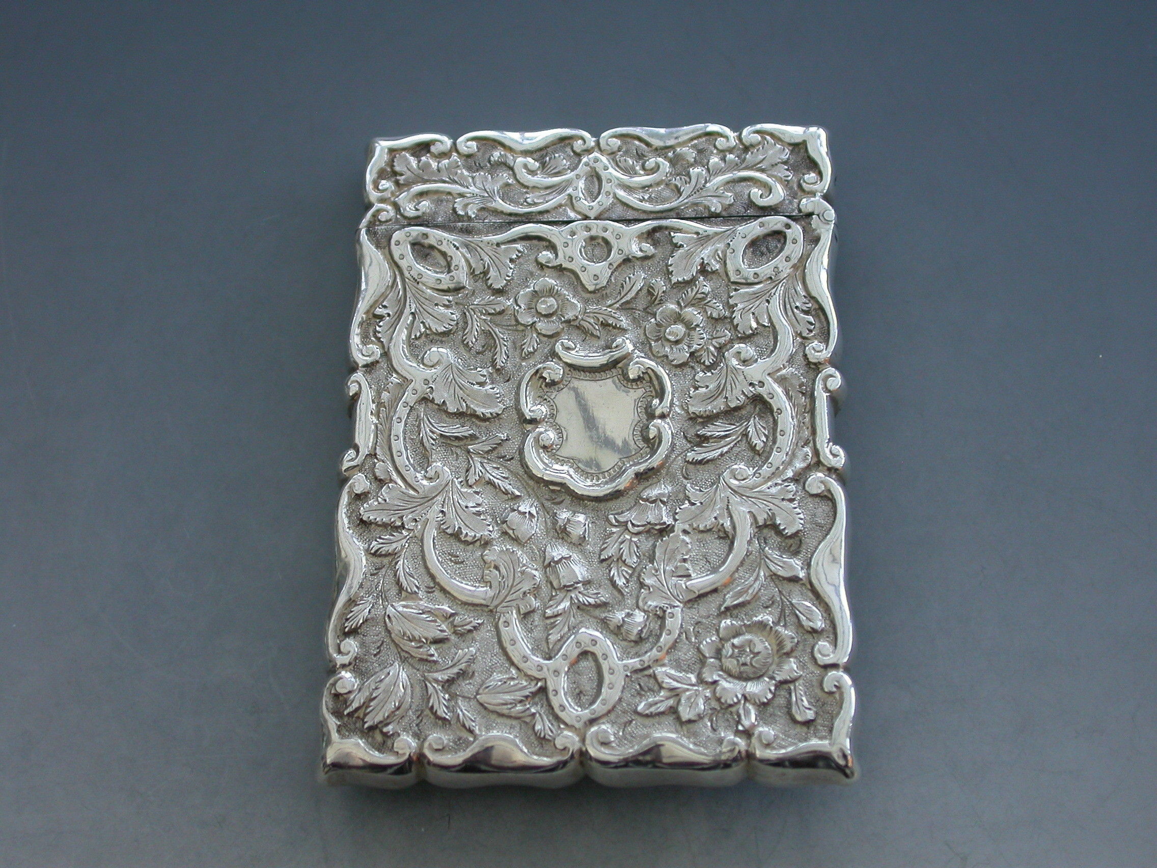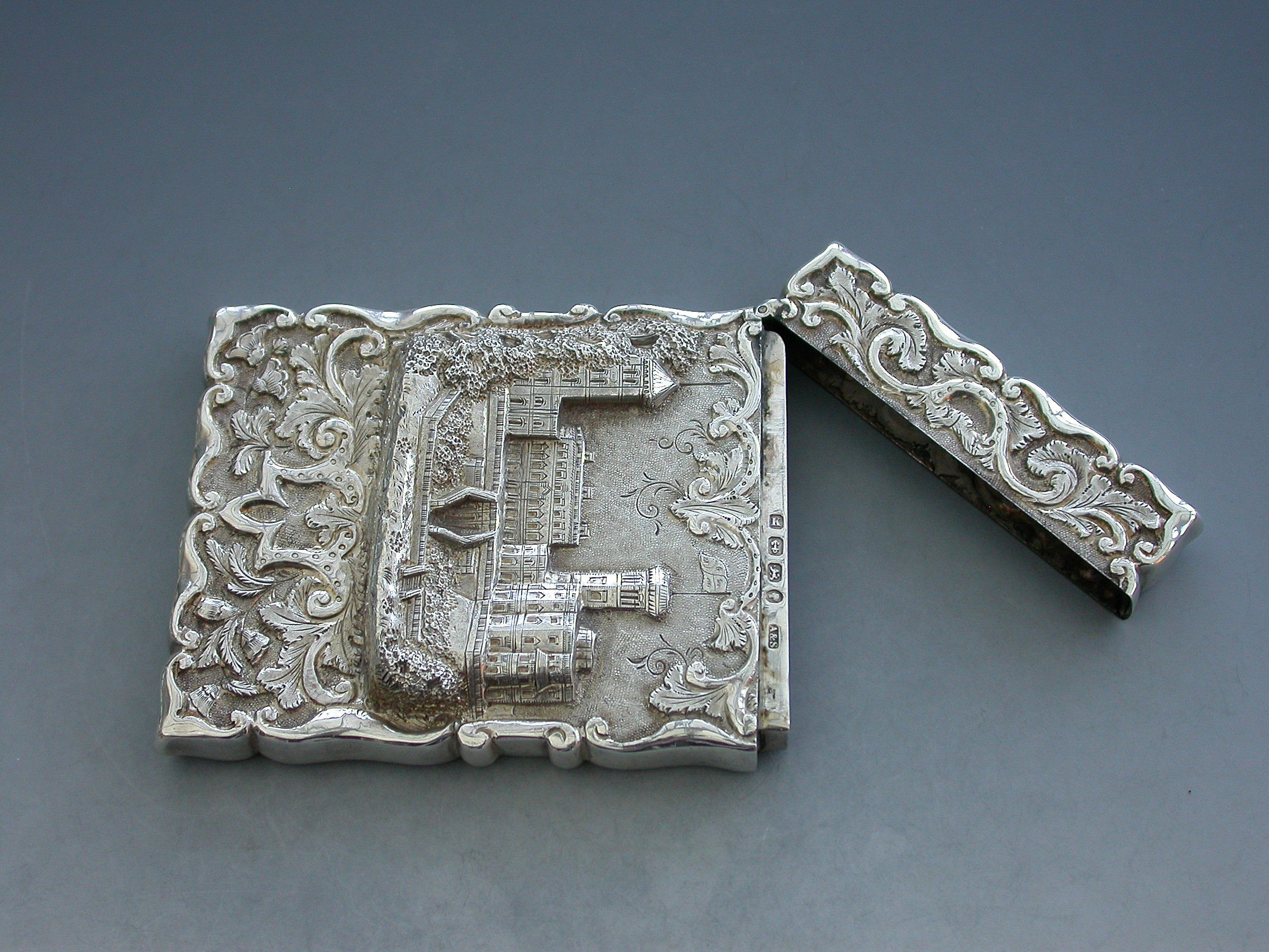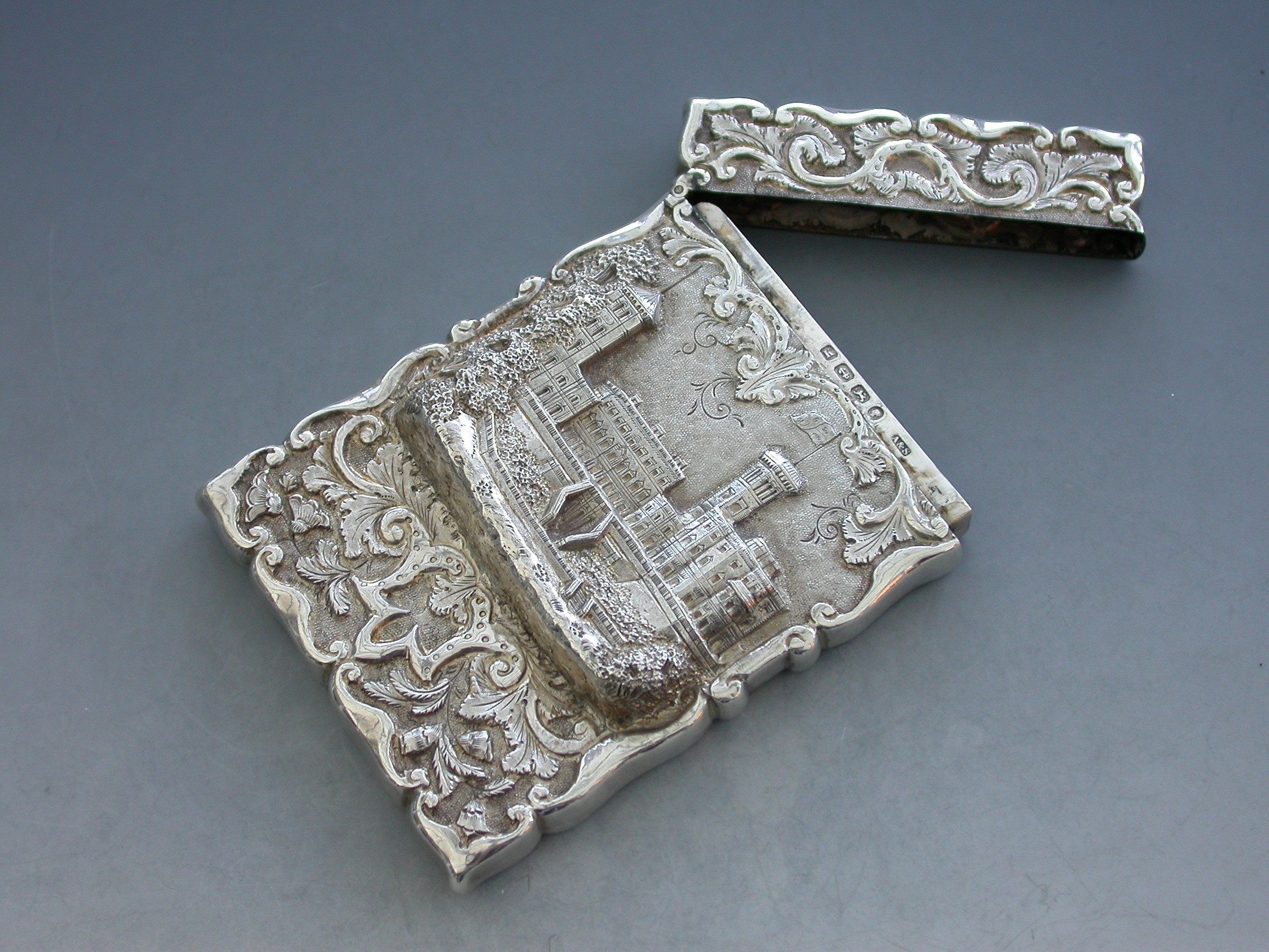 A rare Victorian silver Castle-Top Card Case of shaped rectangular form with chased and embossed foliate scroll decoration, the front with a scene depicting Osborne House in high relief. The reverse with a vacant shield shaped cartouche.
