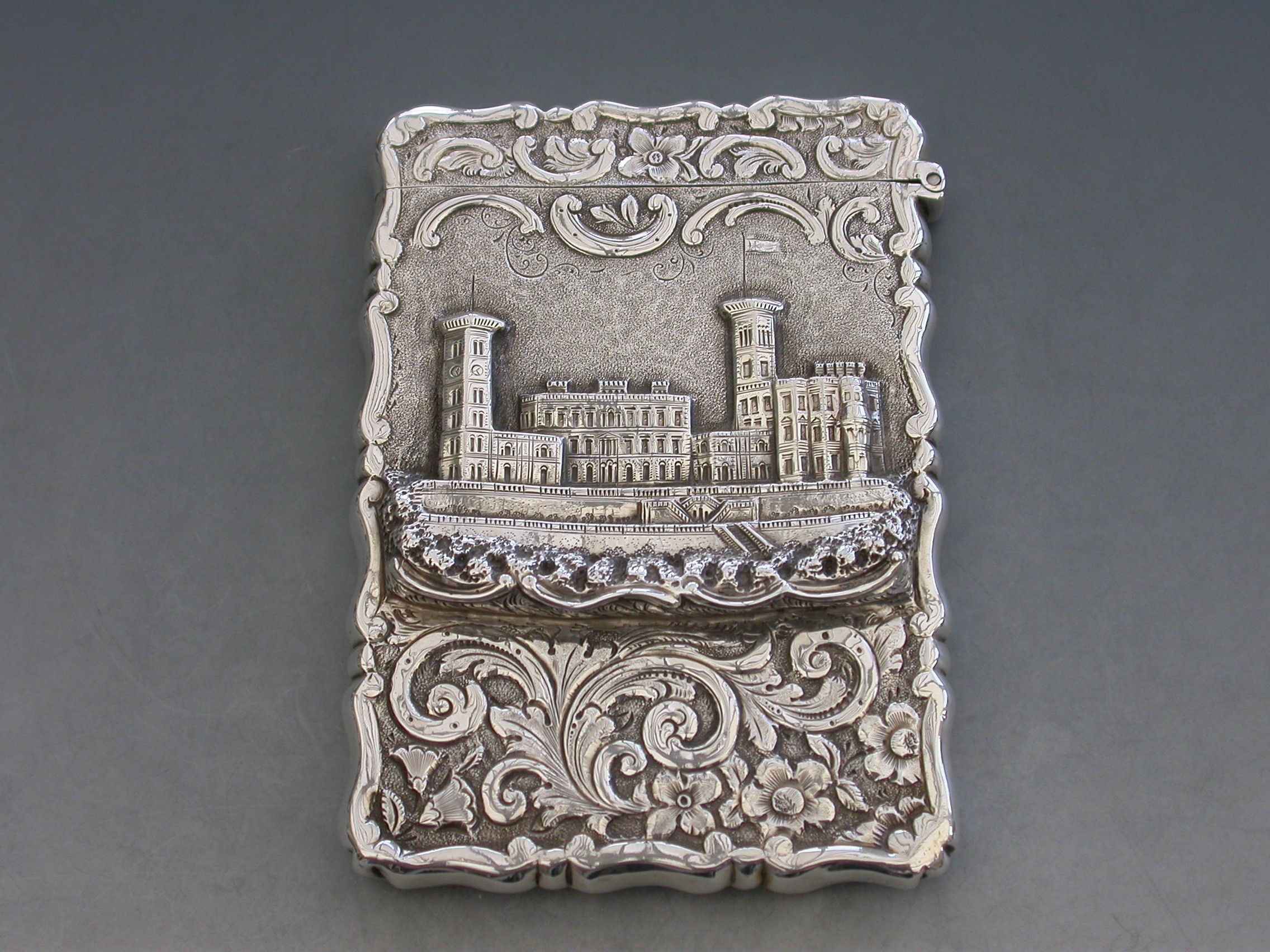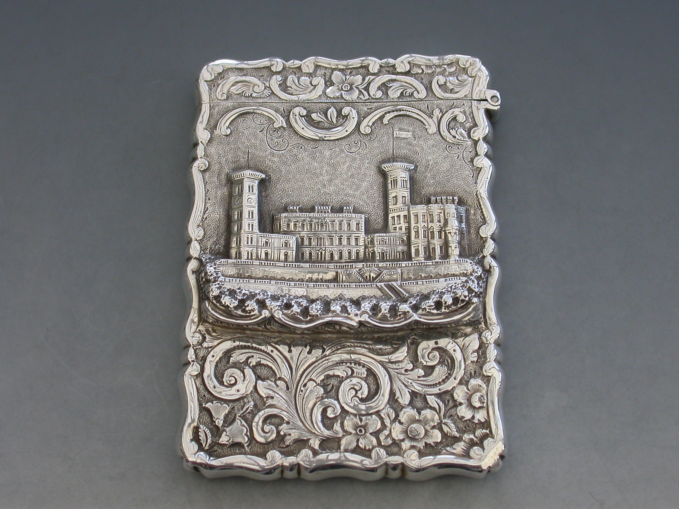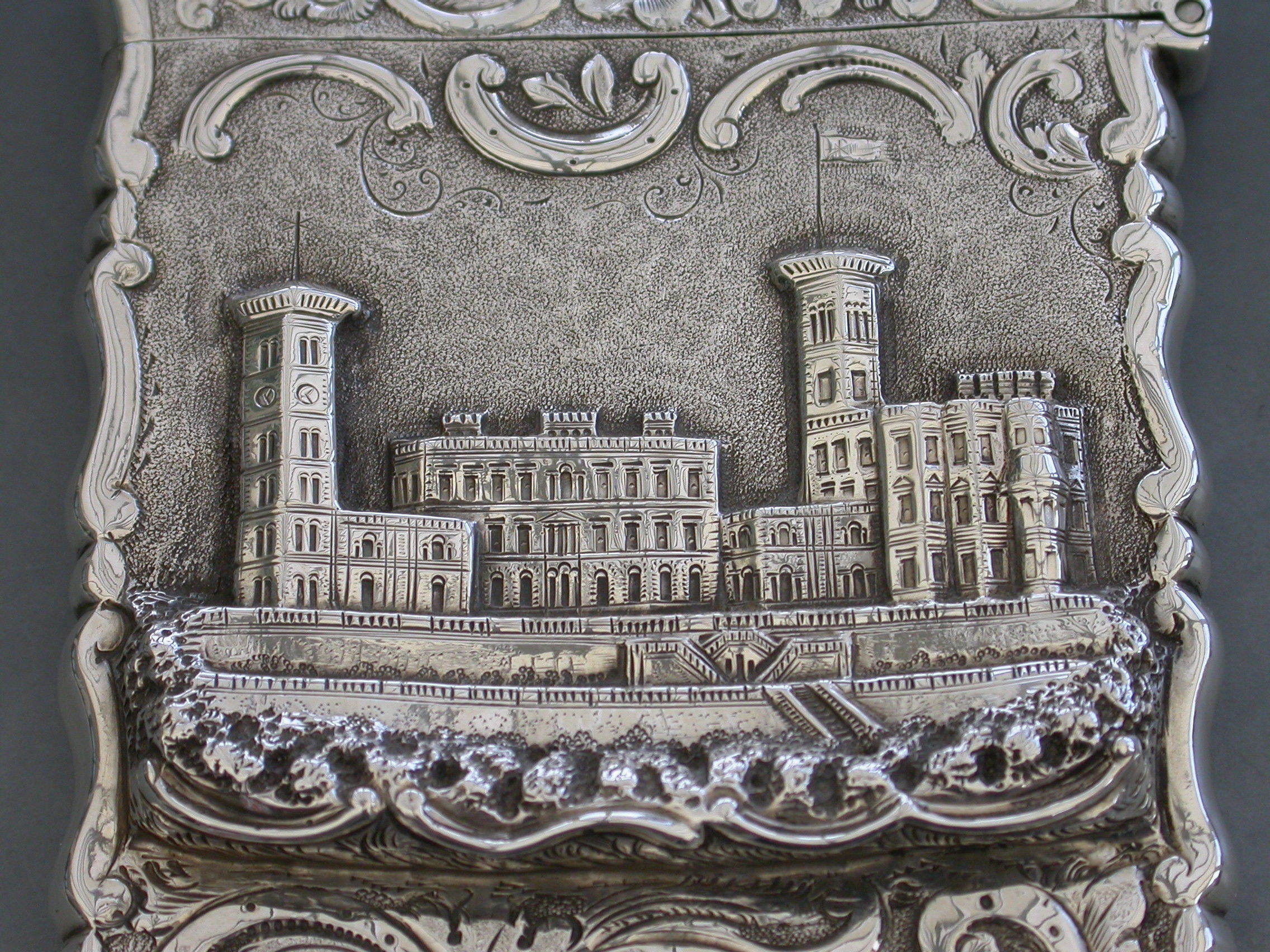 A rare Victorian silver Castle-Top Card Case of shaped rectangular form with chased and embossed foliate scroll decoration, the front with a scene depicting Osborne House in high relief. The reverse with a vacant shaped cartouche.