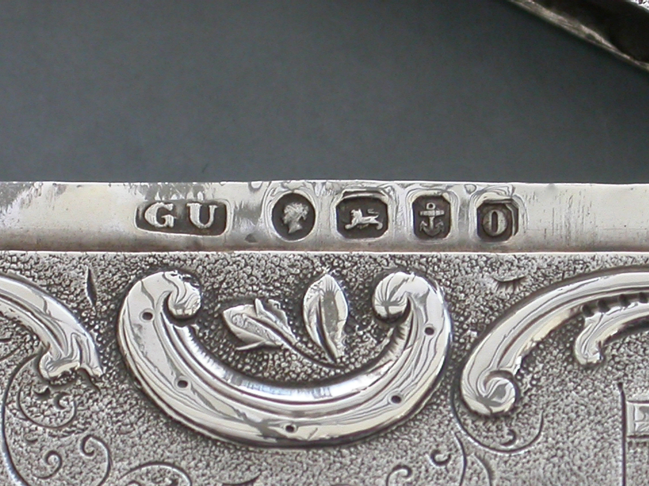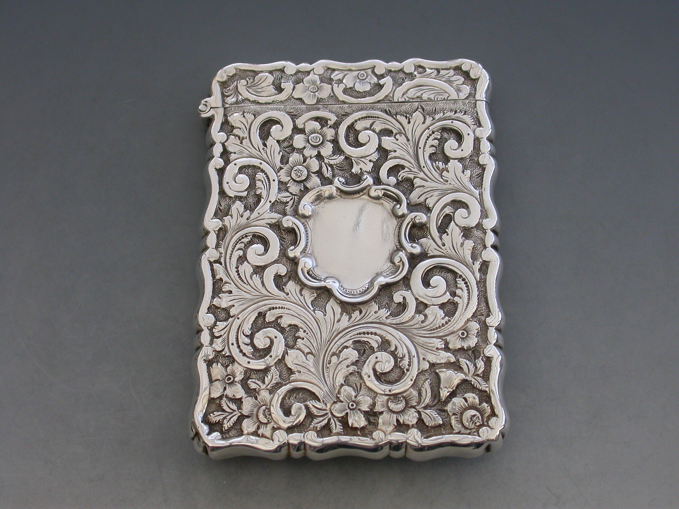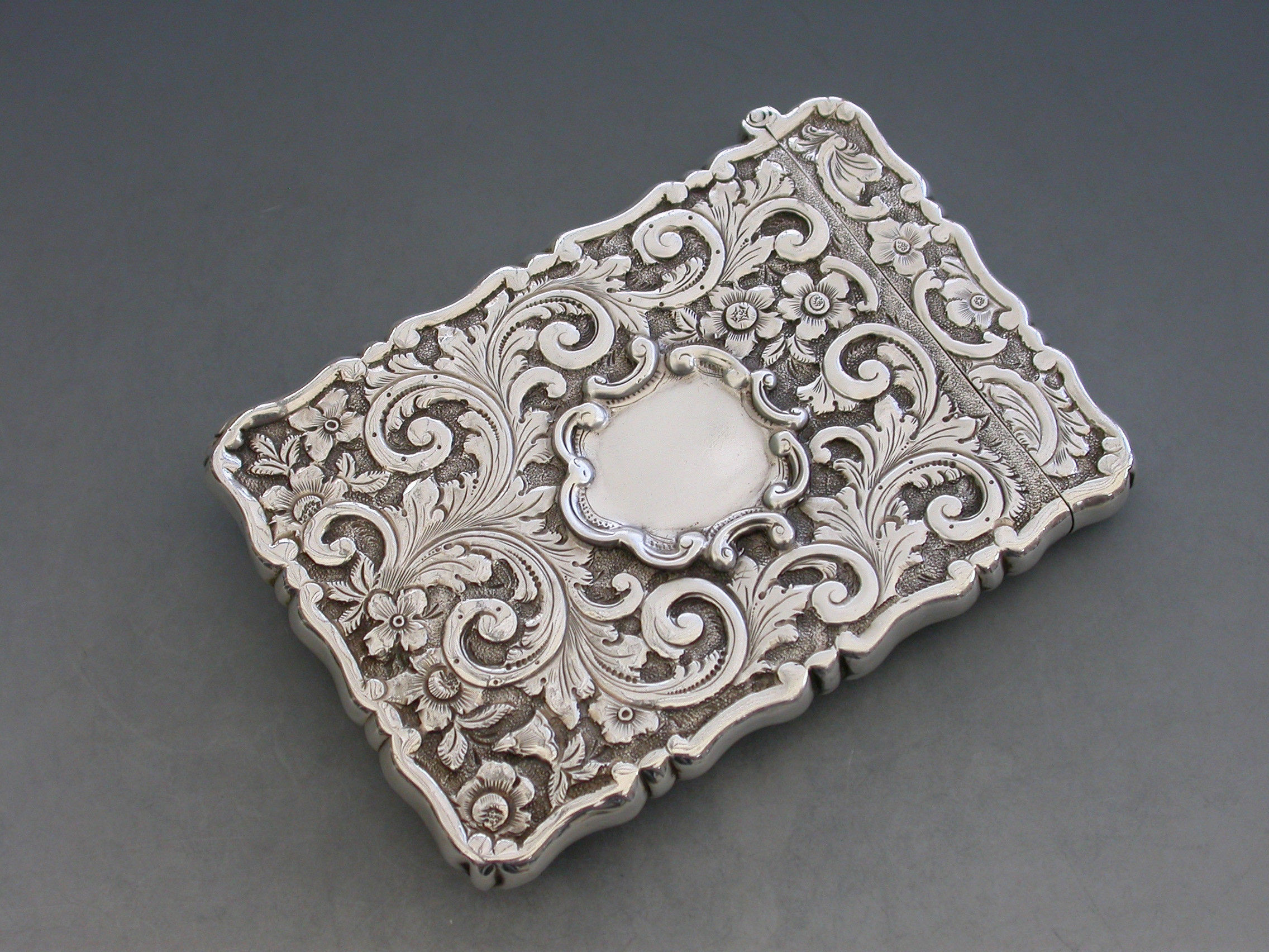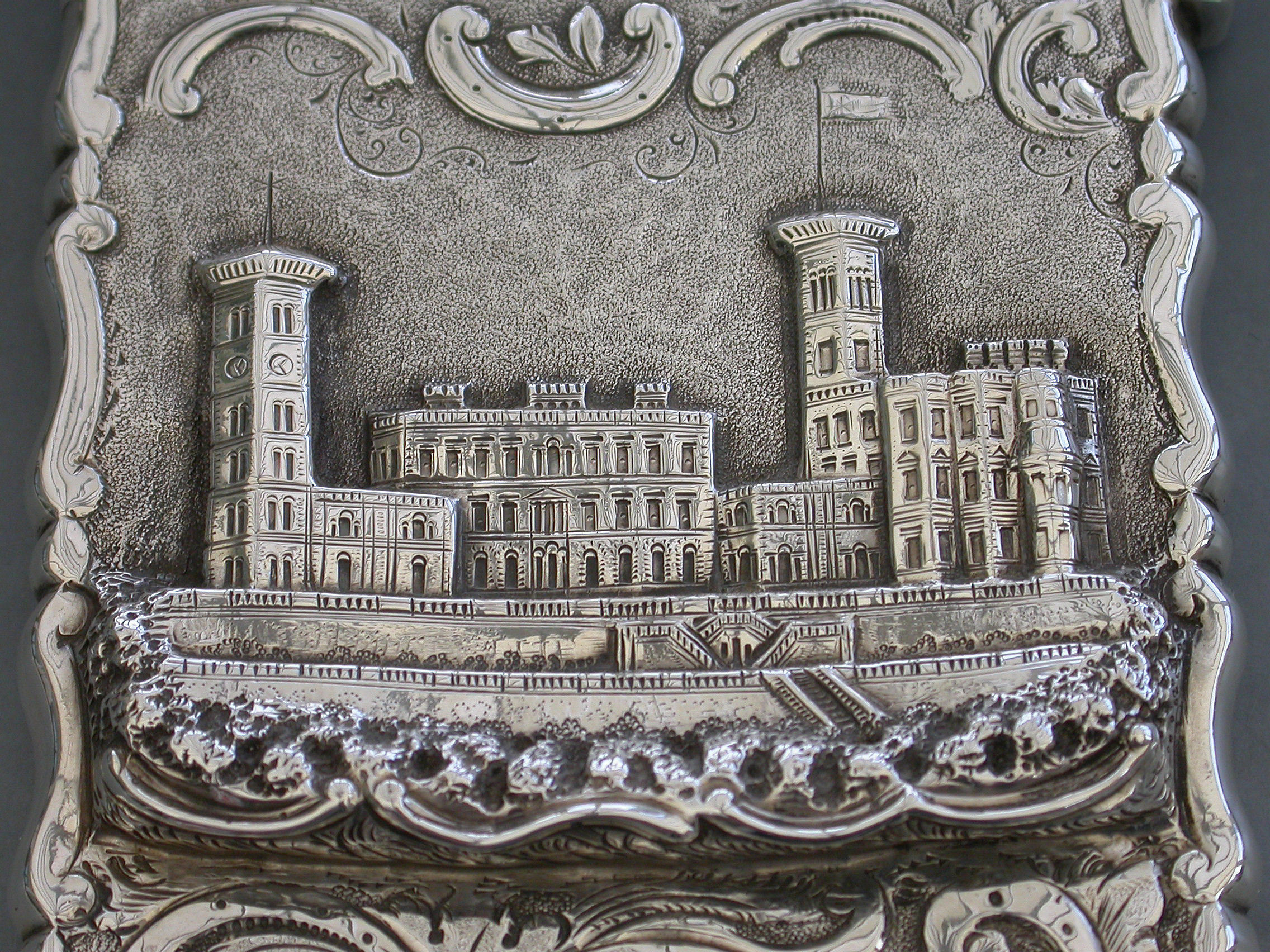A rare Victorian silver Castle-Top Card Case of shaped rectangular form with chased and embossed foliate scroll decoration, the front with a scene depicting Osborne House in high relief. The reverse with a vacant shaped cartouche.
