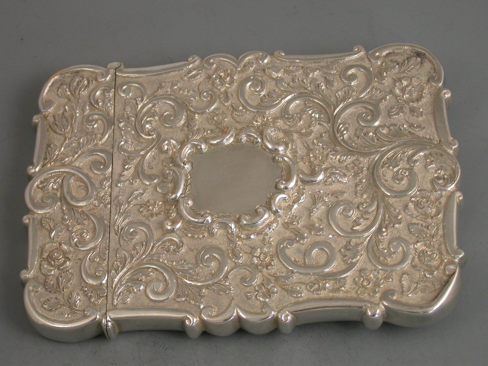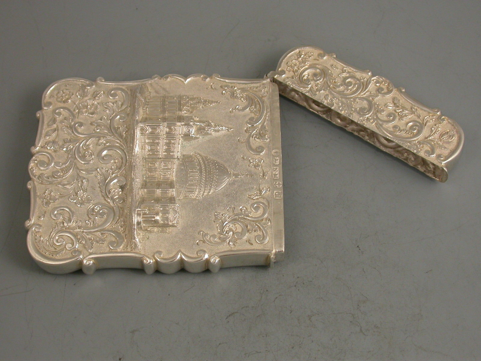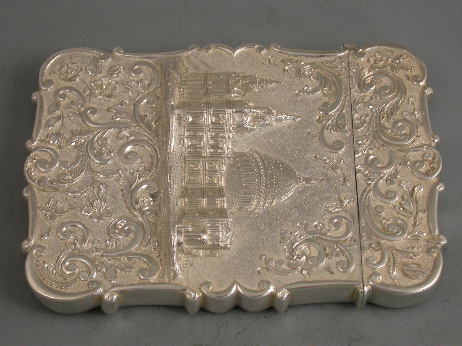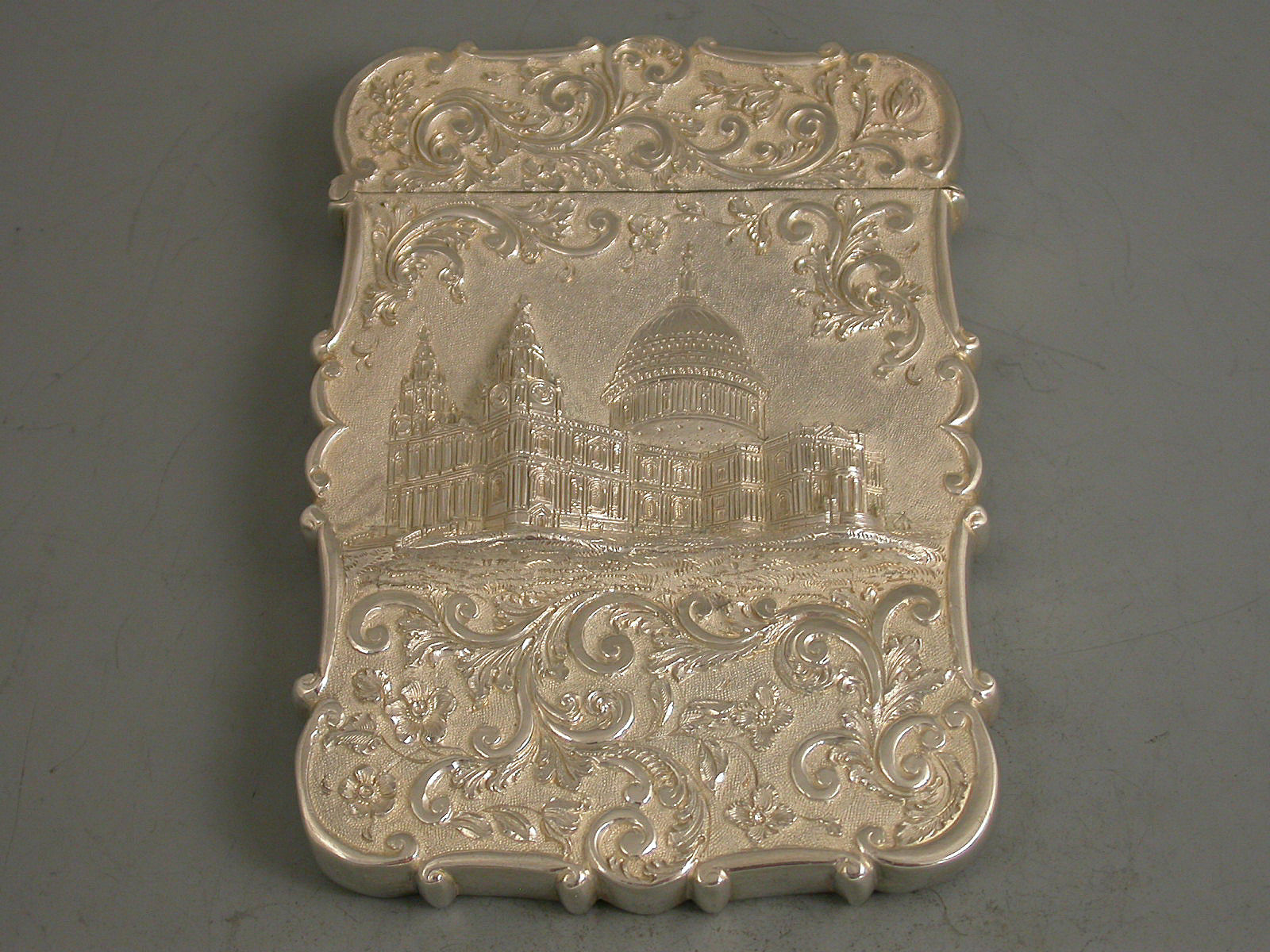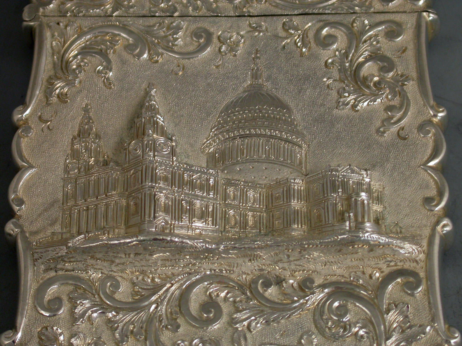 A very fine Victorian silver 'Castle-Top' Card Case of shaped rectangular form with chased and embossed foliate scroll decoration, the front with a raised scene depicting St Paul's Cathedral in high relief. The reverse with vacant shield shaped cartouche.