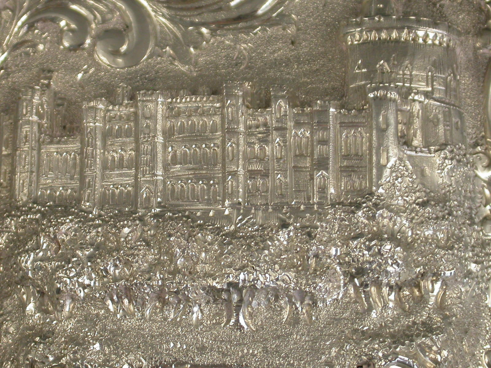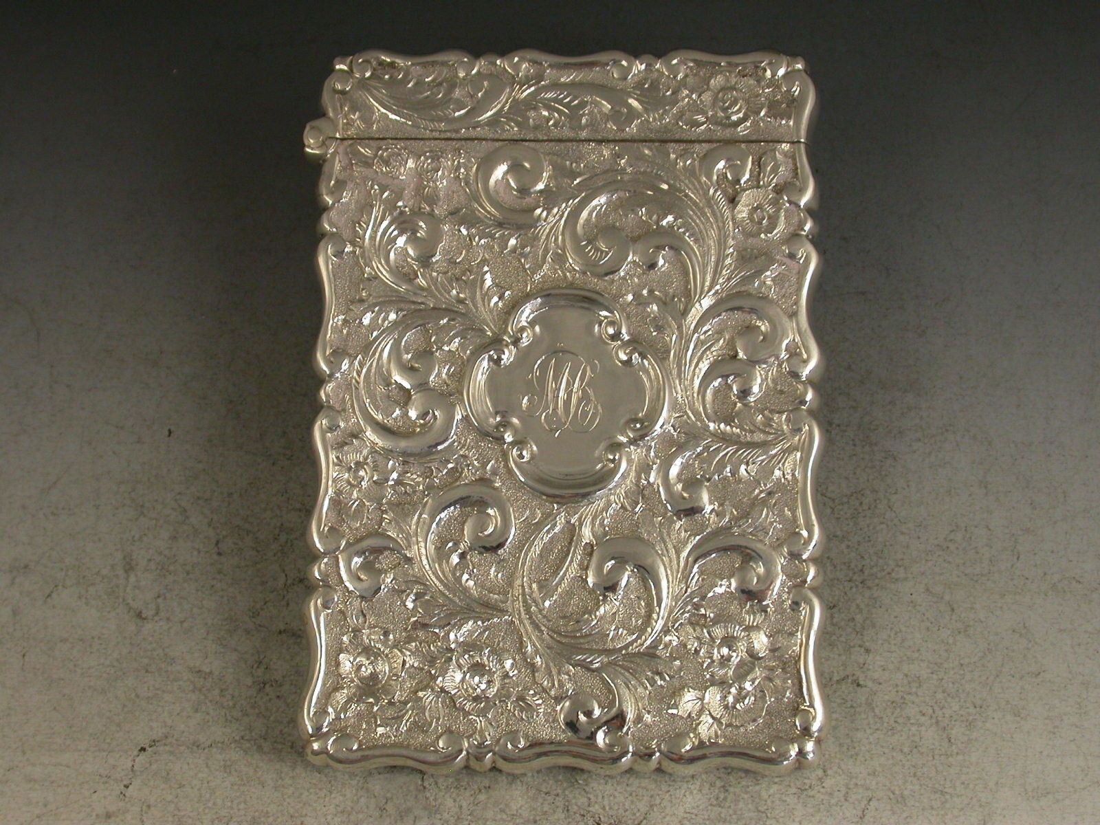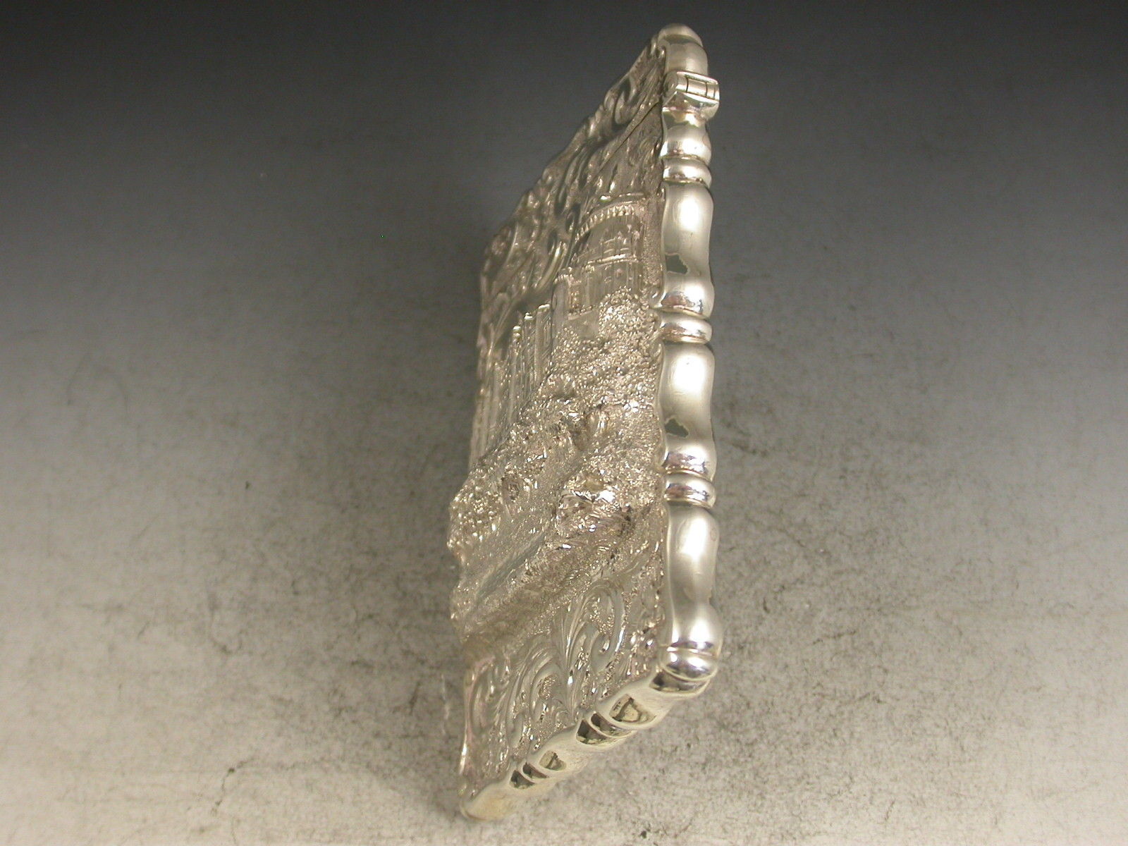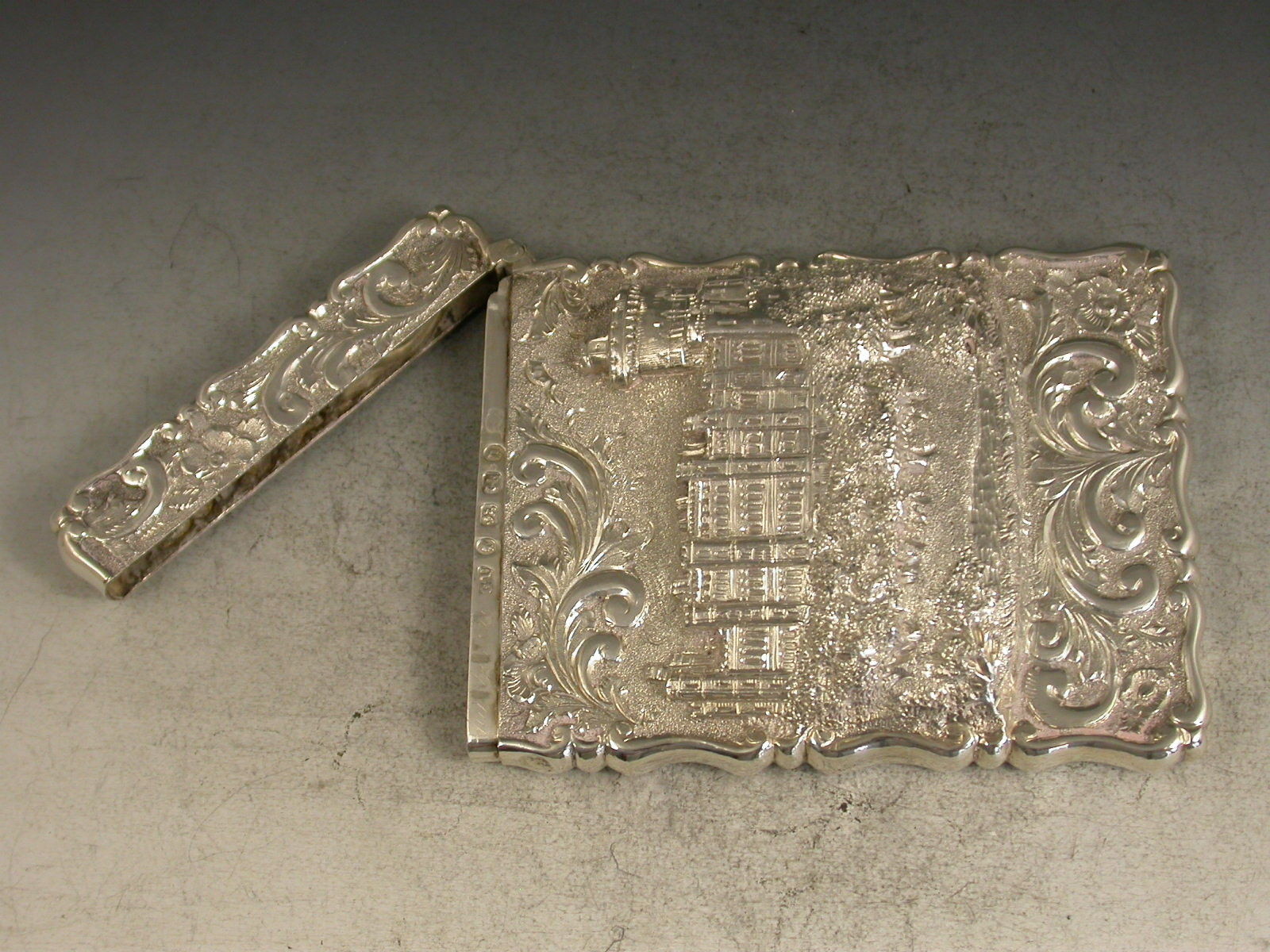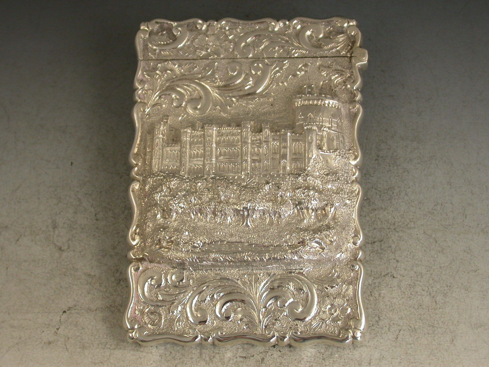 A good Victorian silver castle-top Card Case chased with a view of Windsor Castle from the north-east in unusually high relief, the reverse chased with foliate scroll work and with initialed cartouche.