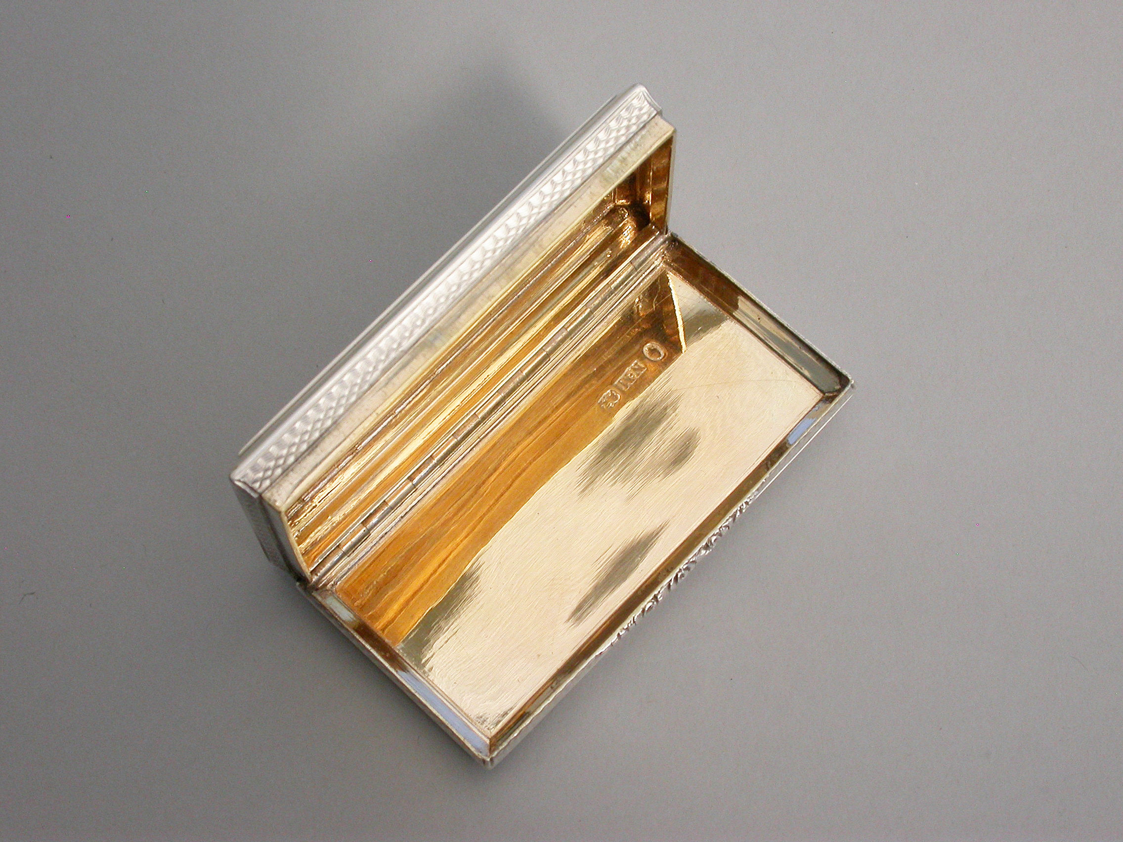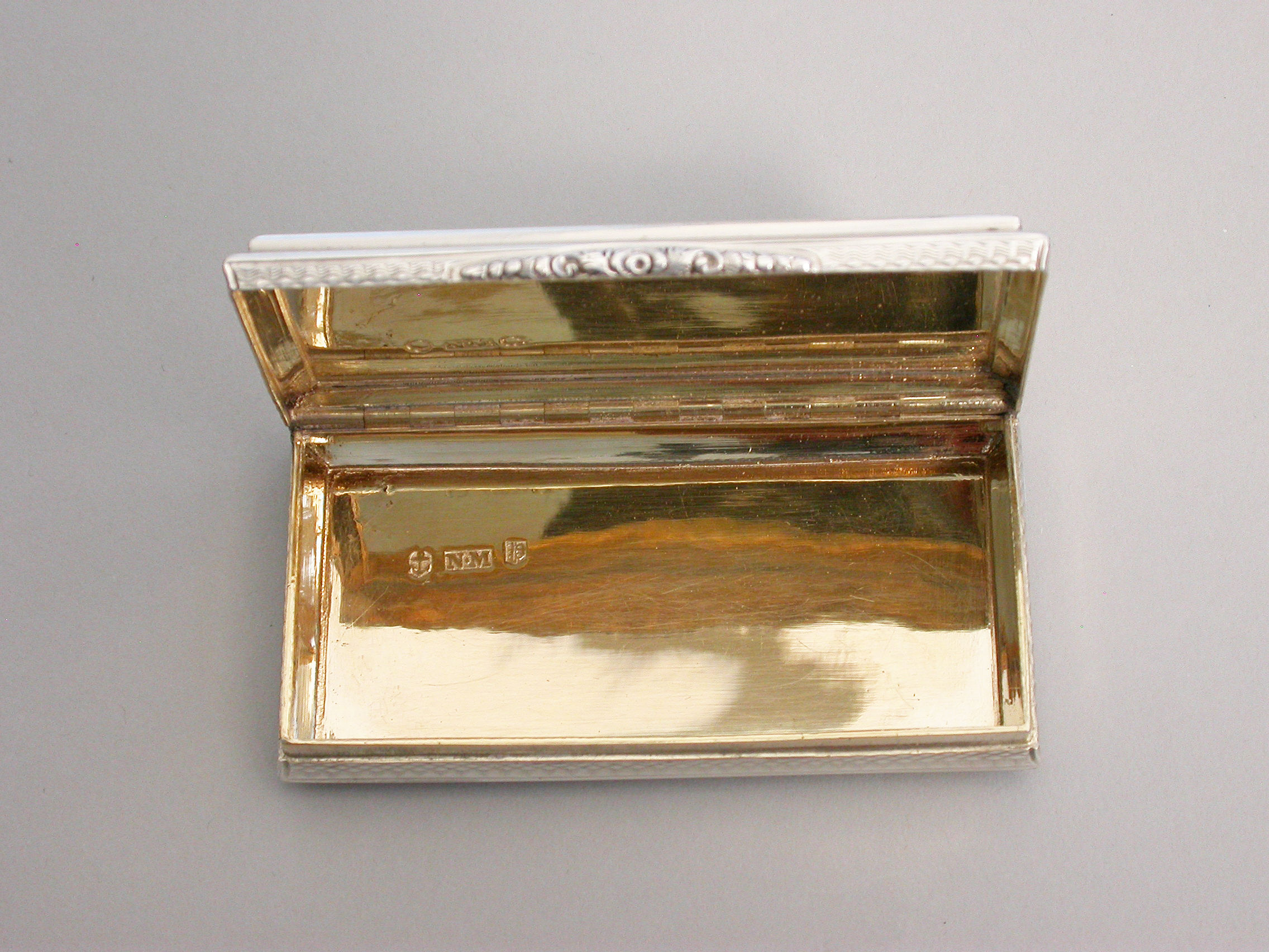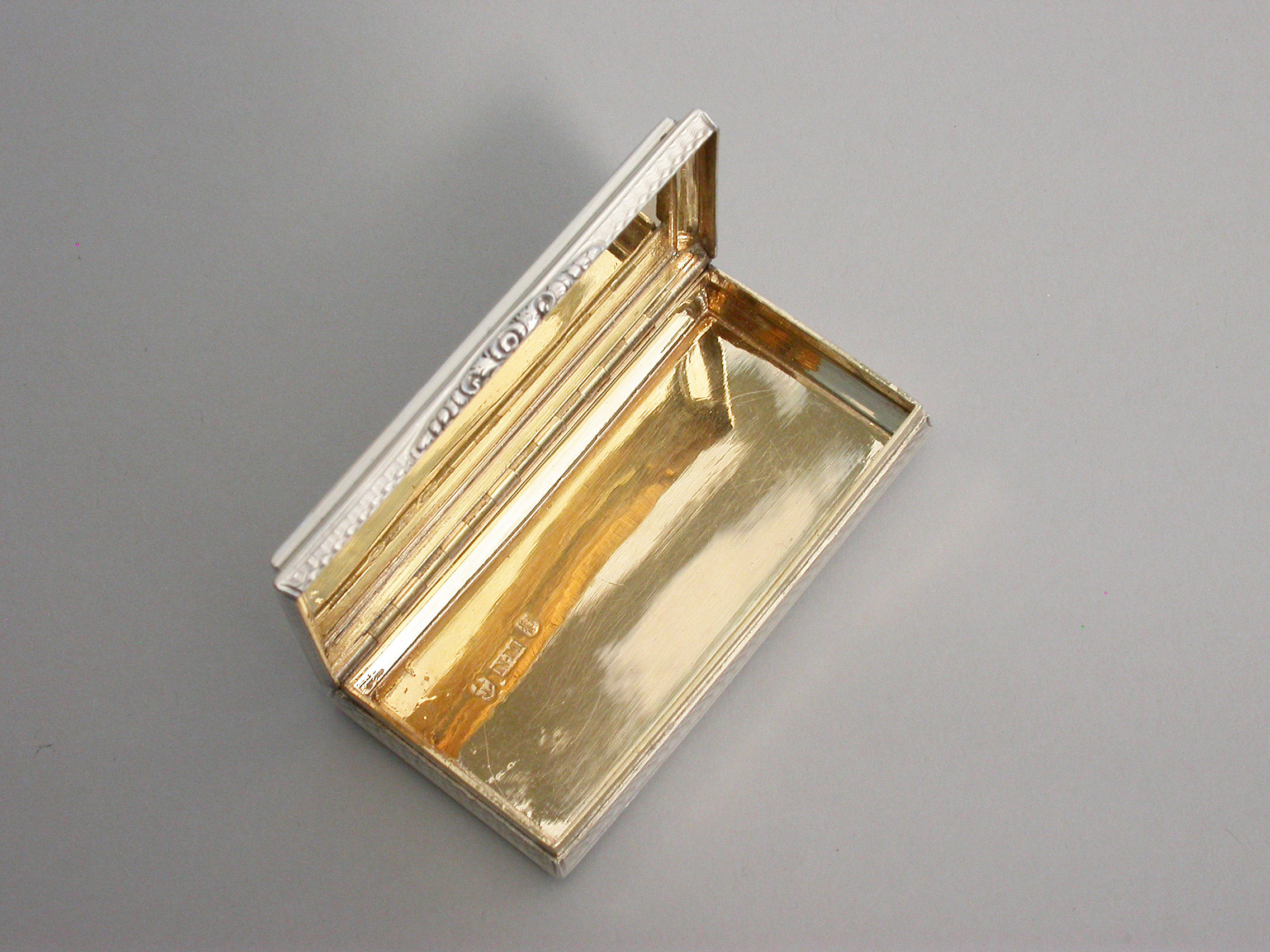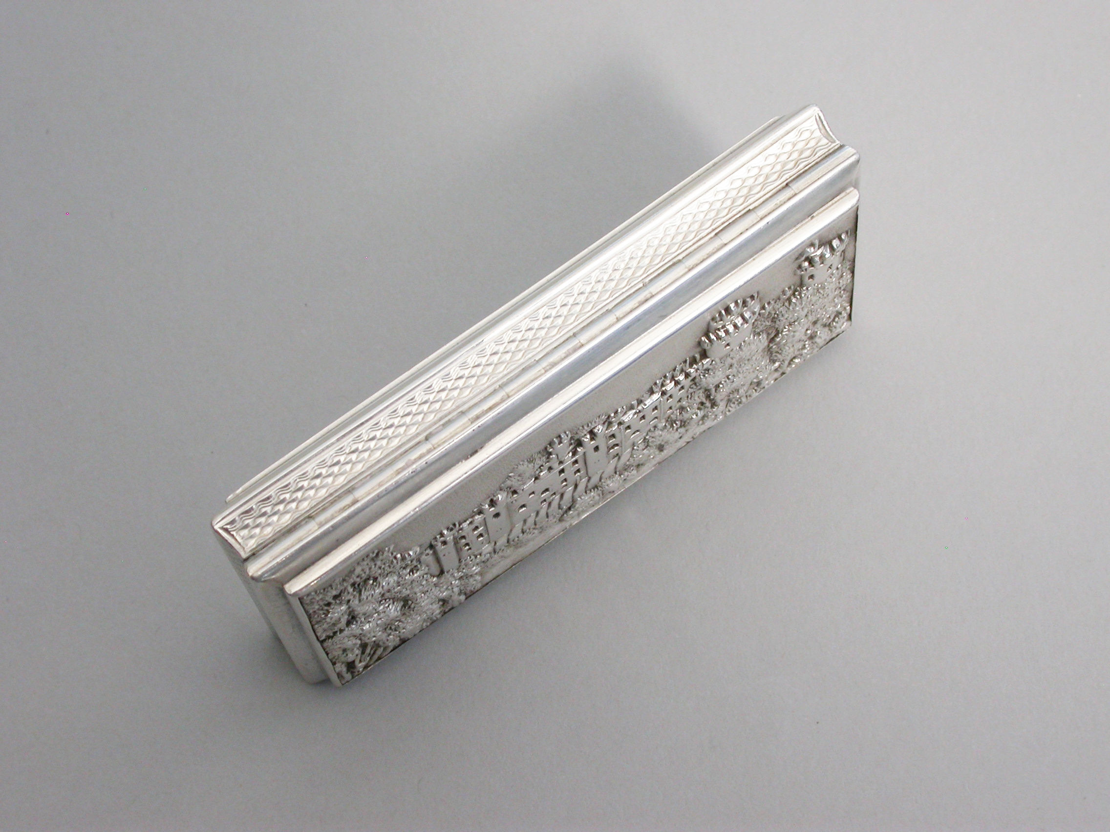 A good quality small Victorian silver Castle-Top Snuff Box of compressed narrow rectangular form, the base engraved with a 'tartan' pattern, the cover with inset cast panel depicting Warwick Castle in high relief. Silver gilt interior.