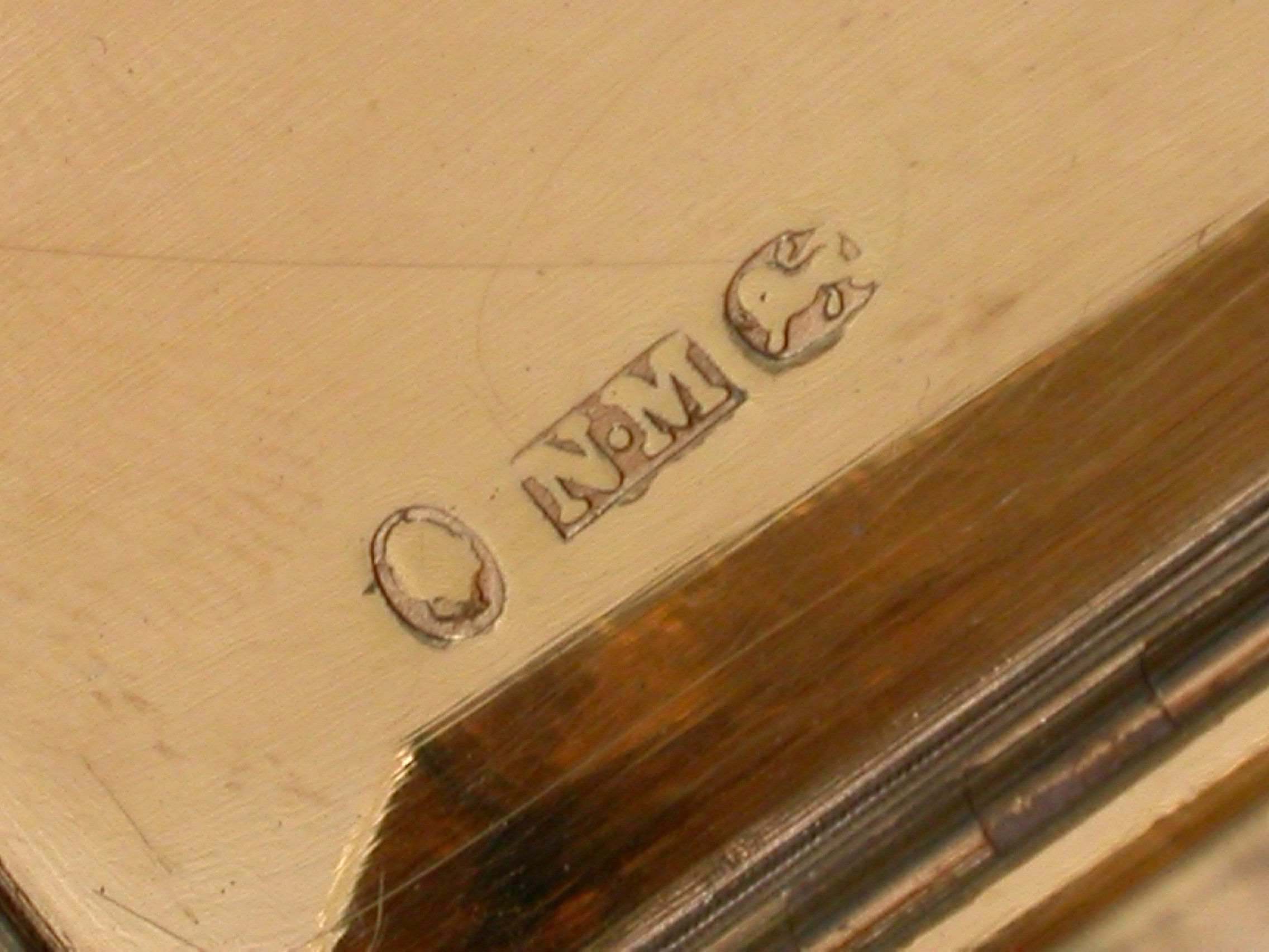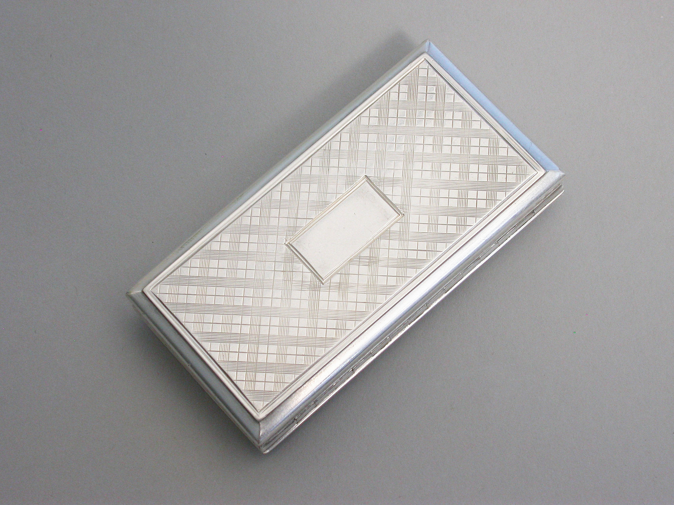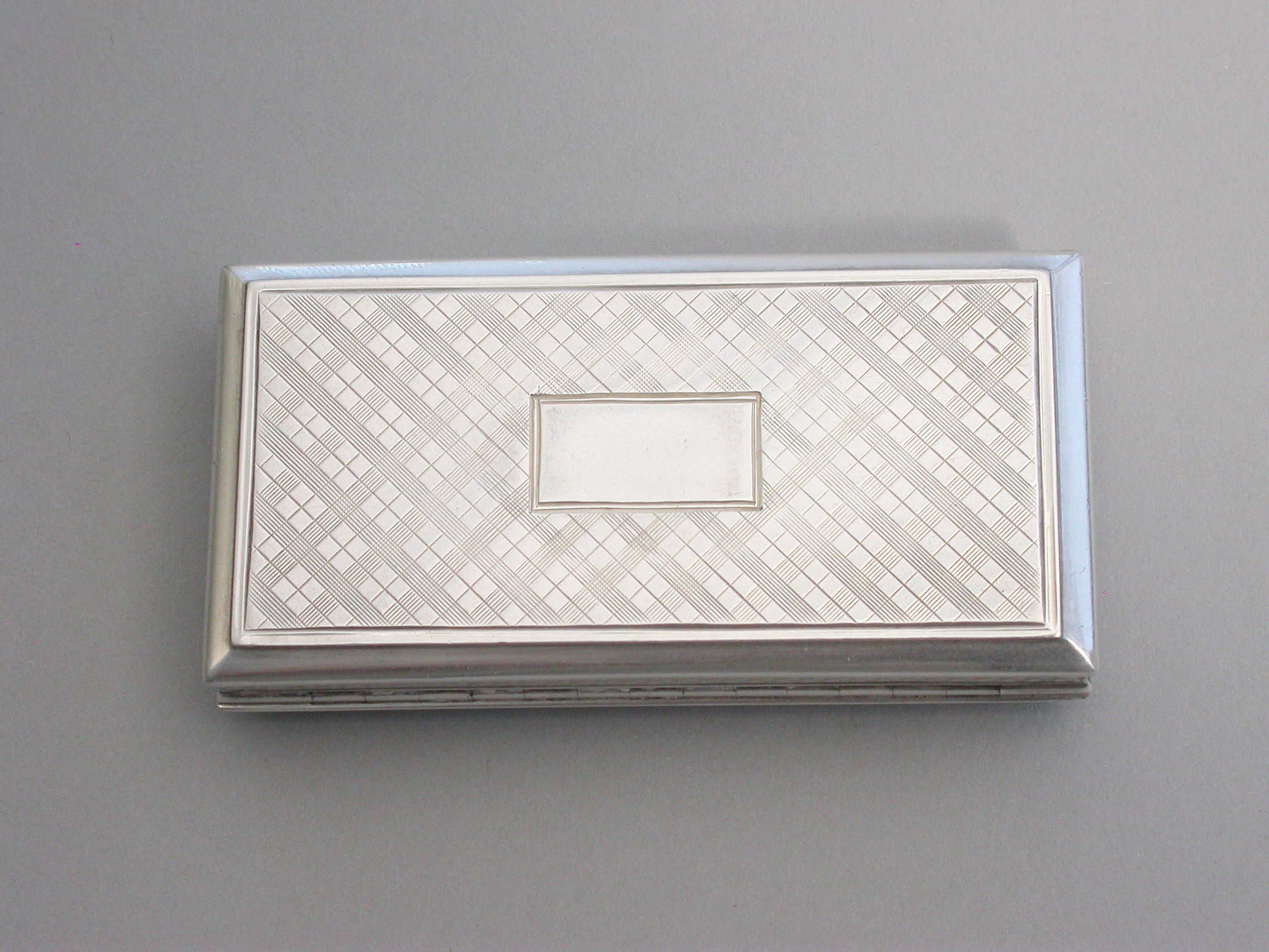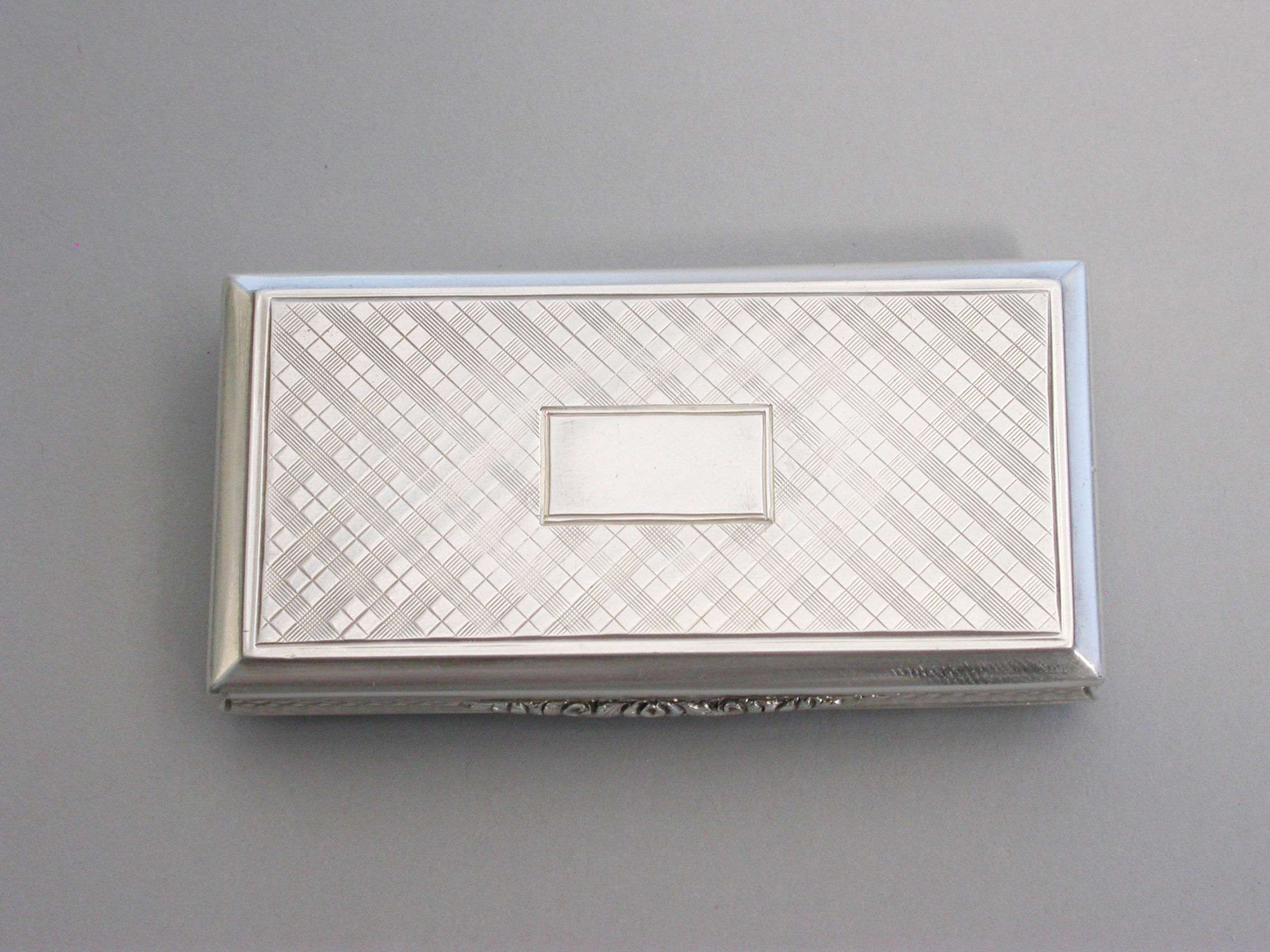 A good quality small Victorian silver Castle-Top Snuff Box of compressed narrow rectangular form, the base engraved with a 'tartan' pattern, the cover with inset cast panel depicting Warwick Castle in high relief. Silver gilt interior.