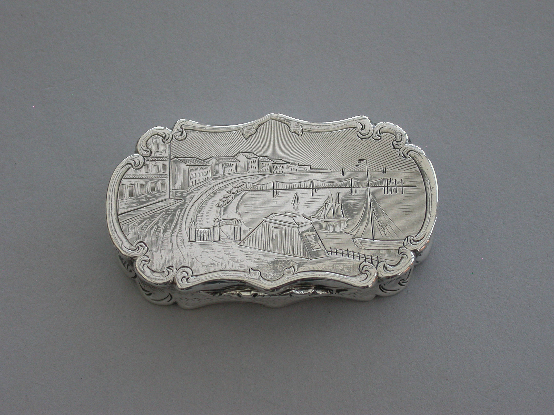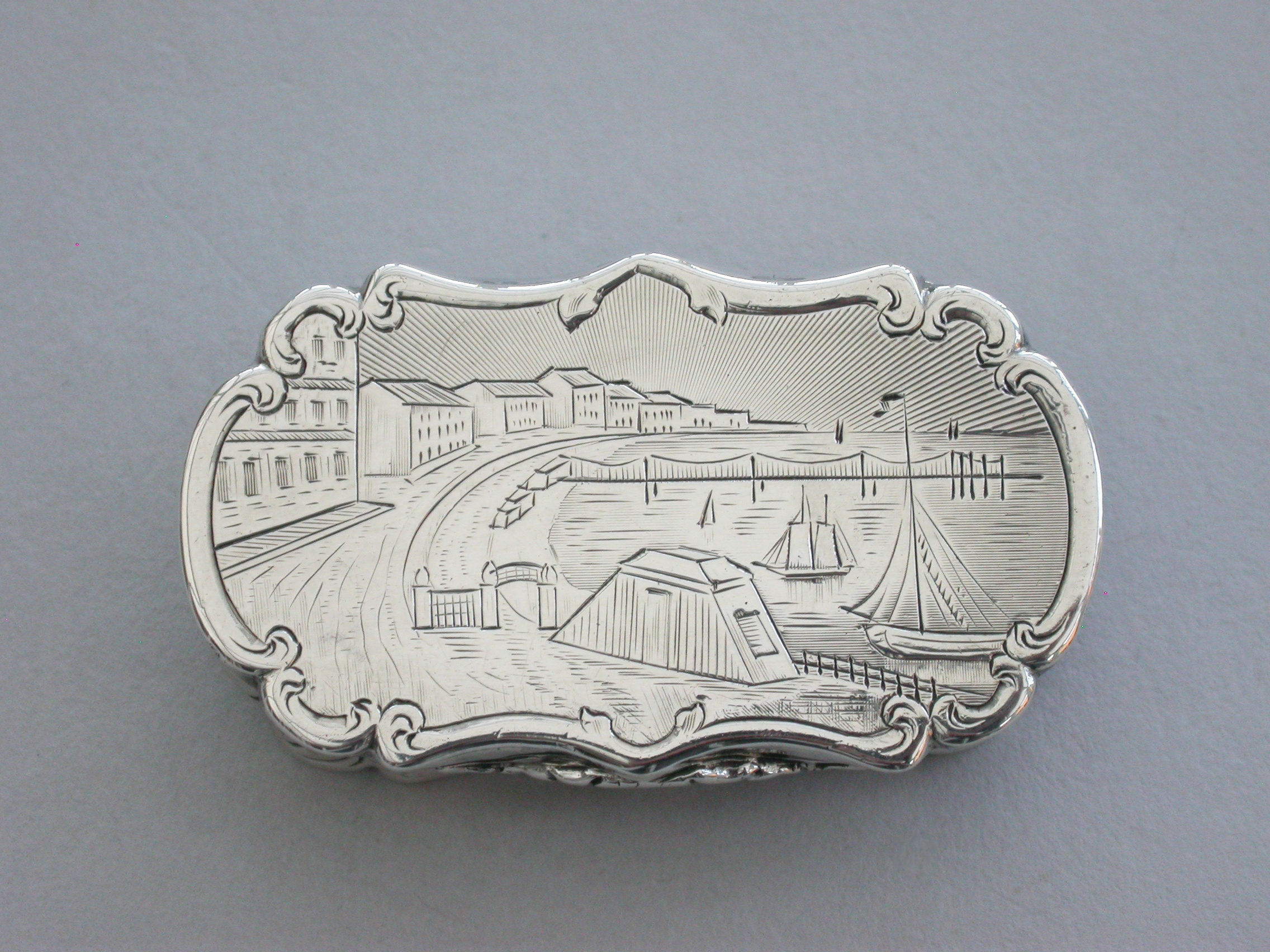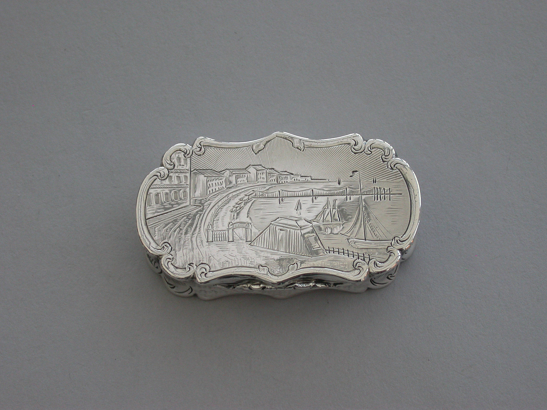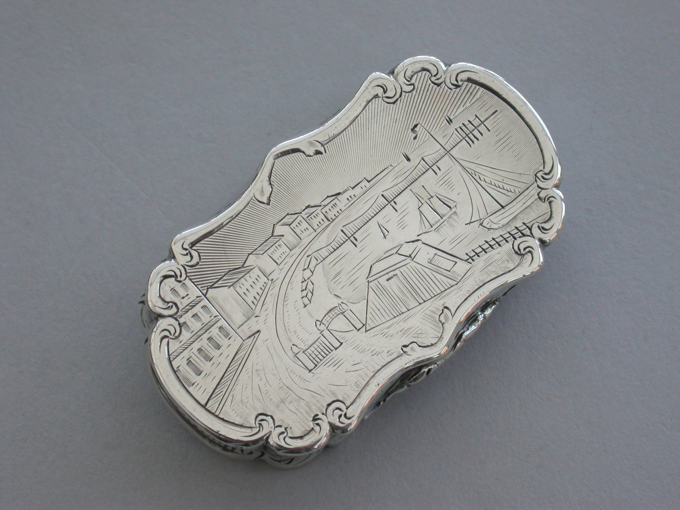 A rare Victorian silver castle-top Vinaigrette of shaped elongated rectangular form, the base with engine turned tartan decoration and a vacant cartouche, the lid engraved with a view of Brighthelmstone (Brighton) showing the Old Chain Pier and Box Office on Marine Parade. The silver gilt grille pierced with scrolling leaves.