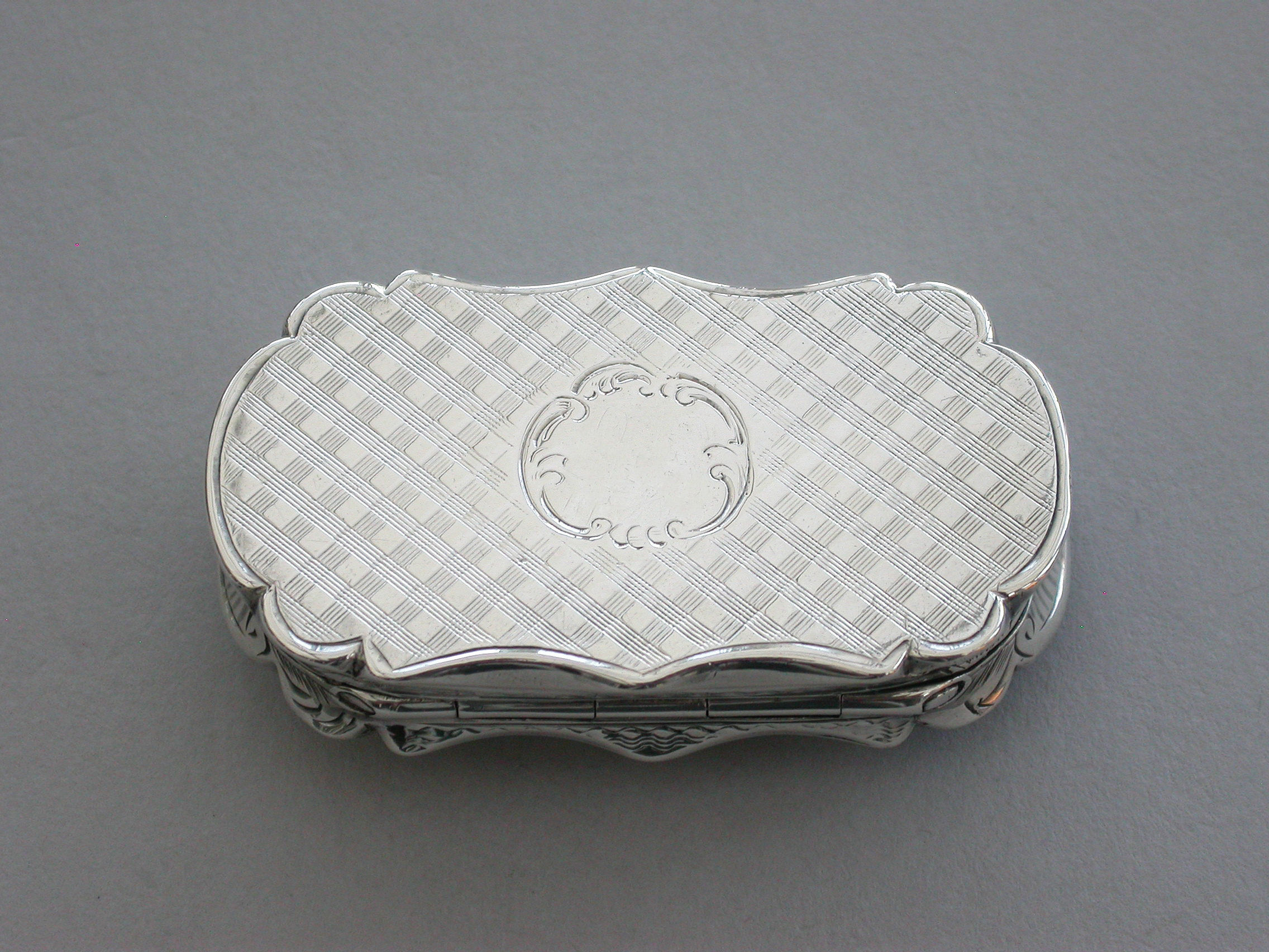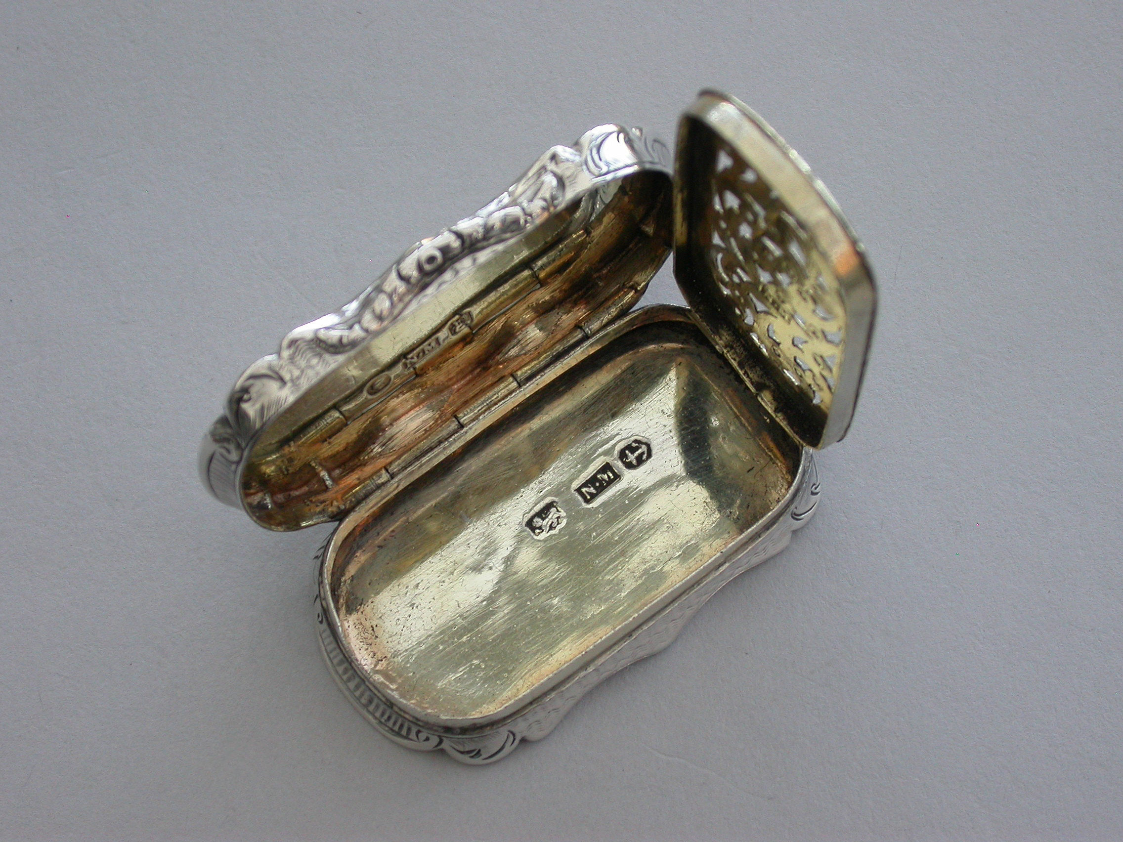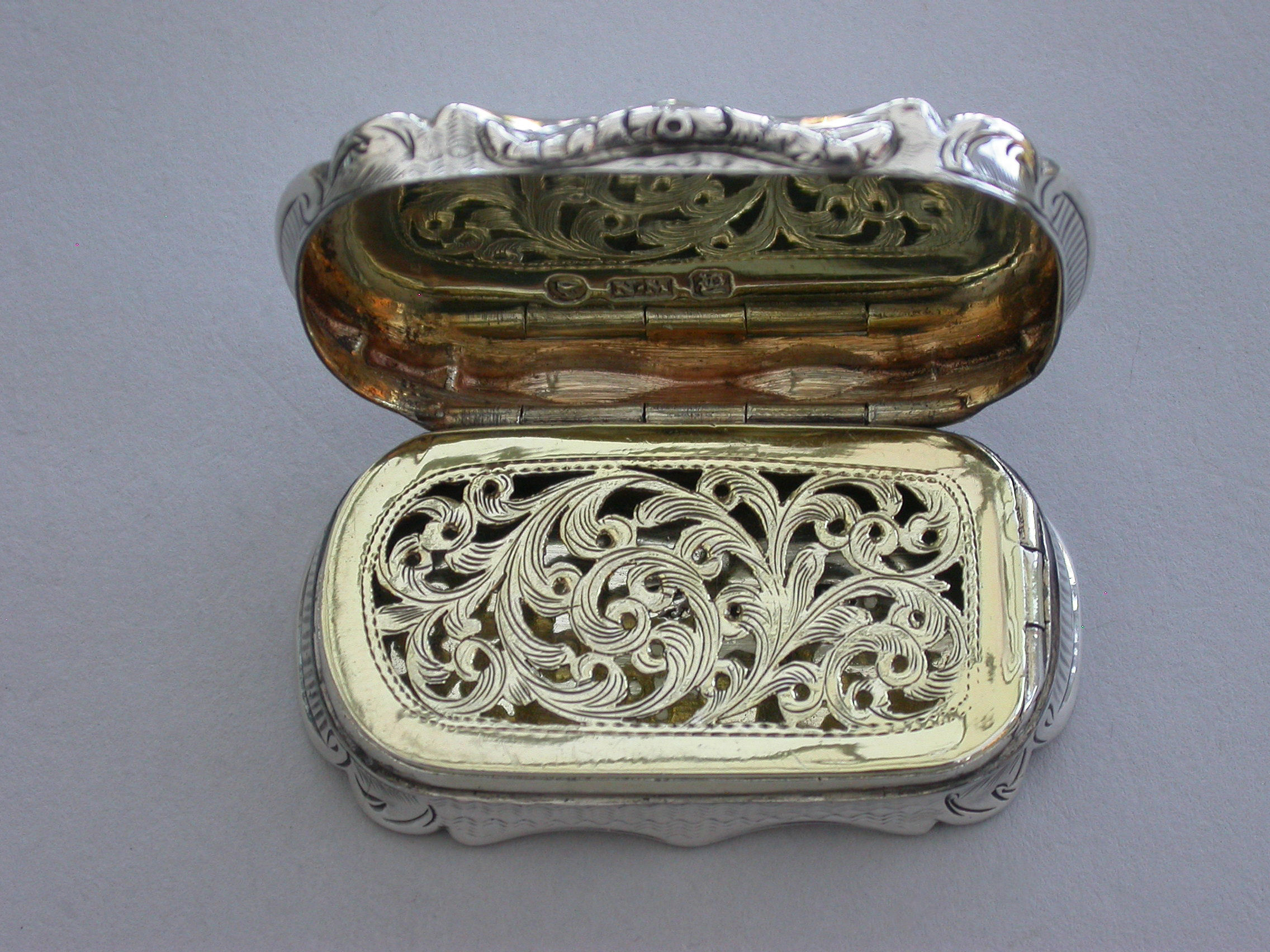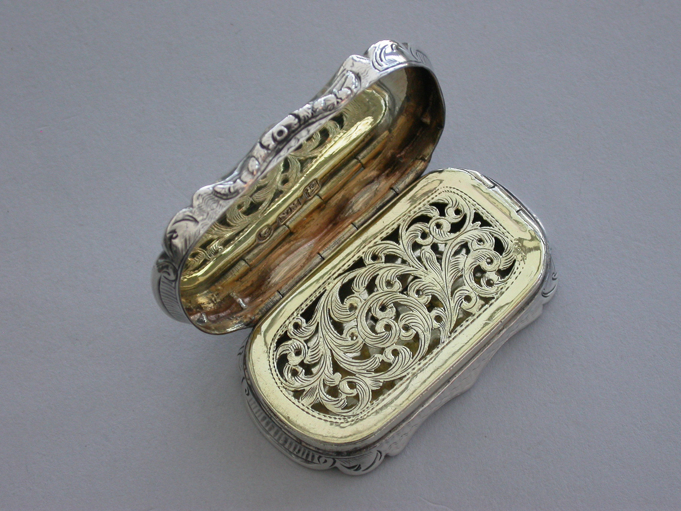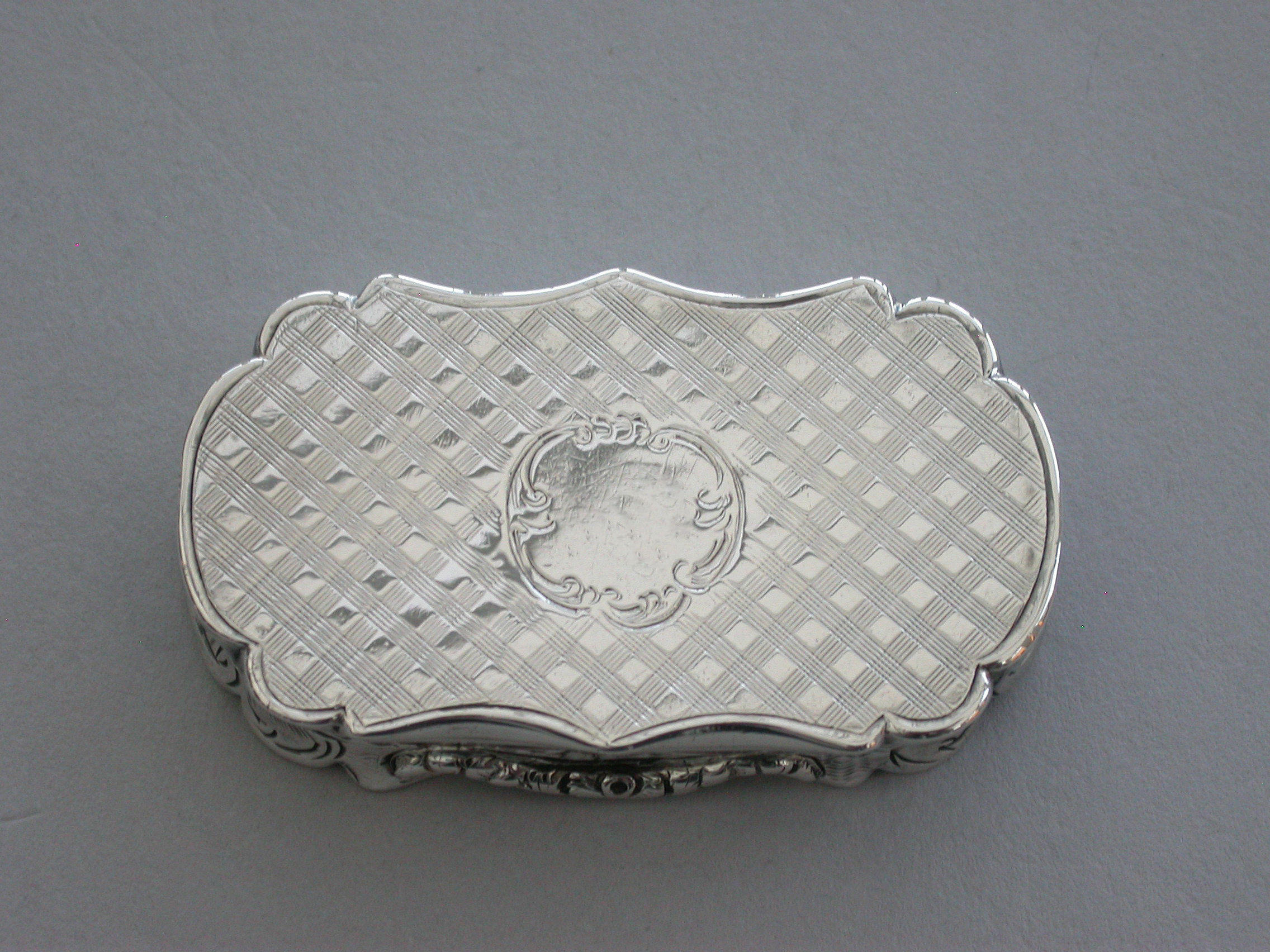 A rare Victorian silver castle-top Vinaigrette of shaped elongated rectangular form, the base with engine turned tartan decoration and a vacant cartouche, the lid engraved with a view of Brighthelmstone (Brighton) showing the Old Chain Pier and Box Office on Marine Parade. The silver gilt grille pierced with scrolling leaves.