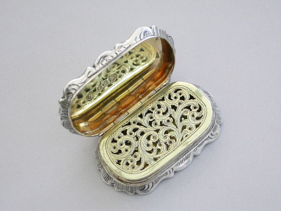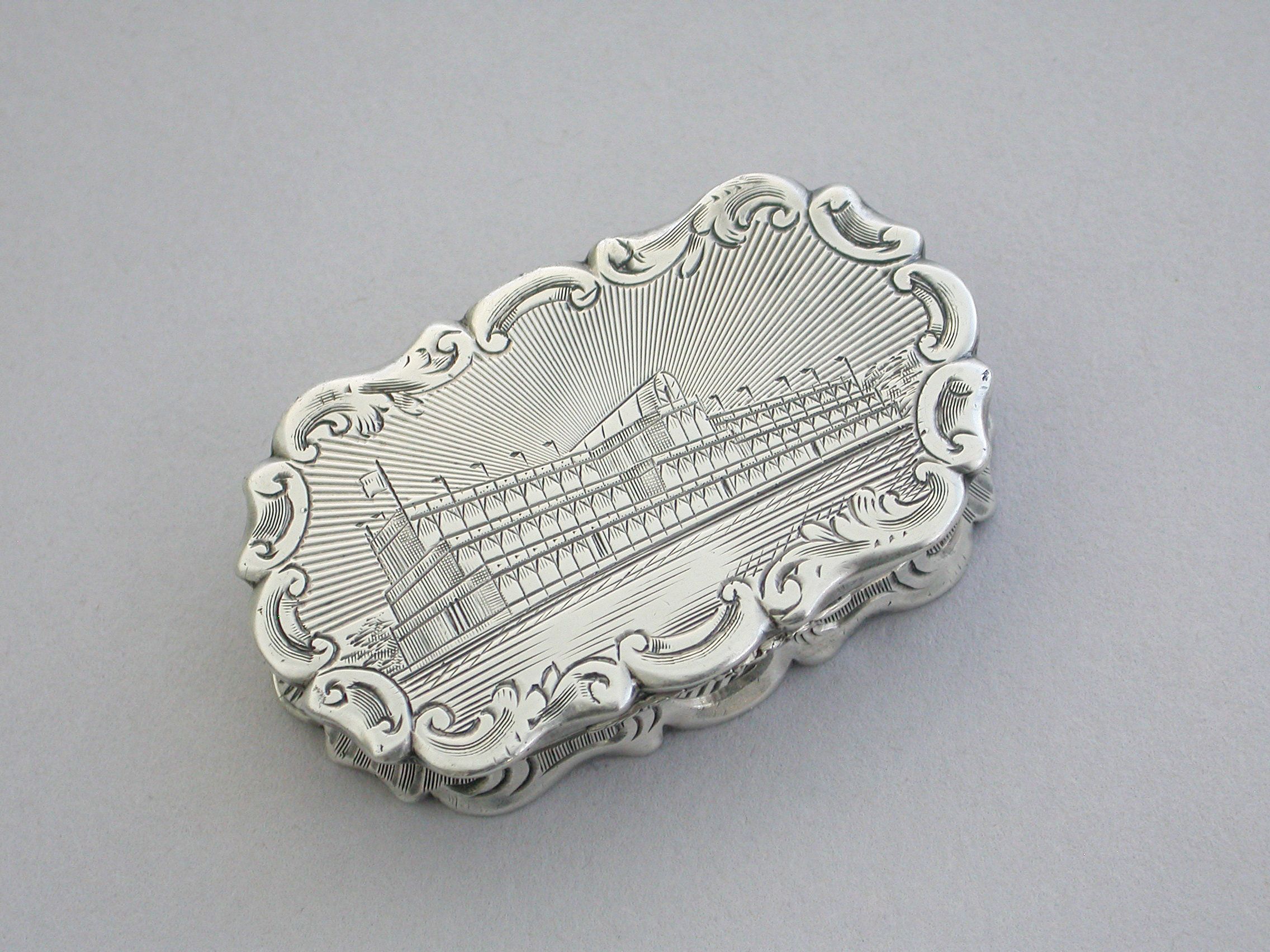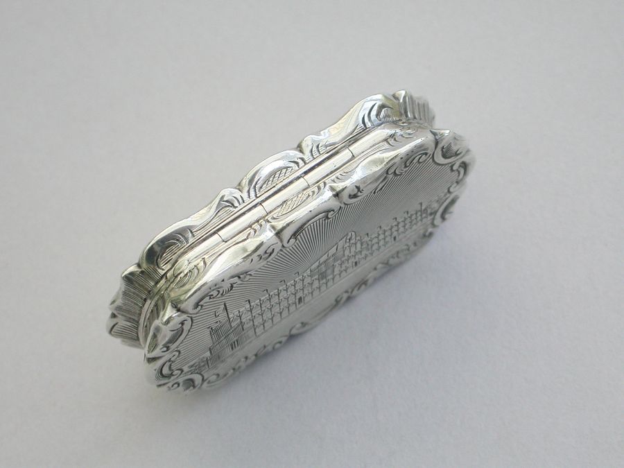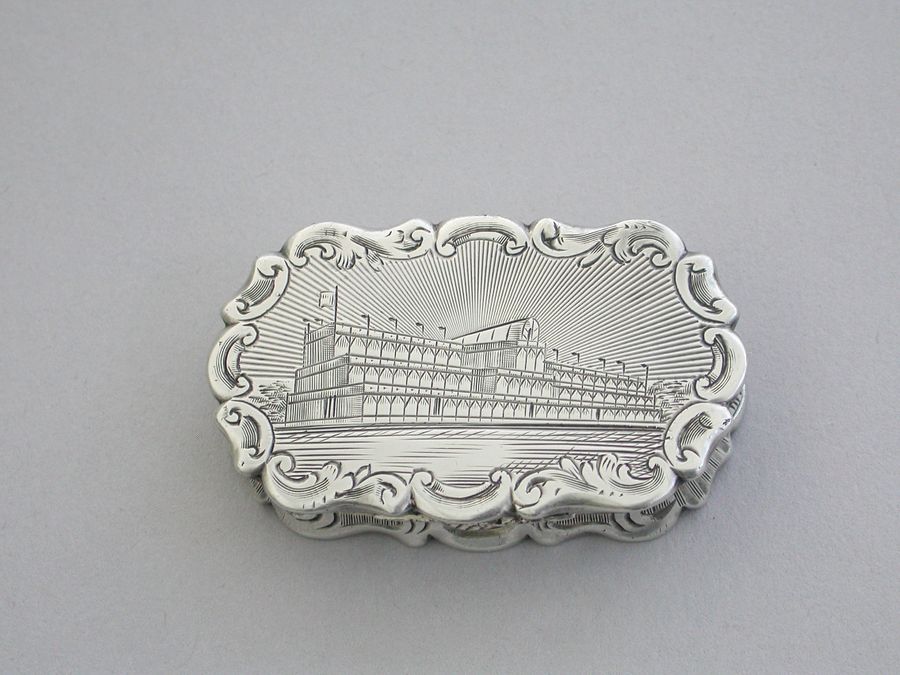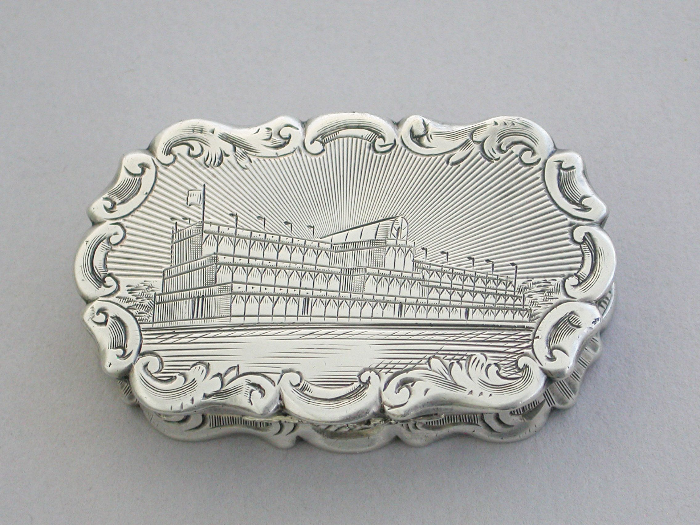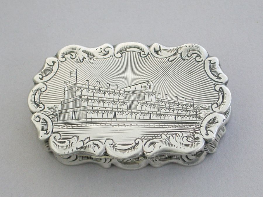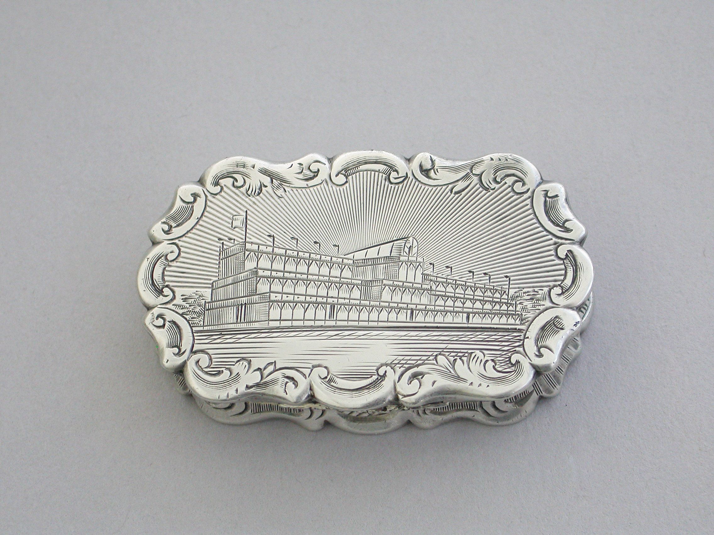 A fine Victorian silver Castle-Top Vinaigrette, of shaped oval form with engine turned base with a vacant shaped cartouche, the lid engraved with a view of the Crystal Palace in London,the silver gilt interior with foliate scroll pierced hinged grille.
