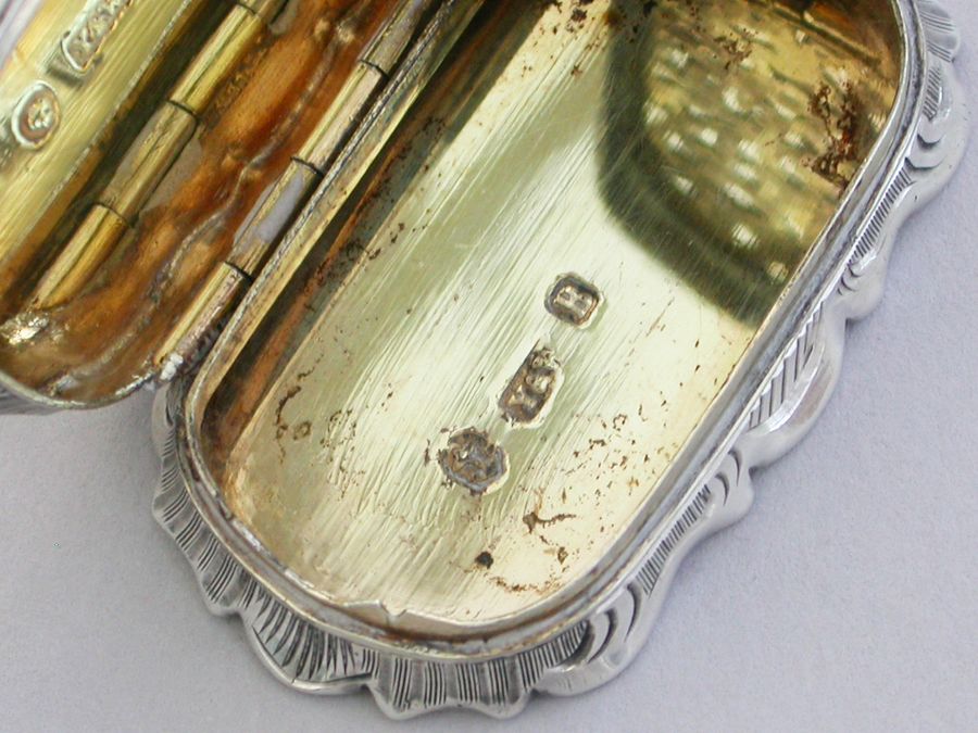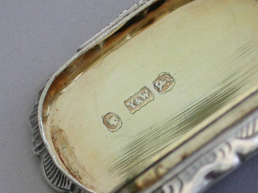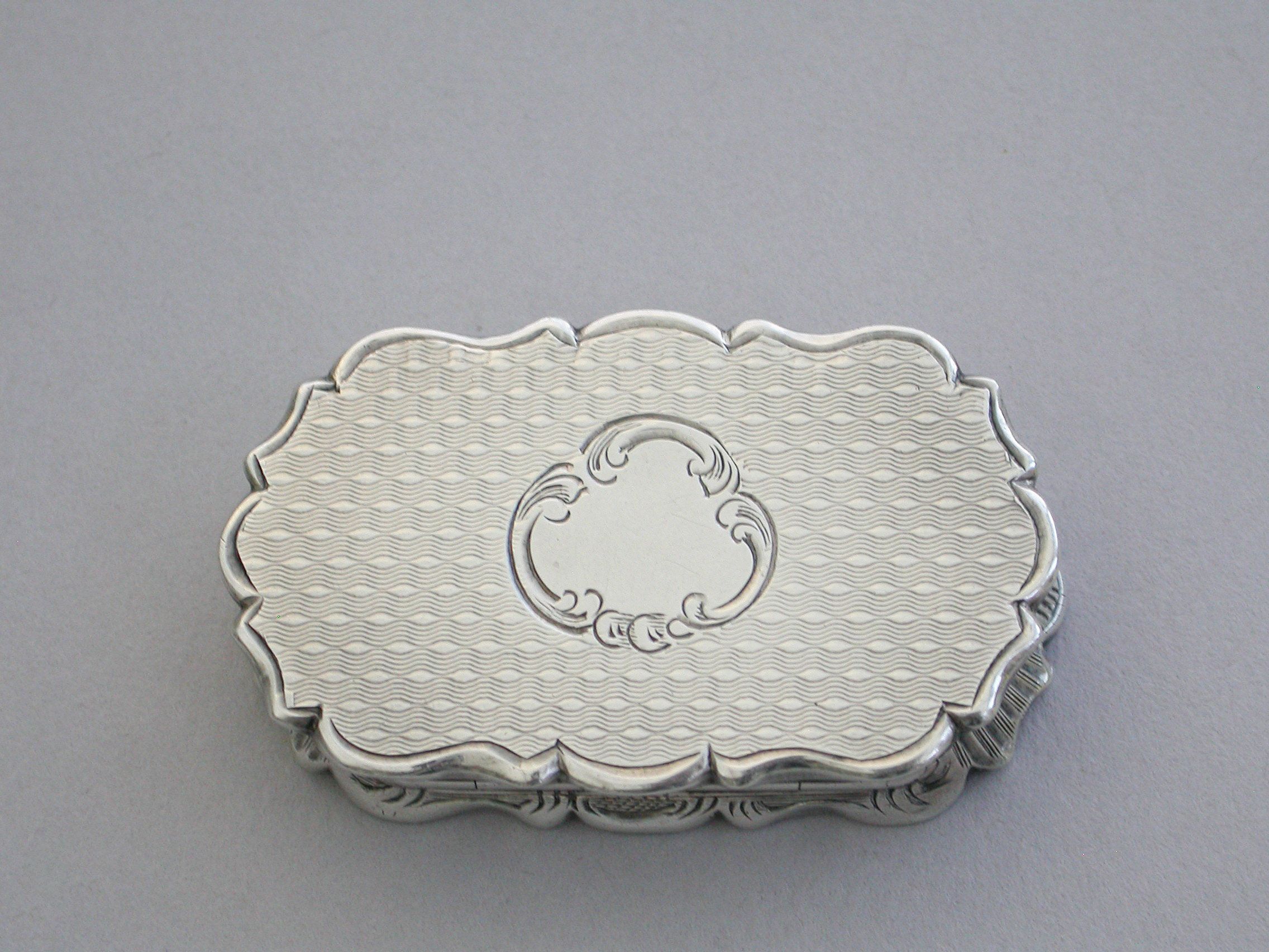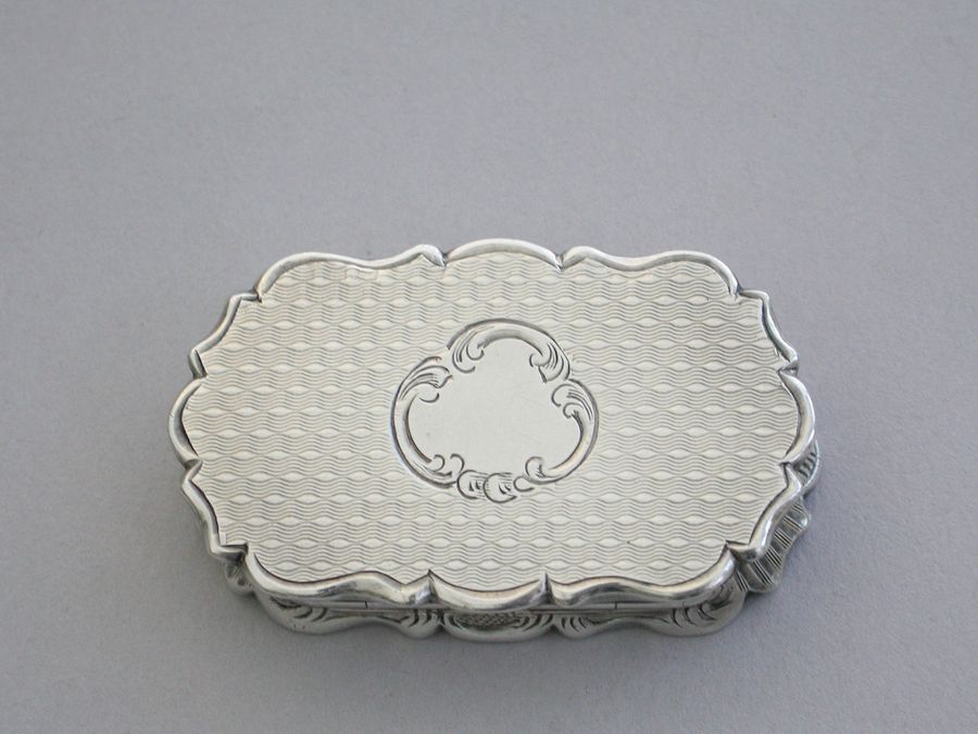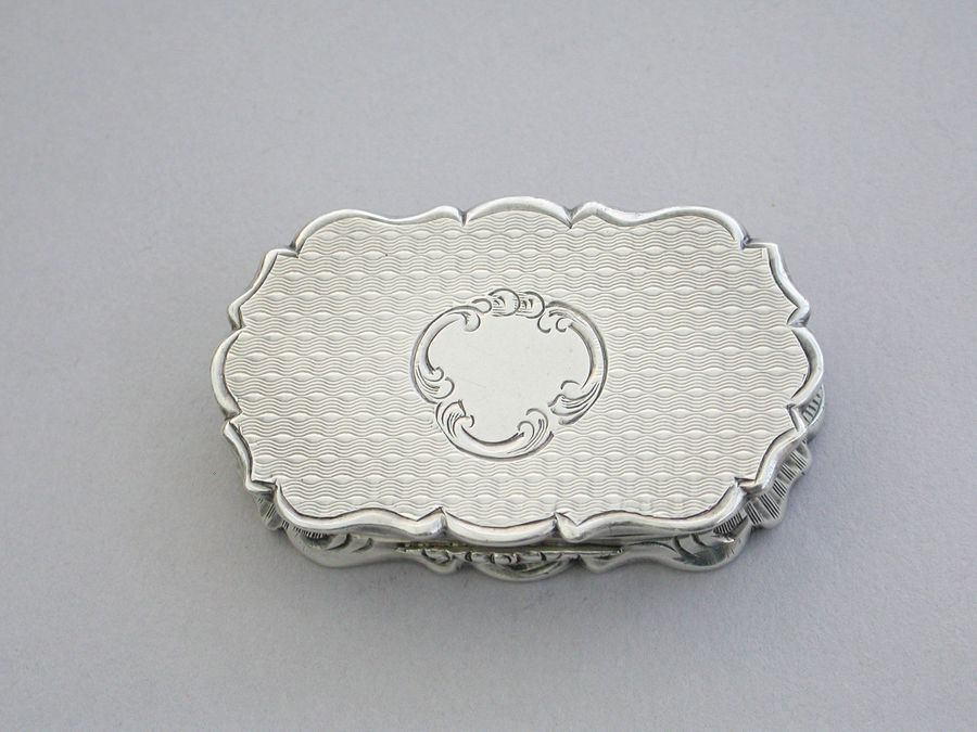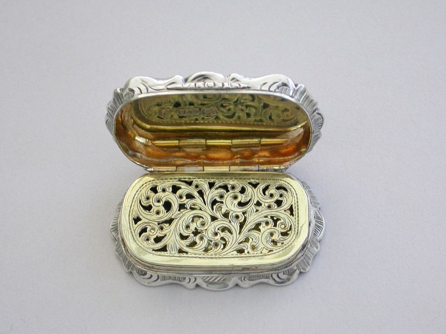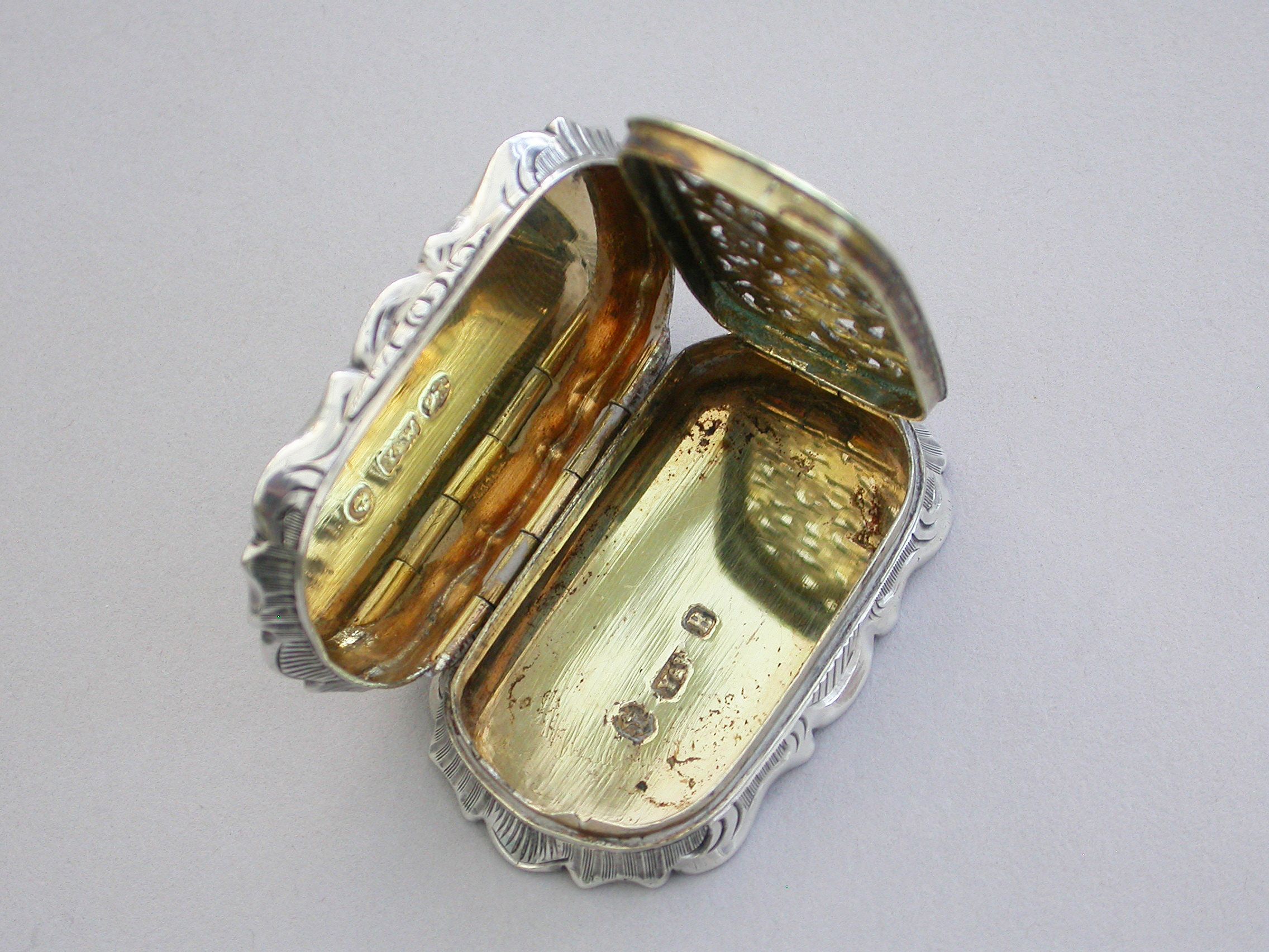 A fine Victorian silver Castle-Top Vinaigrette, of shaped oval form with engine turned base with a vacant shaped cartouche, the lid engraved with a view of the Crystal Palace in London,the silver gilt interior with foliate scroll pierced hinged grille.