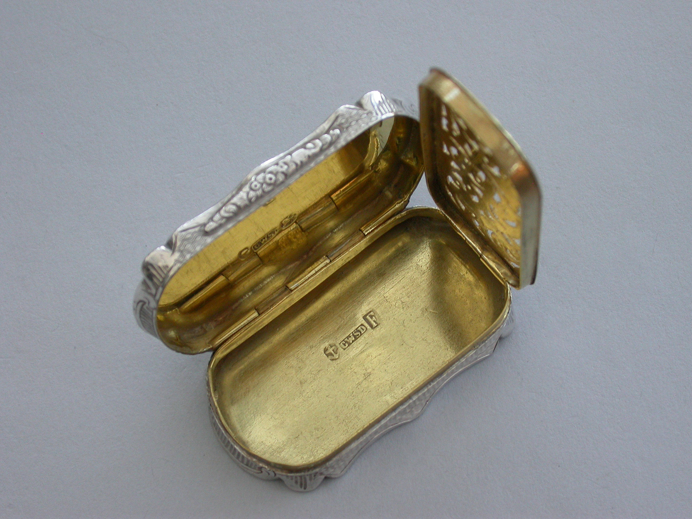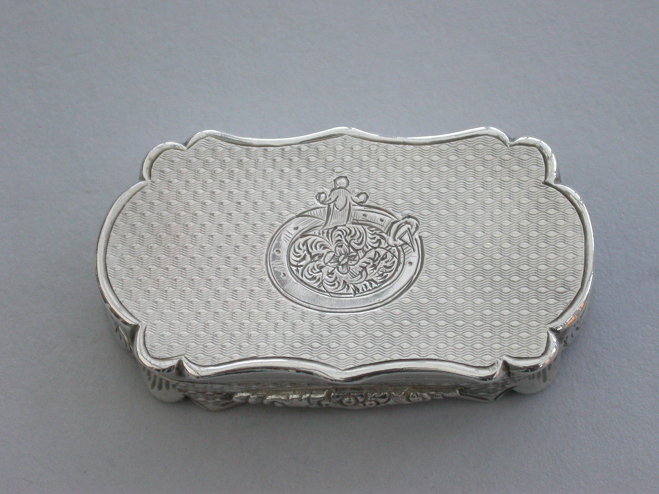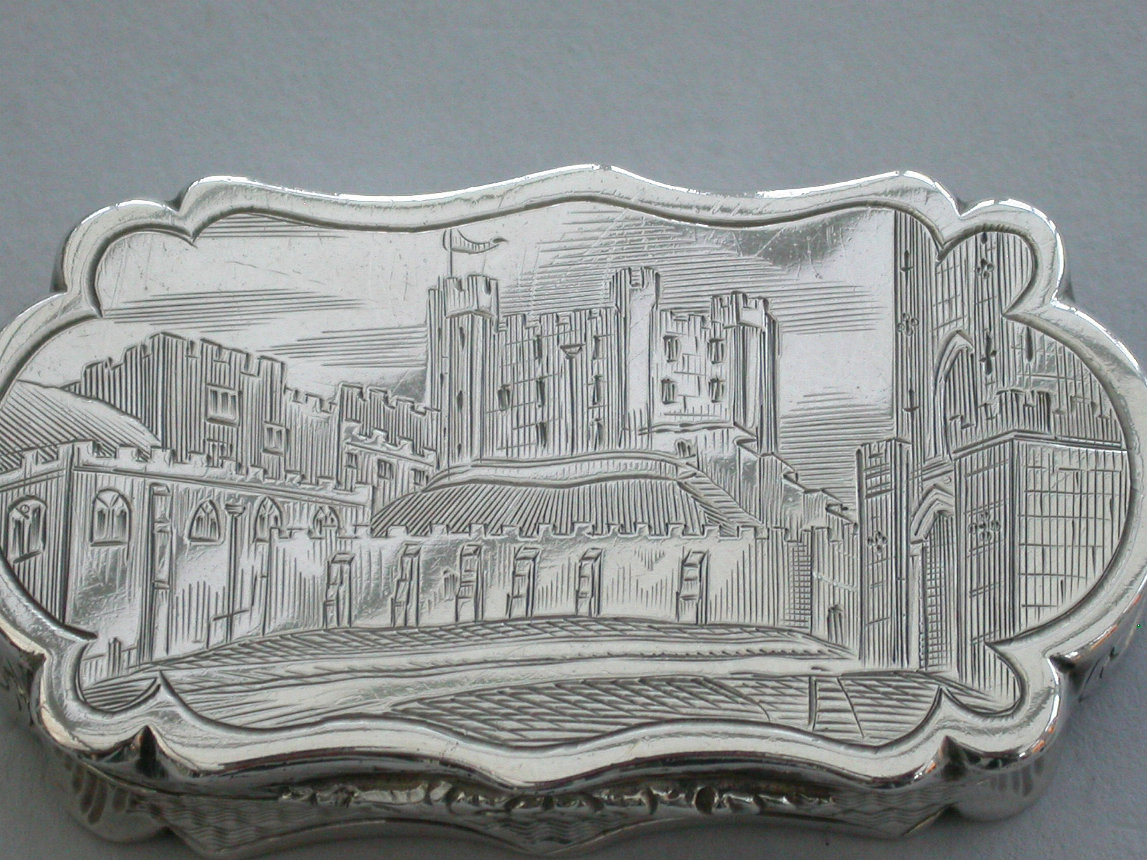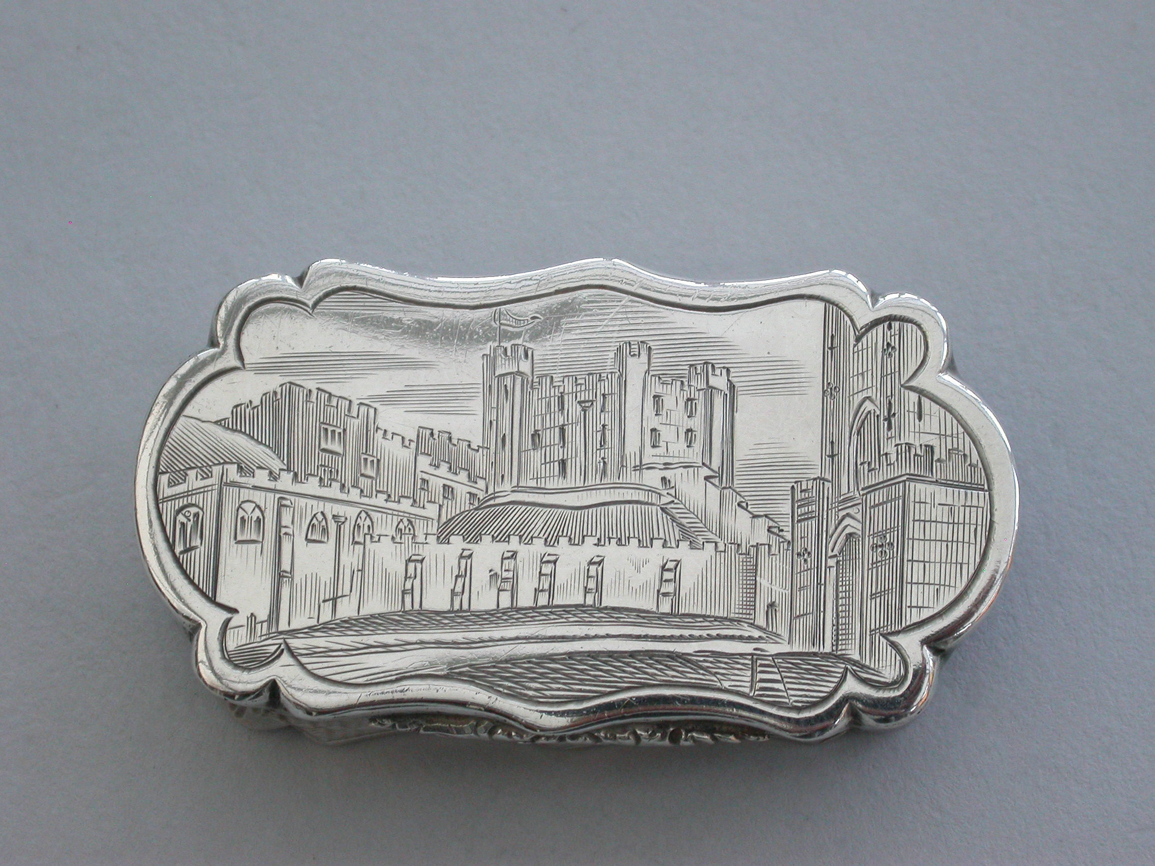 An extremely rare Victorian silver castle-top Vinaigrette of shaped oblong form, the base with engine turned decoration and a patera within a garter, the cover engraved with a scene depicting Durham Castle Keep and Quadrangle within a border. The silver gilt grille pierced with folaite scrolls.