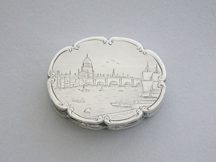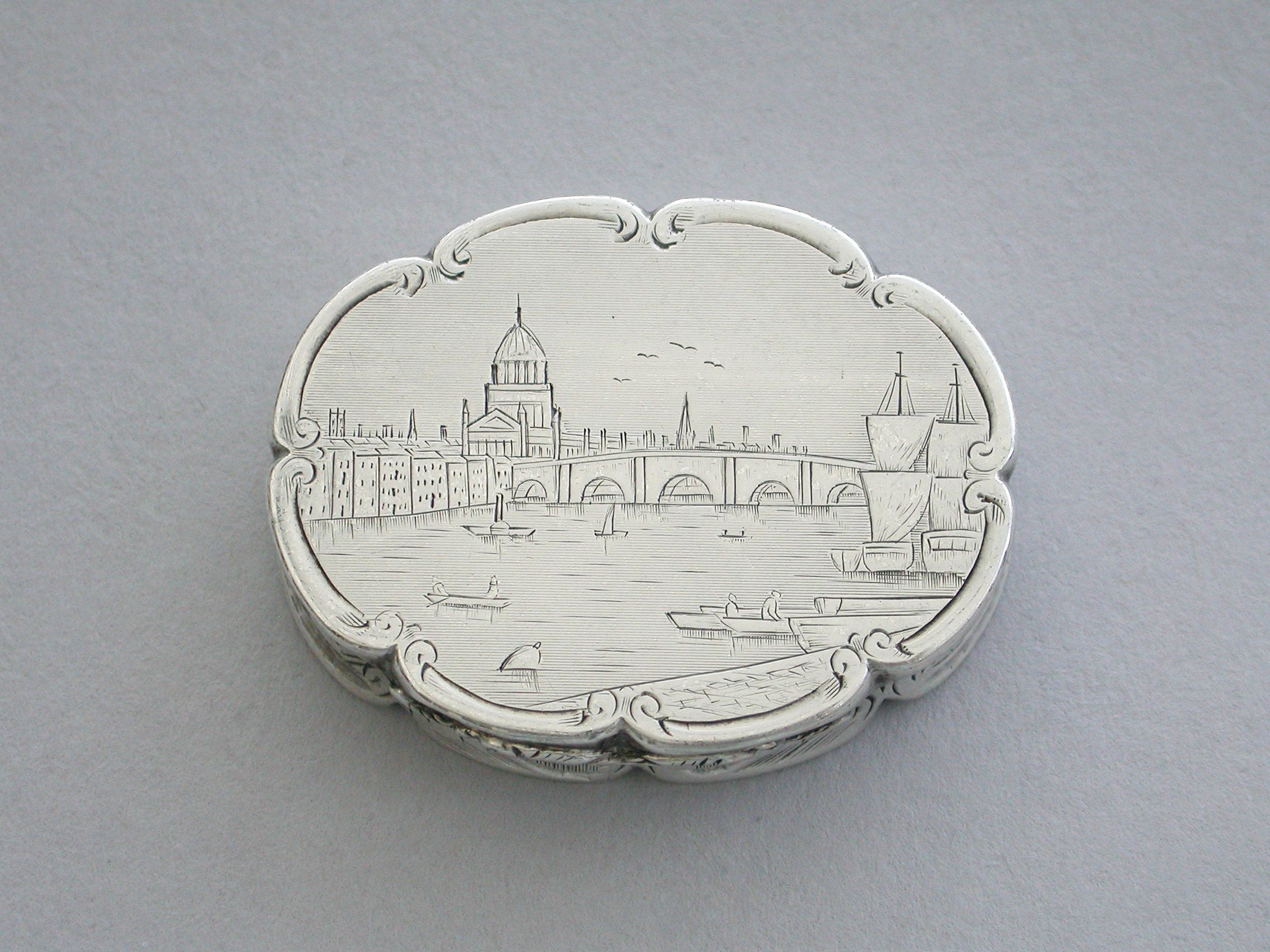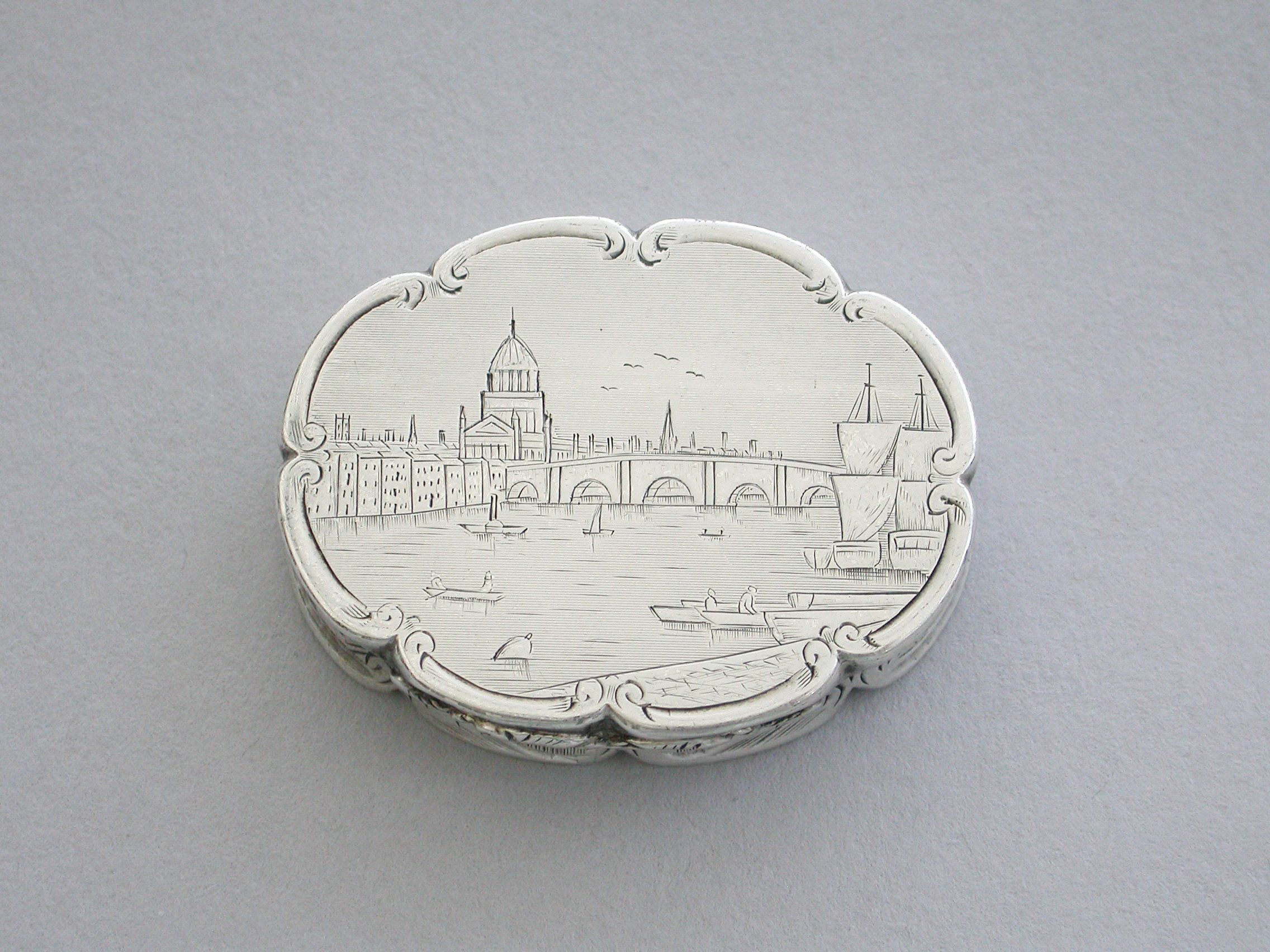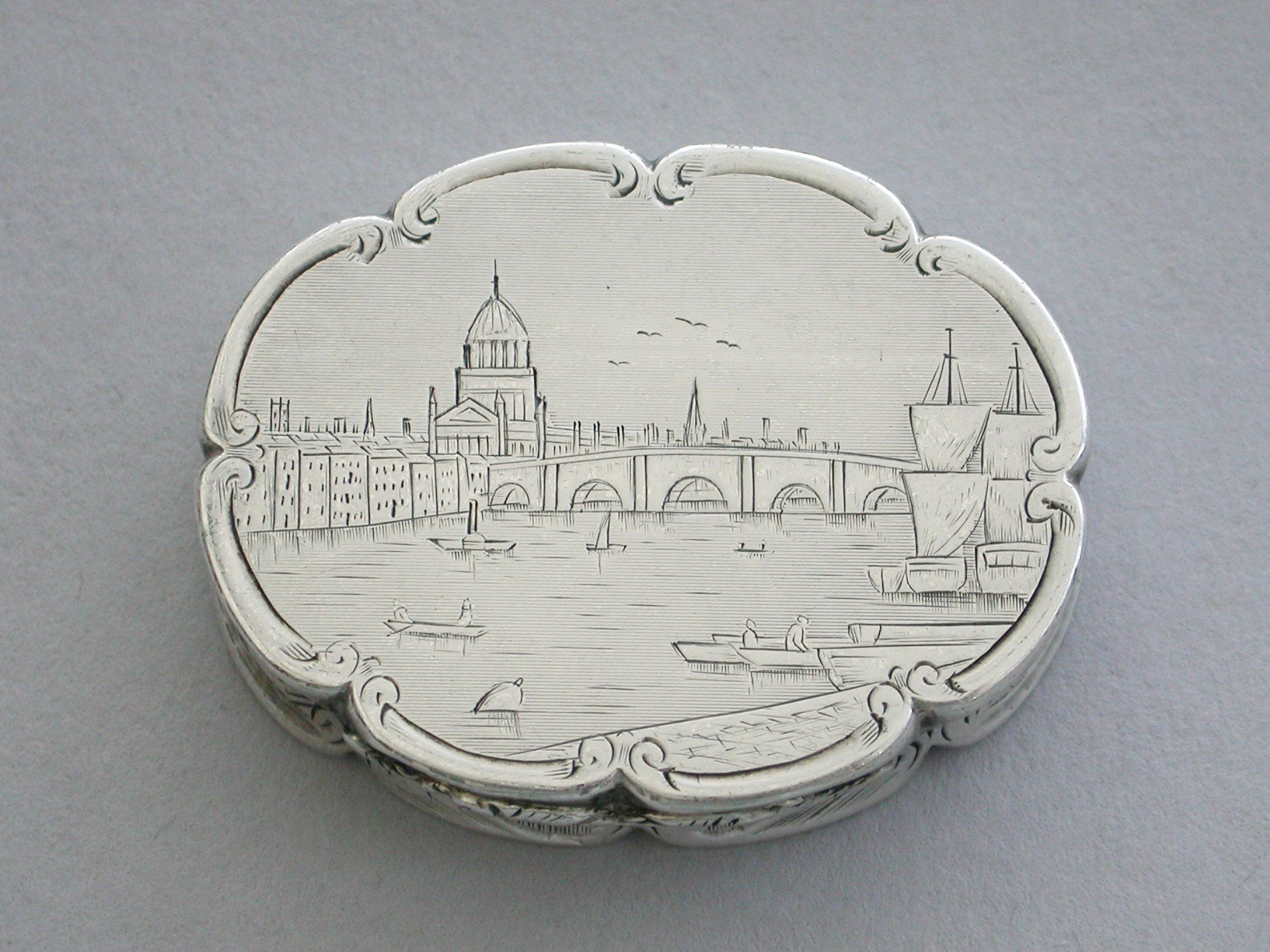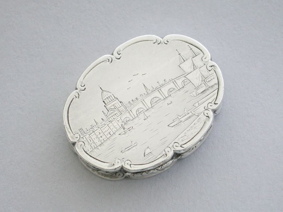 An extremely rare Victorian silver Castle-Top Vinaigrette of shaped oval form with engine turned decoration to the base and sides, a vacant shield shaped cartouche to the base, the lid engraved with a scene depicting London Bridge over the river Thames, with boats in the foreground and St Paul's Cathedral in the background. The silver gilt interior with foliate scroll pierced grille.
