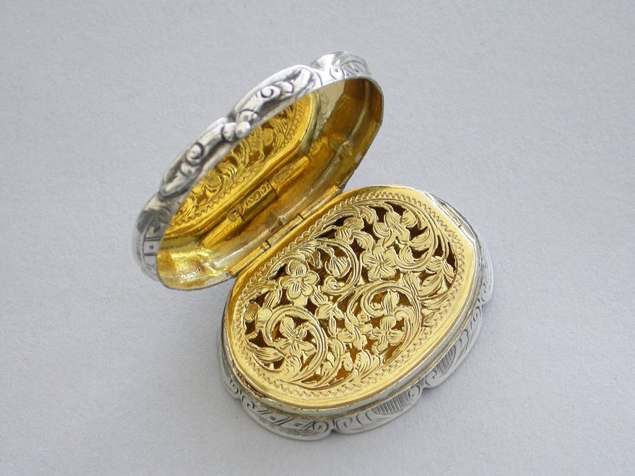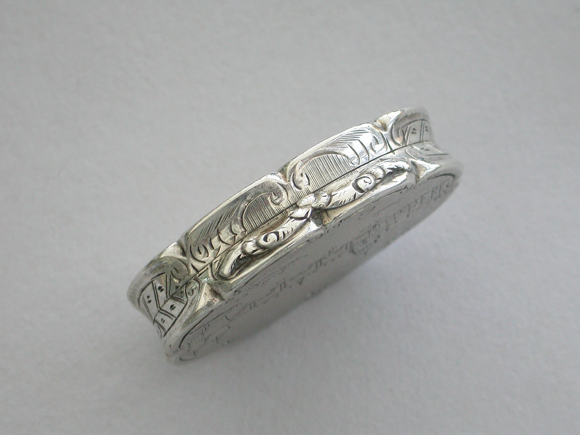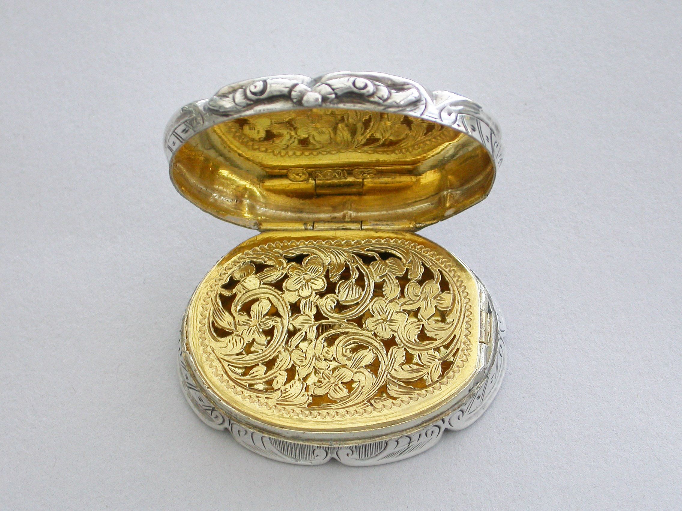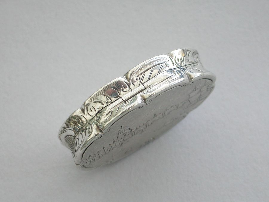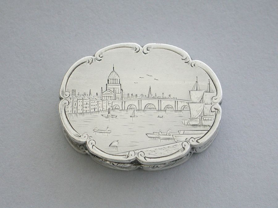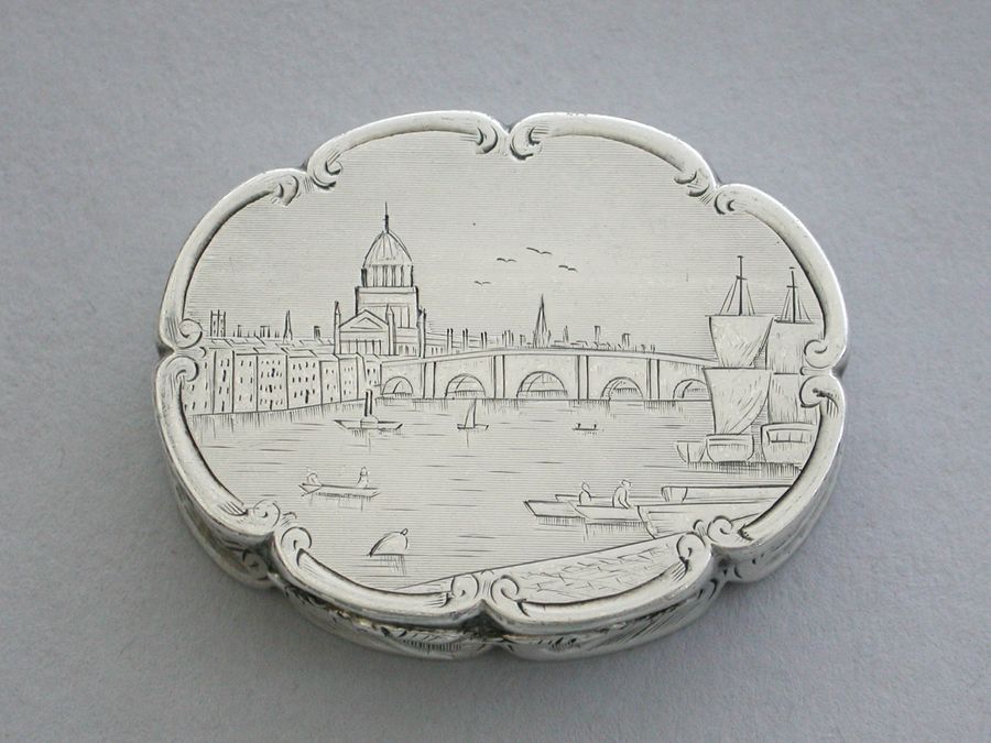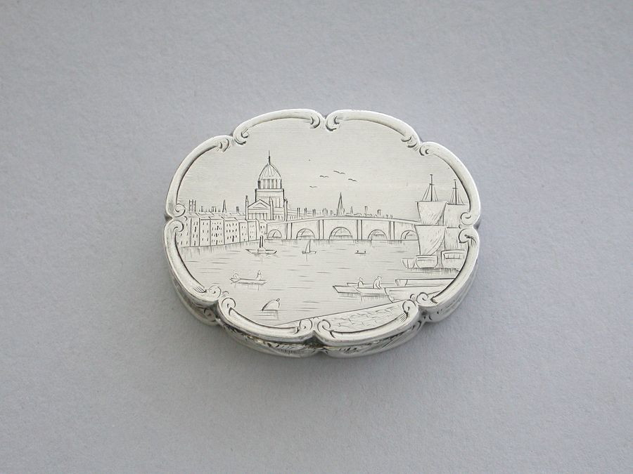 An extremely rare Victorian silver Castle-Top Vinaigrette of shaped oval form with engine turned decoration to the base and sides, a vacant shield shaped cartouche to the base, the lid engraved with a scene depicting London Bridge over the river Thames, with boats in the foreground and St Paul's Cathedral in the background. The silver gilt interior with foliate scroll pierced grille.