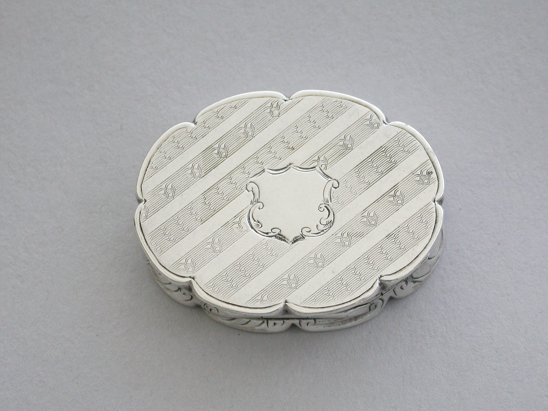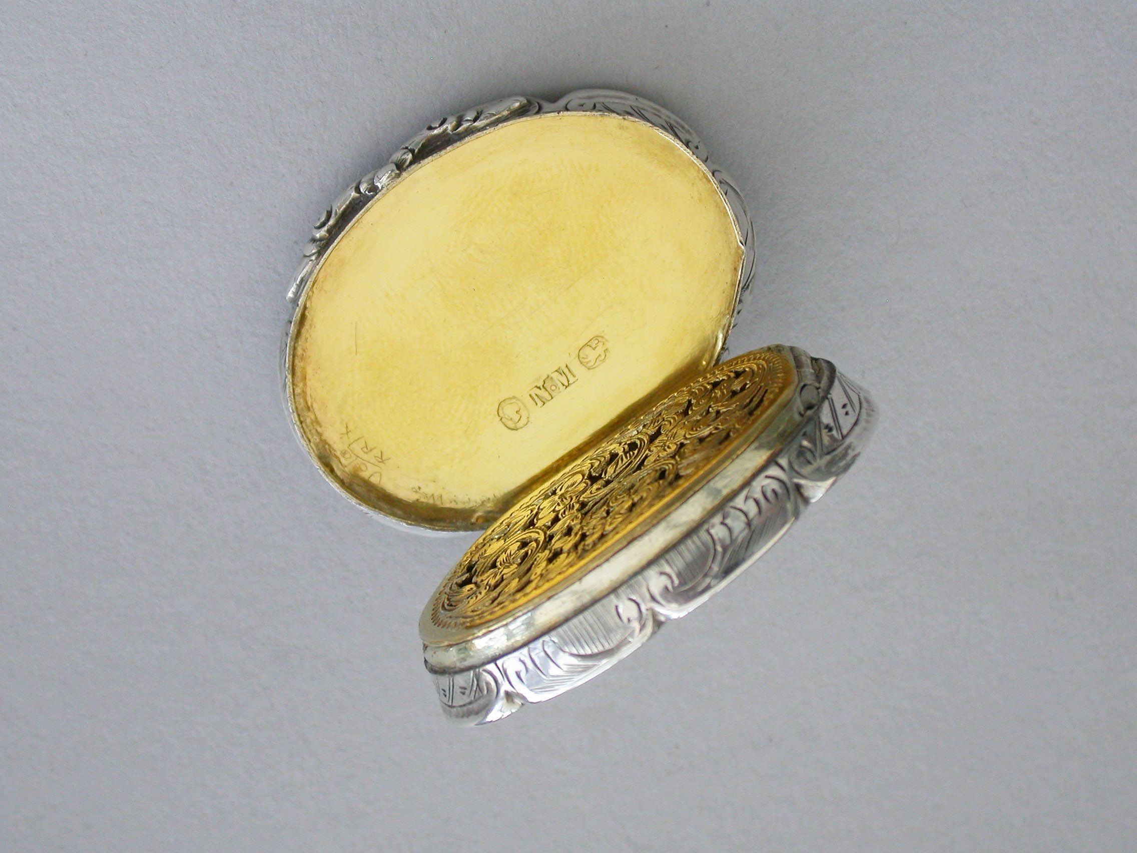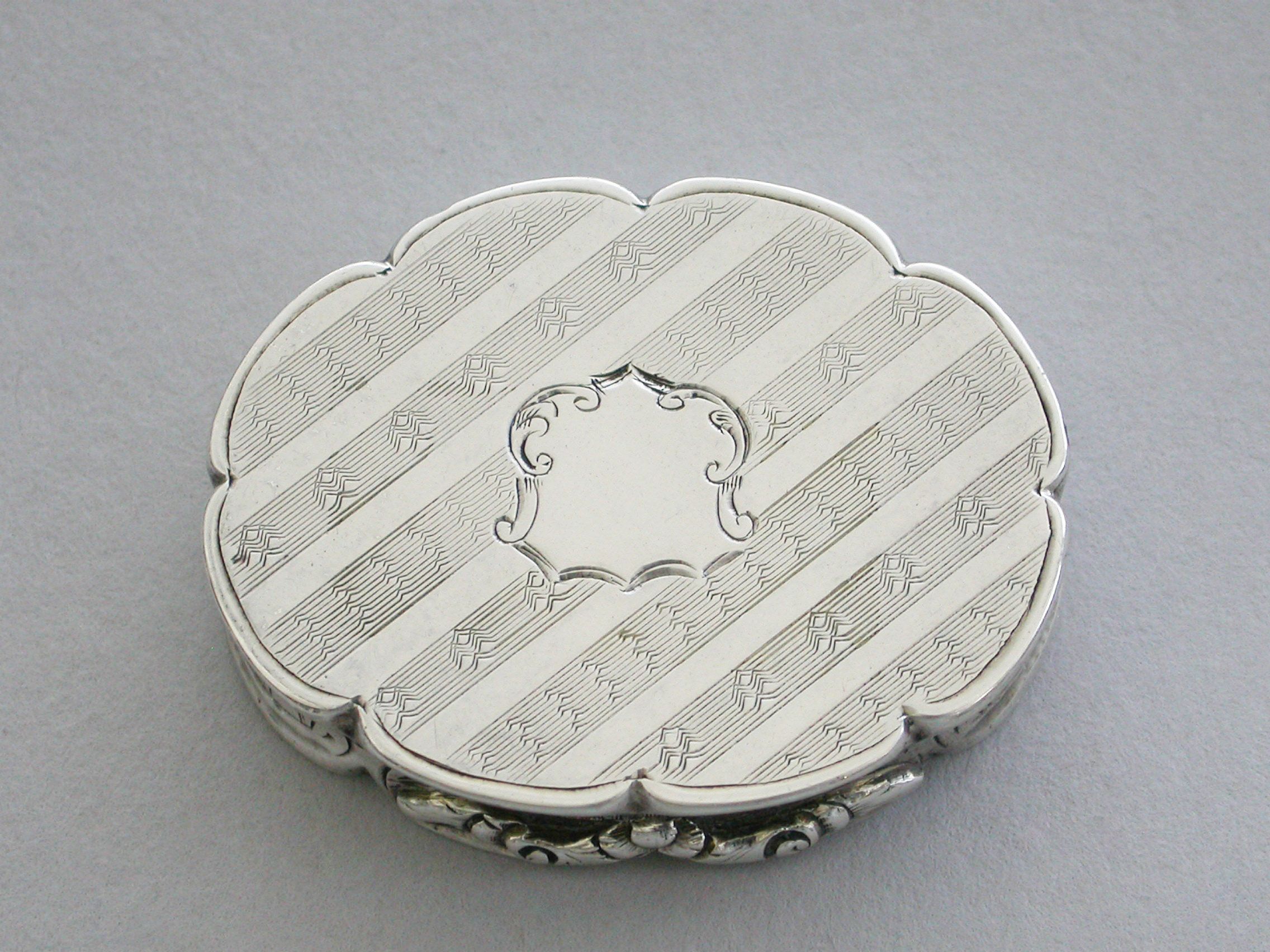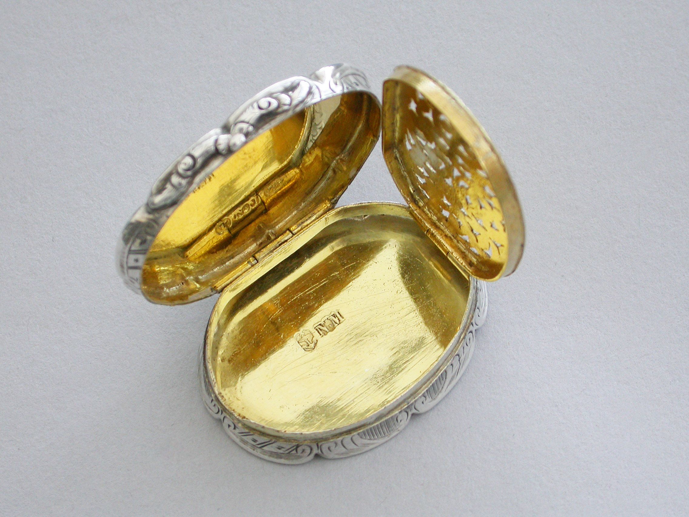 An extremely rare Victorian silver Castle-Top Vinaigrette of shaped oval form with engine turned decoration to the base and sides, a vacant shield shaped cartouche to the base, the lid engraved with a scene depicting London Bridge over the river Thames, with boats in the foreground and St Paul's Cathedral in the background. The silver gilt interior with foliate scroll pierced grille.
