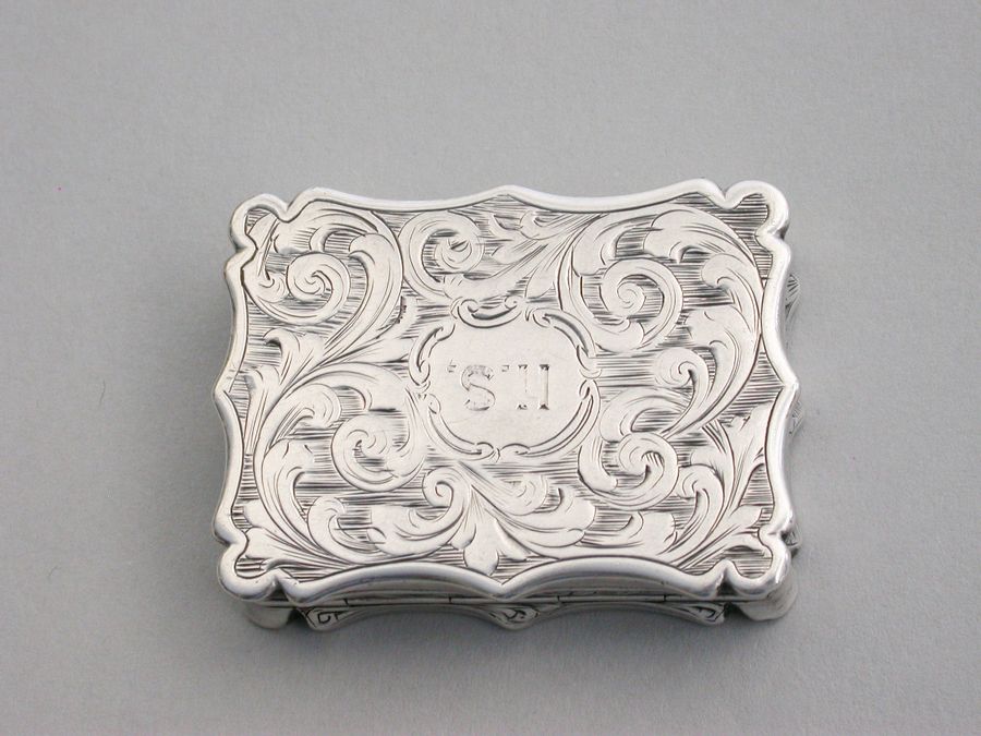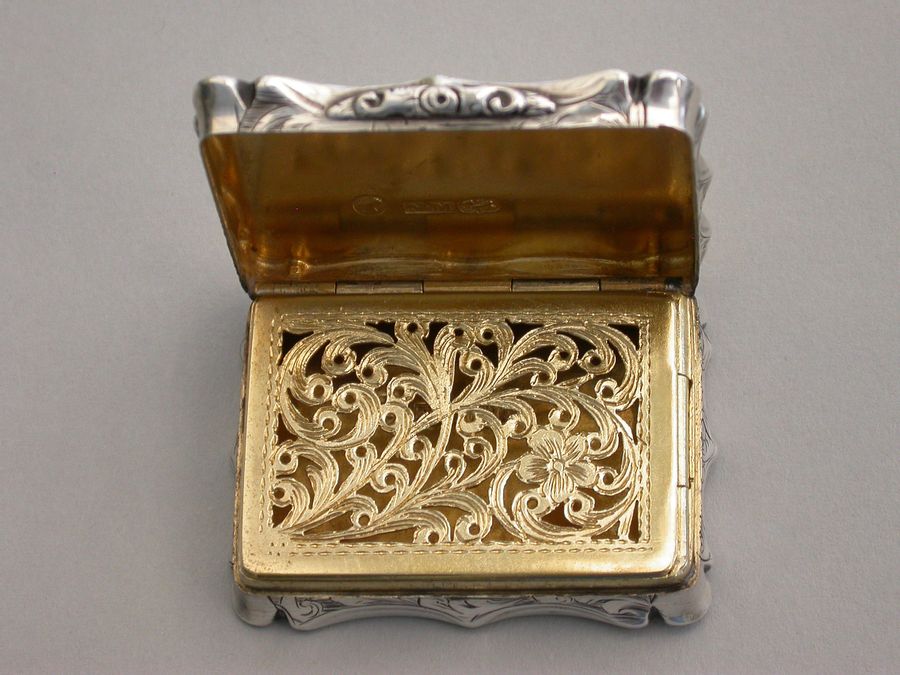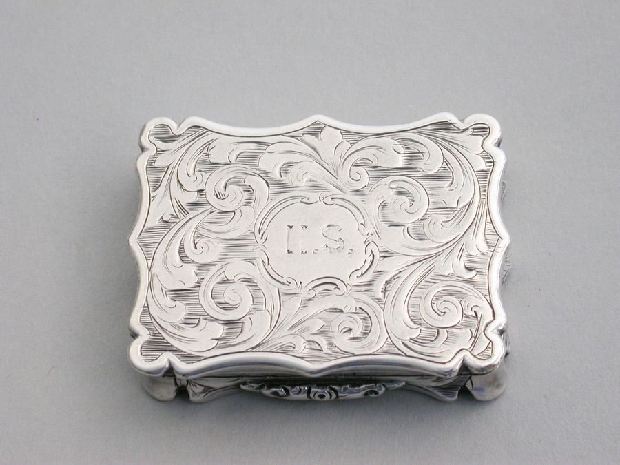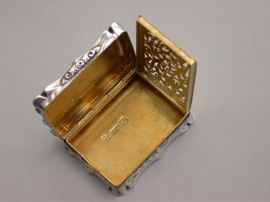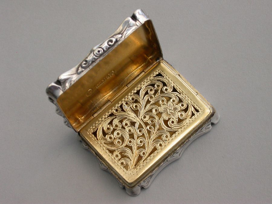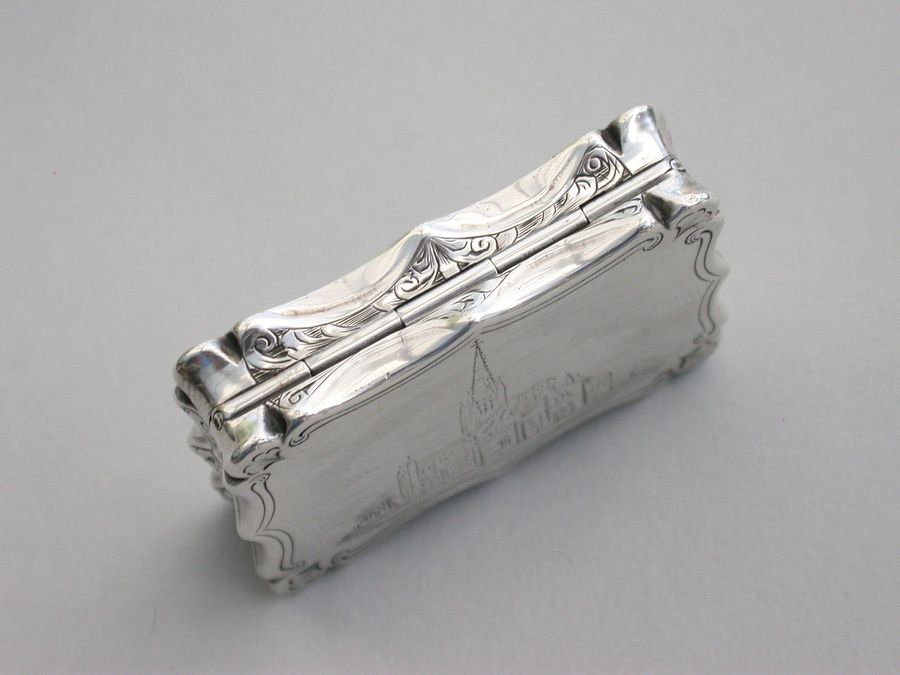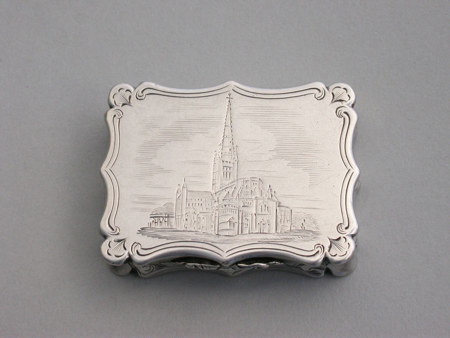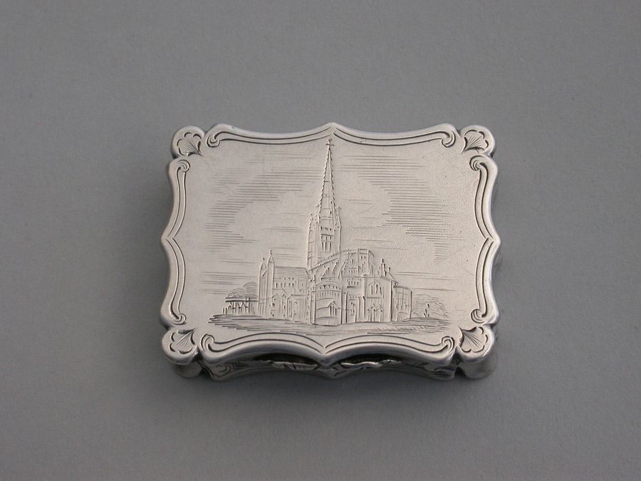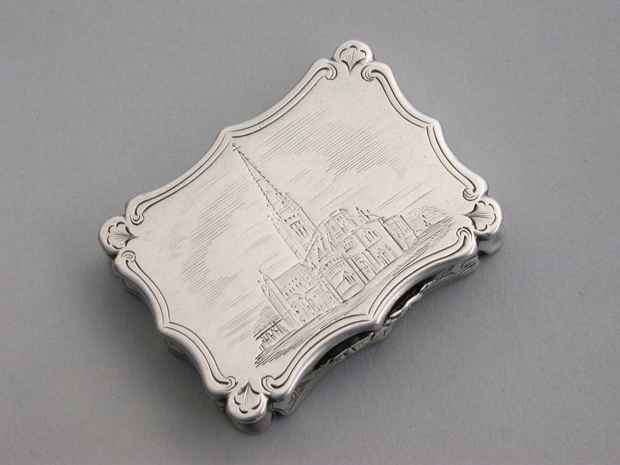 An extremely rare Victorian silver Castle-Top Vinaigrette of shaped rectangular form, the lid engraved with a scene depicting Norwich Cathedral, the silver gilt interior with intricately pierced foliate scroll grille. The base with scrolled decoration and engraved with initials H.S in a shaped cartouche.