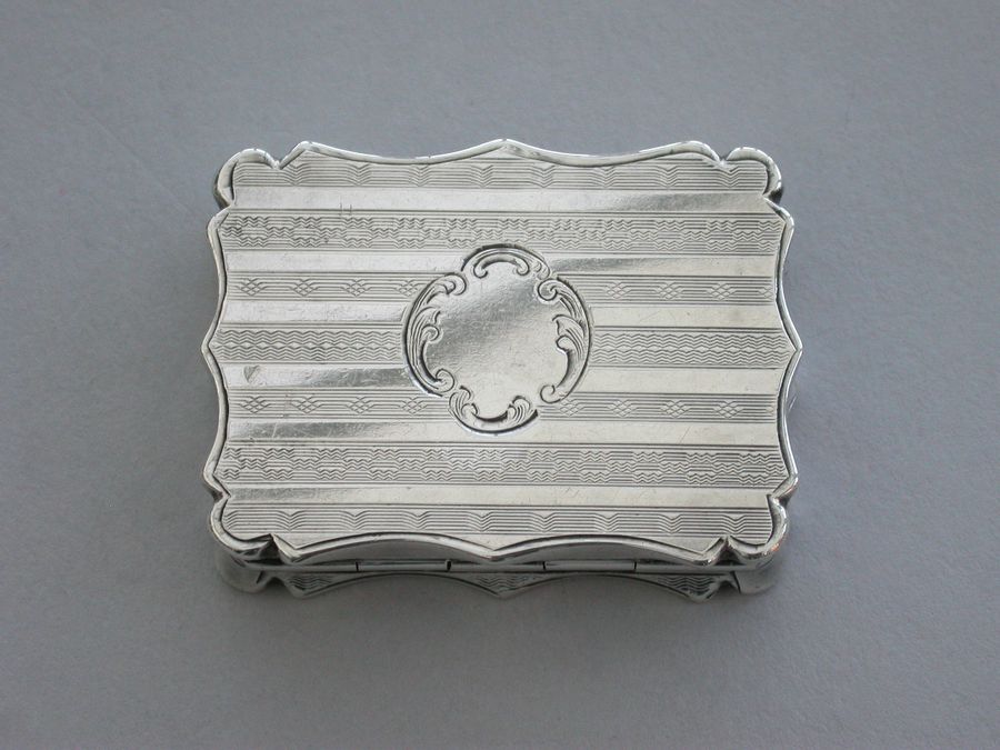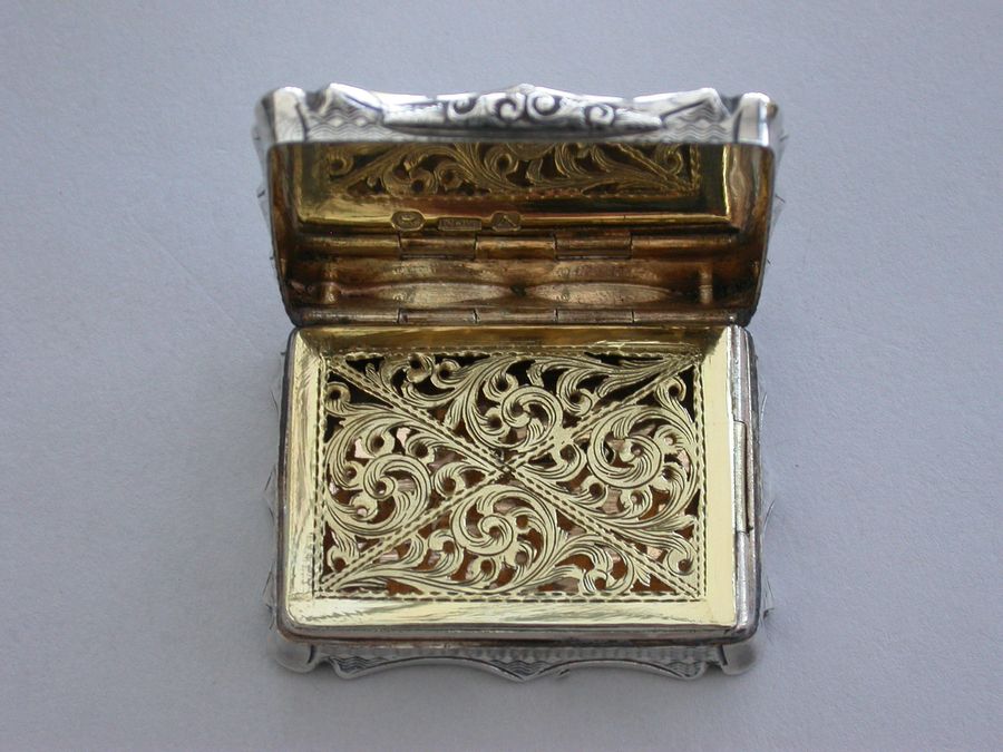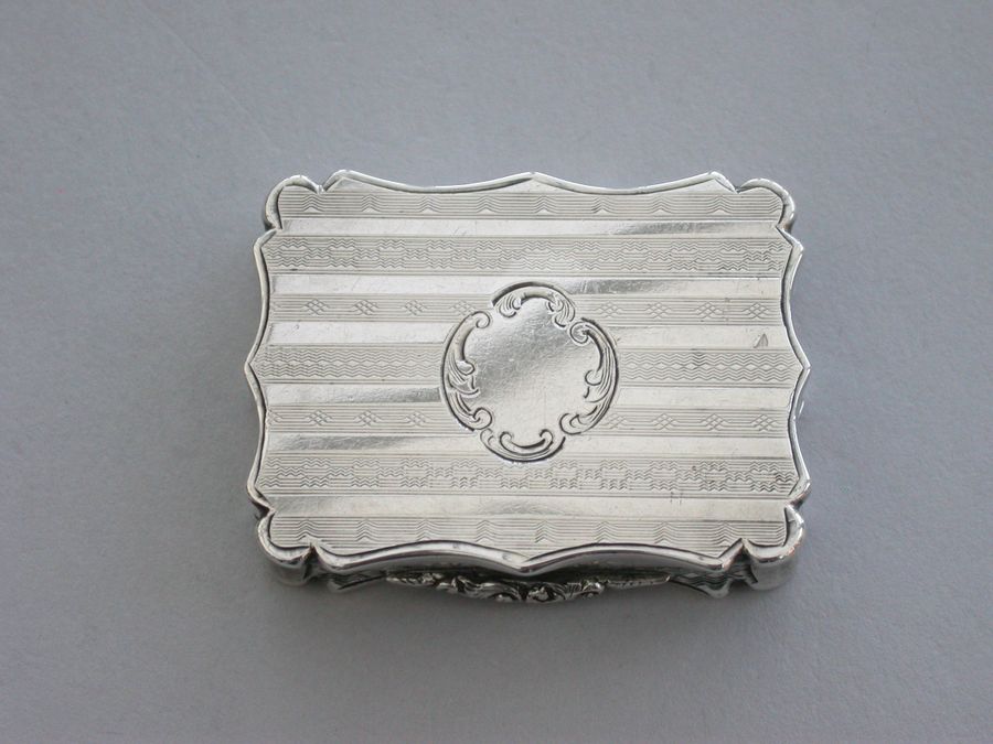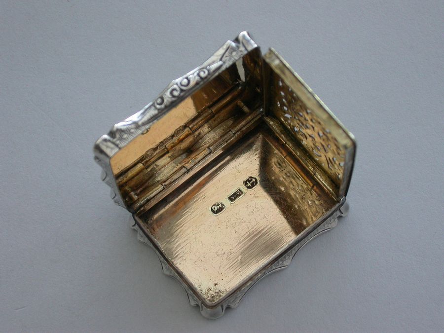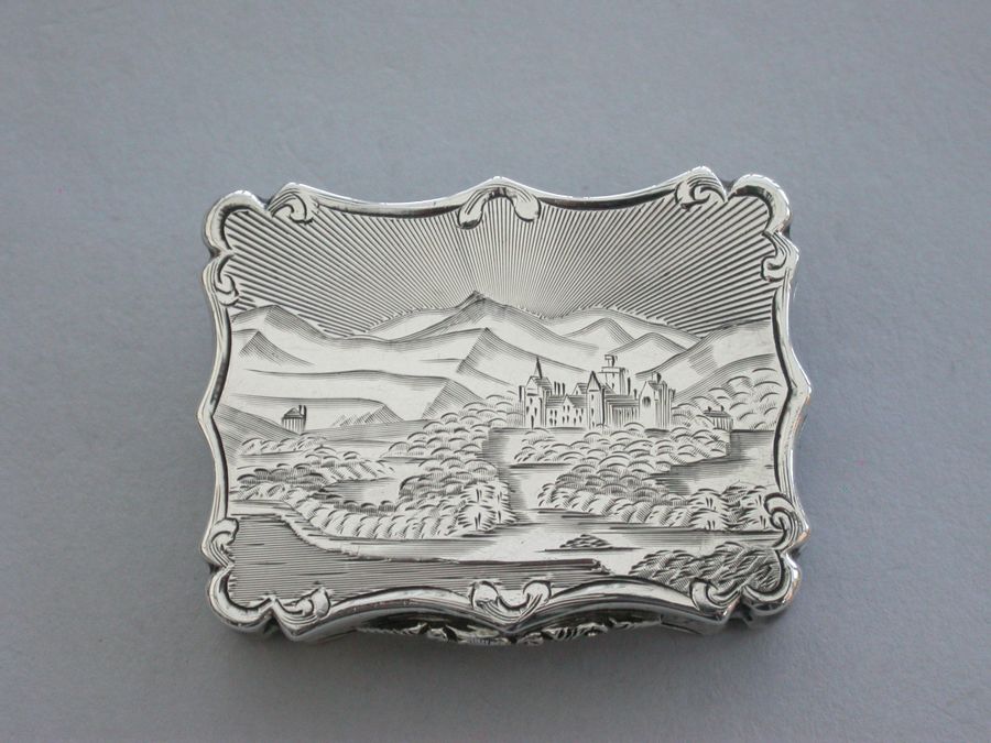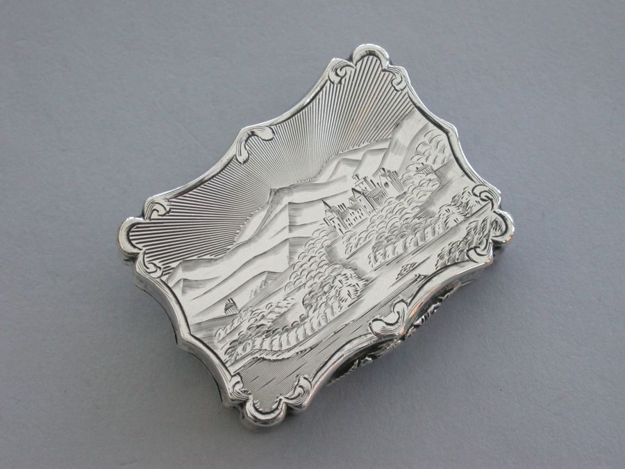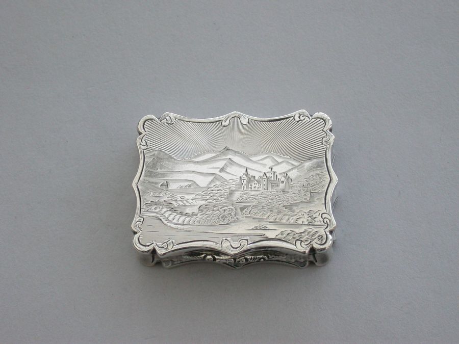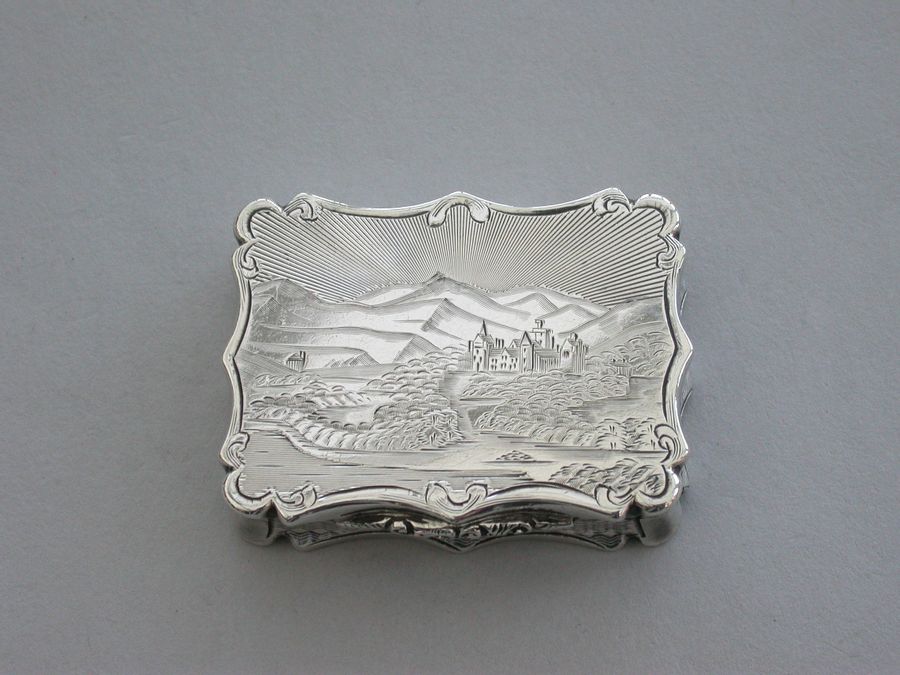 A rare Victorian silver Vinaigrette of shaped rectangular form, the base and sides with engine turned decoration and a vacant cartouche. The lid engraved with a scene depicting Old Balmoral Castle and lands with small buildings against hills and a rayed sky within a decorative border. The silver gilt grille bordered and crossed to form four triangles each pierced with a scrolling frond.