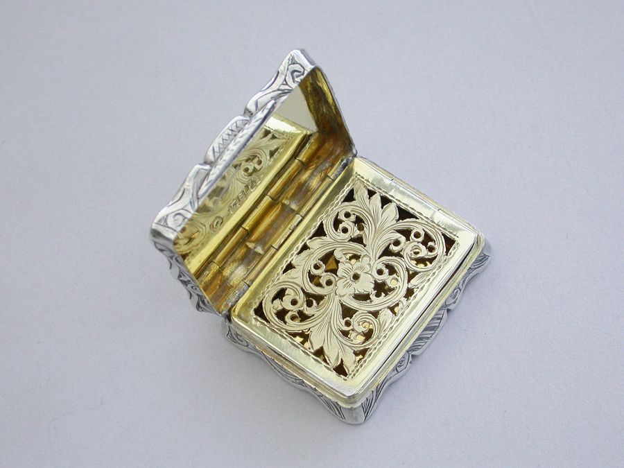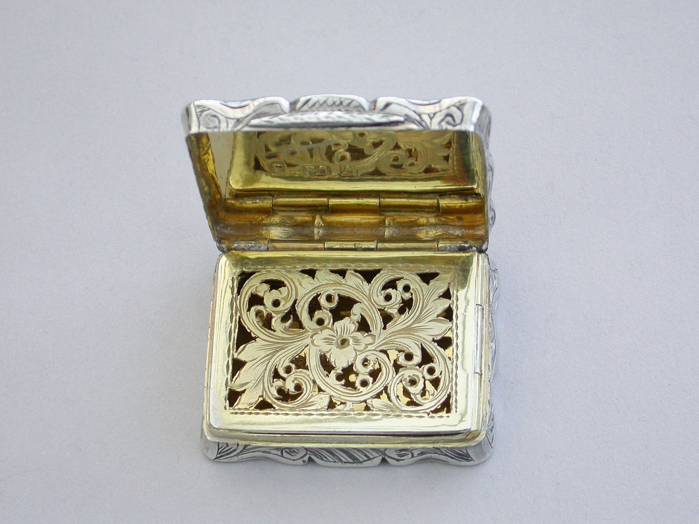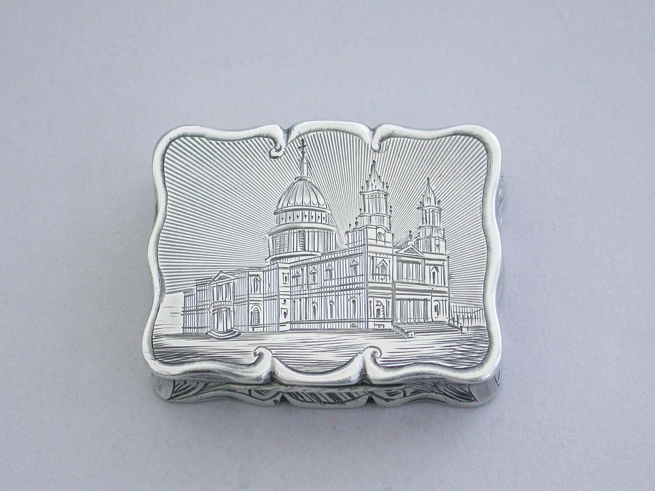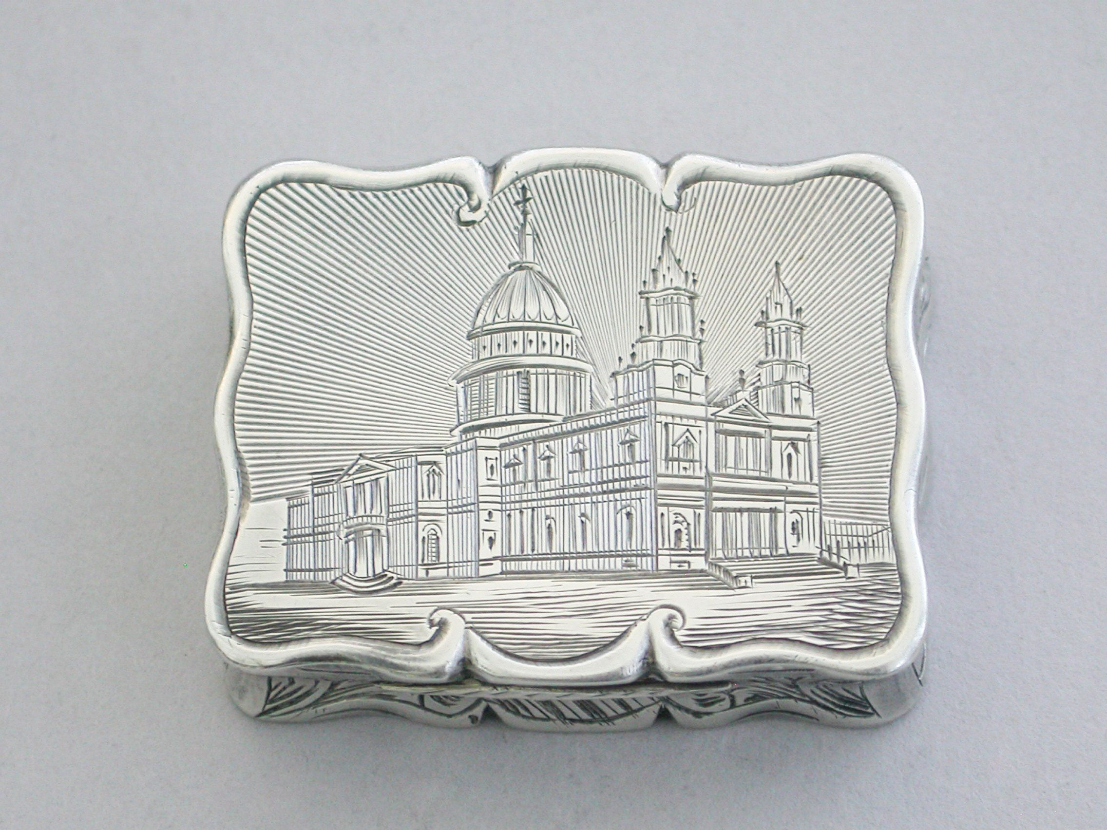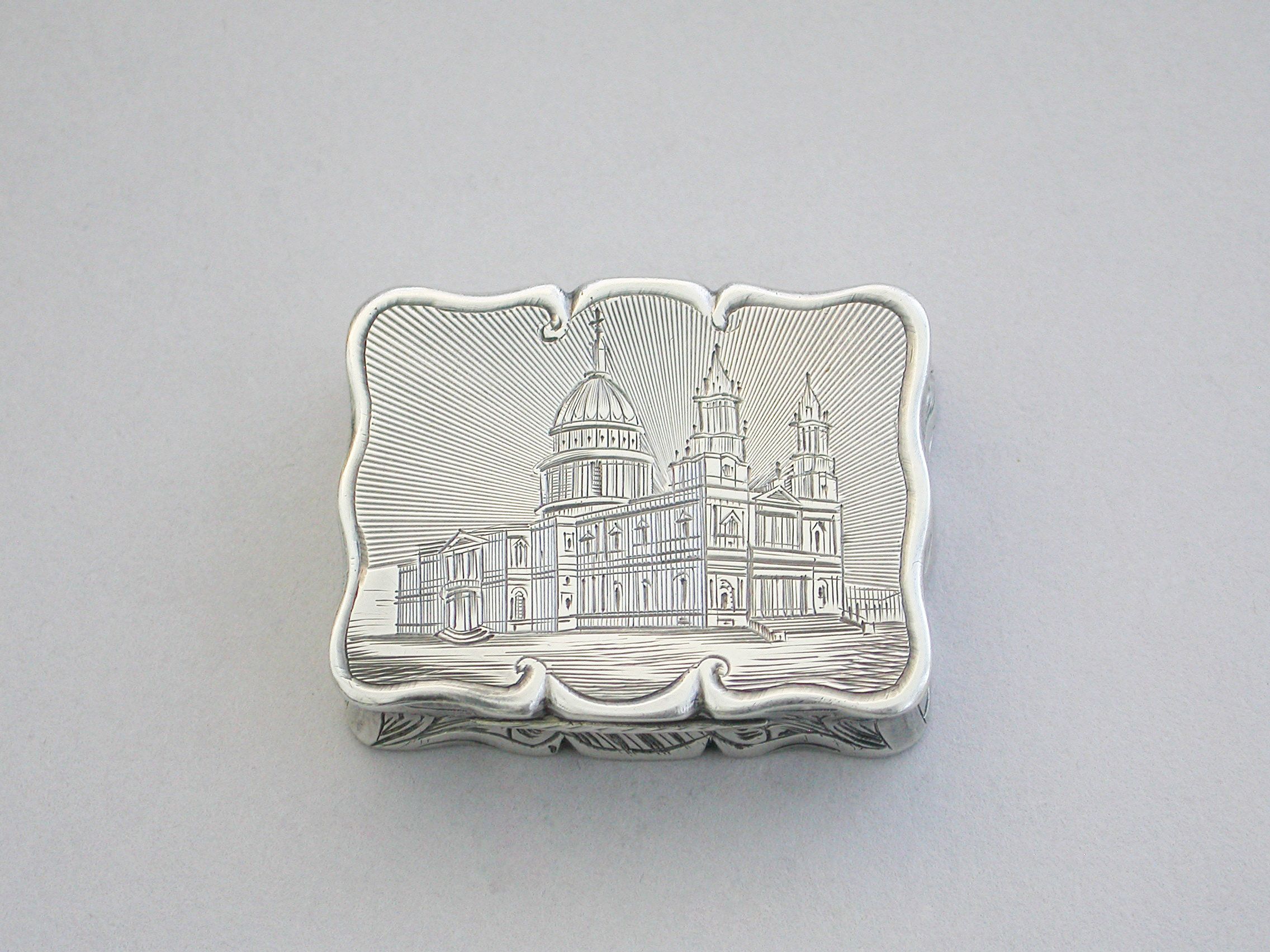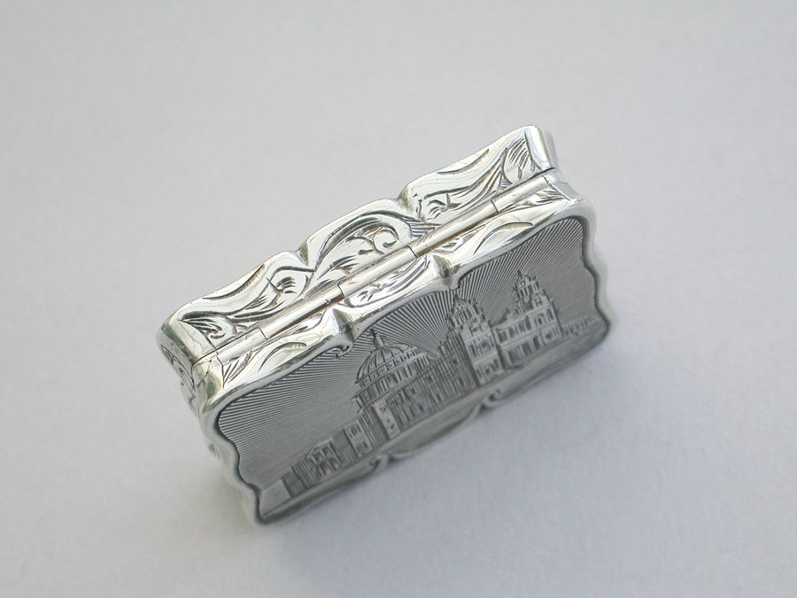 A fine Victorian silver Castle-Top Vinaigrette, of shaped rectangular form with foliate scroll engraved base and sides, contemporary engraved script initials to a cartouche on the base, the lid engraved with a view of St Paul's Cathedral from the North West, the silver gilt interior with foliate scroll pierced hinged grille.