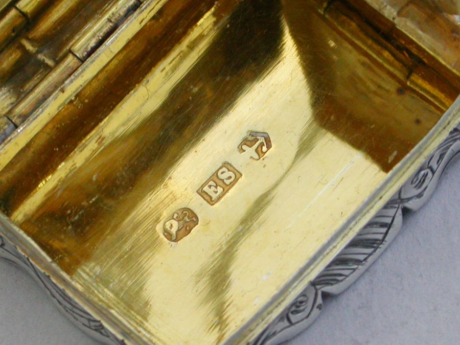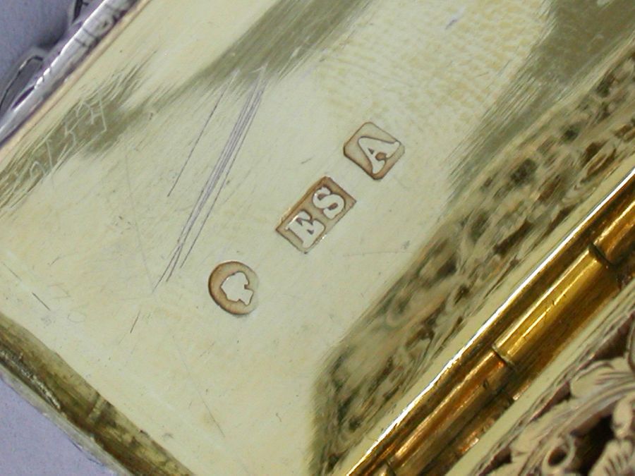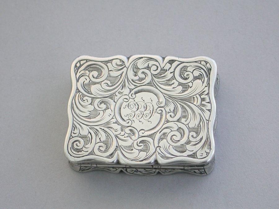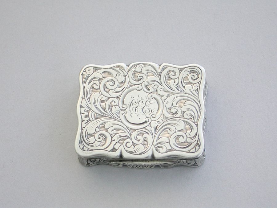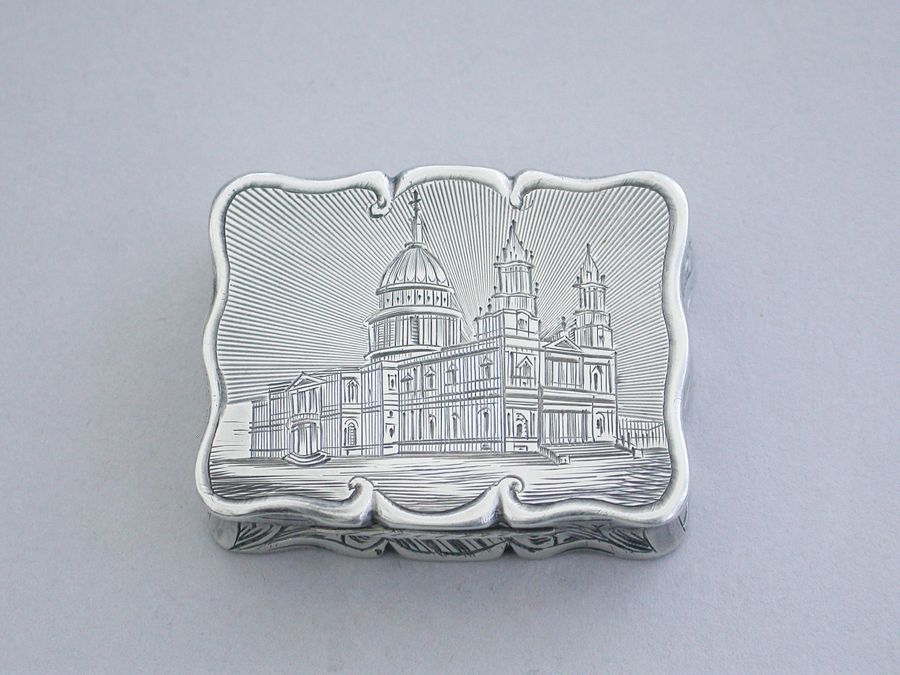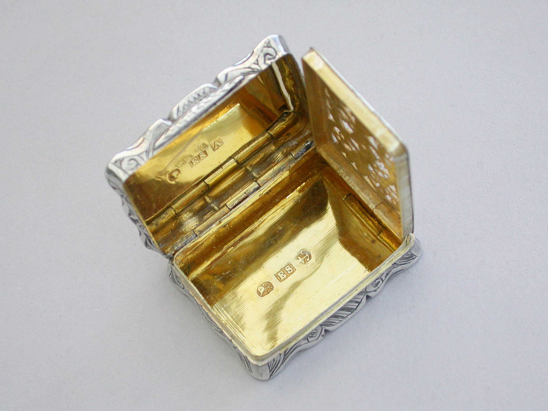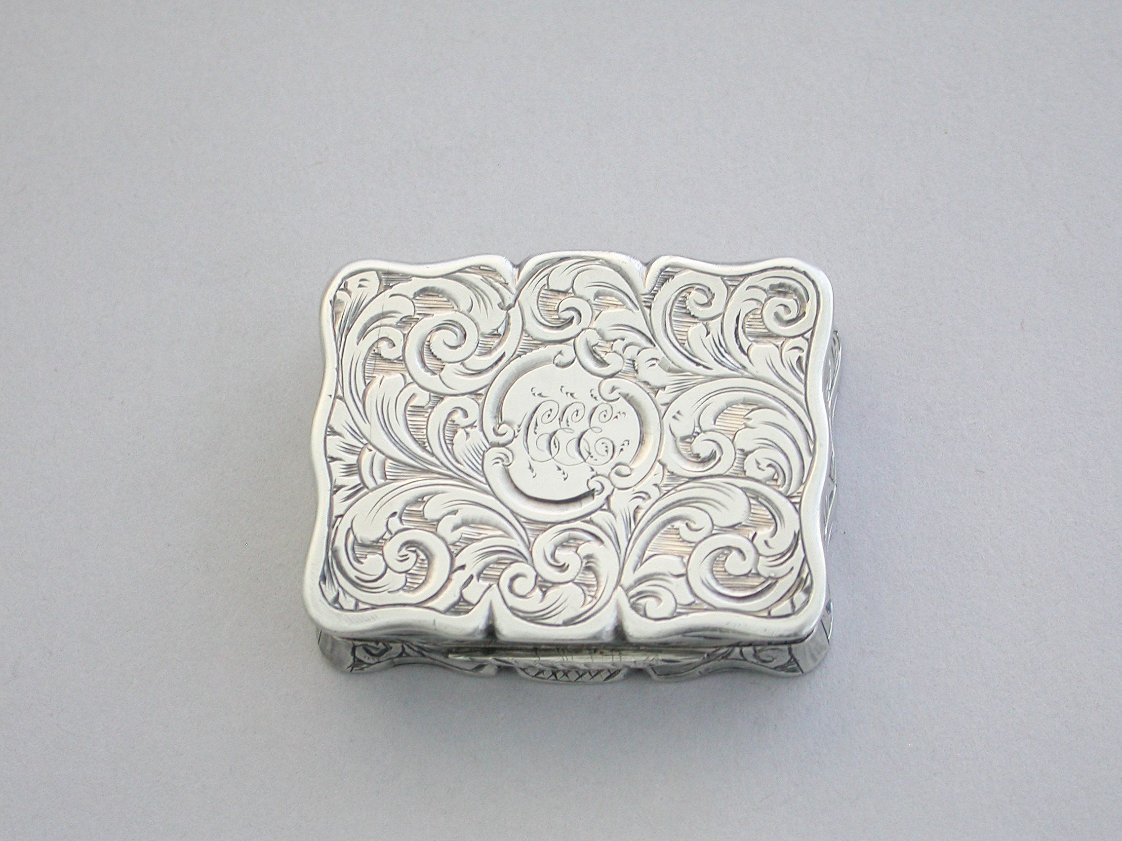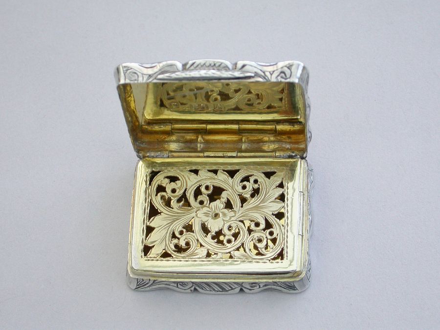 A fine Victorian silver Castle-Top Vinaigrette, of shaped rectangular form with foliate scroll engraved base and sides, contemporary engraved script initials to a cartouche on the base, the lid engraved with a view of St Paul's Cathedral from the North West, the silver gilt interior with foliate scroll pierced hinged grille.