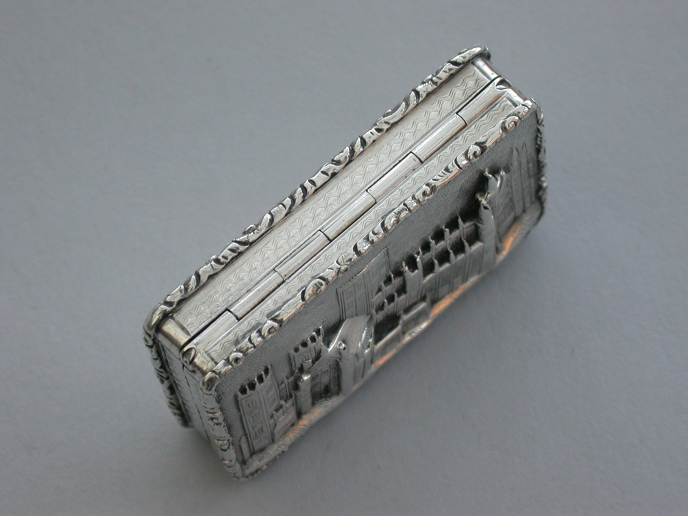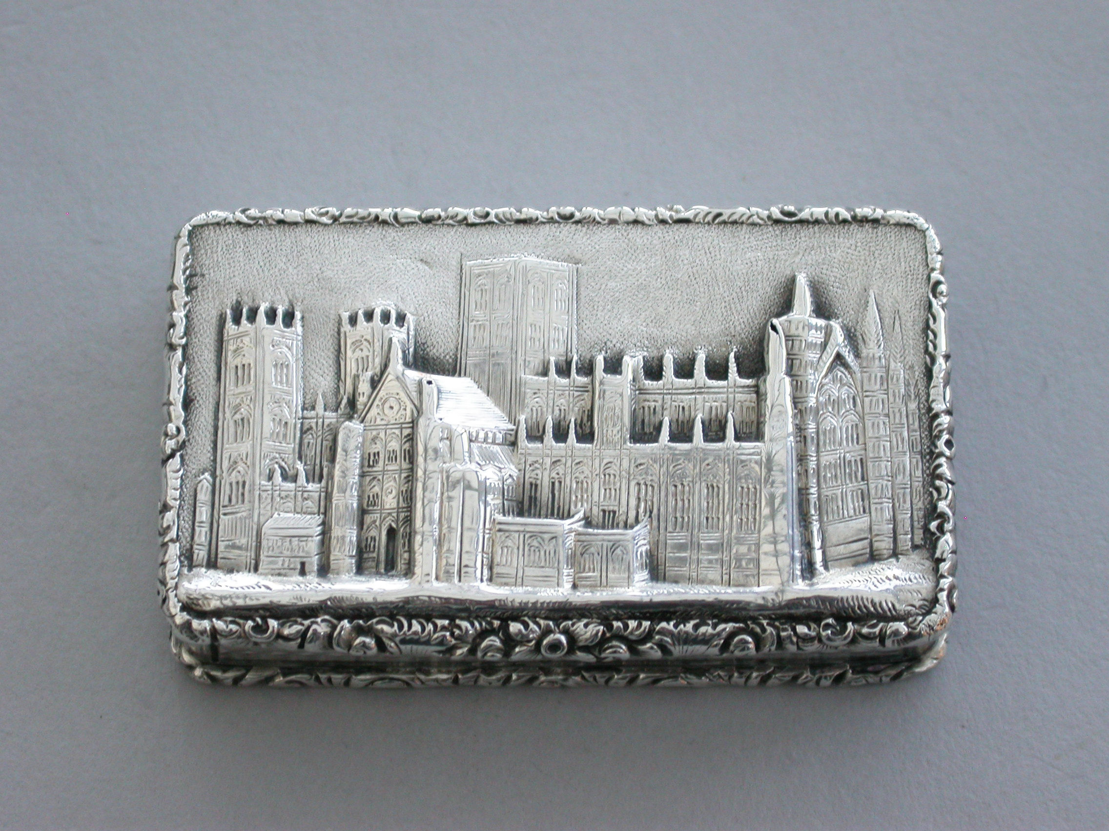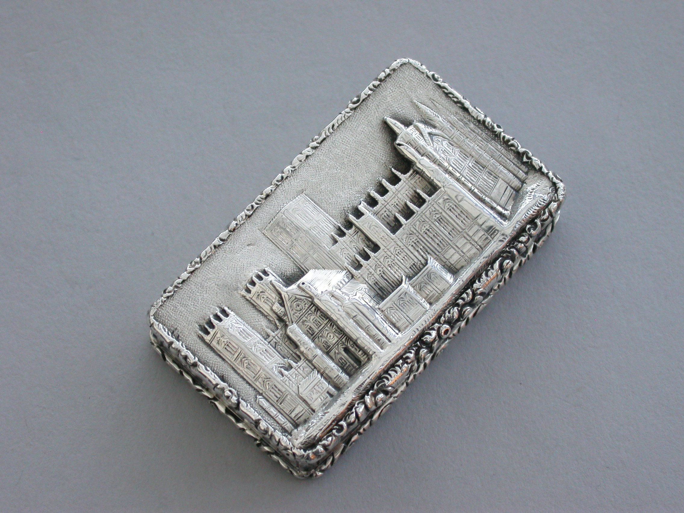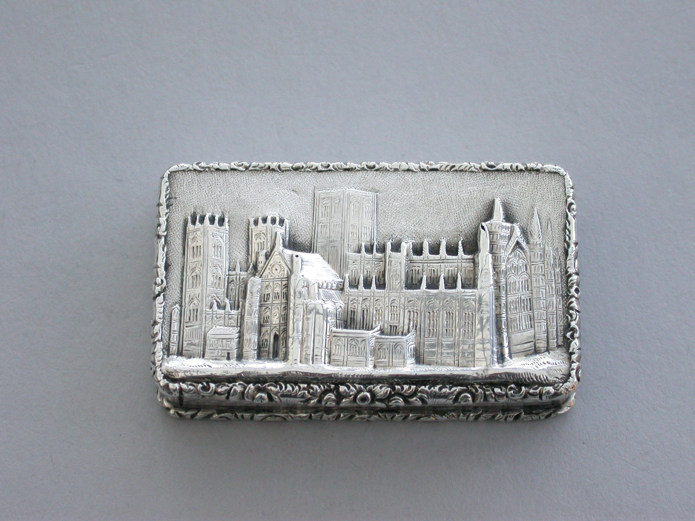 An extremely fine and rare Victorian silver 'Castle-Top' Vinaigrette, of rectangular form, the base and sides with engine turned decoration, the cover depicting a view of the south eastern aspect of York Minster (not the standard view) in high relief. Silver gilt interior with intricately pierced grill with scrolls and flower heads.
