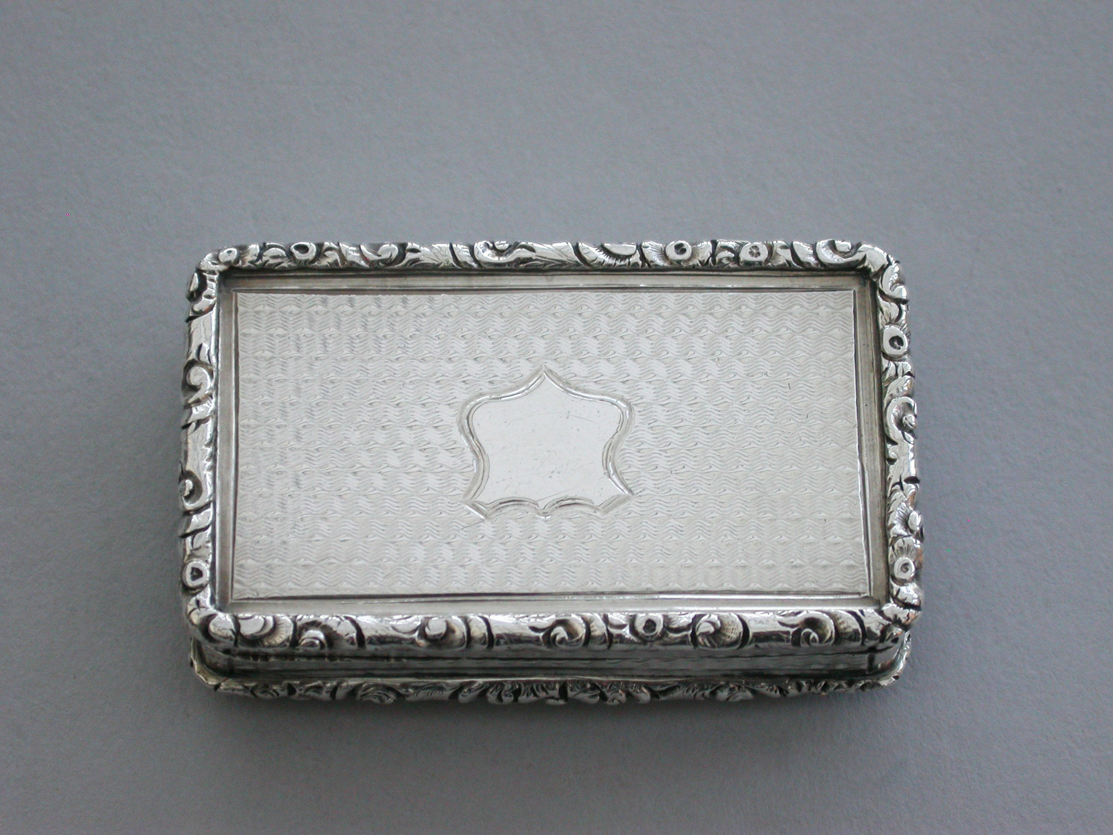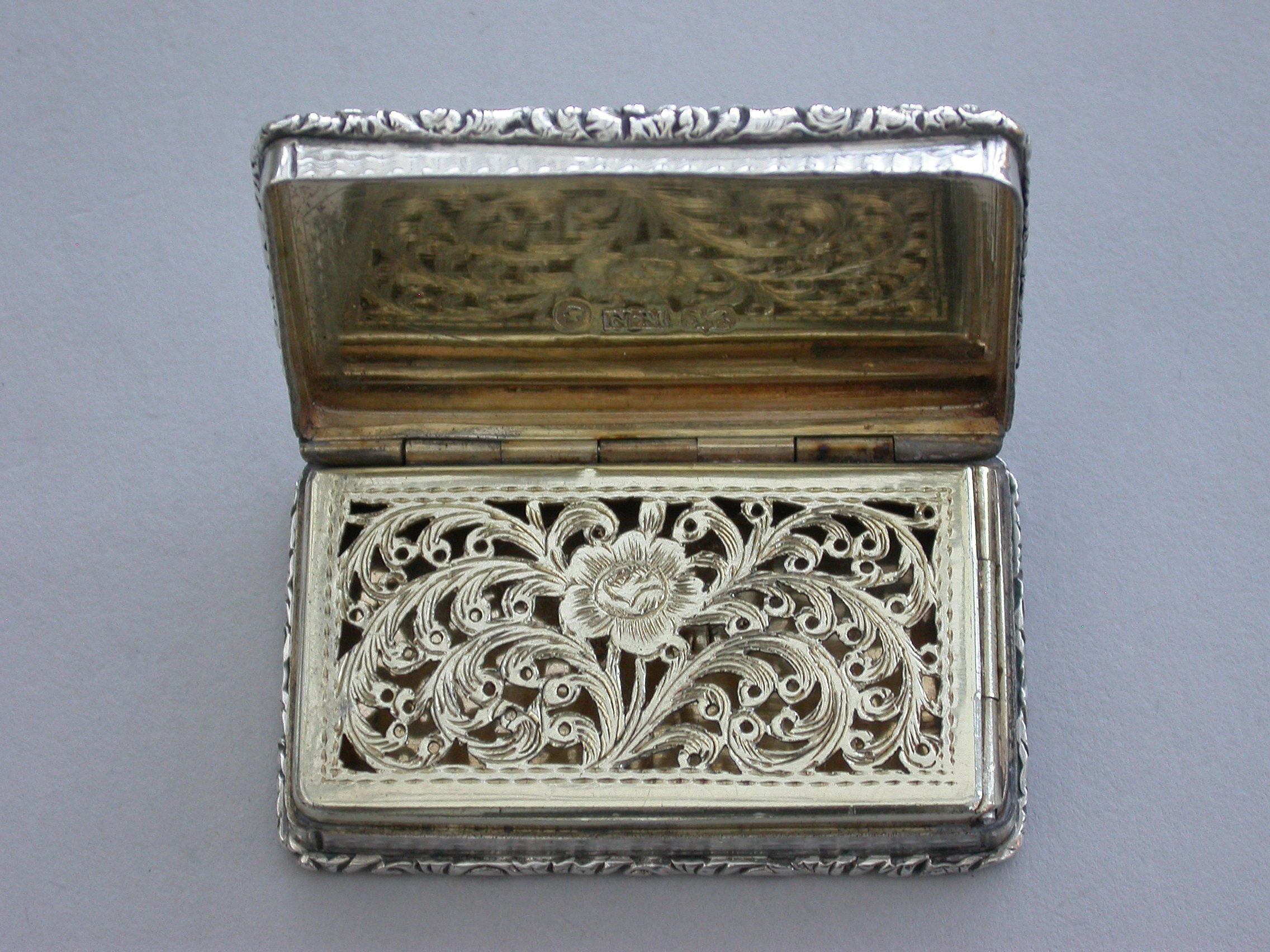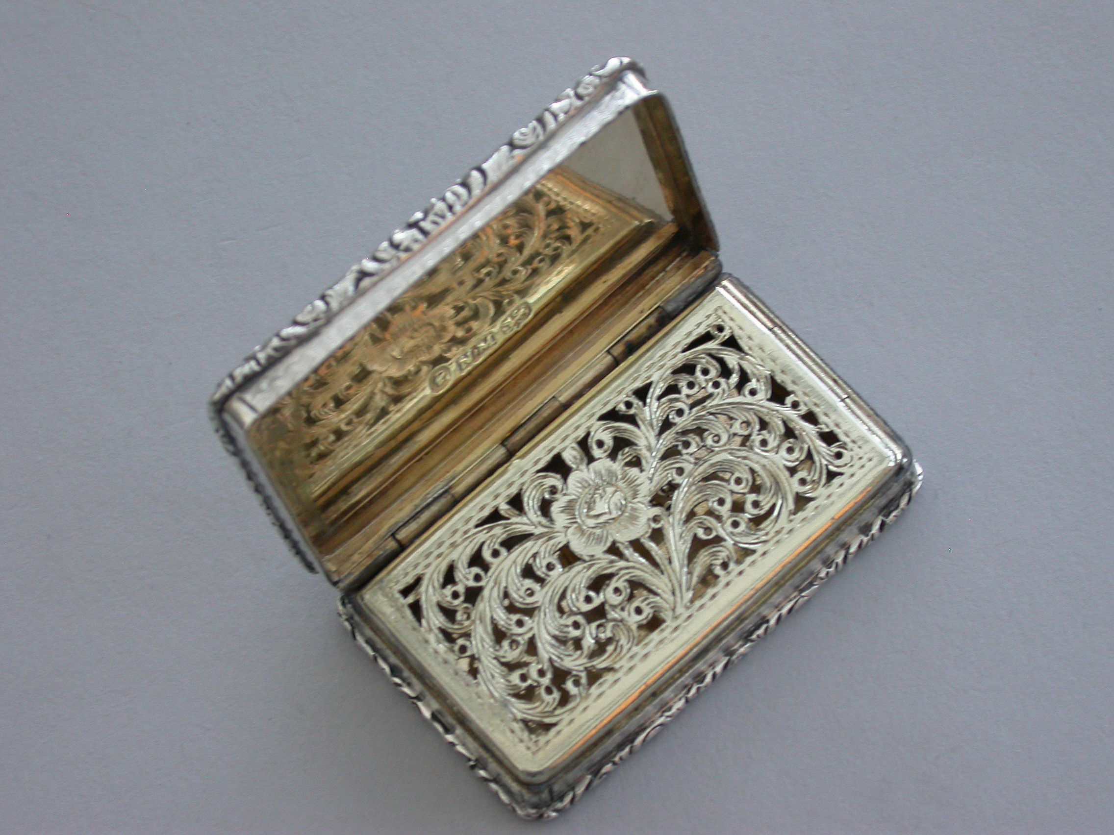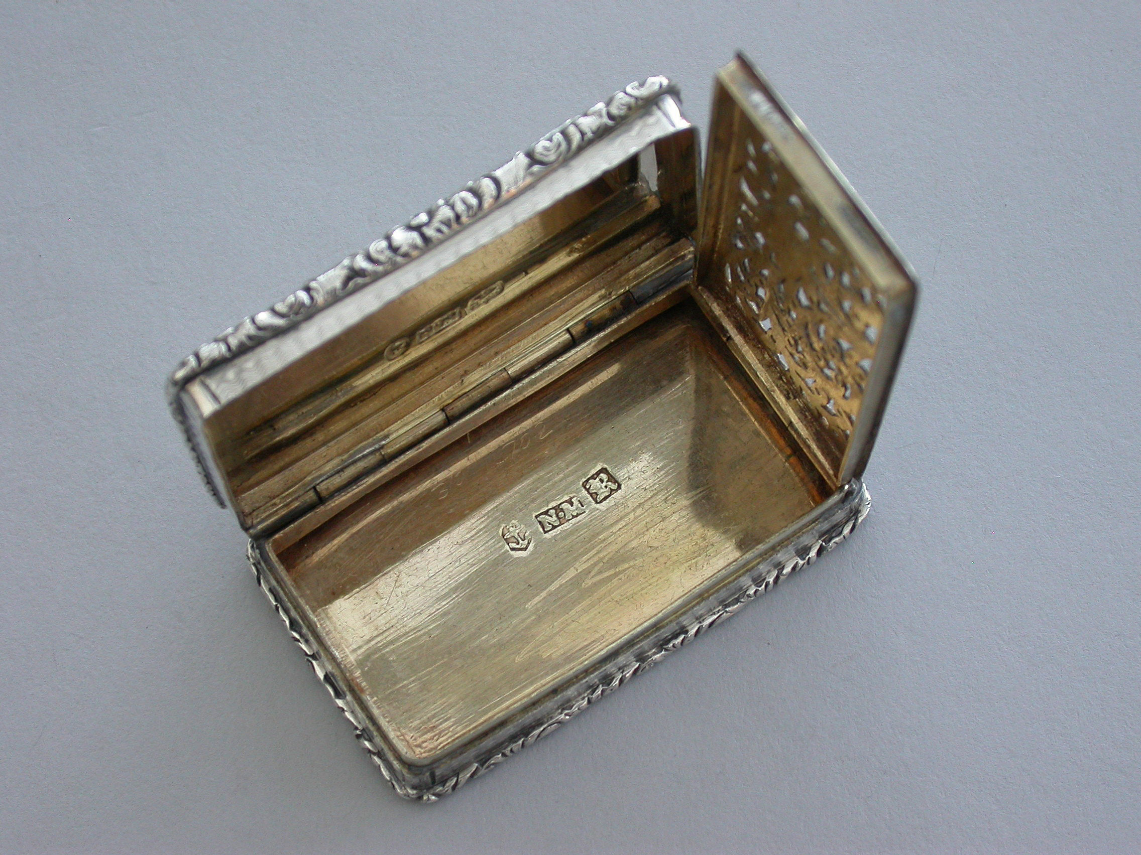 An extremely fine and rare Victorian silver 'Castle-Top' Vinaigrette, of rectangular form, the base and sides with engine turned decoration, the cover depicting a view of the south eastern aspect of York Minster (not the standard view) in high relief. Silver gilt interior with intricately pierced grill with scrolls and flower heads.