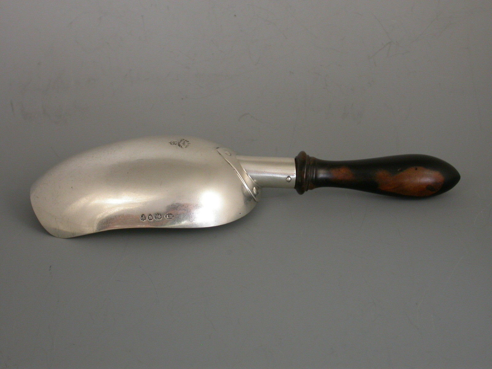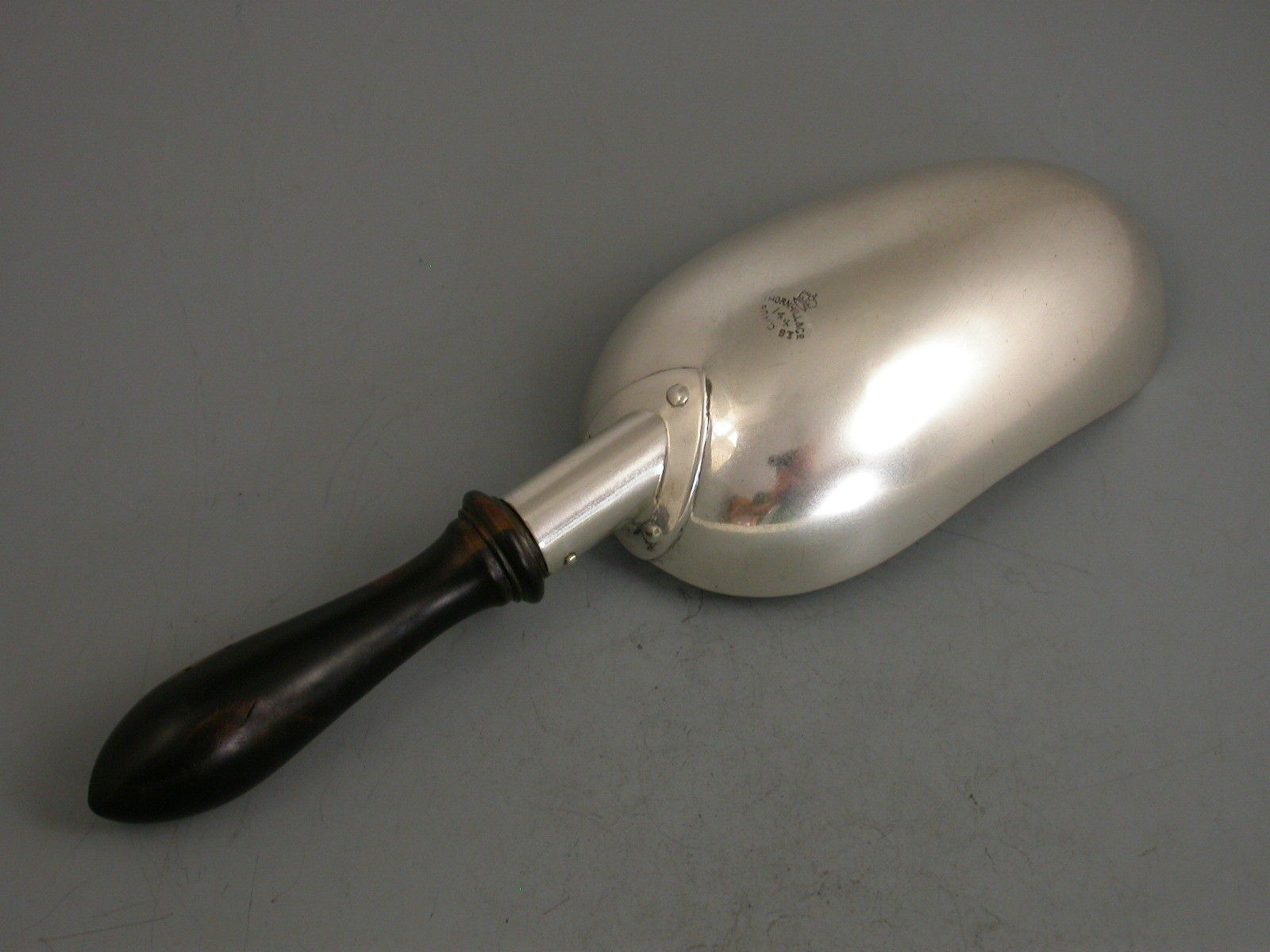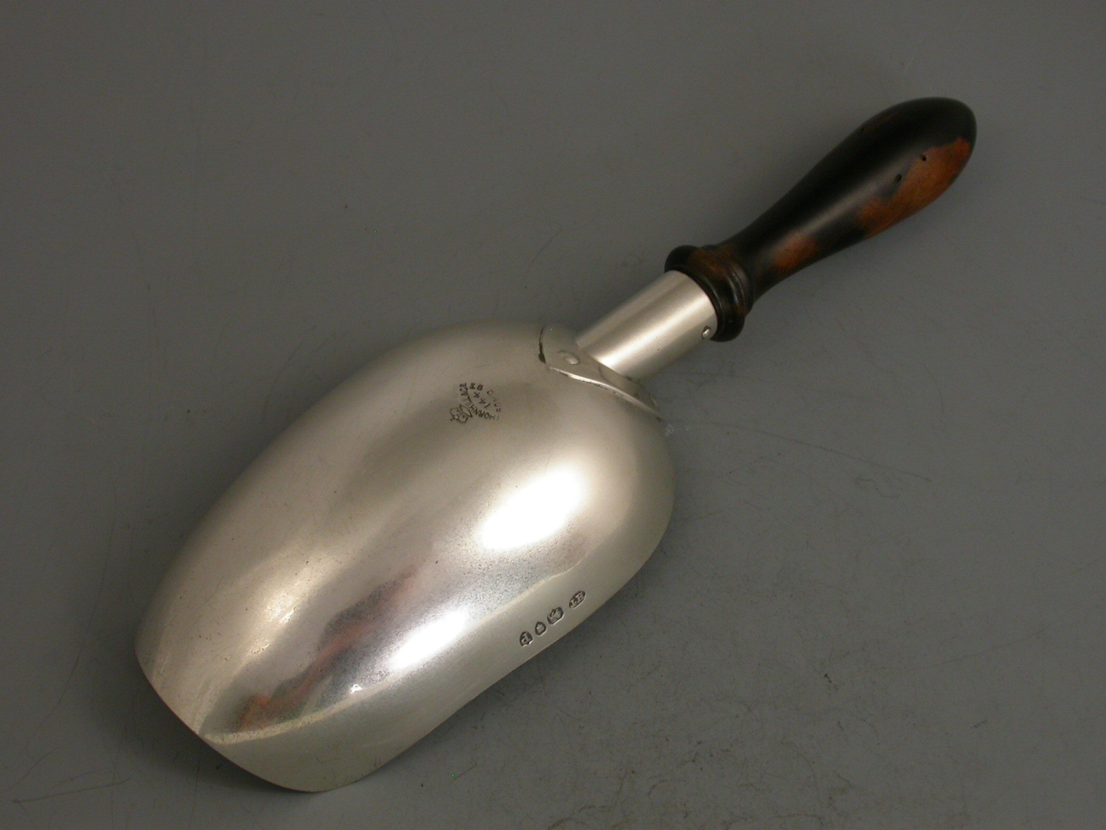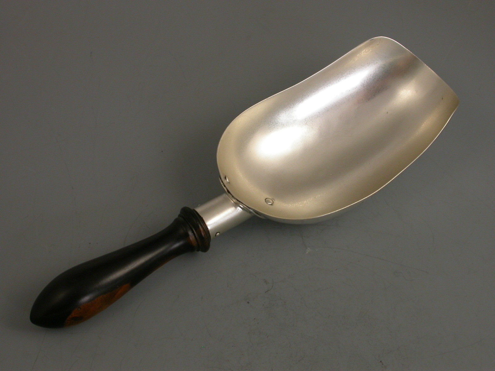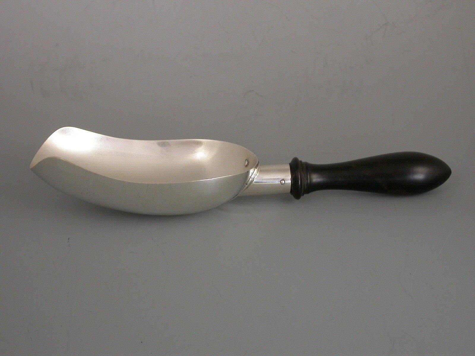 An interesting Victorian silver Scoop with attached turned ebony handle. It use unknown possibly for Coffee or Candy ?