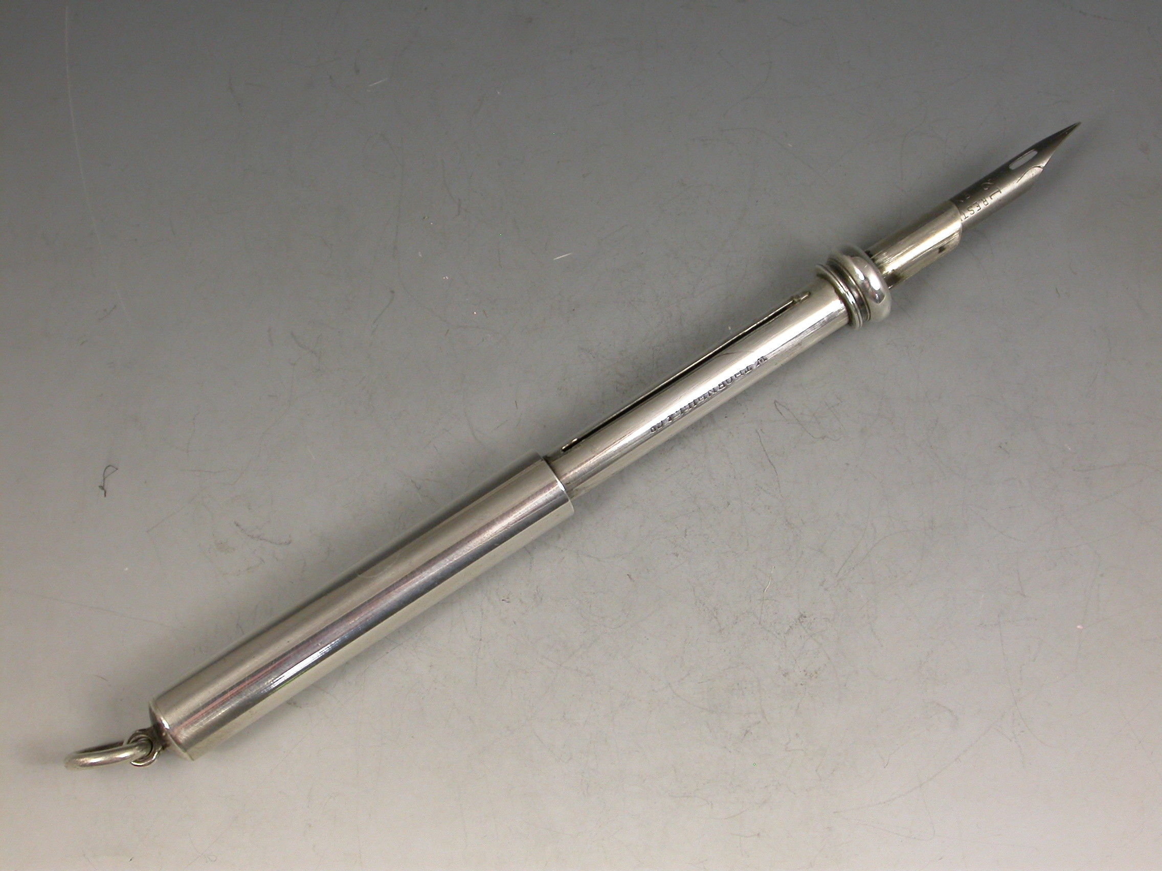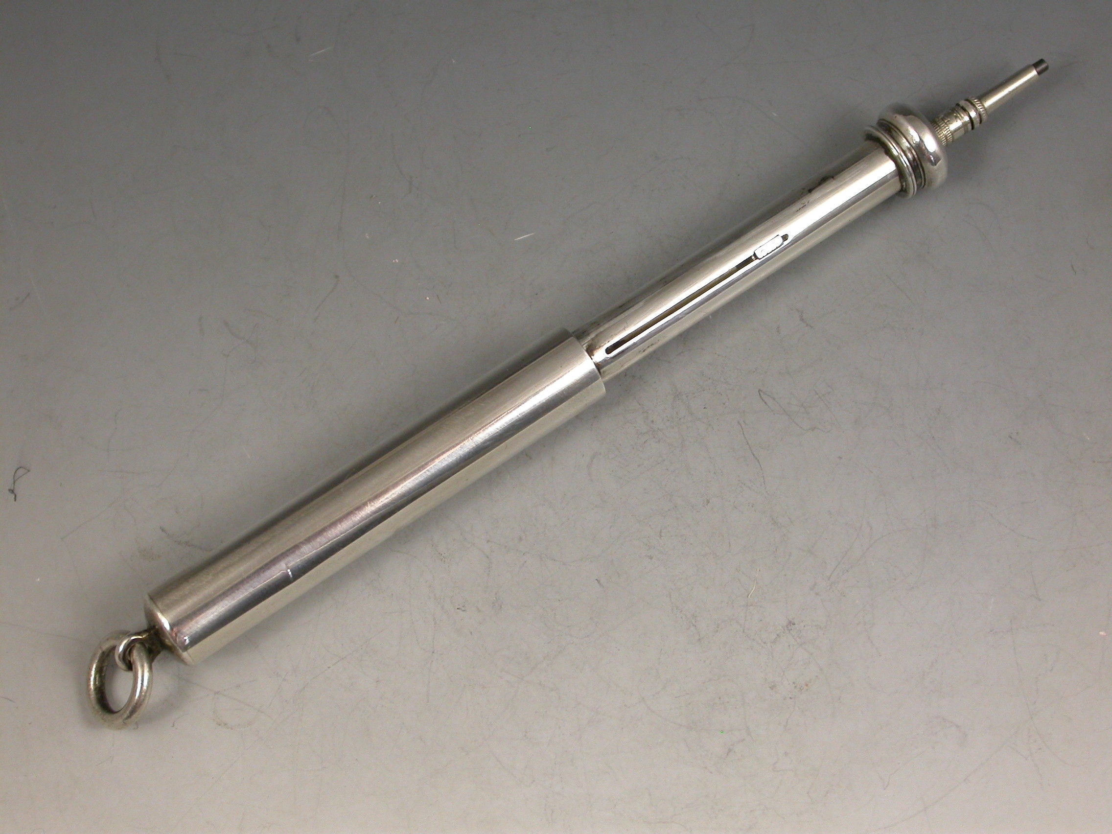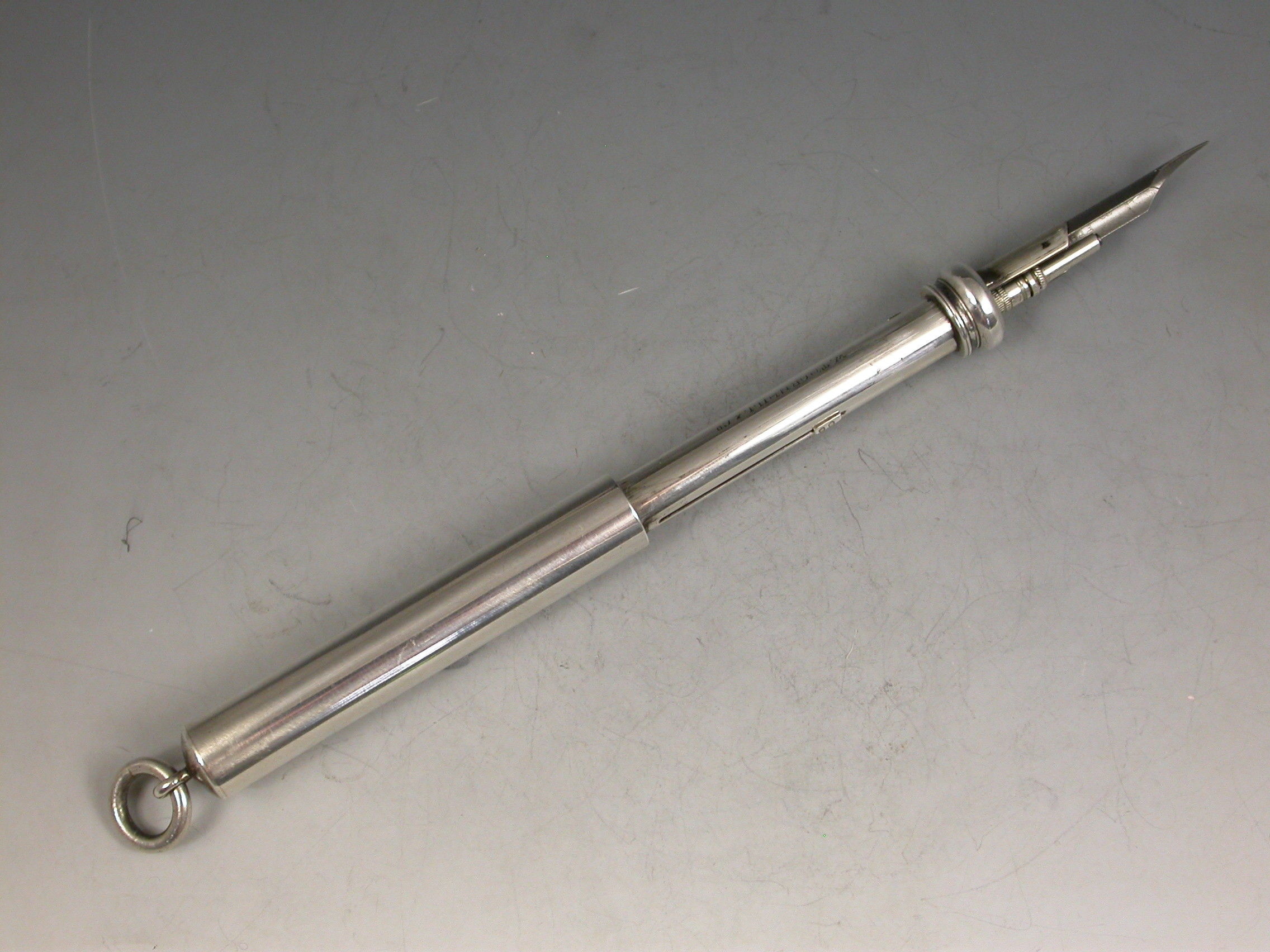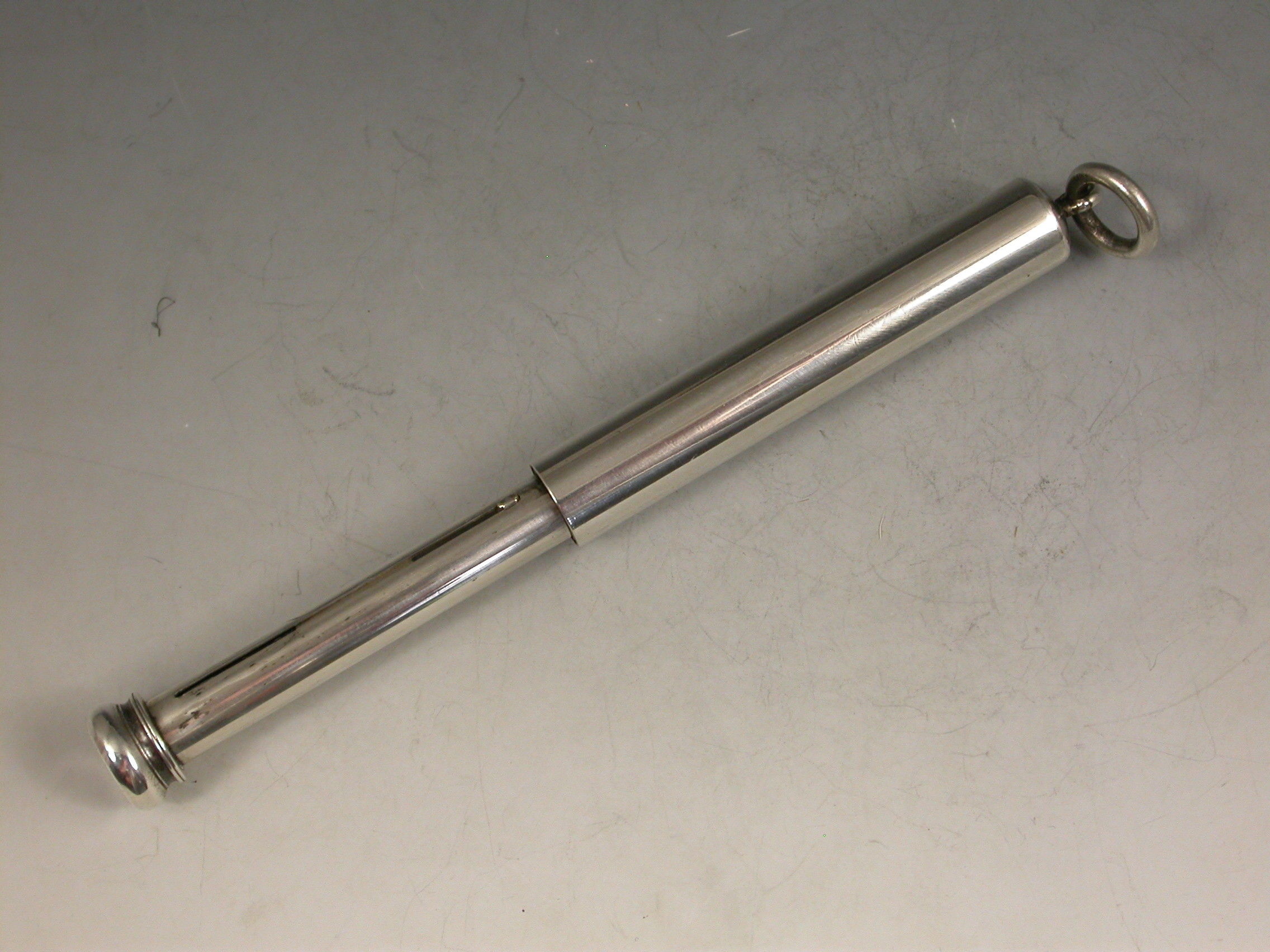 A good Victorian combined telescopic Propelling Pencil and Dip Pen, the plain cylindrical body with attached suspension ring and two drawer telescopic sections with slider buttons in the final section to extend the pen and pencil.