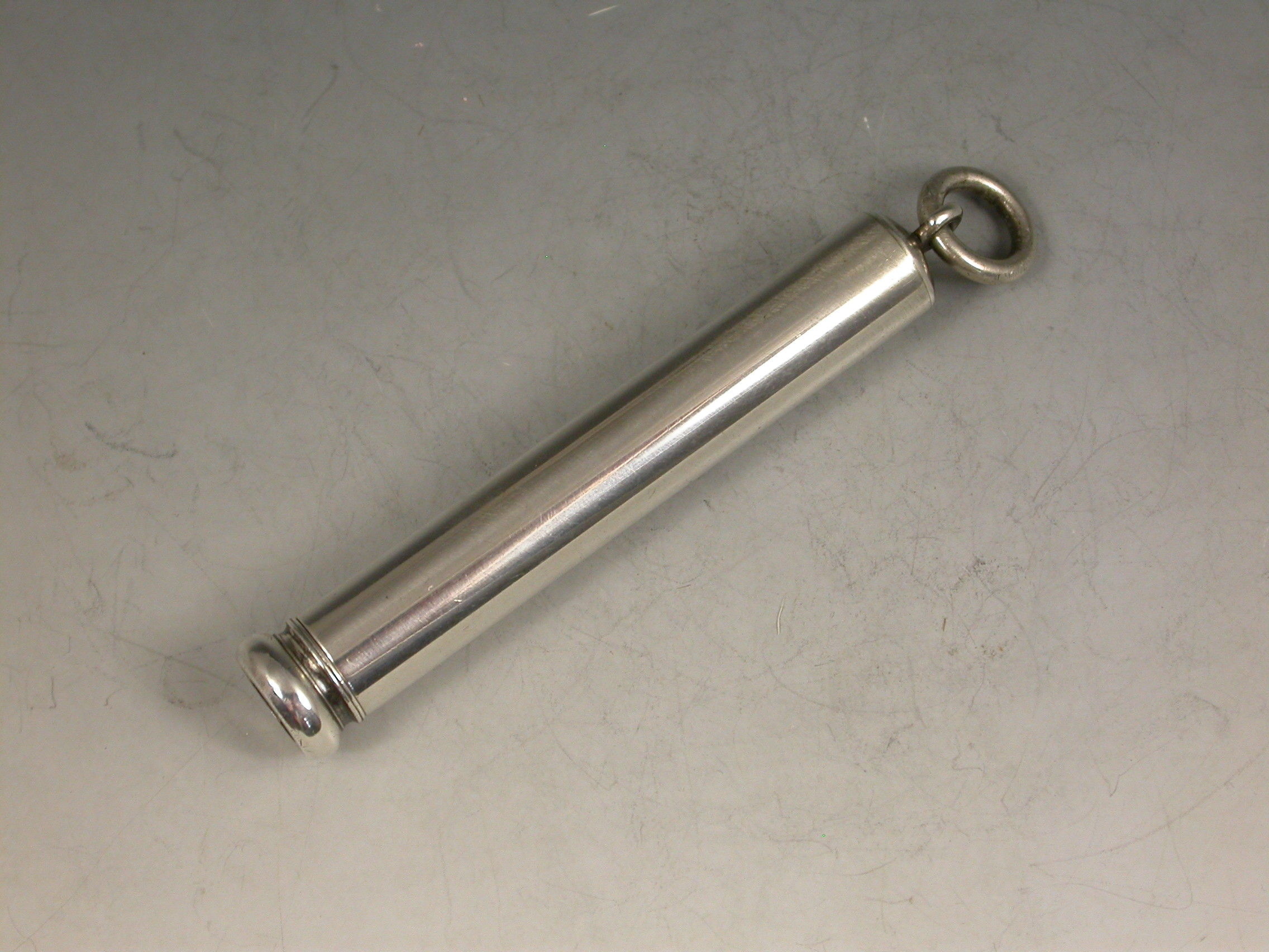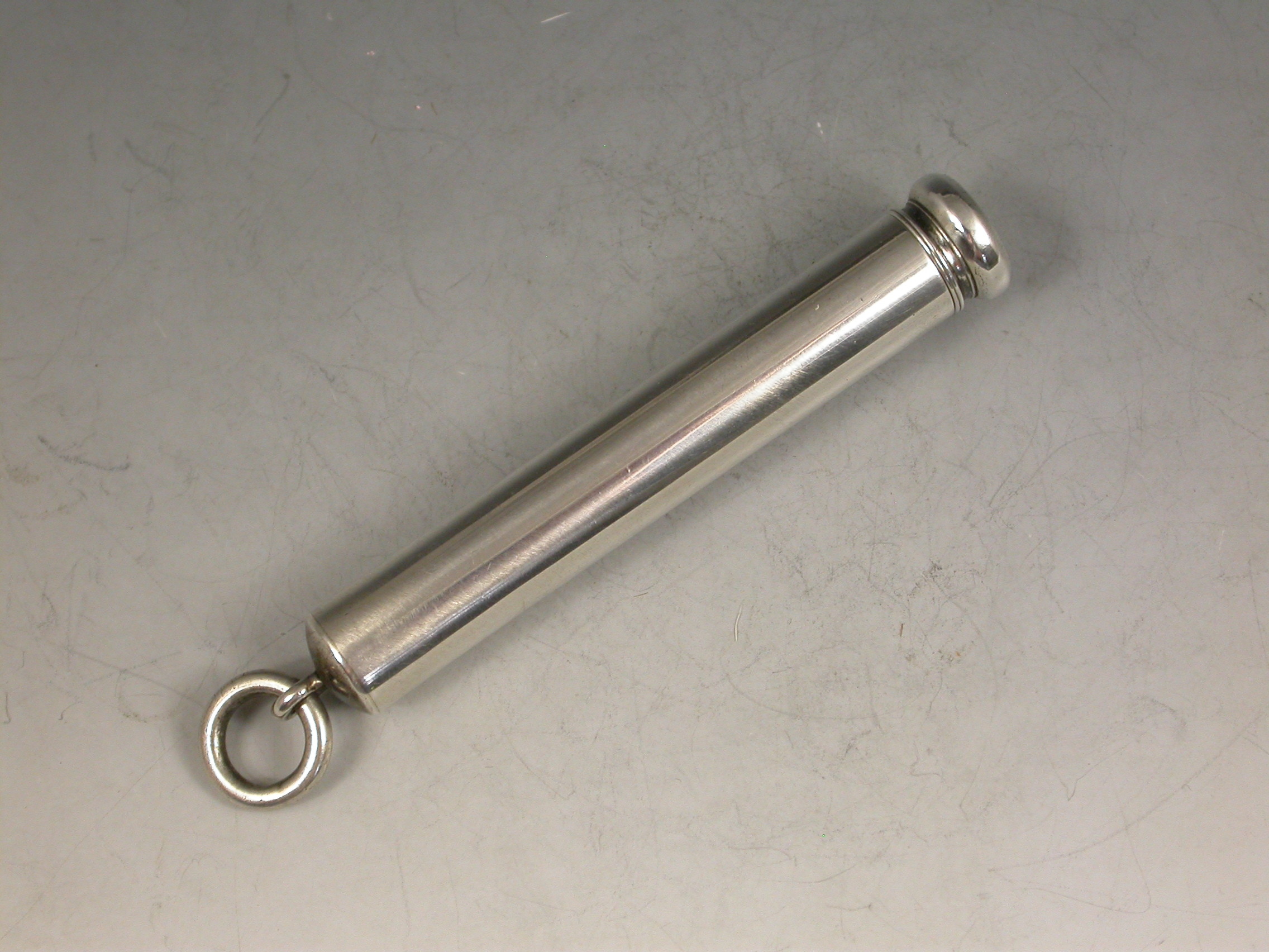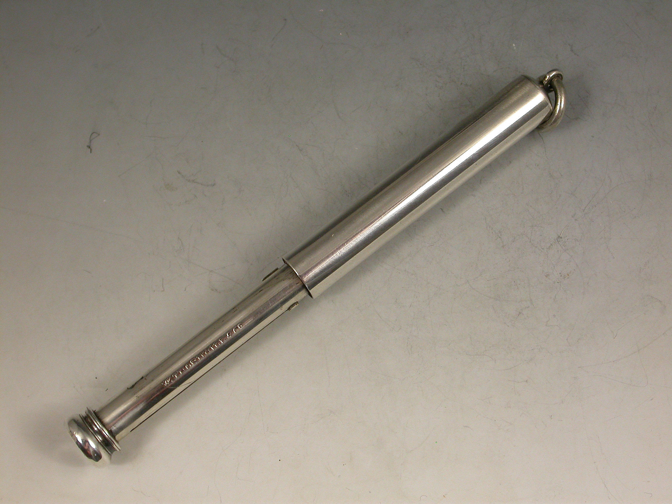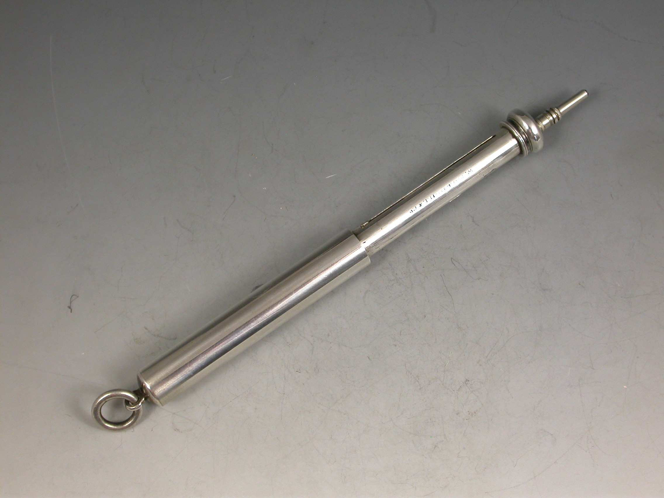 A good Victorian combined telescopic Propelling Pencil and Dip Pen, the plain cylindrical body with attached suspension ring and two drawer telescopic sections with slider buttons in the final section to extend the pen and pencil.