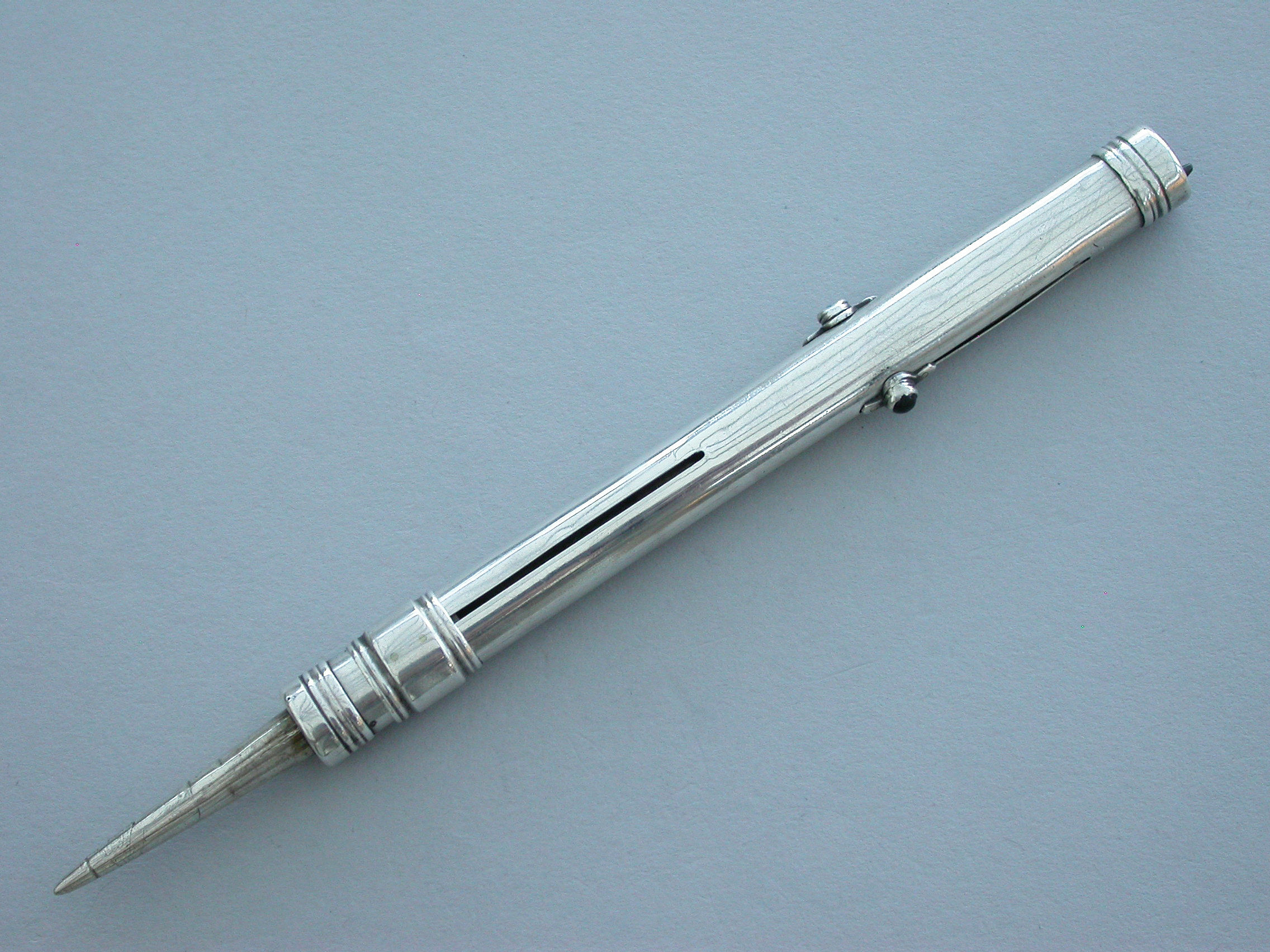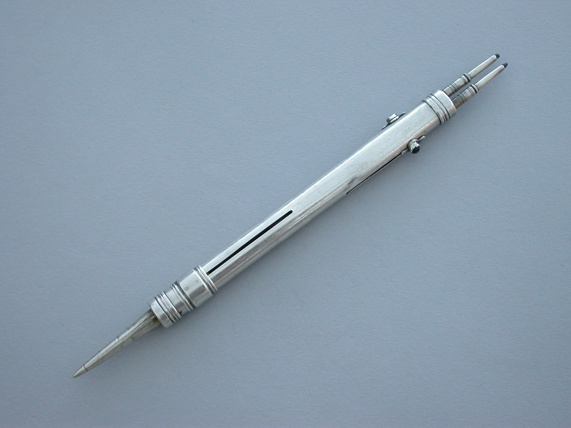 An unusual Victorian silver combined Writing Instrument consisting of two green and black sliding Propelling Pencils with matching coloured stones to the slider buttons combined with a steel spike (for the marking out of parchment?) also on a sliding mechanism.